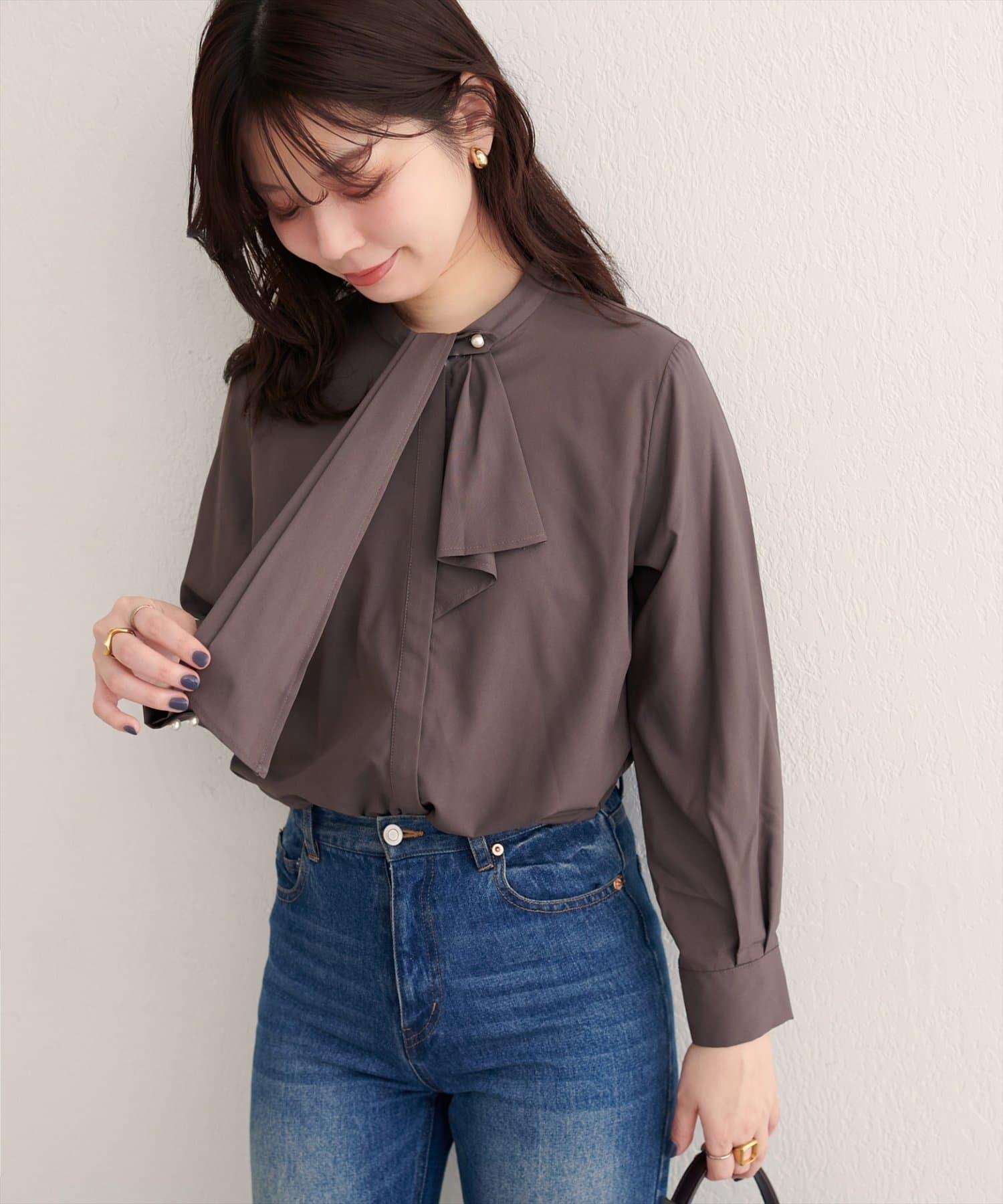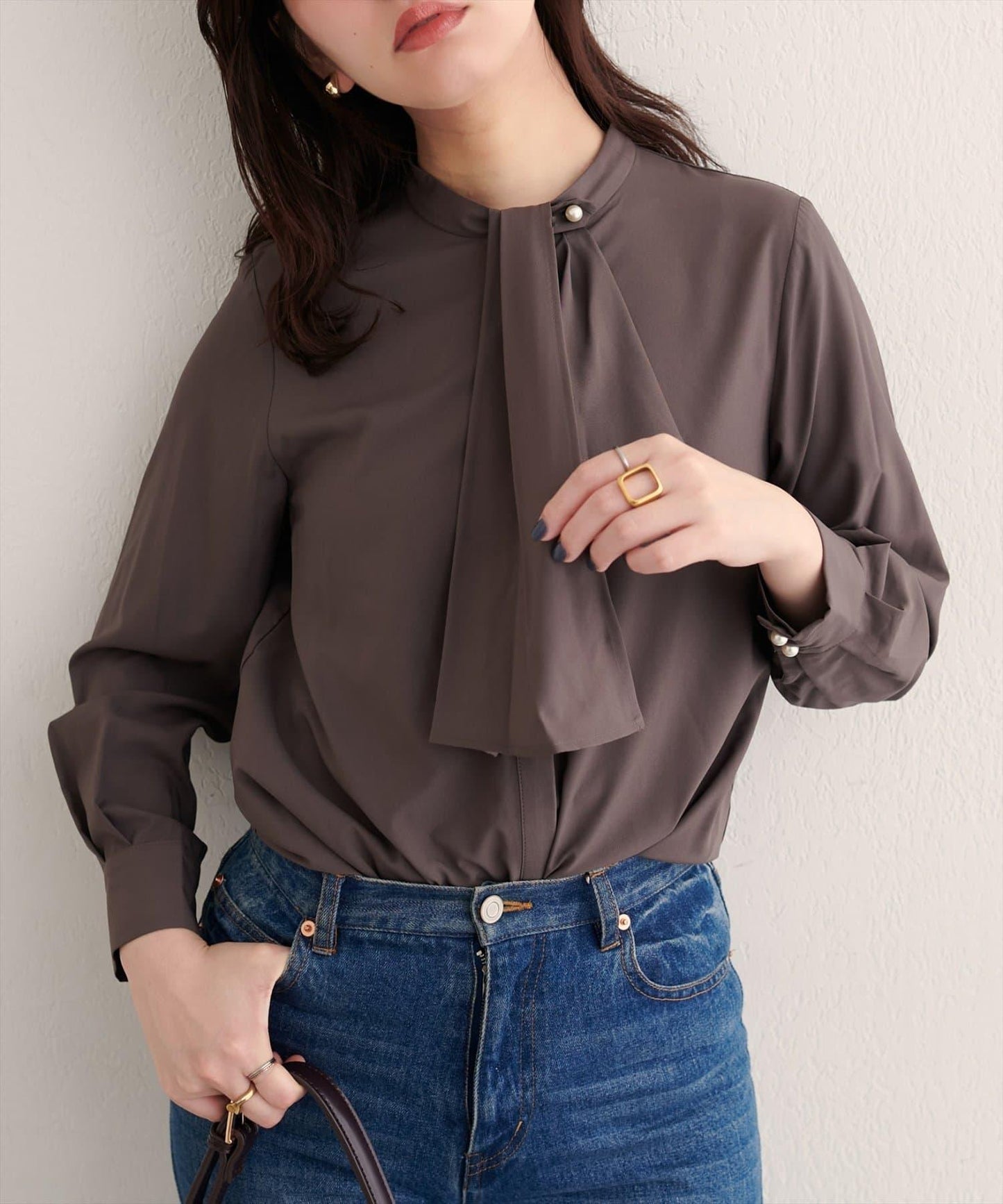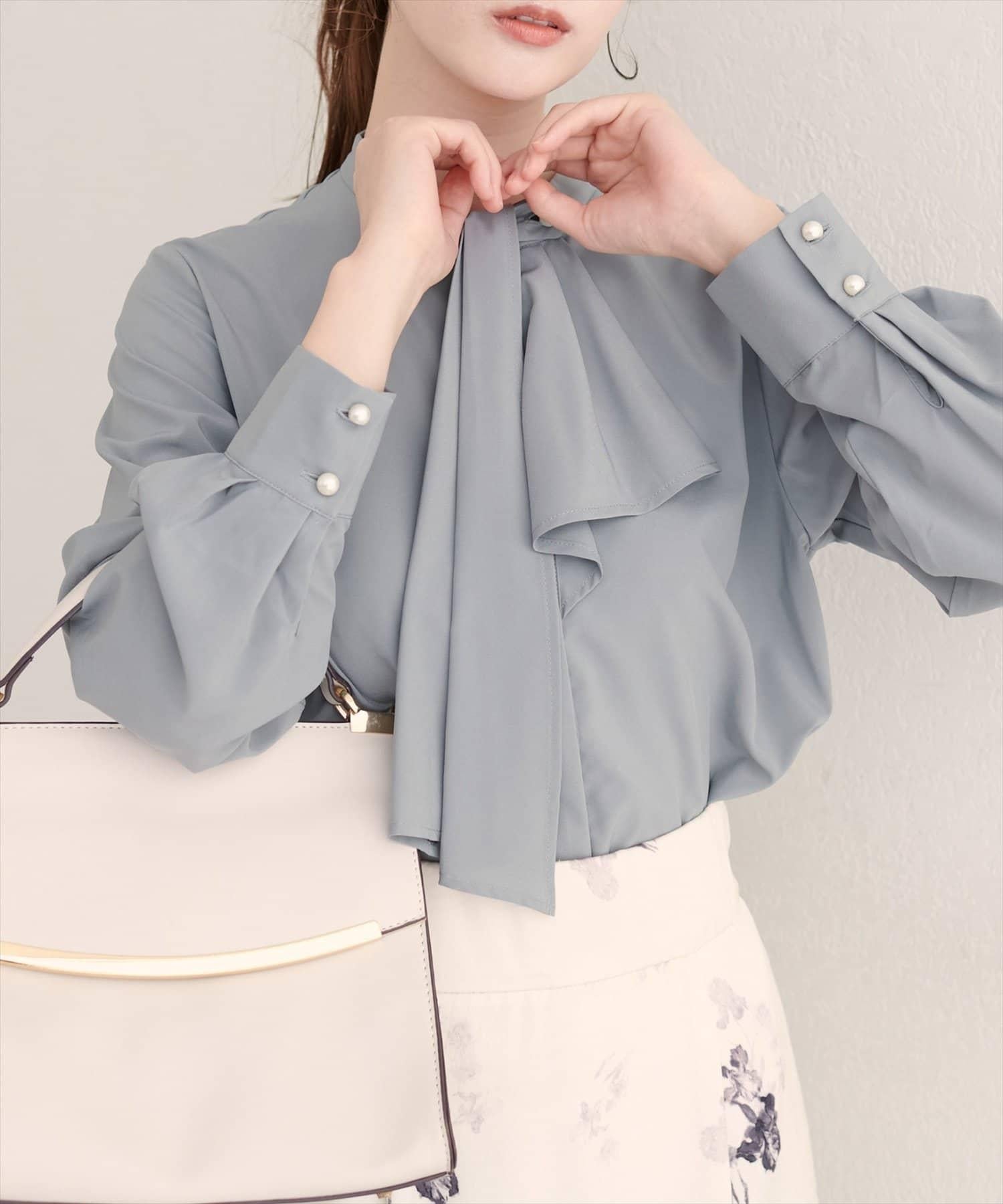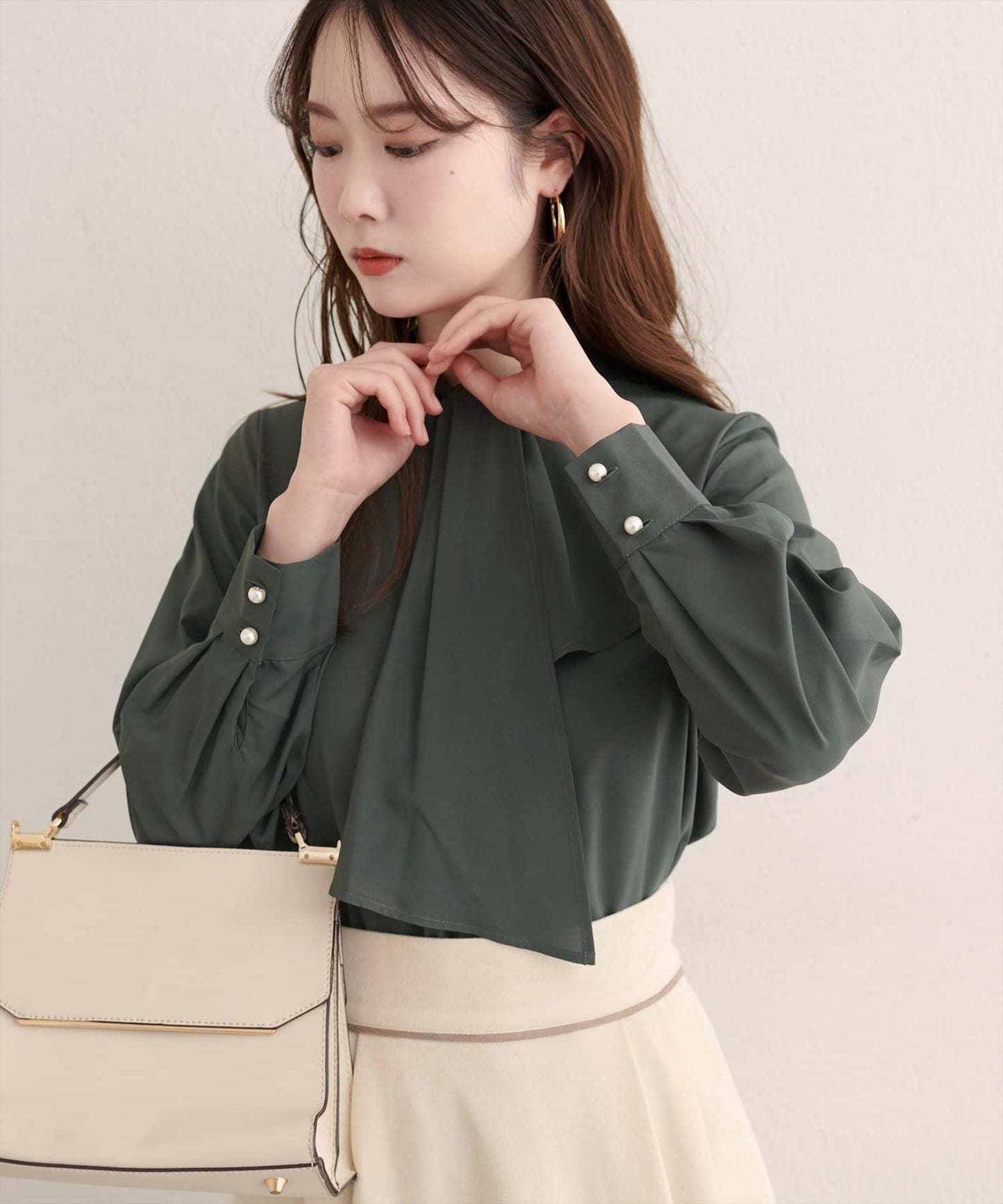 這款優雅的上衣採用垂墜式圍巾繫帶設計。