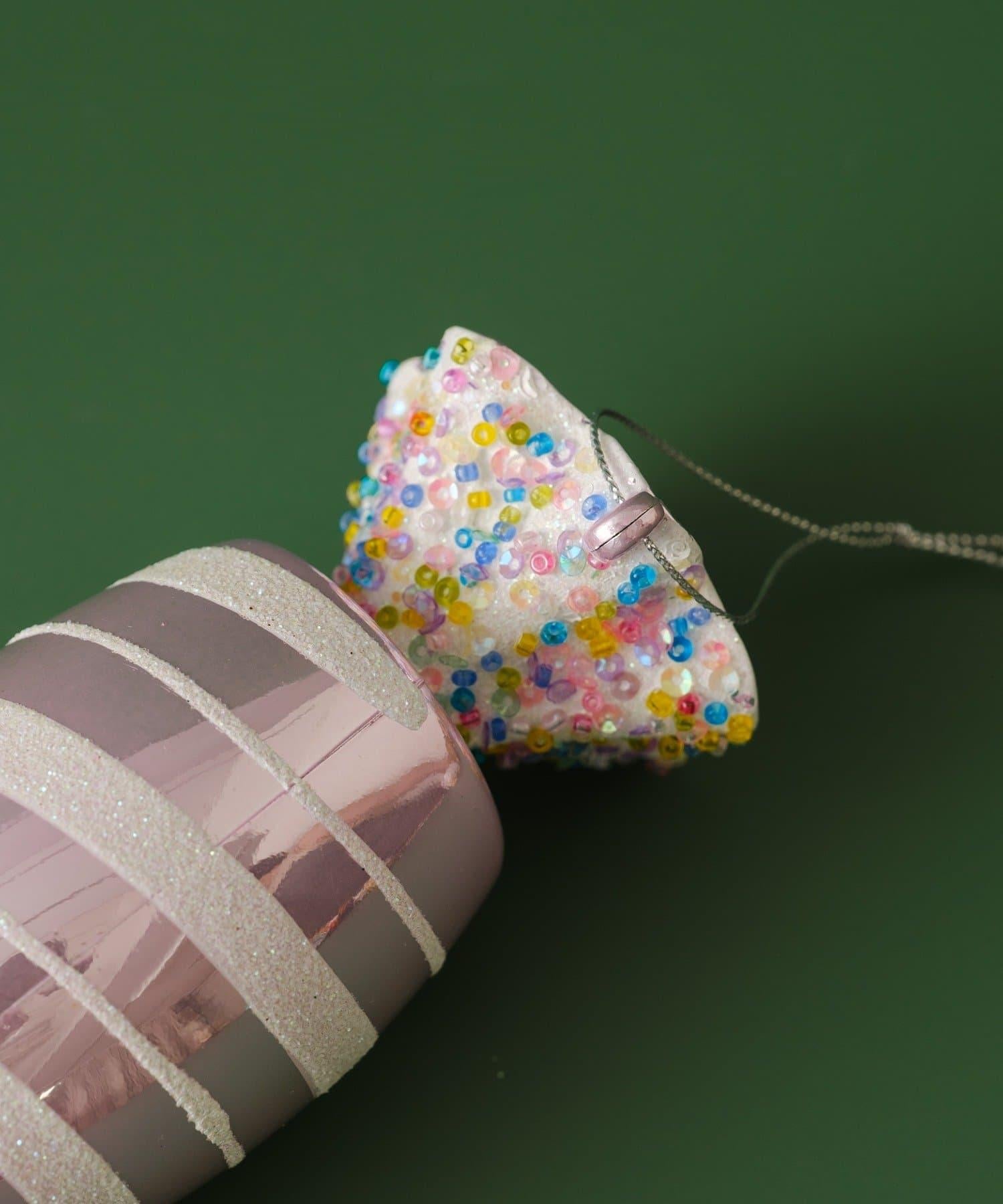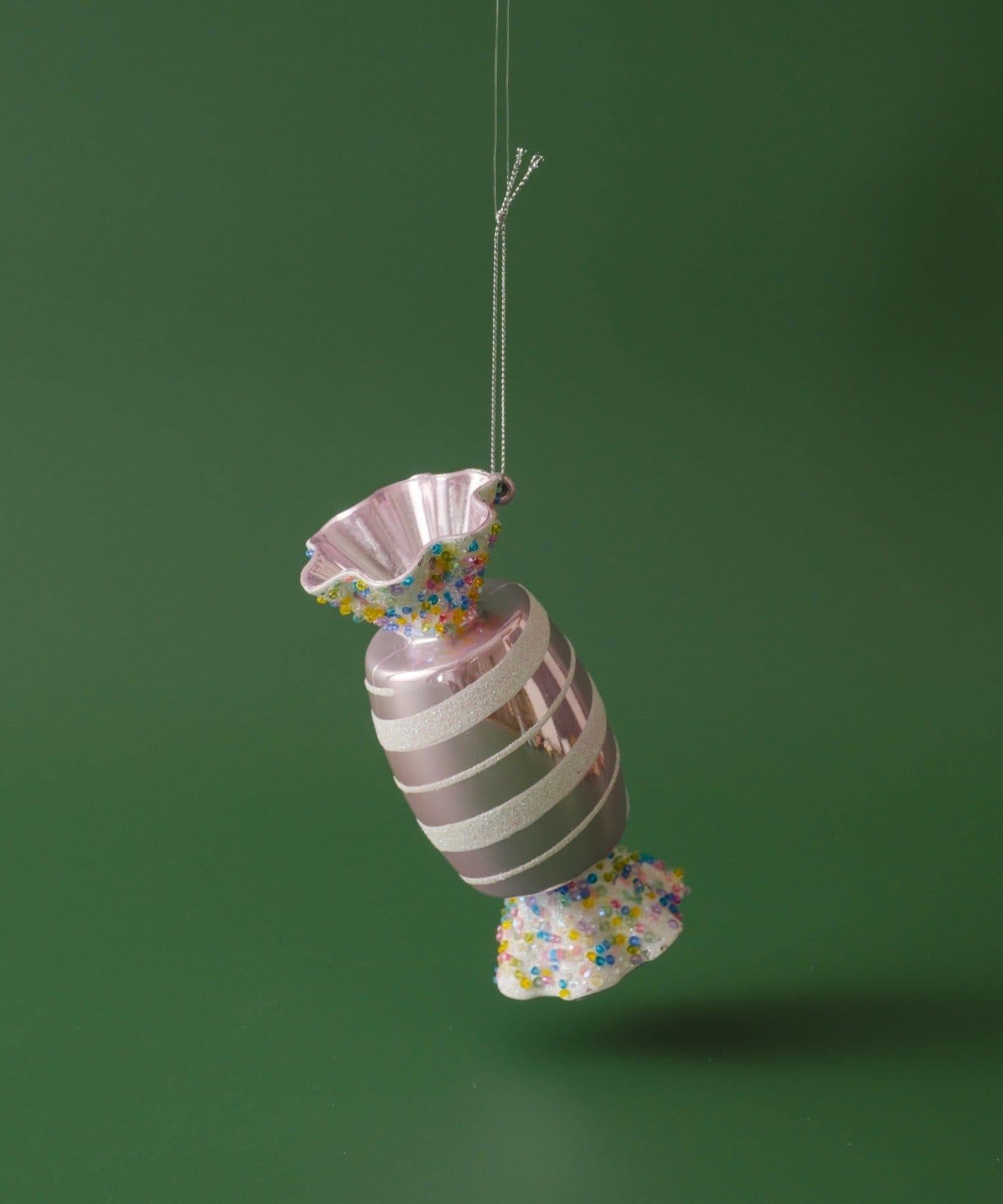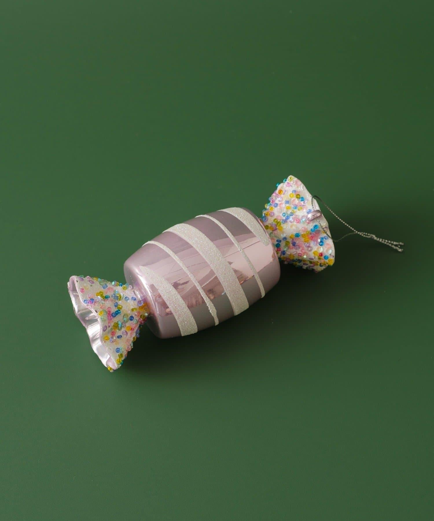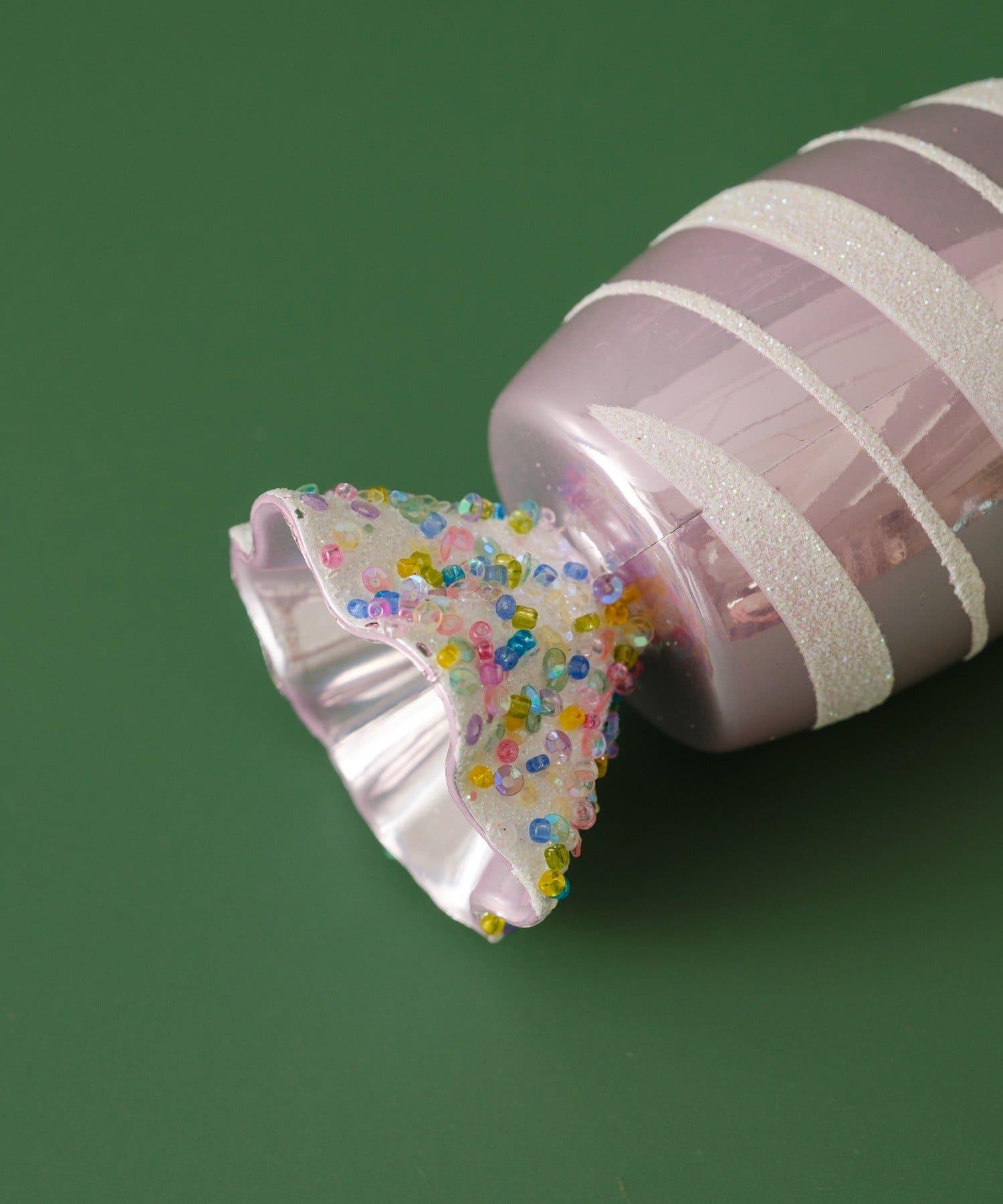 五彩繽紛的糖果造型裝飾品,粉紅色光亮底座,白色跛行線條,兩端有彩色珠子。