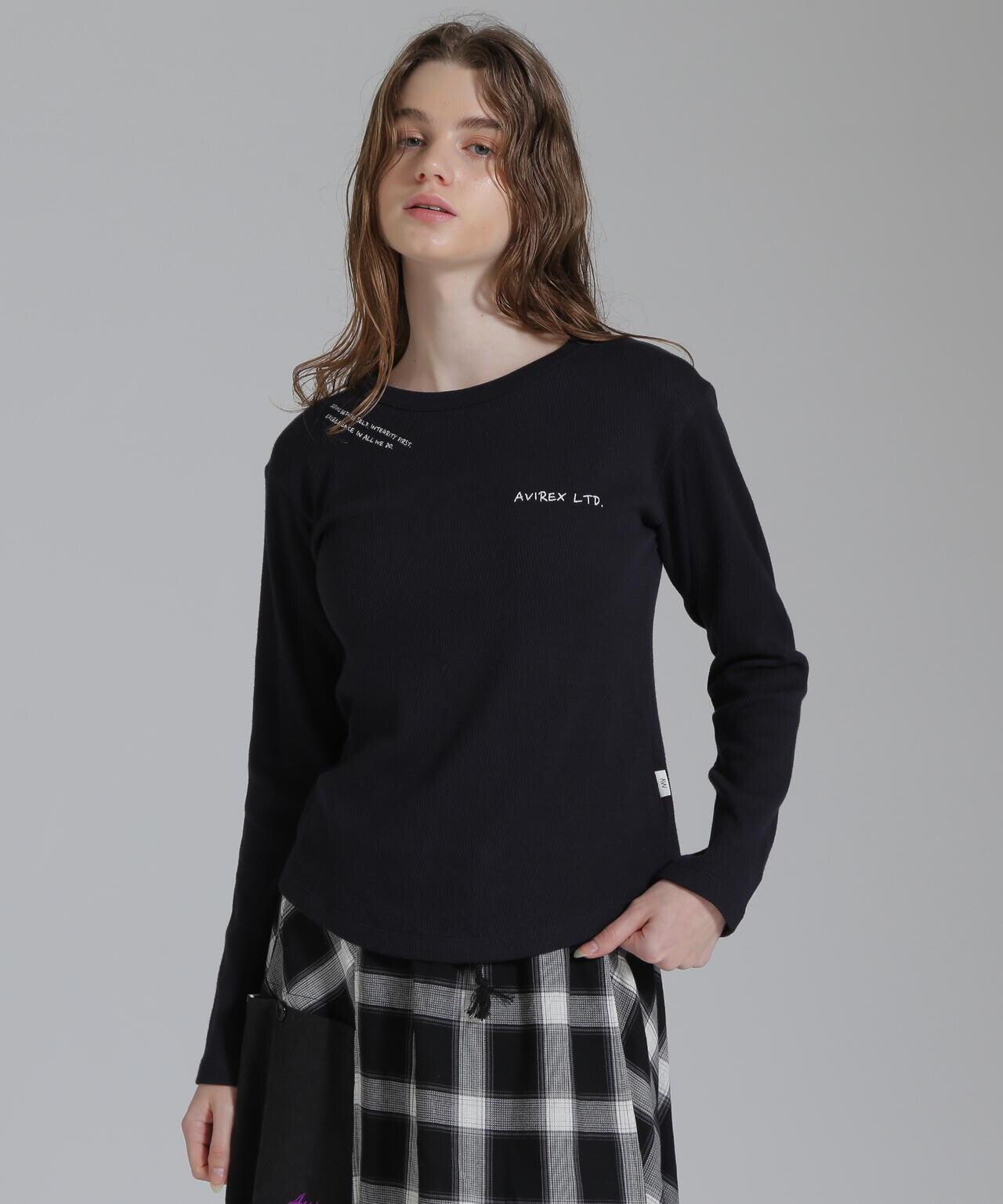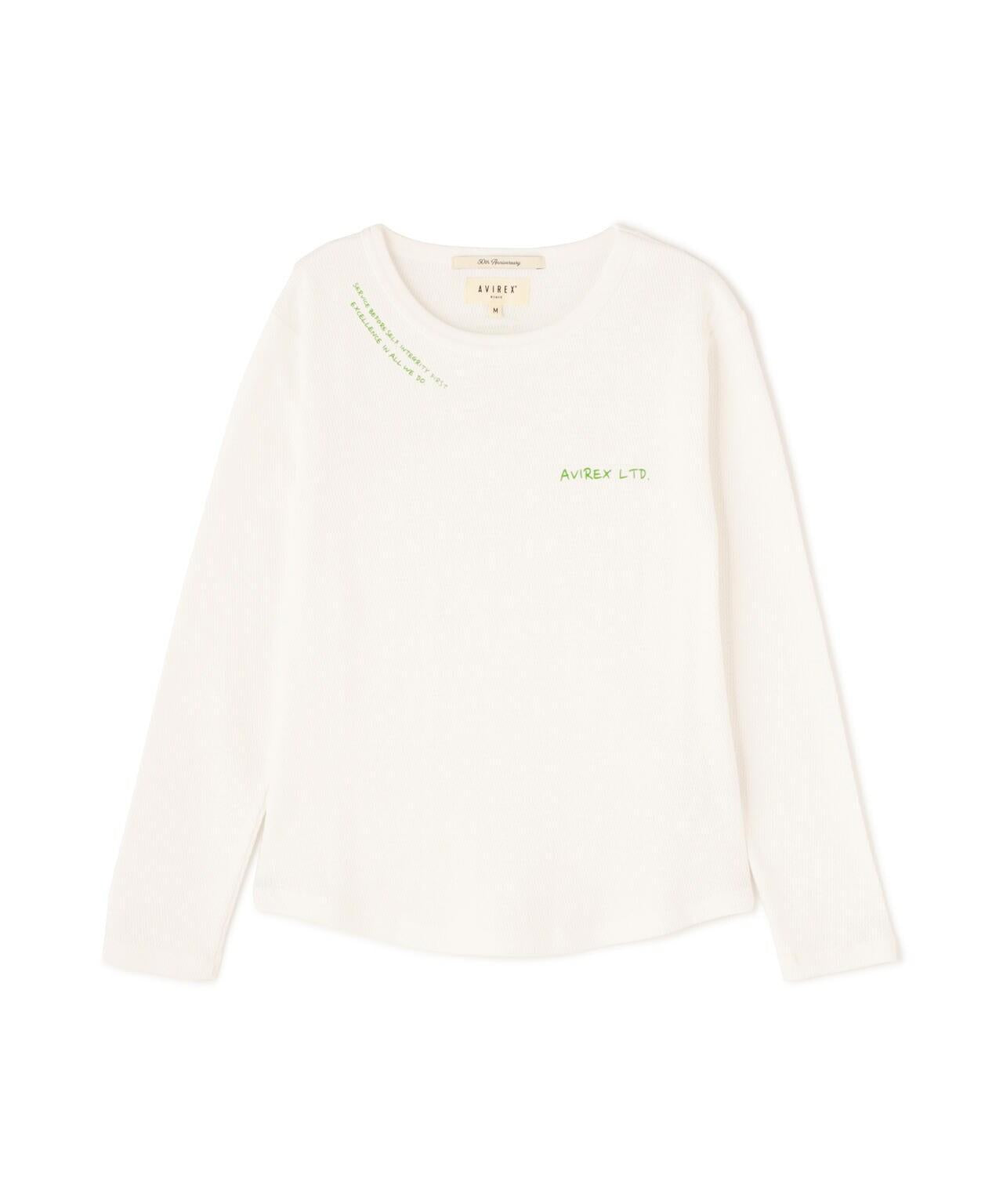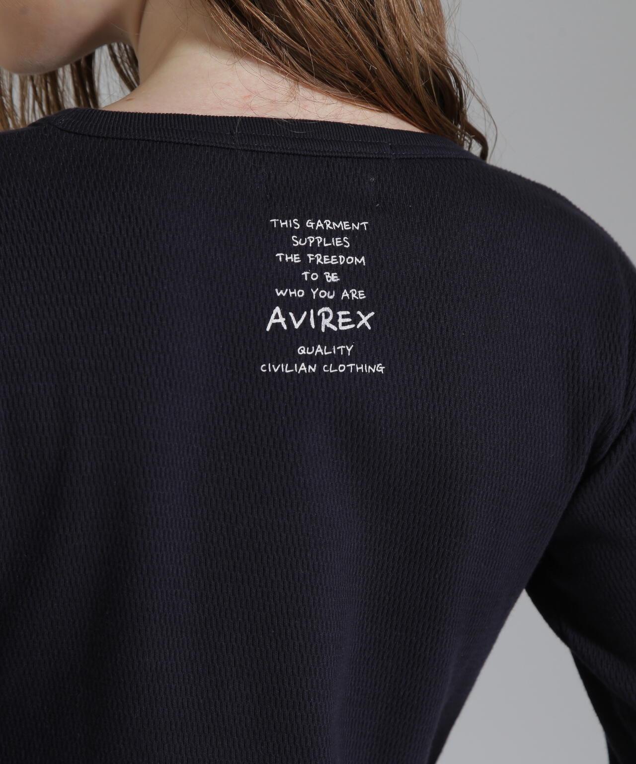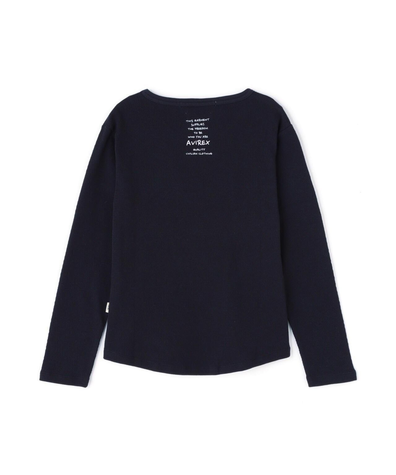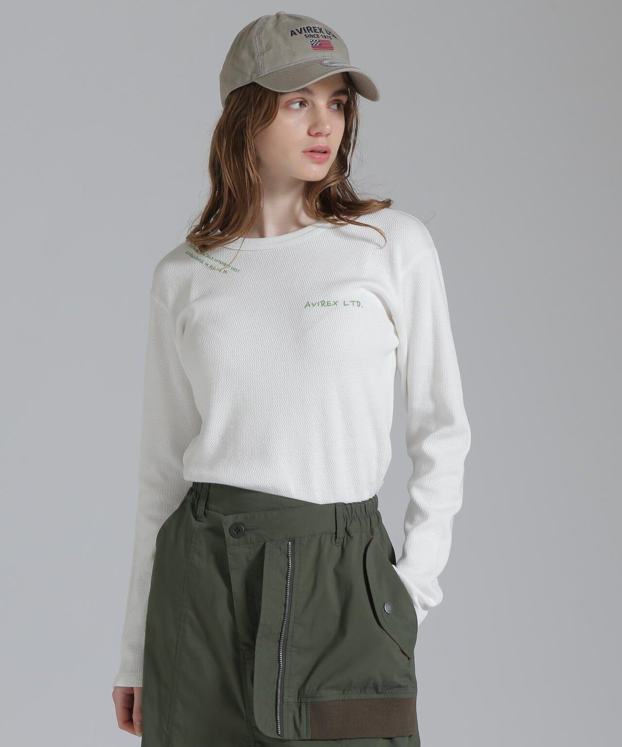 AVIREX 官方直營店] 2025 春季新款多色印花蜂巢華夫格T恤 - 採用柔軟且富有彈性的蜂巢華夫格面料的長袖T恤 - 以生動的刺繡風格印花為主 - 稍微沿身體線條設計、下襬呈圓形,輪廓優美。推薦造型簡潔的輪廓與裙裝和寬鬆的下裝非常搭配。還可搭配簡單的軍裝造型。AVIREX WOMAN] 該系列將正宗軍裝的功能性和設計感投射到女式休閒裝上。作為一個獨特而永恆的女裝品牌,它以智慧、自由、好奇和高貴著稱。