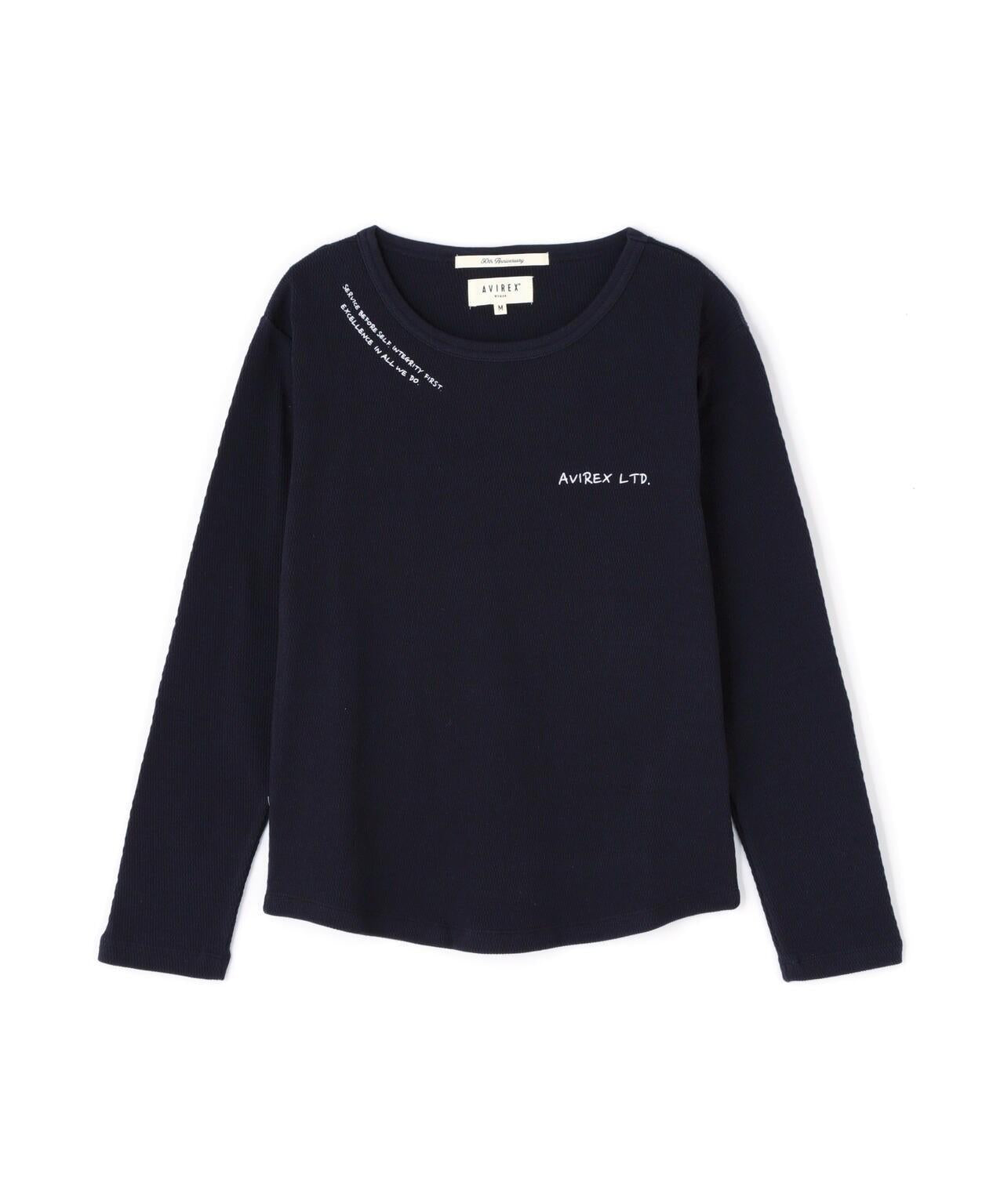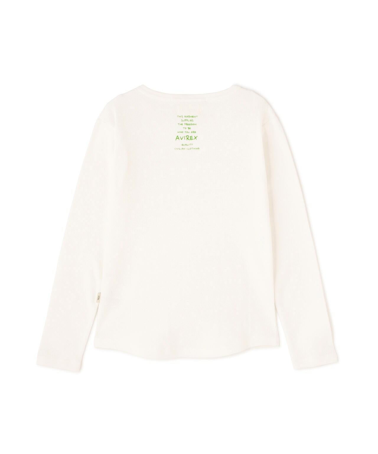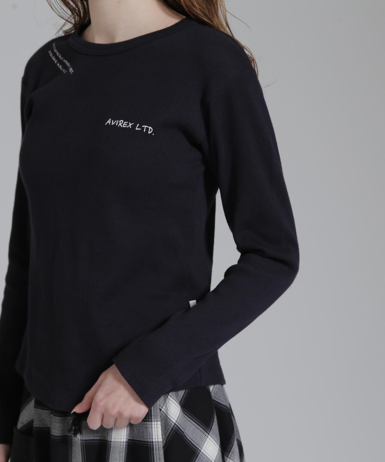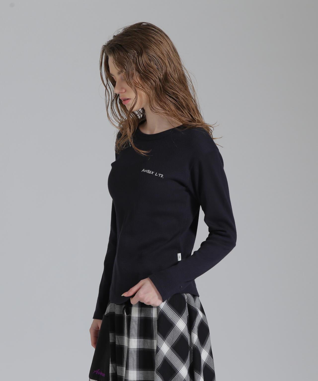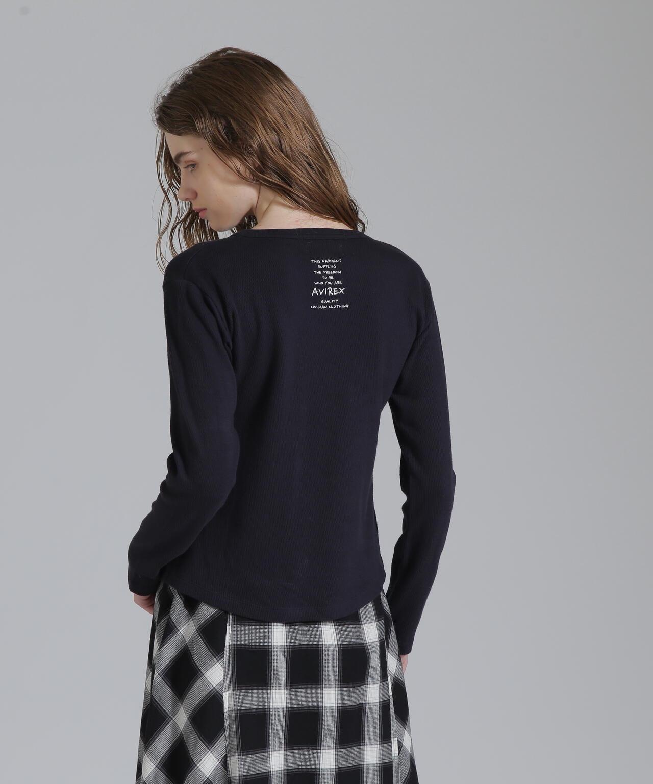 AVIREX 官方直營店] 2025 春季新款多色印花蜂巢華夫格T恤 - 採用柔軟且富有彈性的蜂巢華夫格面料的長袖T恤 - 以生動的刺繡風格印花為主 - 稍微沿身體線條設計、下襬呈圓形,輪廓優美。推薦造型簡潔的輪廓與裙裝和寬鬆的下裝非常搭配。還可搭配簡單的軍裝造型。AVIREX WOMAN] 該系列將正宗軍裝的功能性和設計感投射到女式休閒裝上。作為一個獨特而永恆的女裝品牌,它以智慧、自由、好奇和高貴著稱。