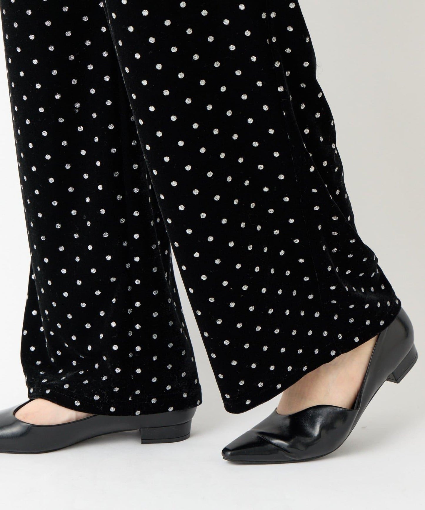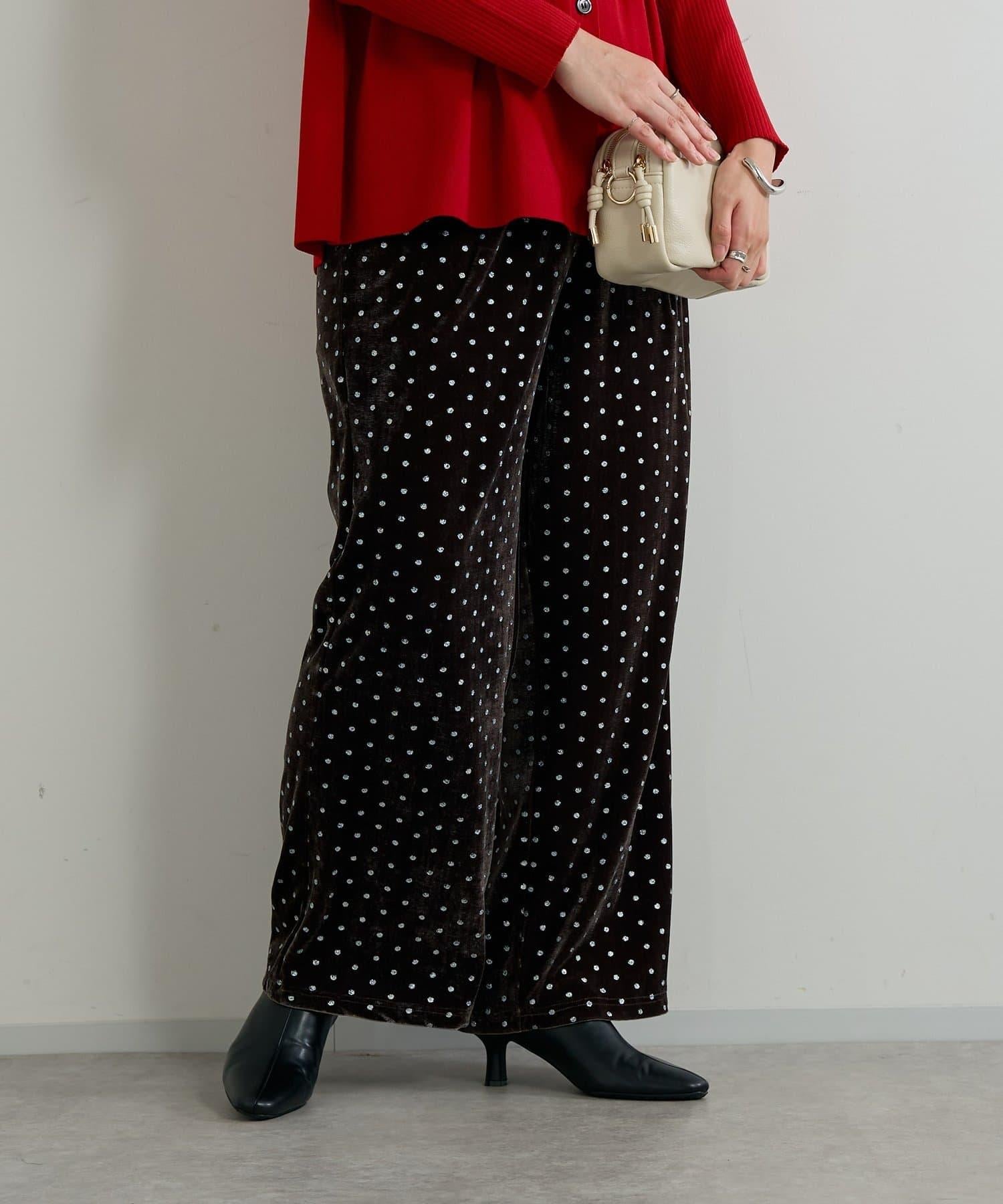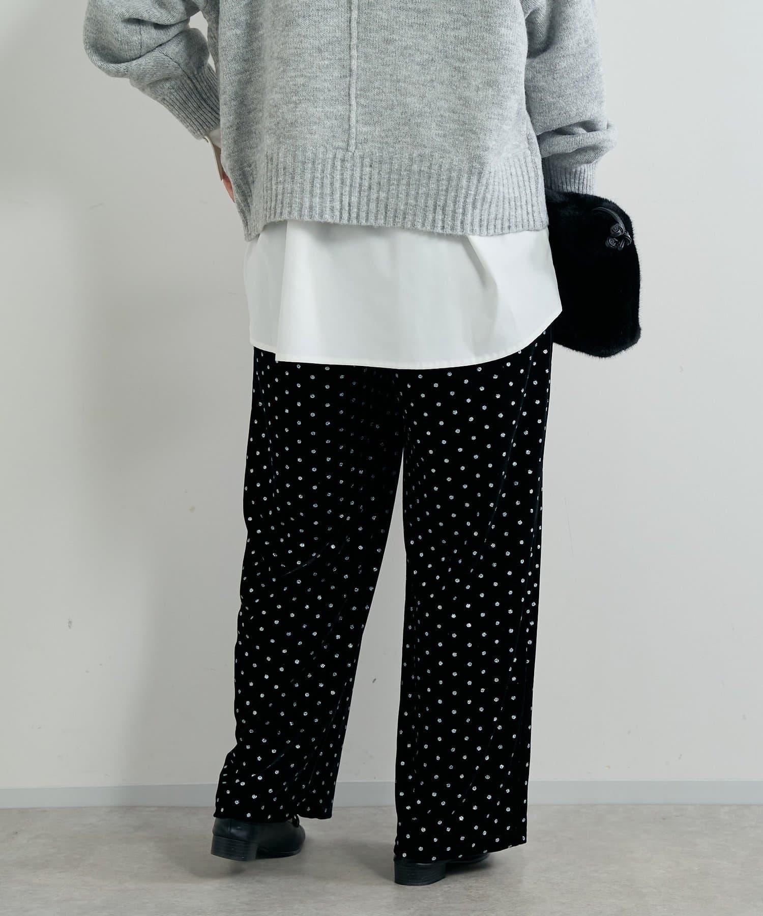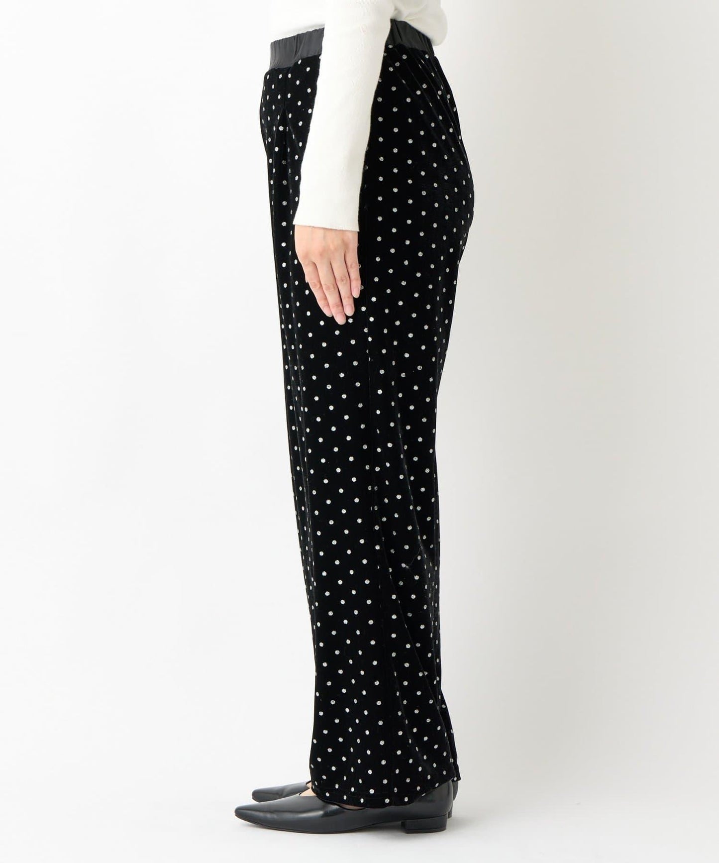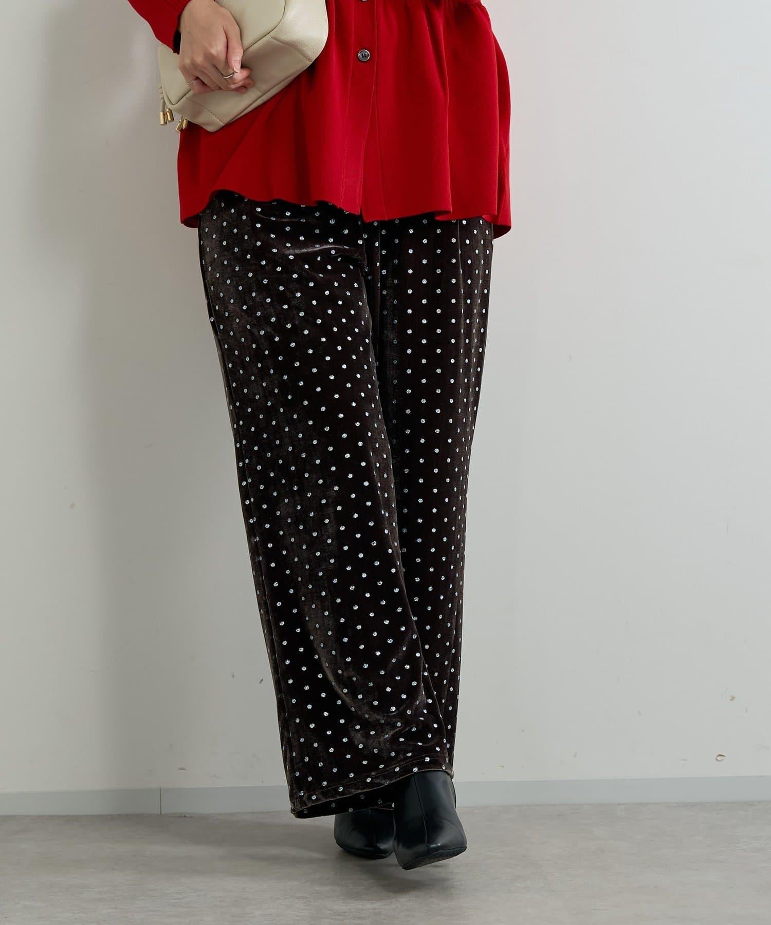 天鵝絨面料上的閃亮小圓點散發出優雅的光澤,讓這款長褲充滿迷人氣息。