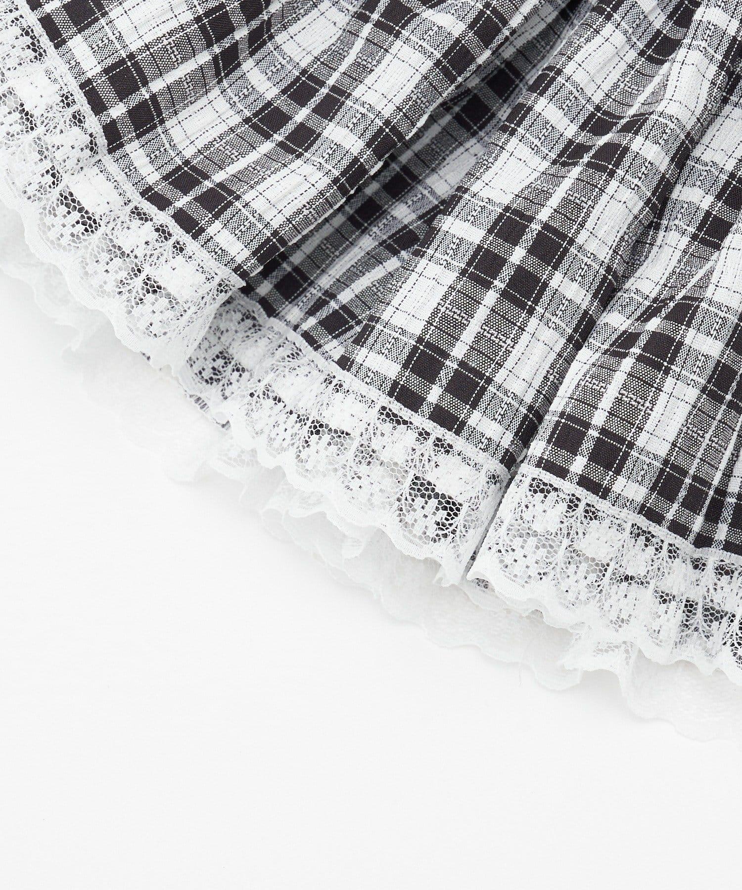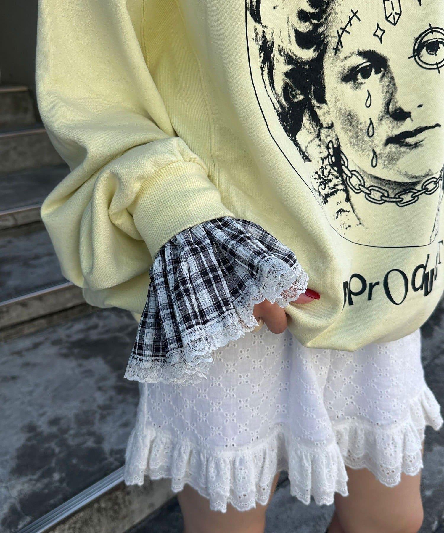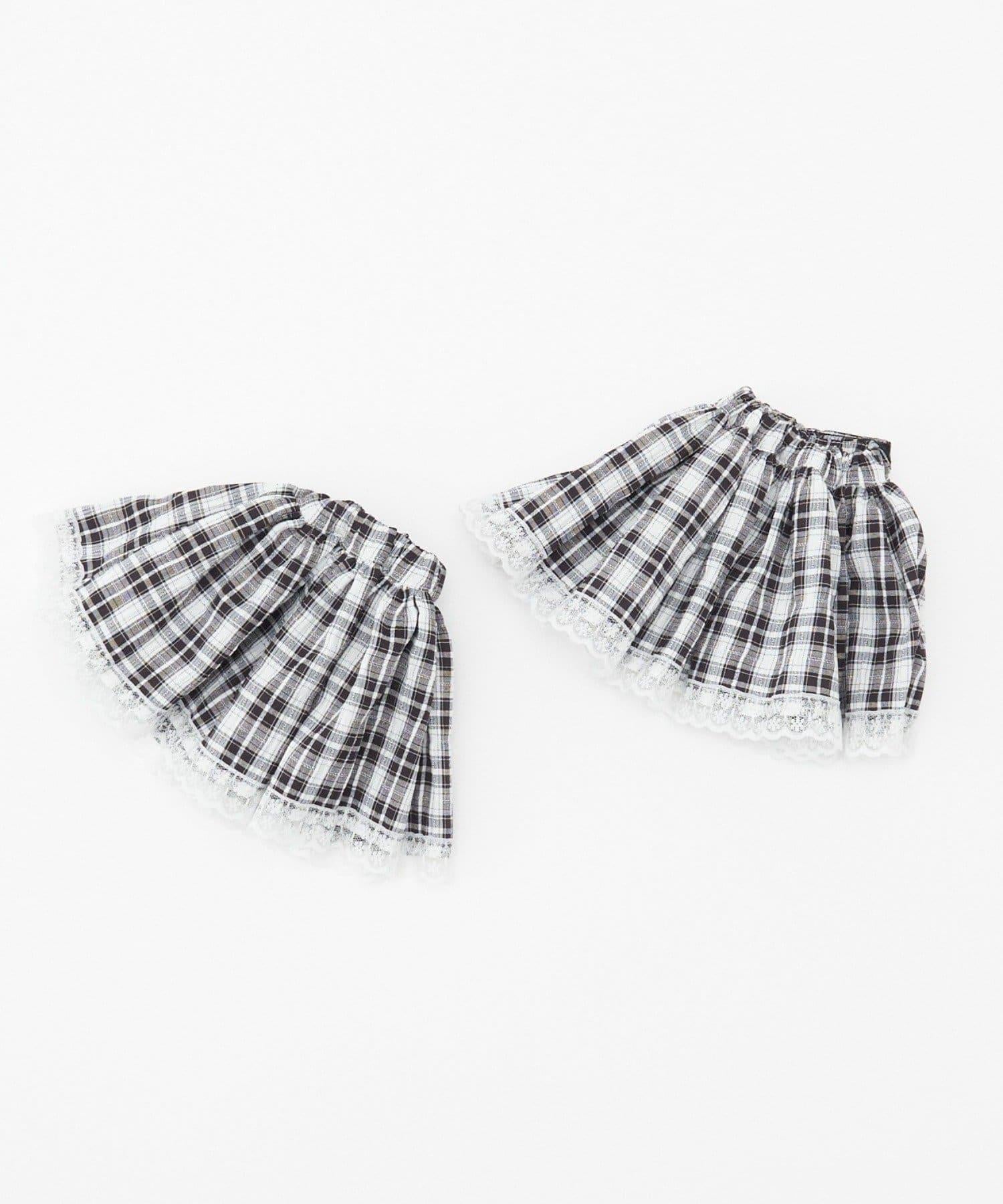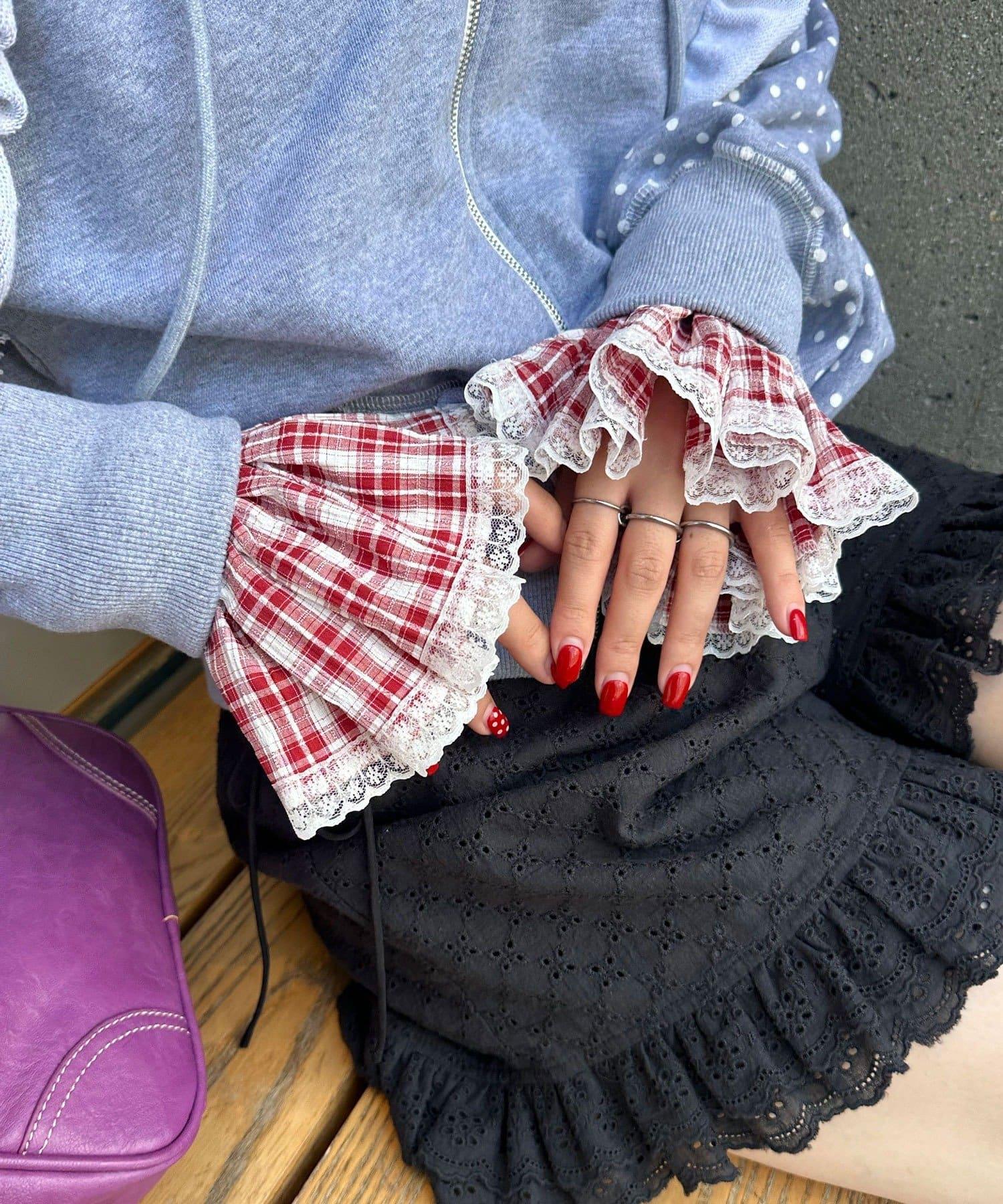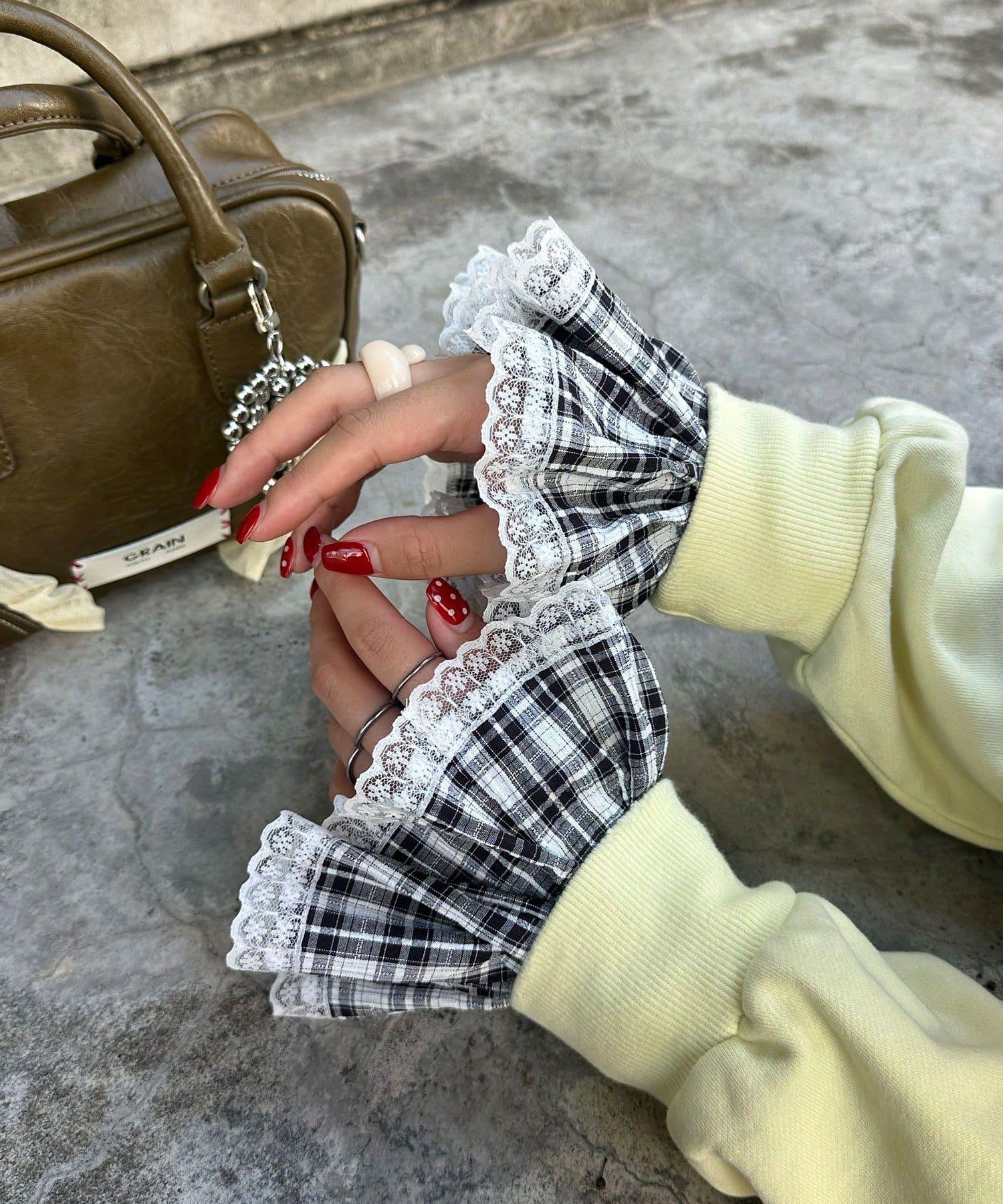 褶皺設計的附袖,飾有棋盤格圖案和蕾絲花邊。