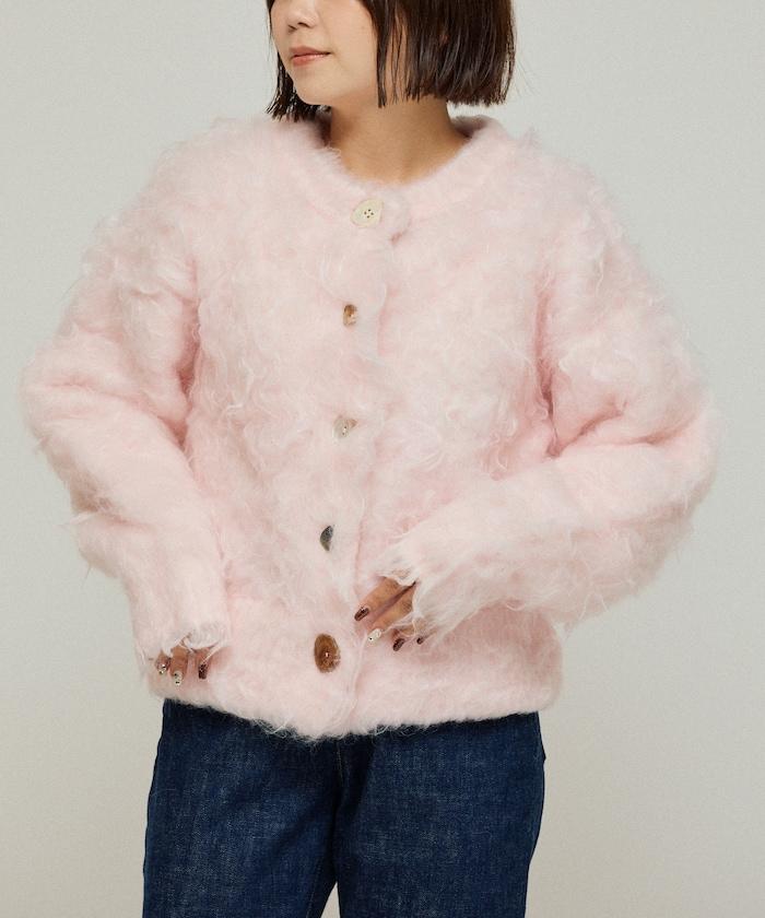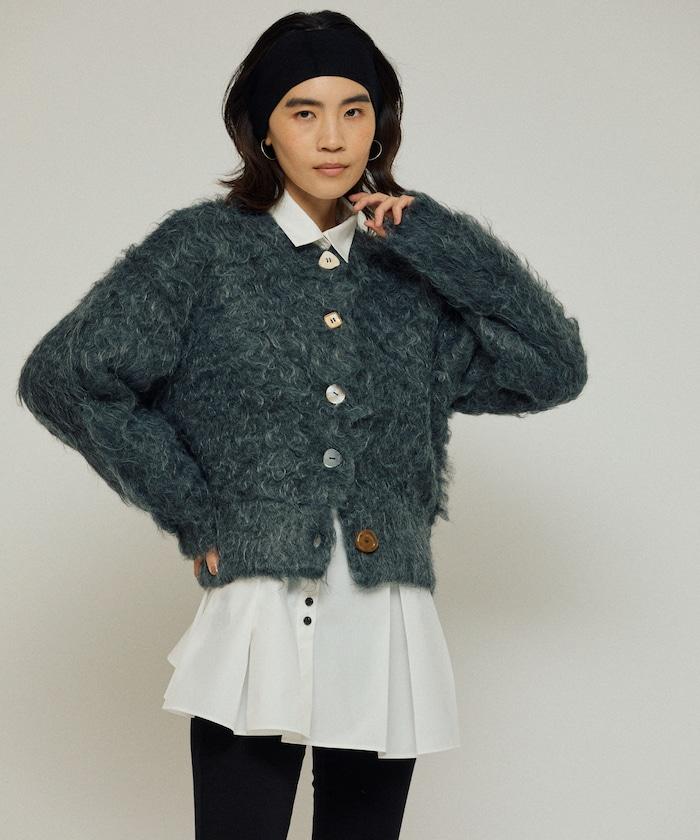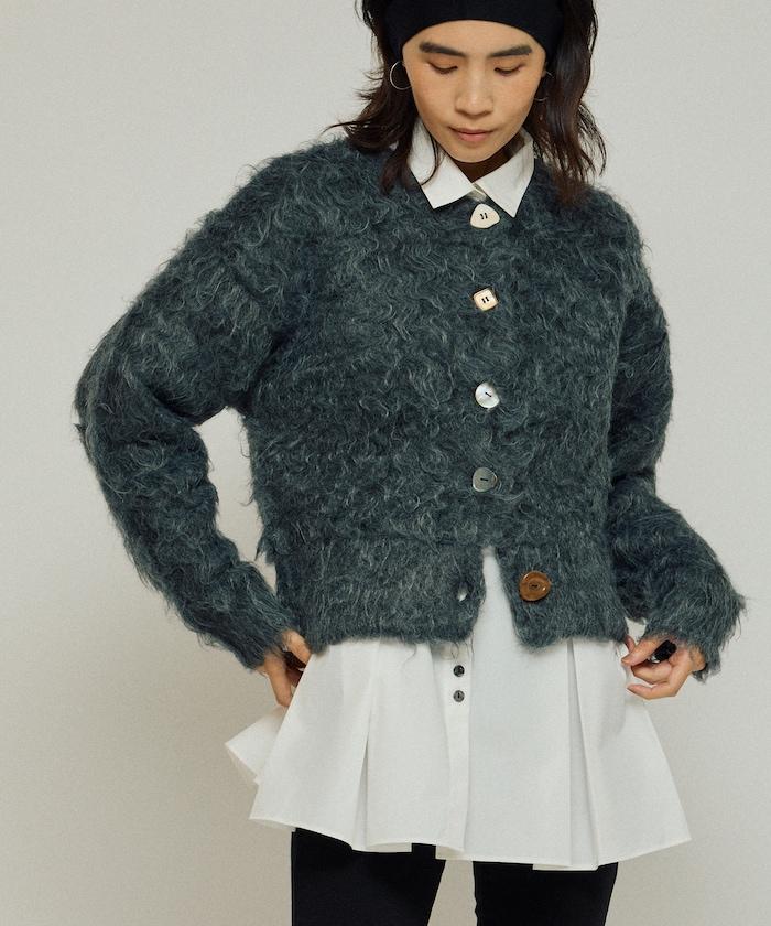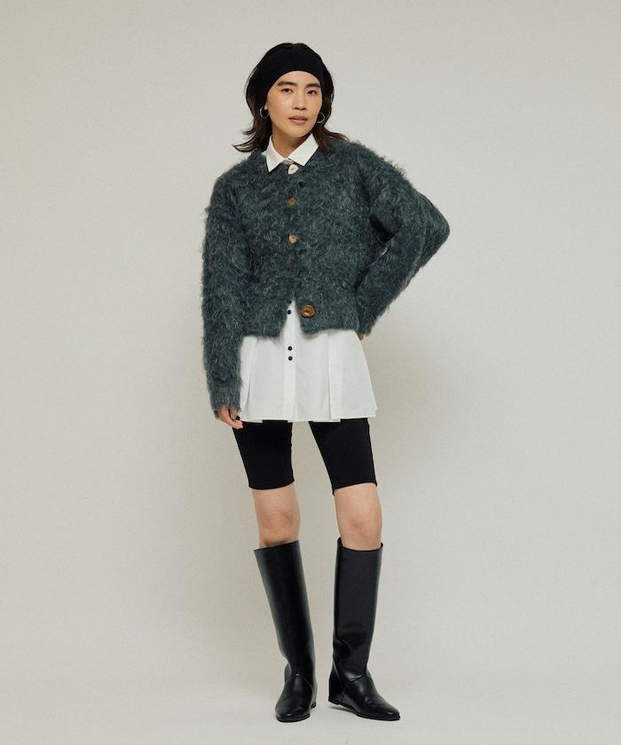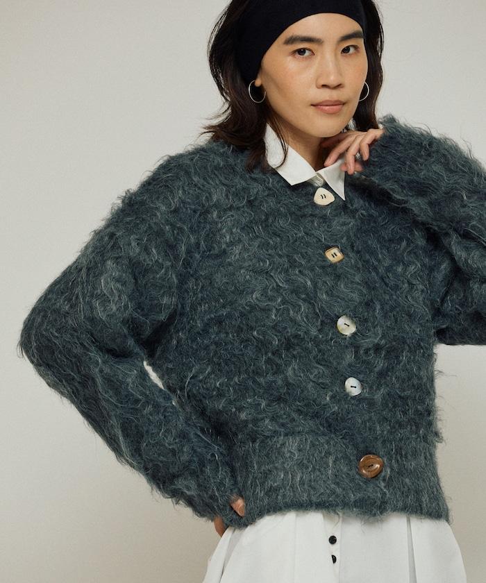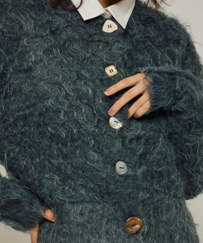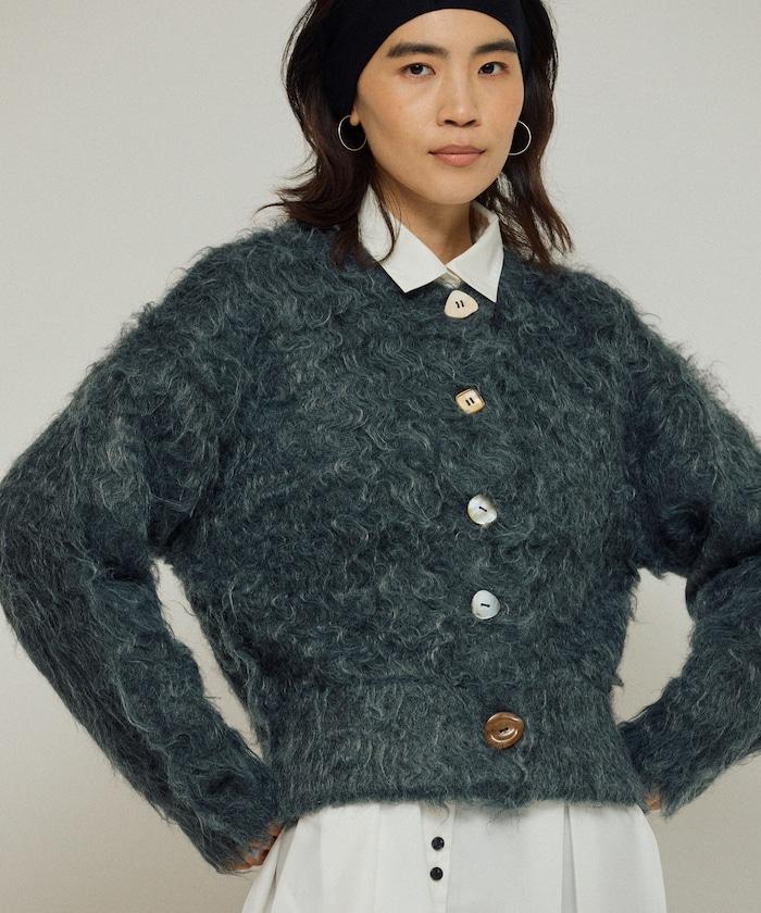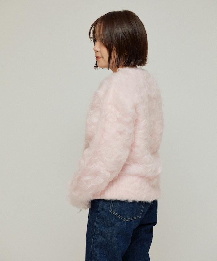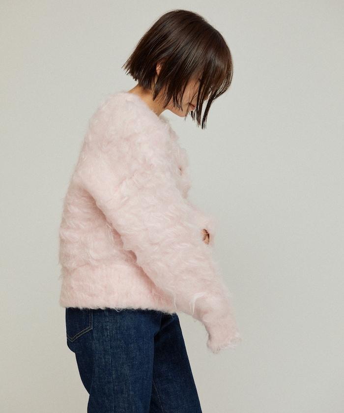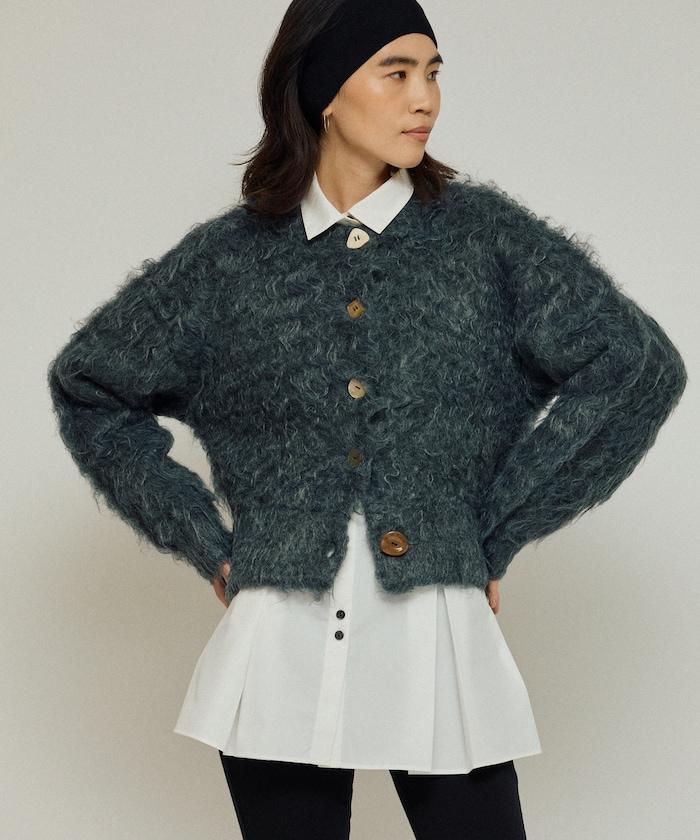 這款針織開衫採用絨毛材質,絨毛較長,具有很強的存在感。