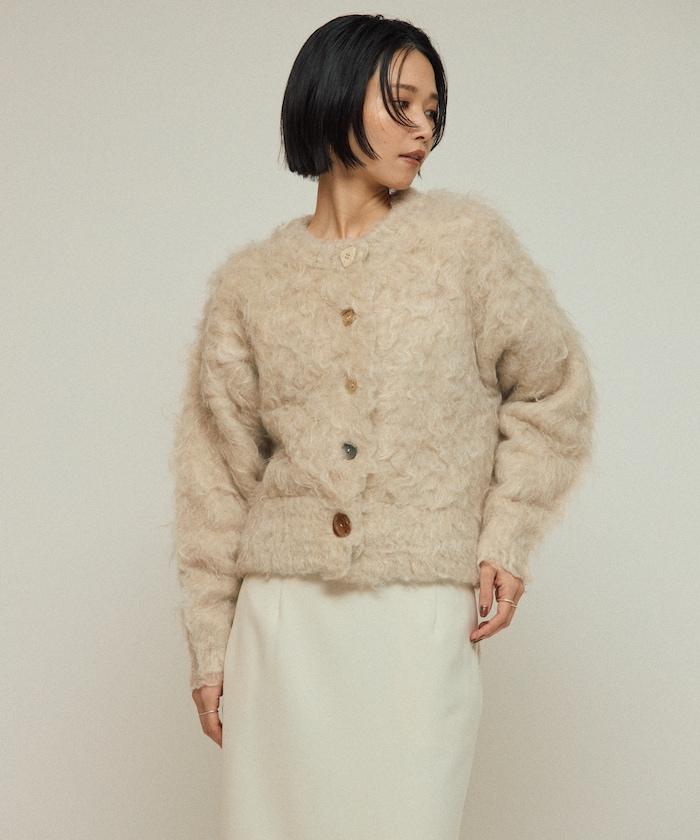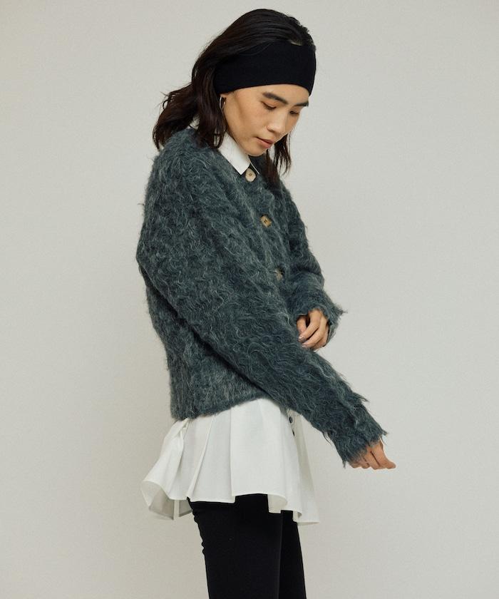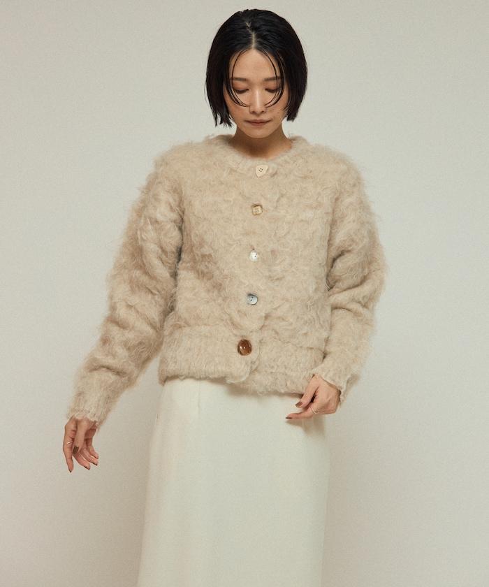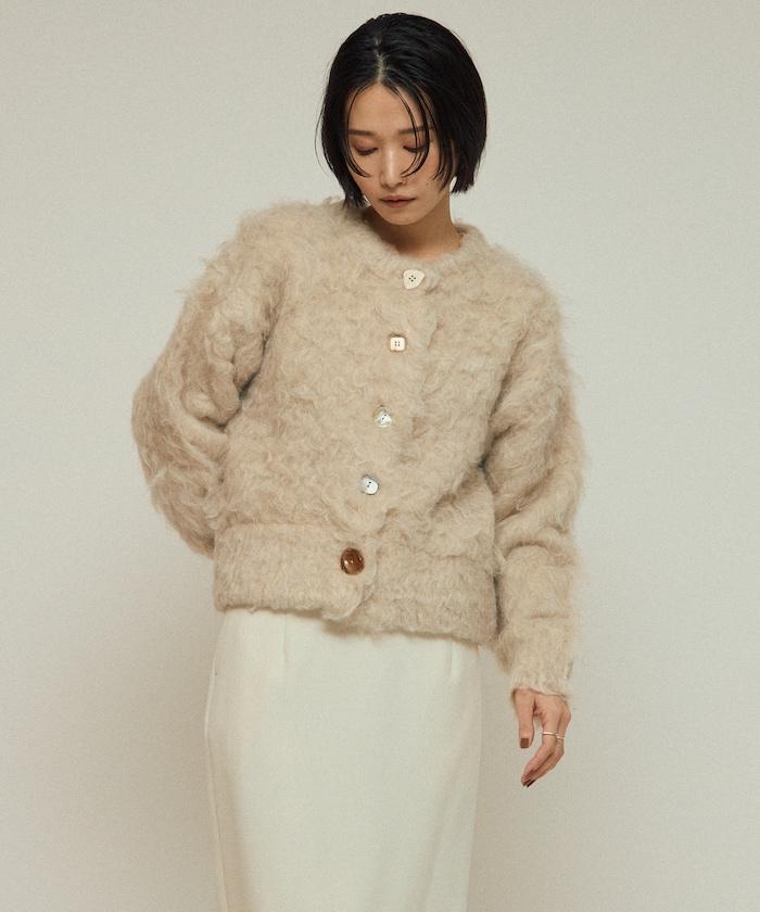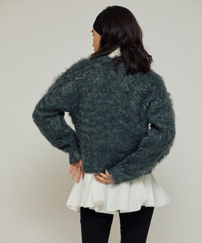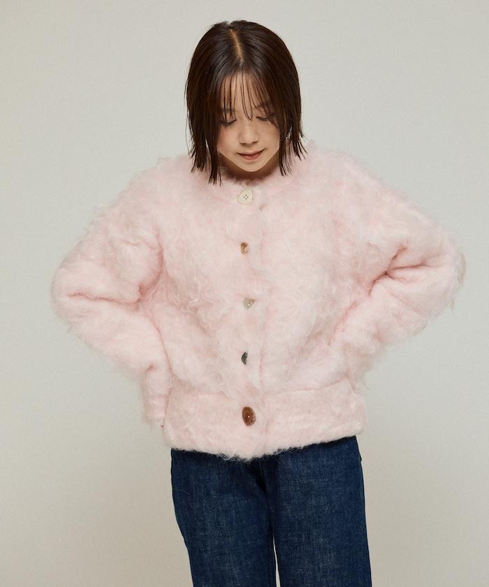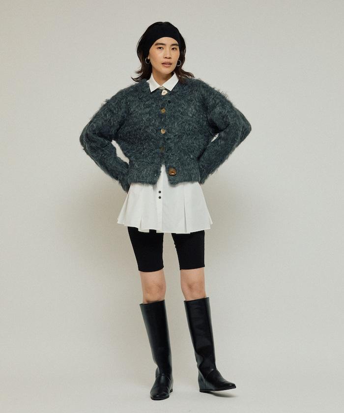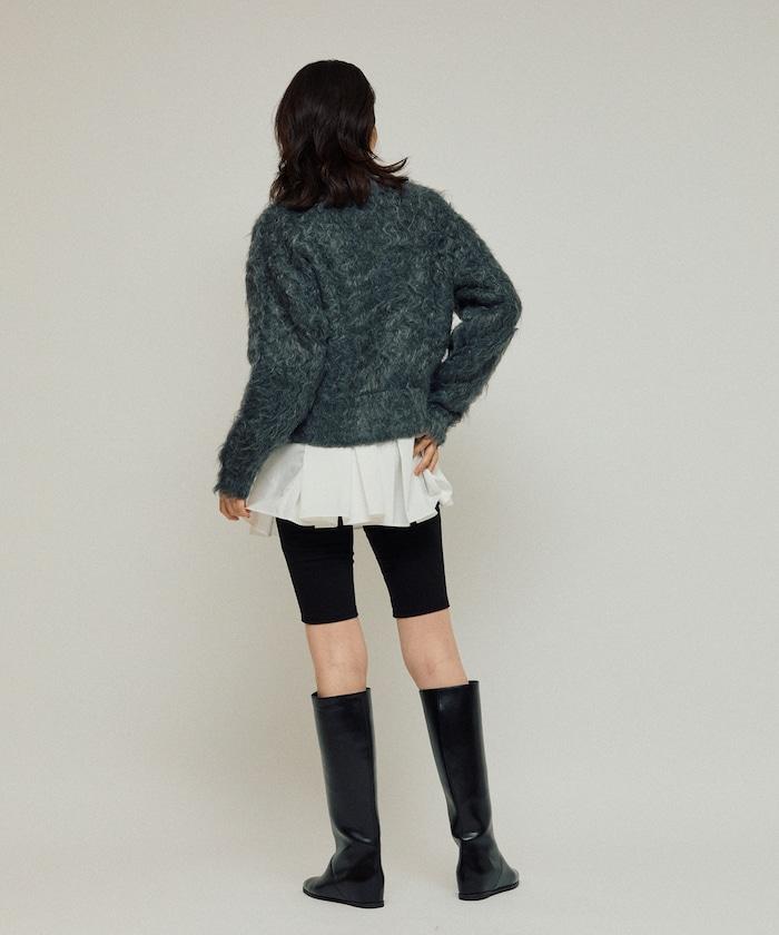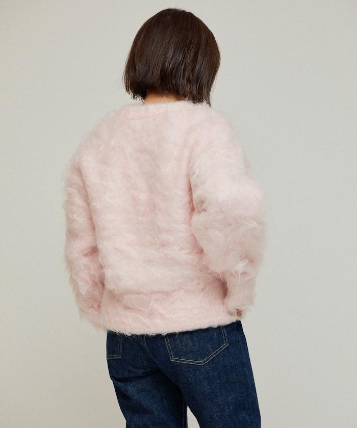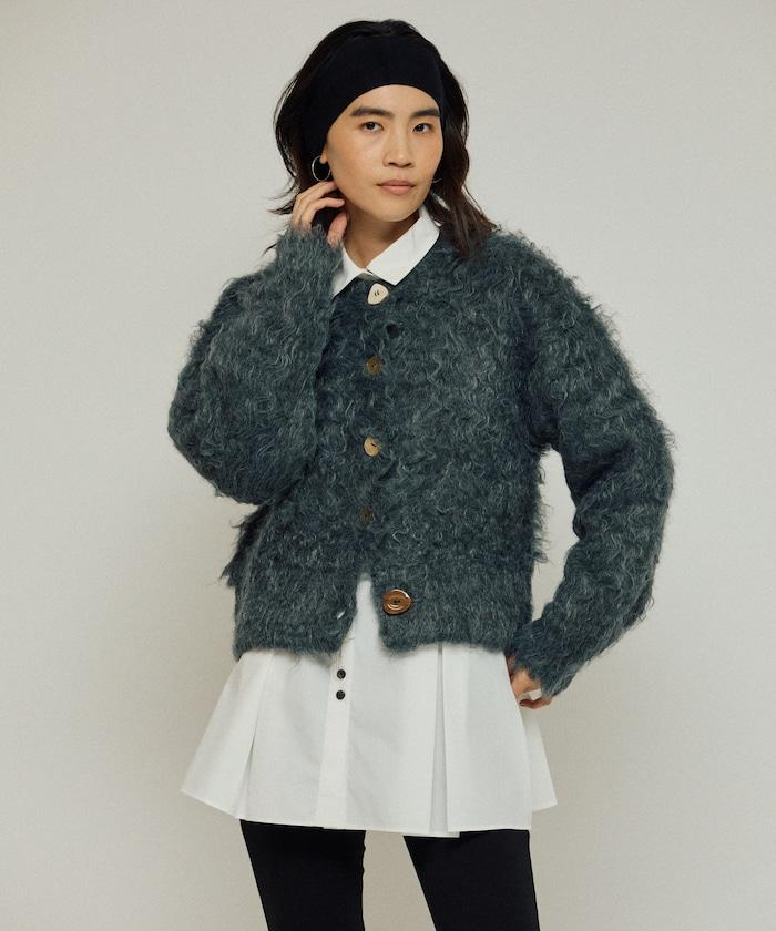 這款針織開衫採用絨毛材質,絨毛較長,具有很強的存在感。