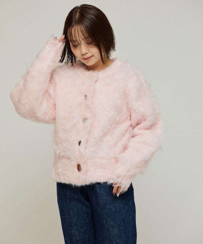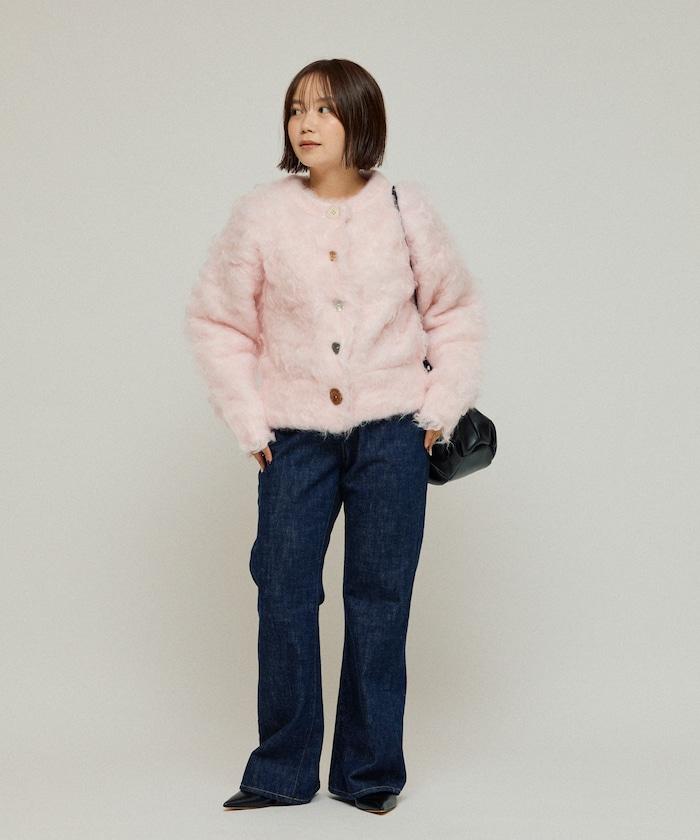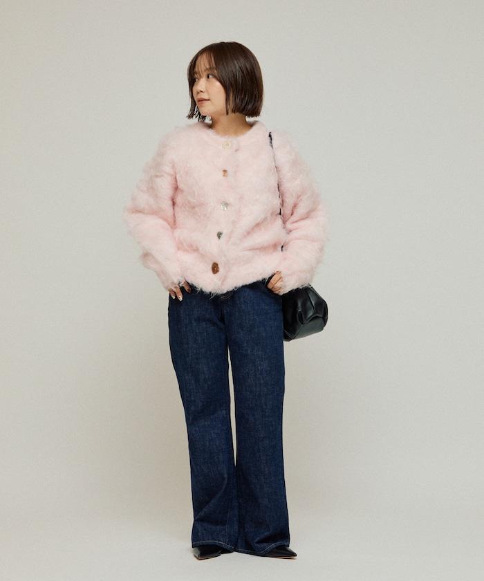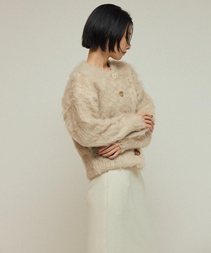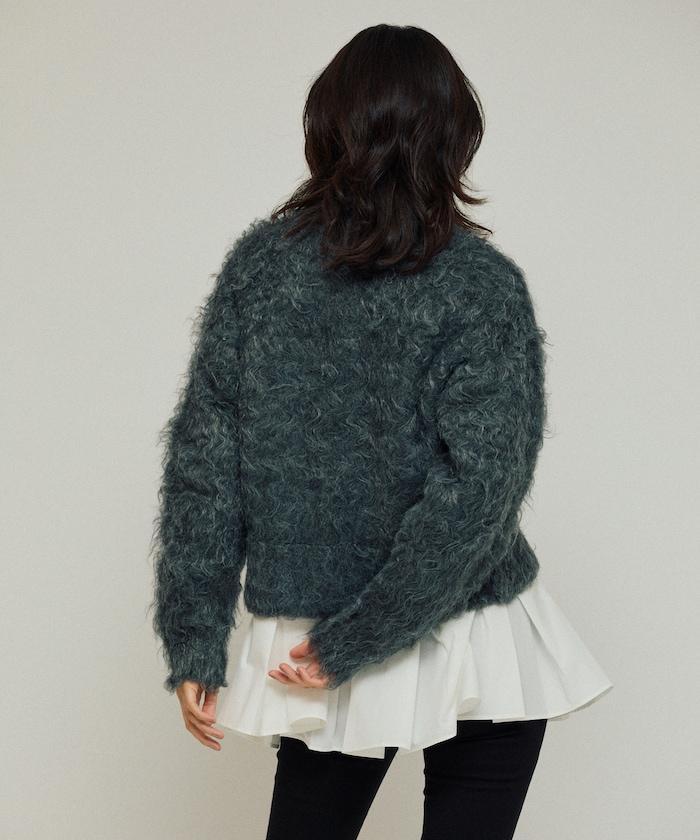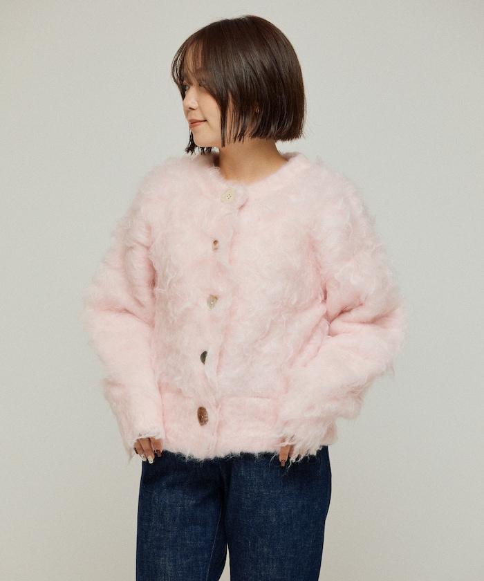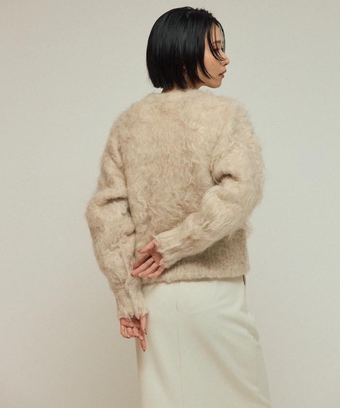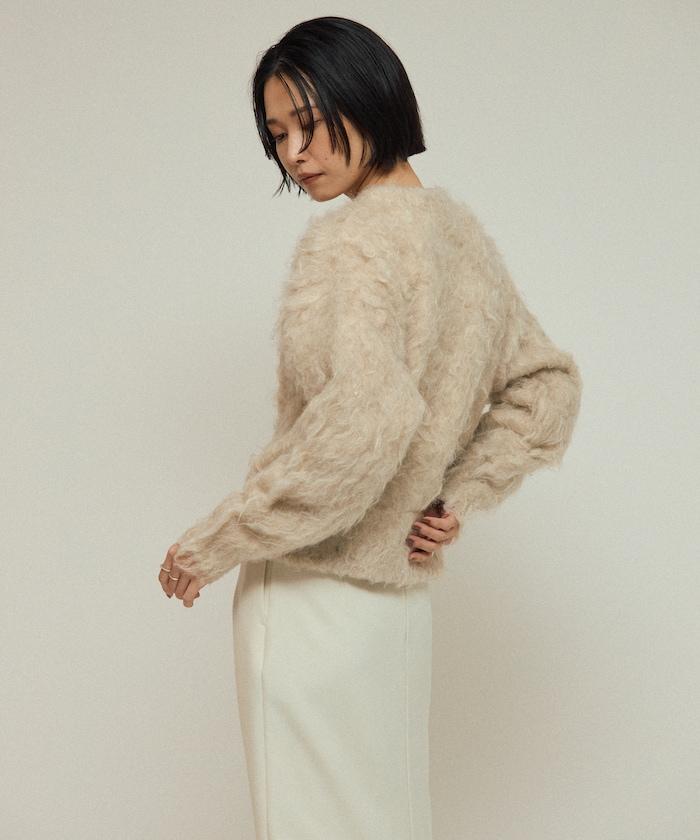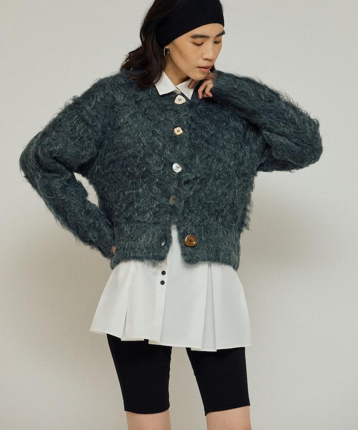 這款針織開衫採用絨毛材質,絨毛較長,具有很強的存在感。