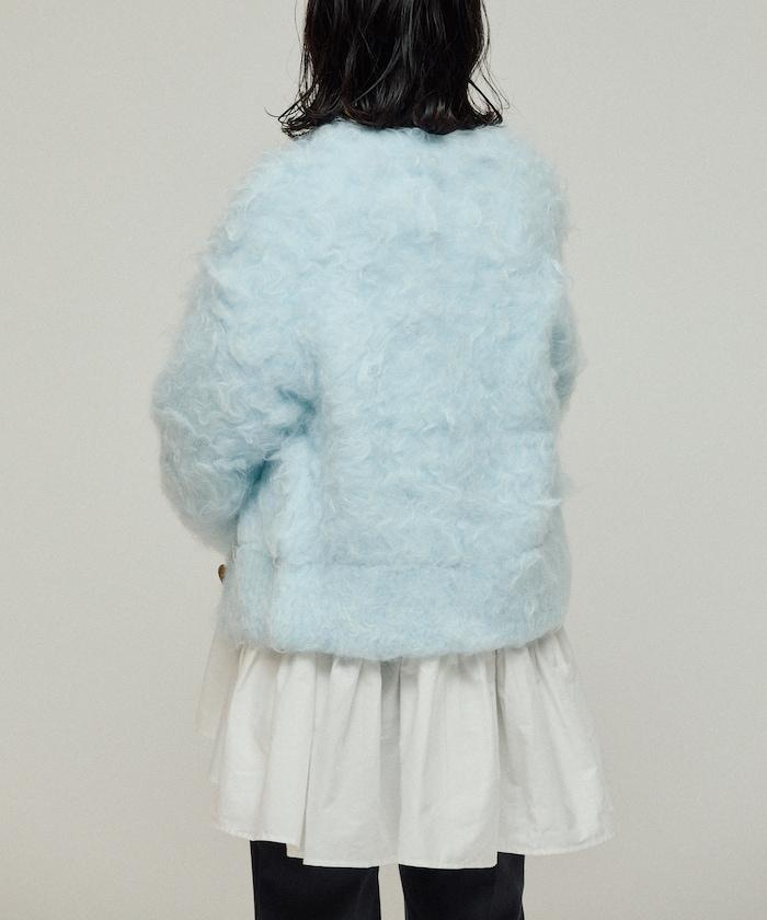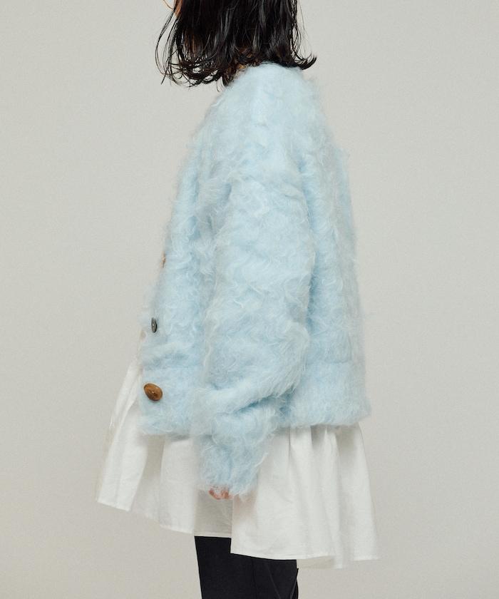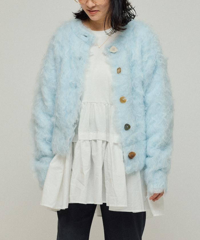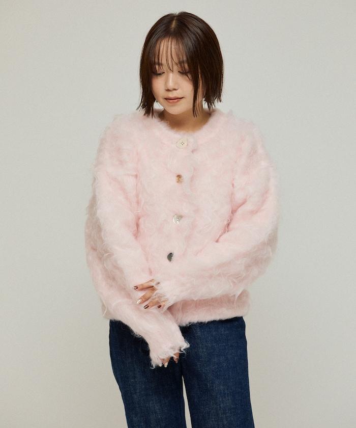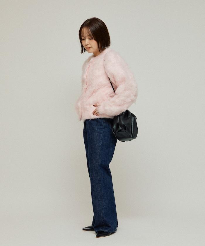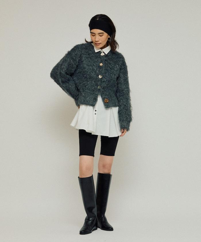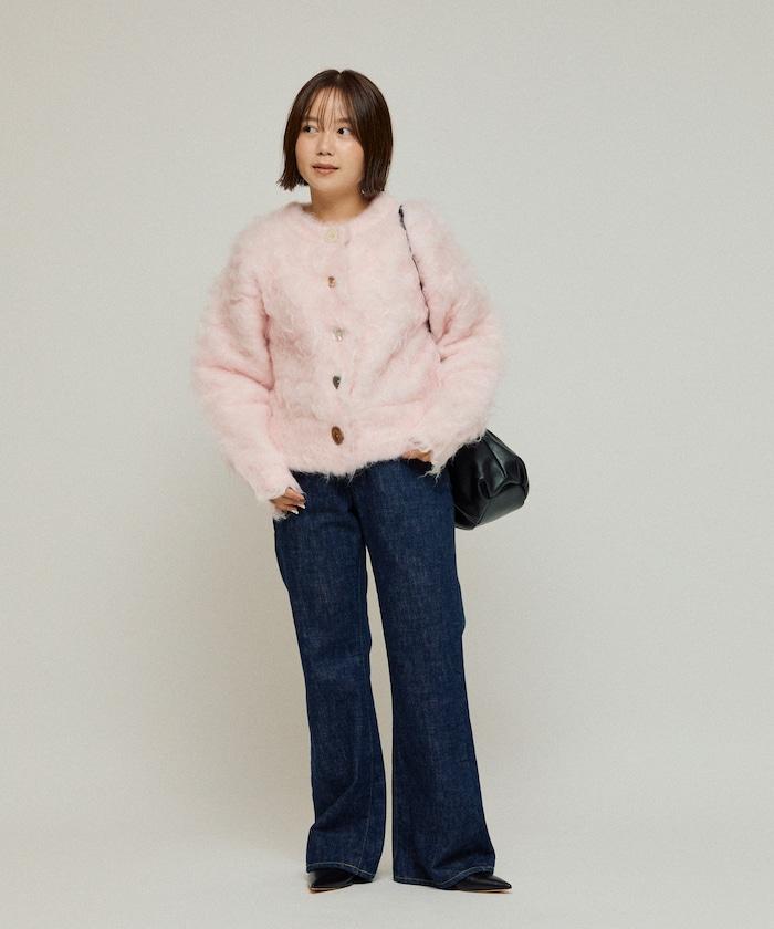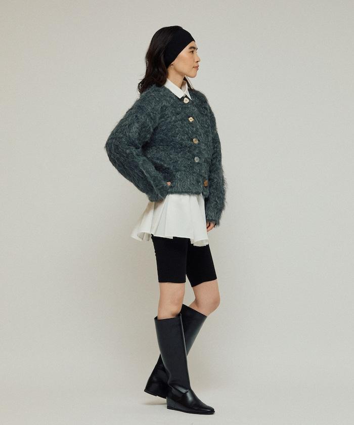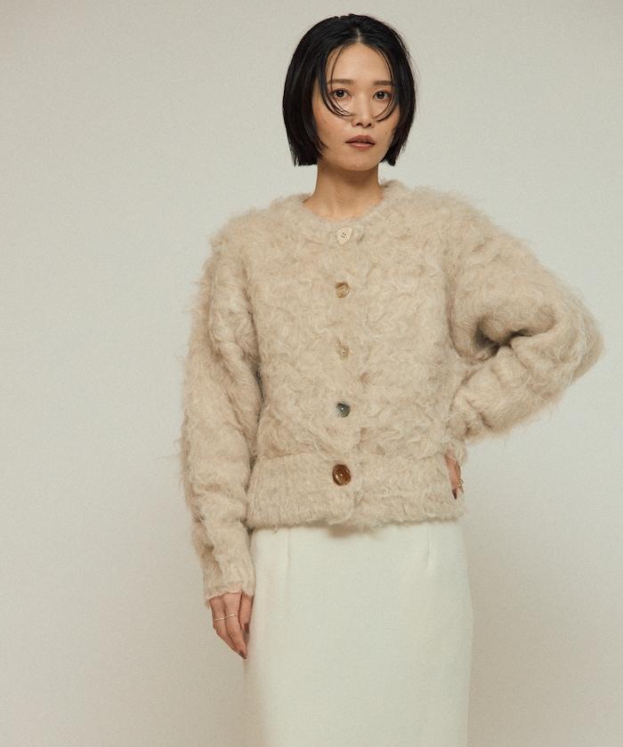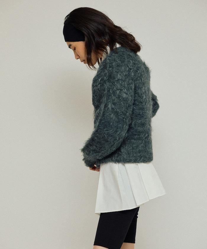 這款針織開衫採用絨毛材質,絨毛較長,具有很強的存在感。