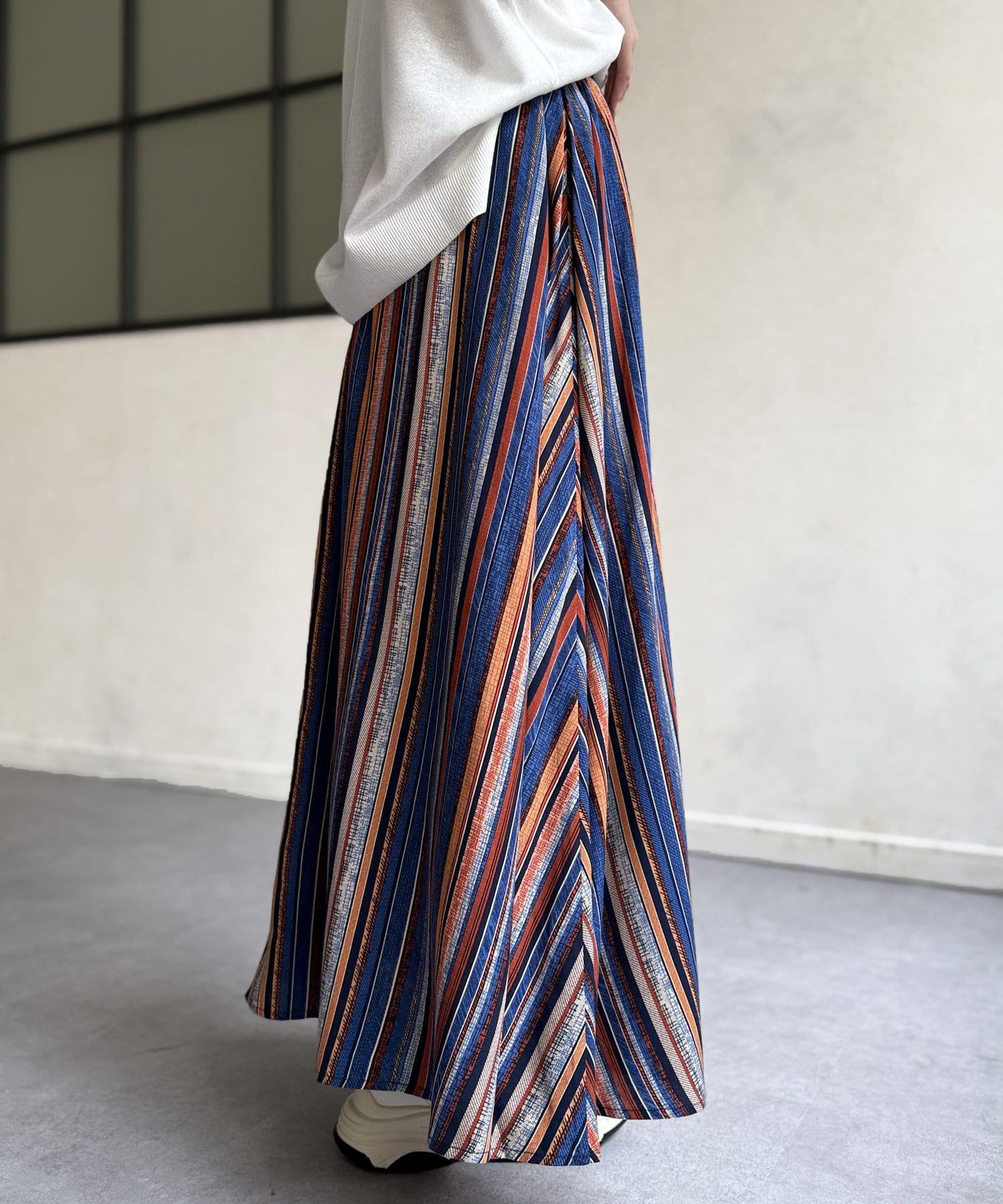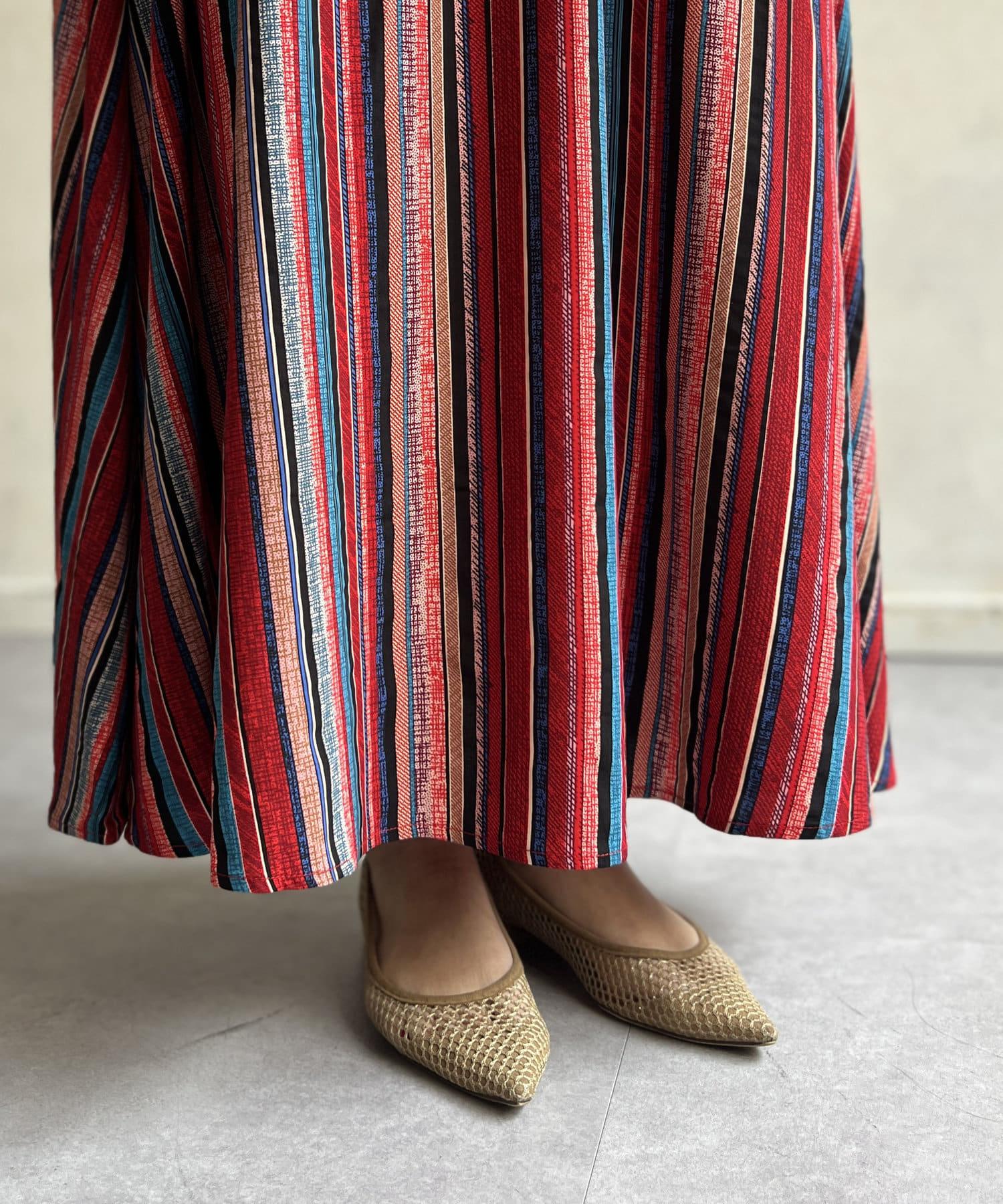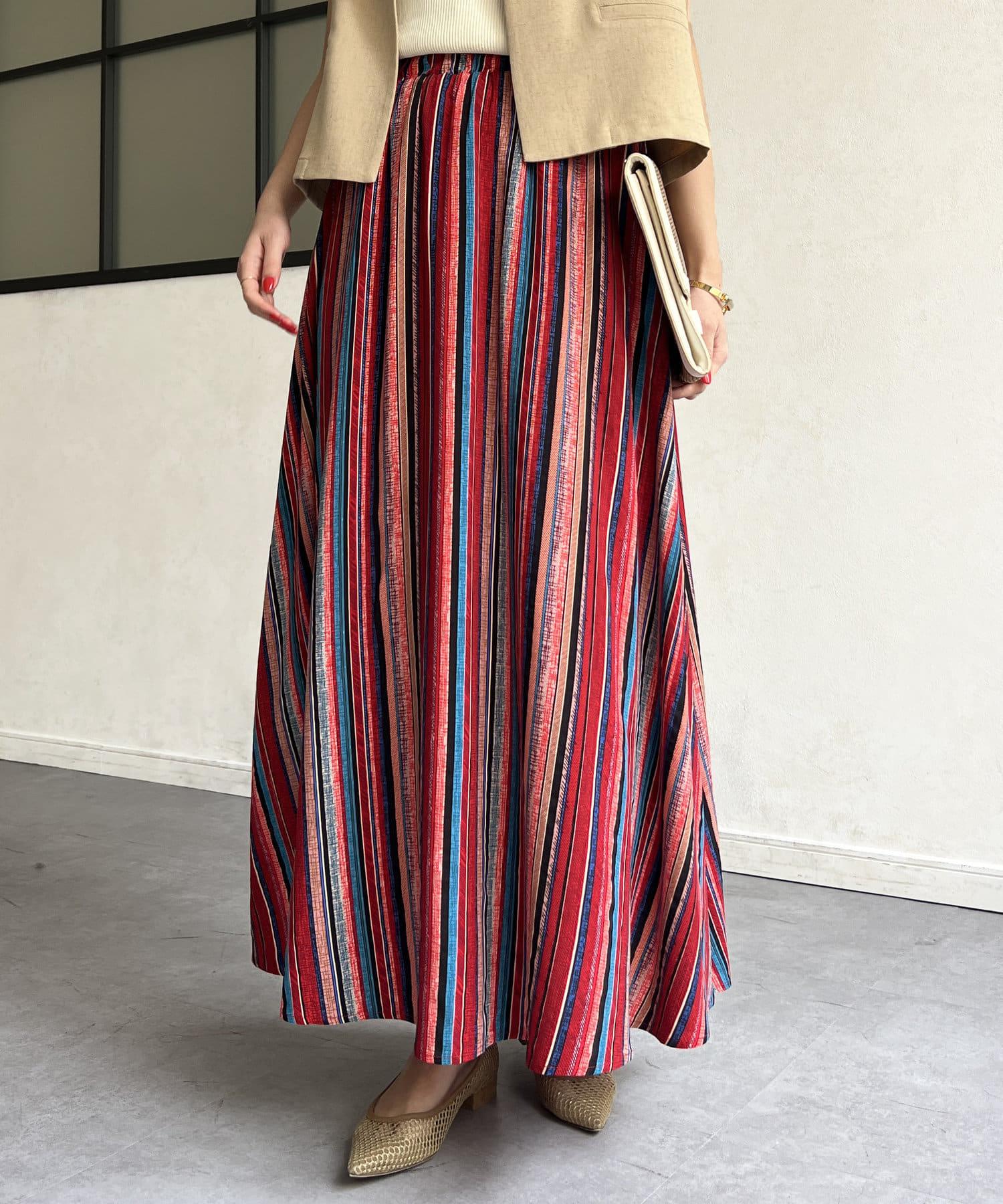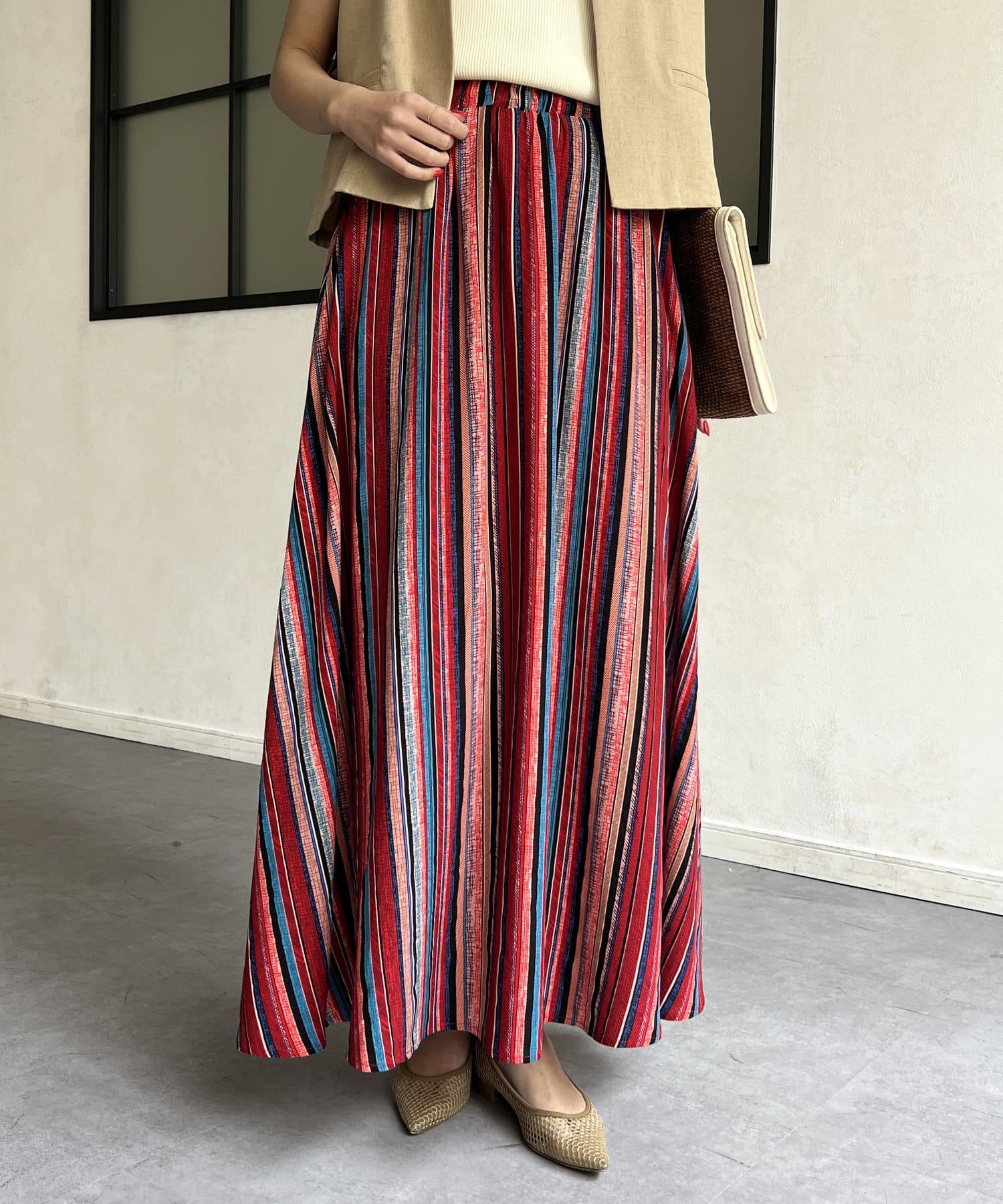 帶有復古多條紋圖案的喇叭裙,氣場十足。