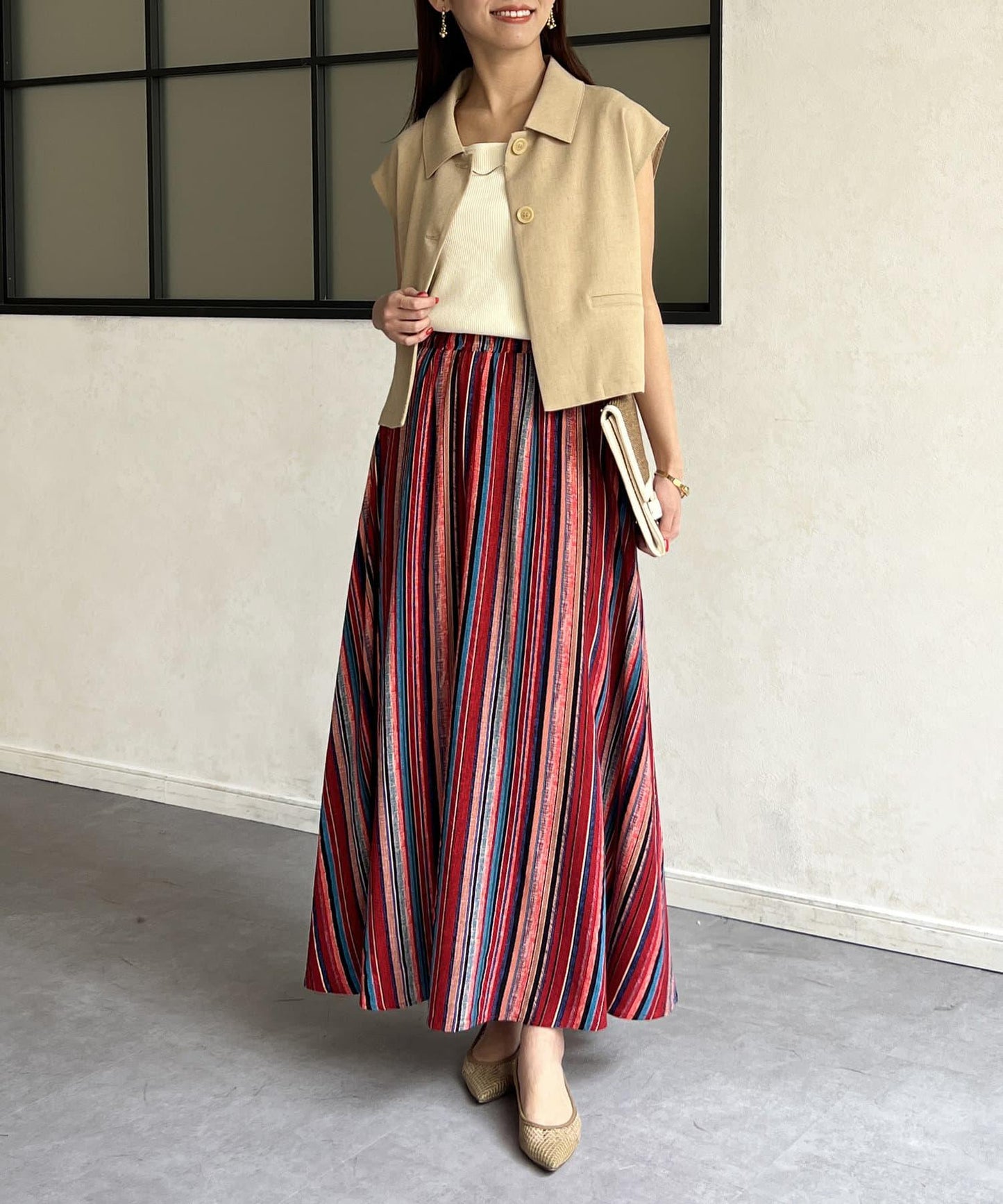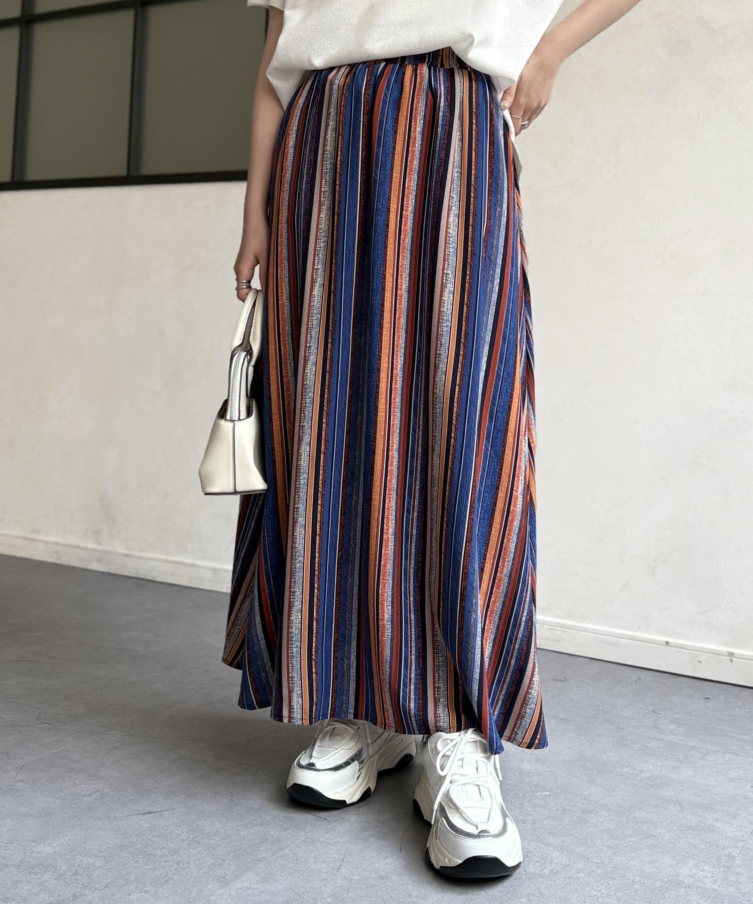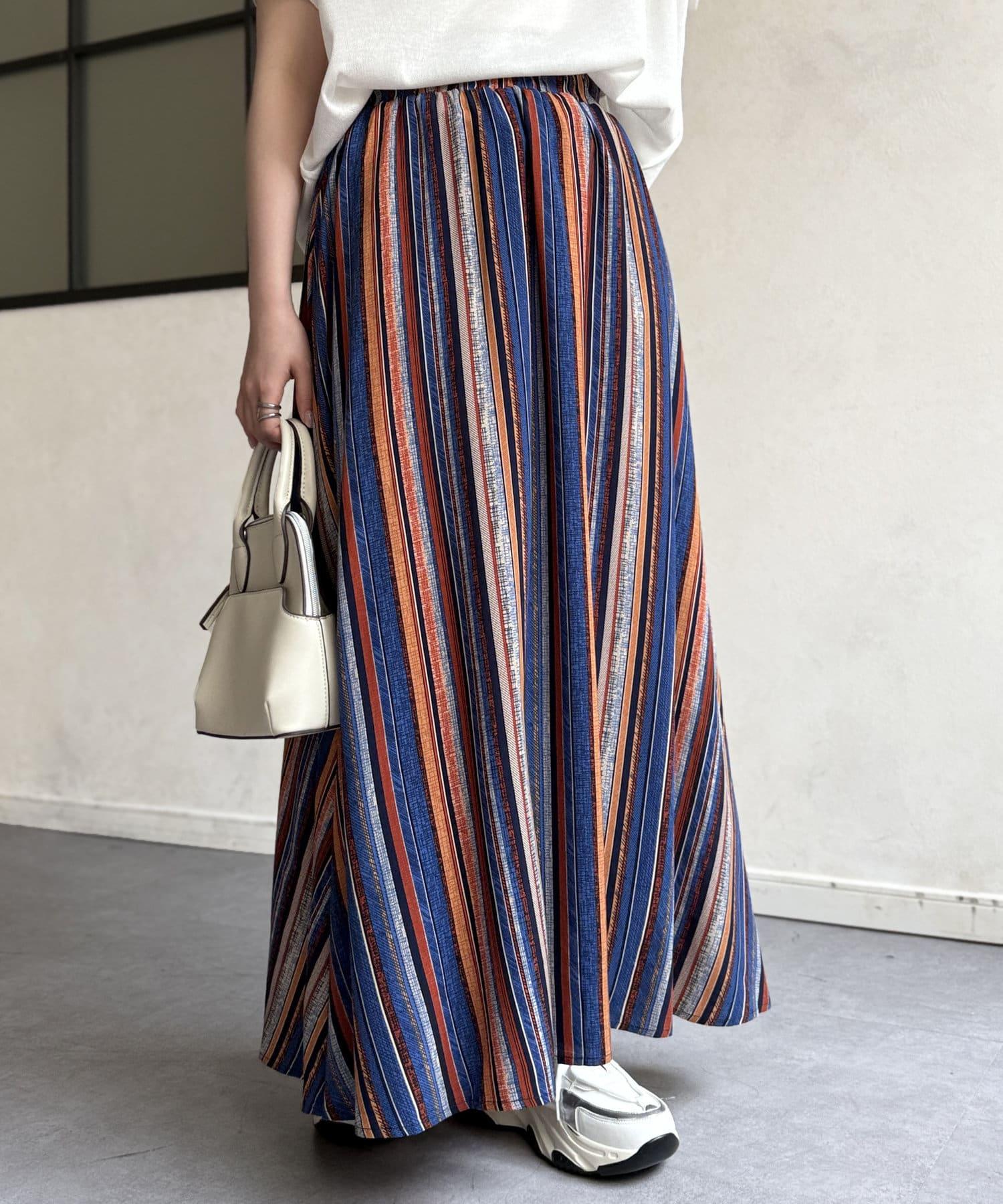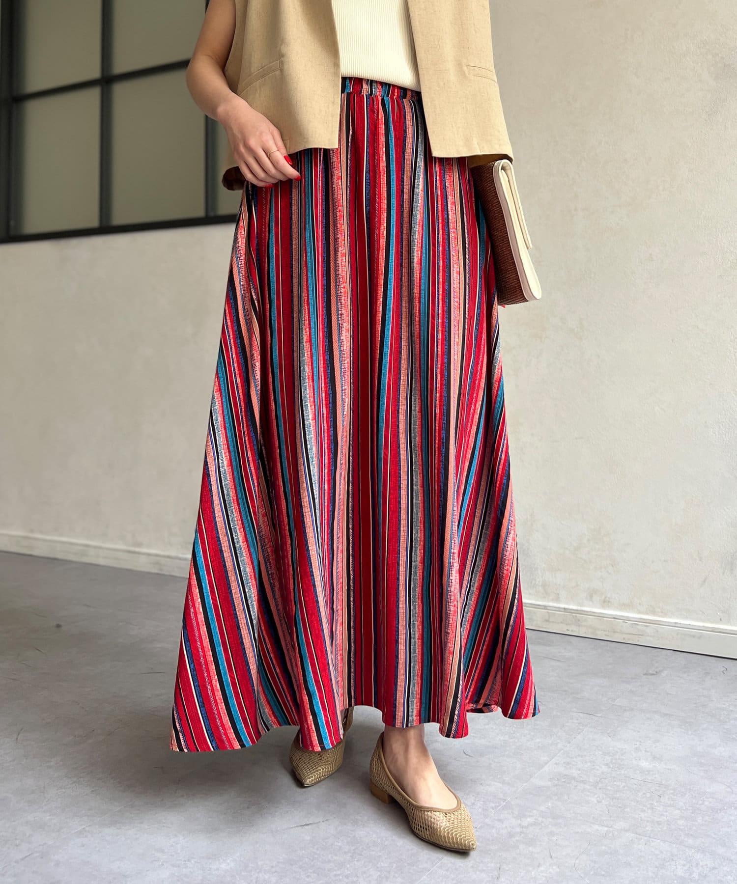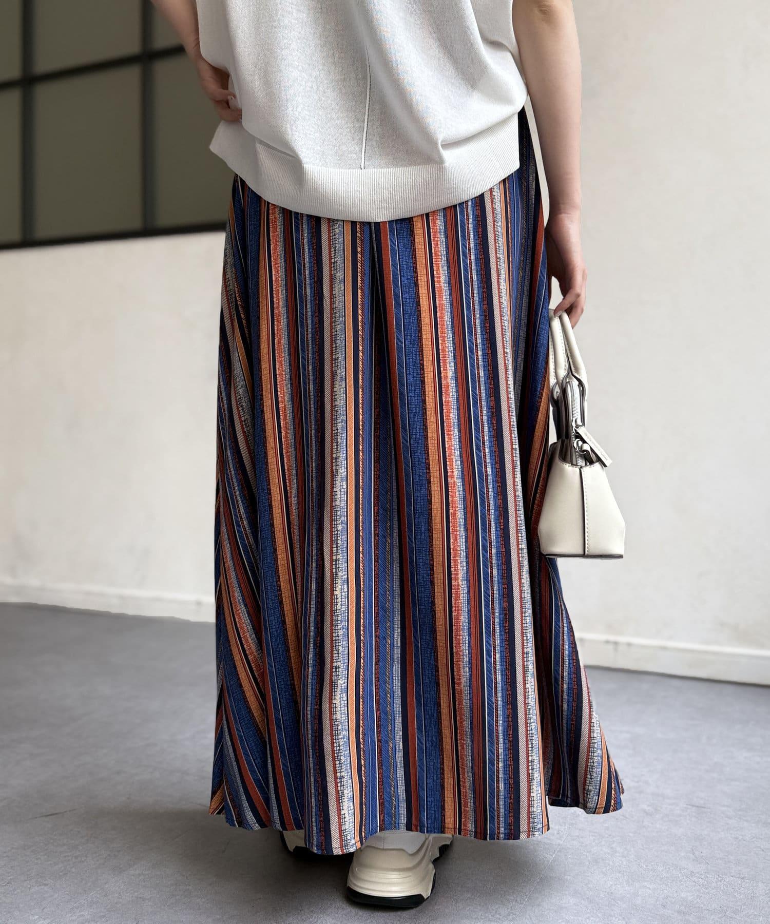 帶有復古多條紋圖案的喇叭裙,氣場十足。