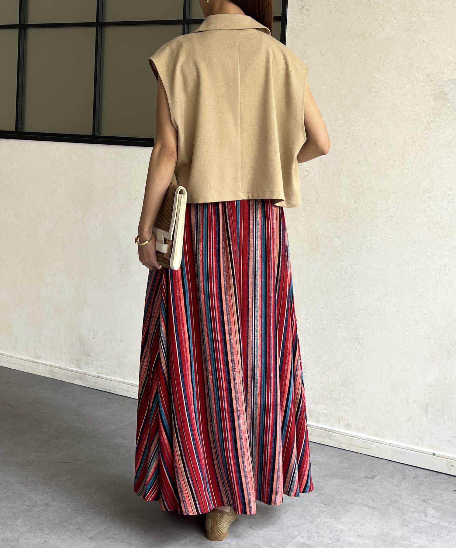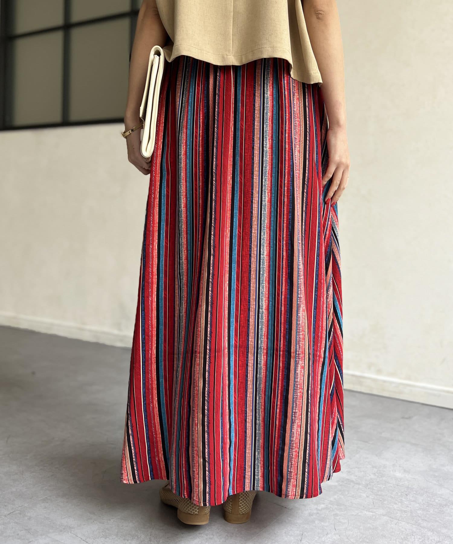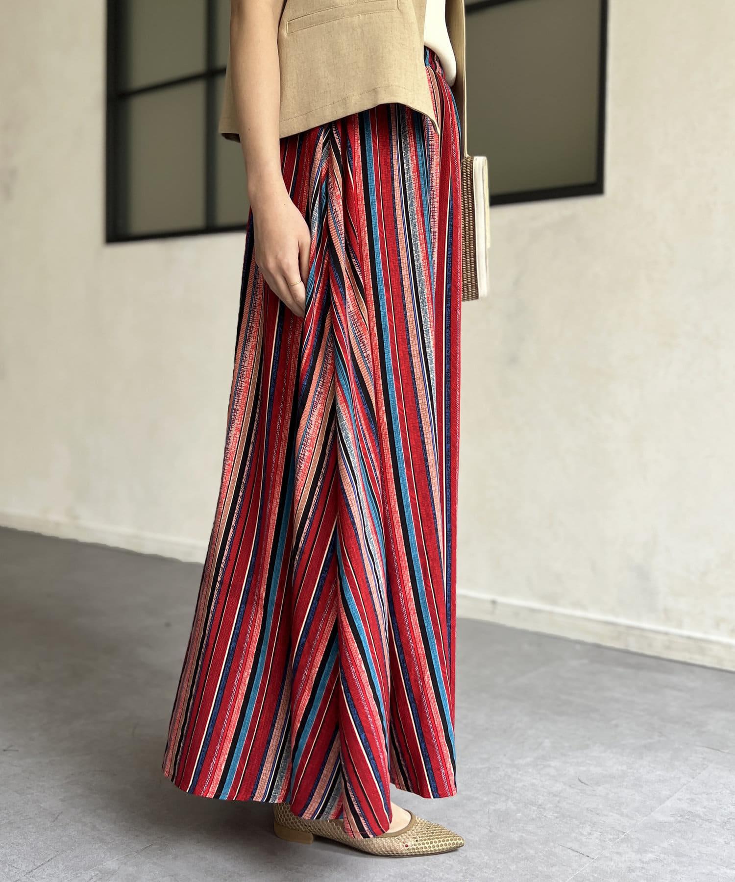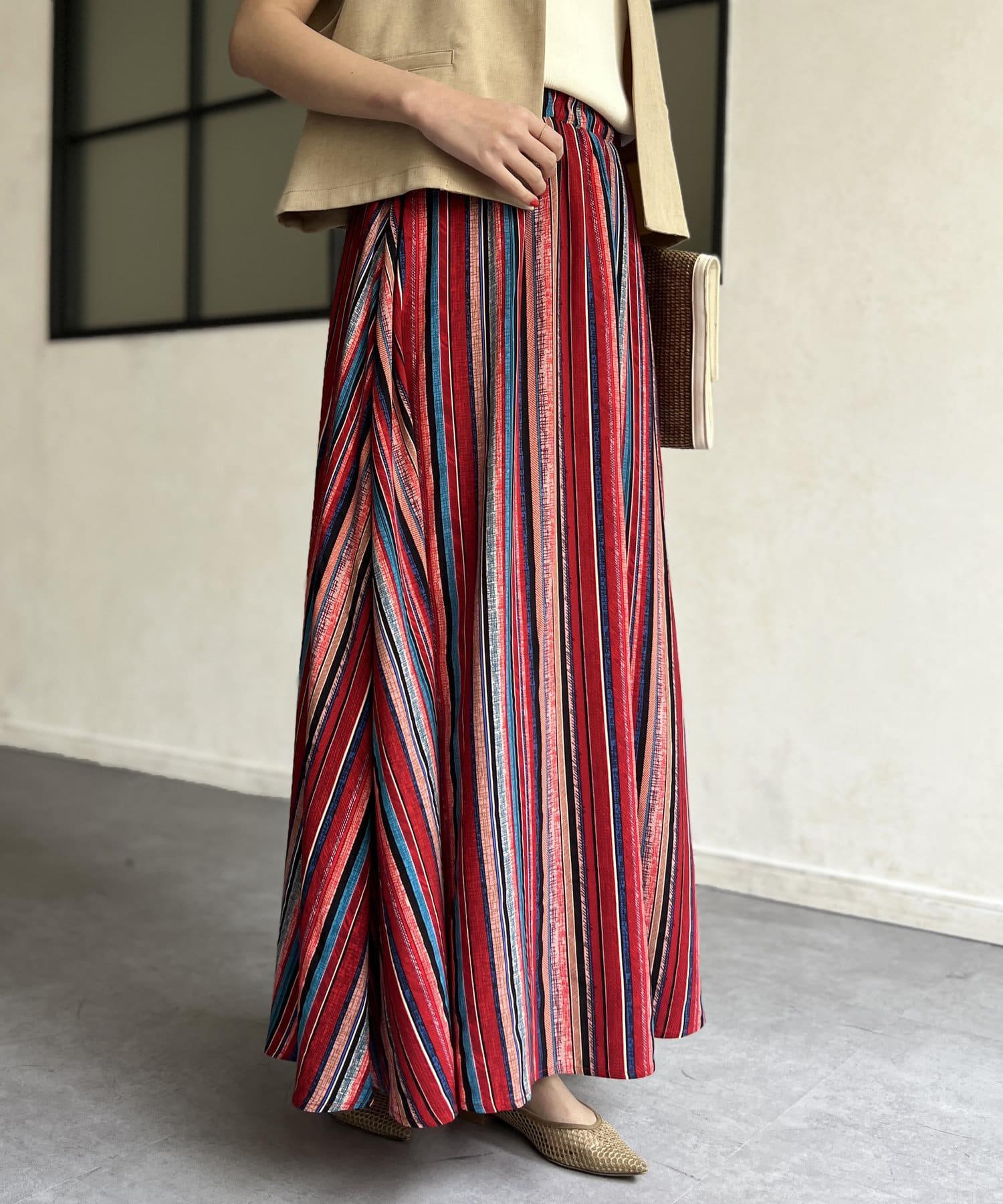 帶有復古多條紋圖案的喇叭裙,氣場十足。