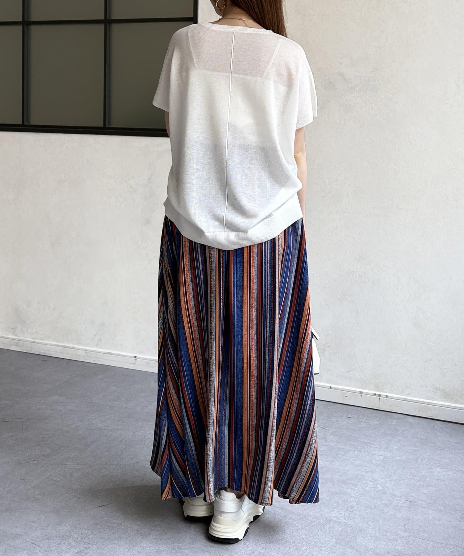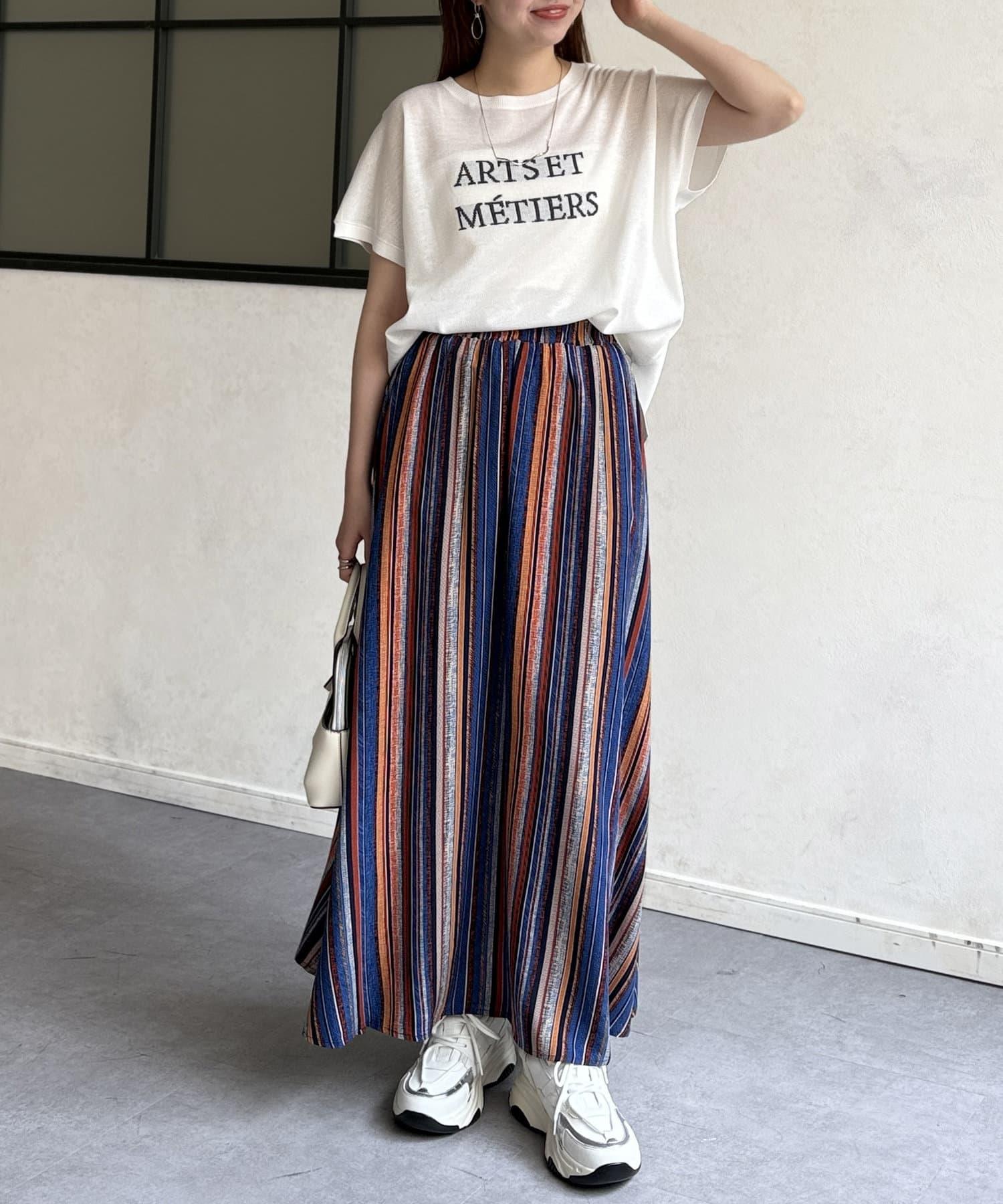 下襬處的喇叭輪廓和條紋的垂直線條也讓下半身顯得更加修長。