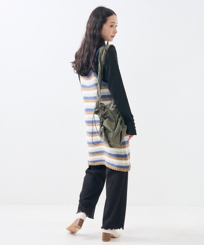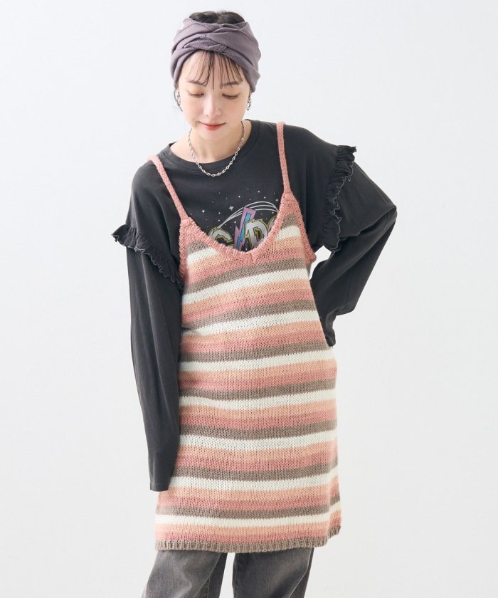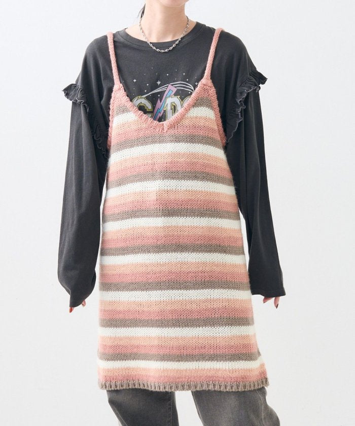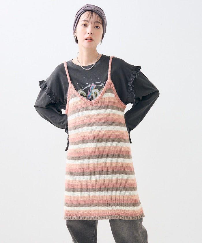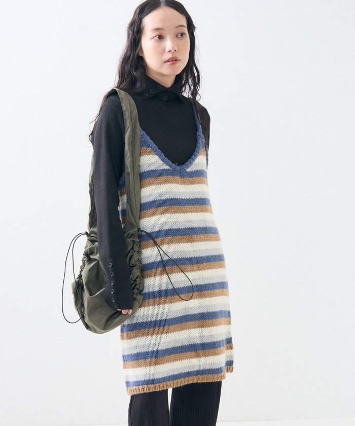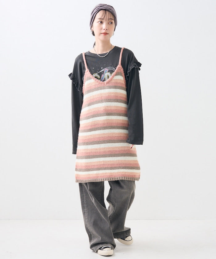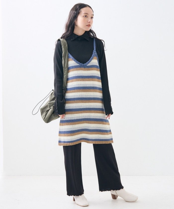 長及膝蓋的針織吊帶連衣裙,可與長褲疊穿或作為迷你裙穿著。