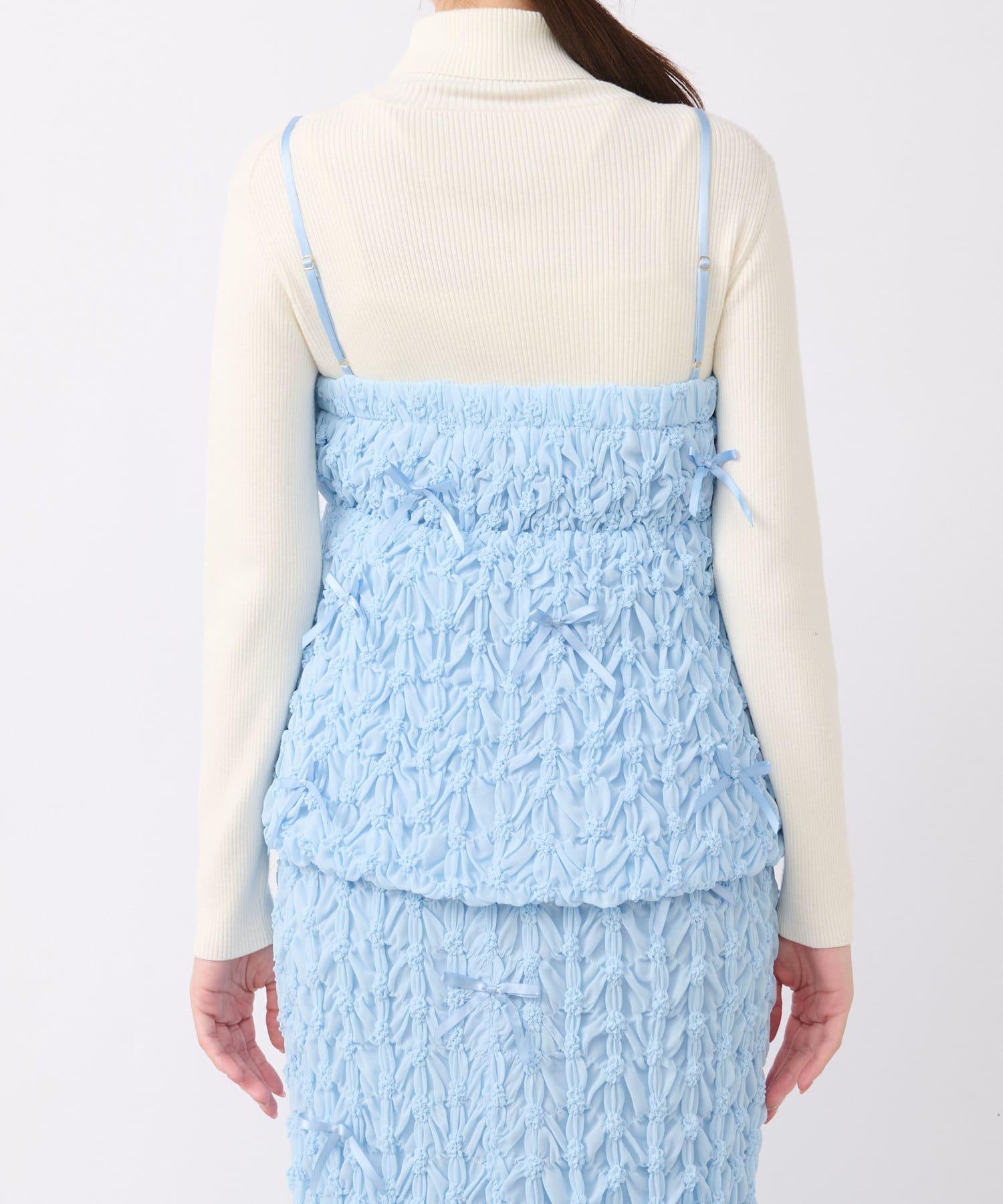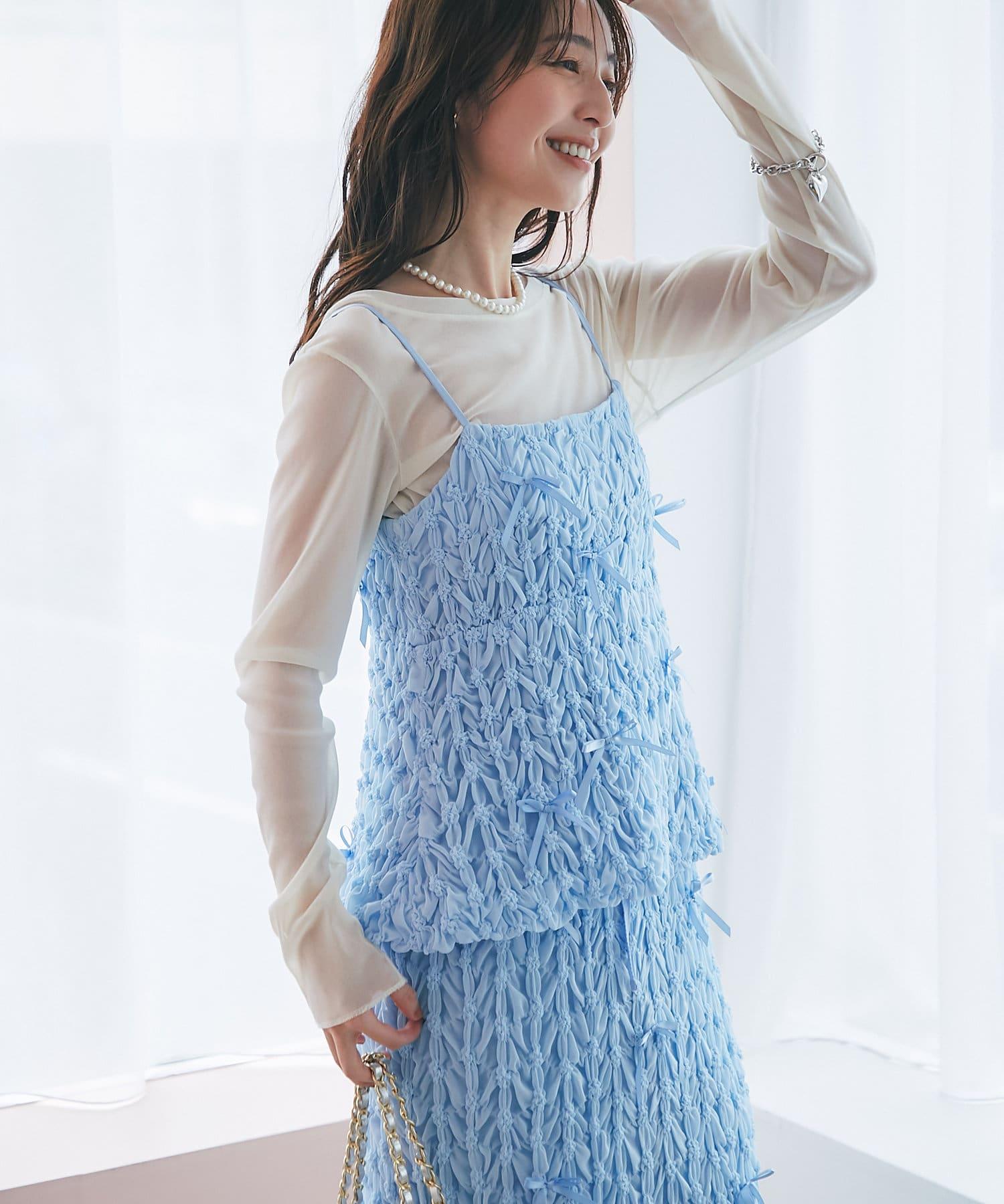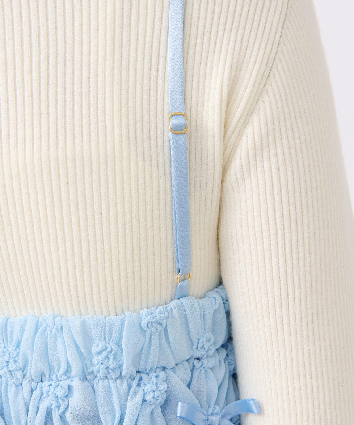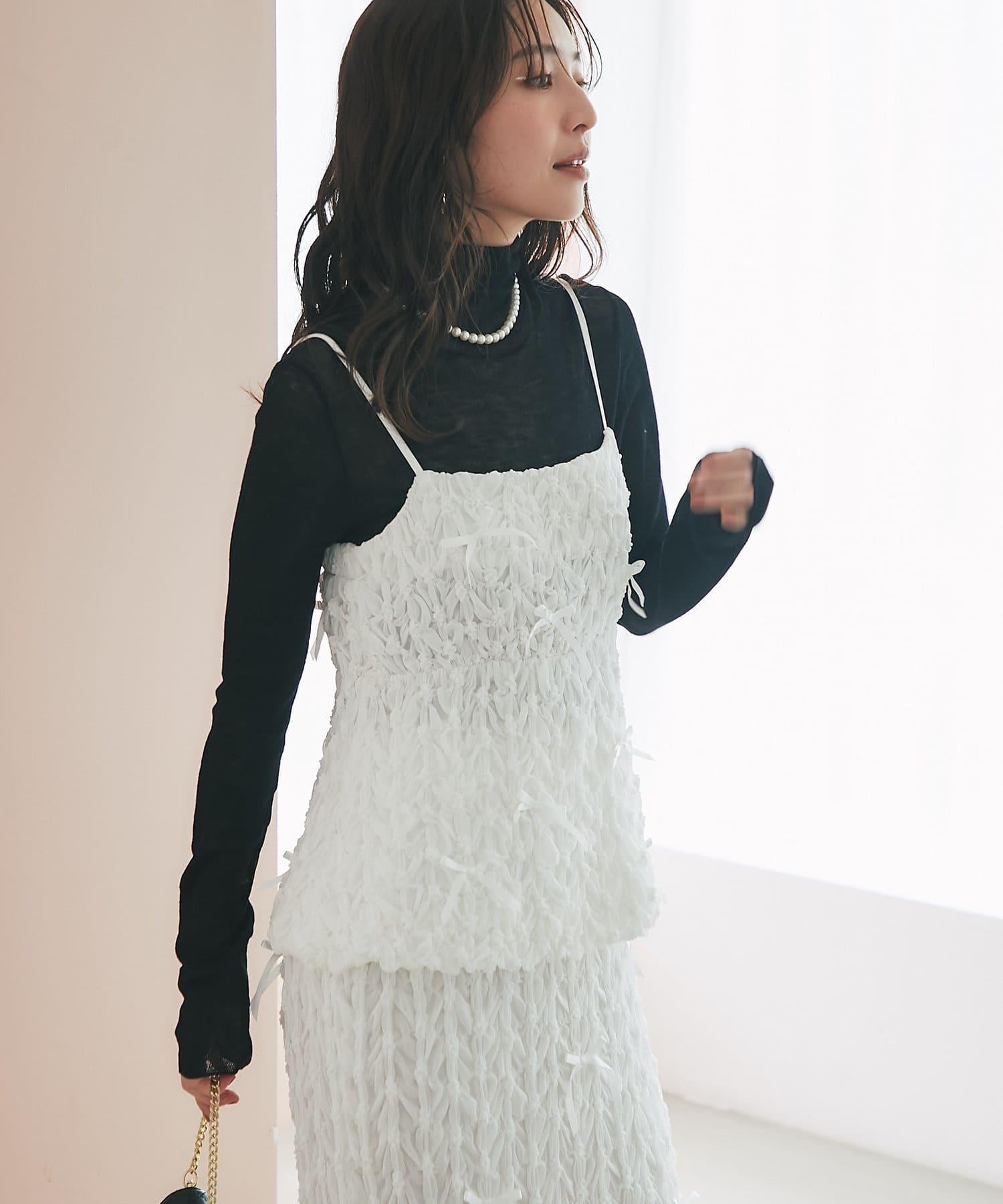 吊帶背心的蓬蓬裙廓形上鑲有時尚絲帶。