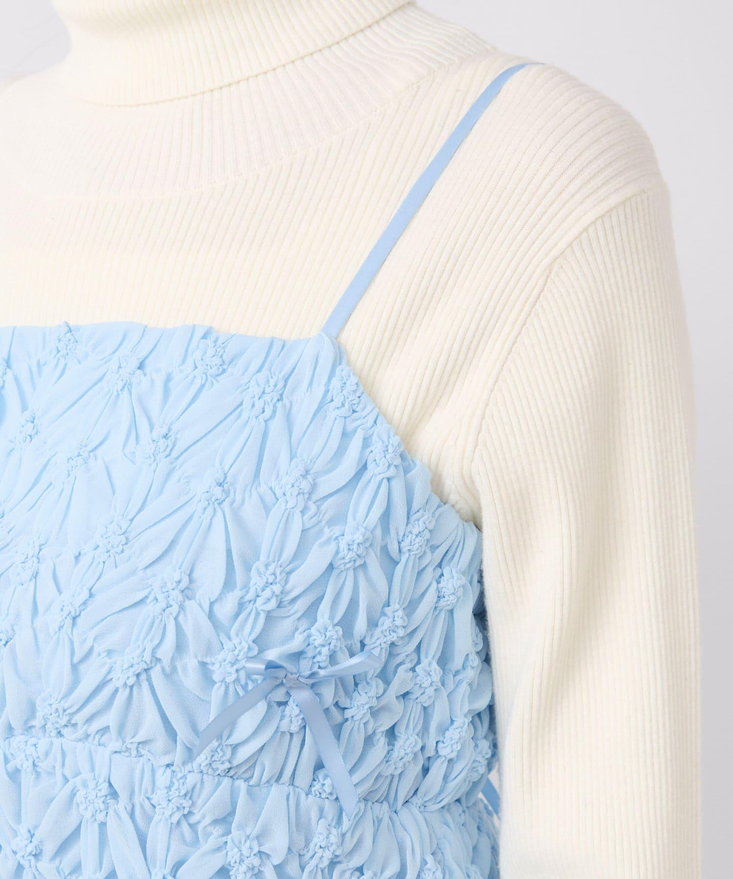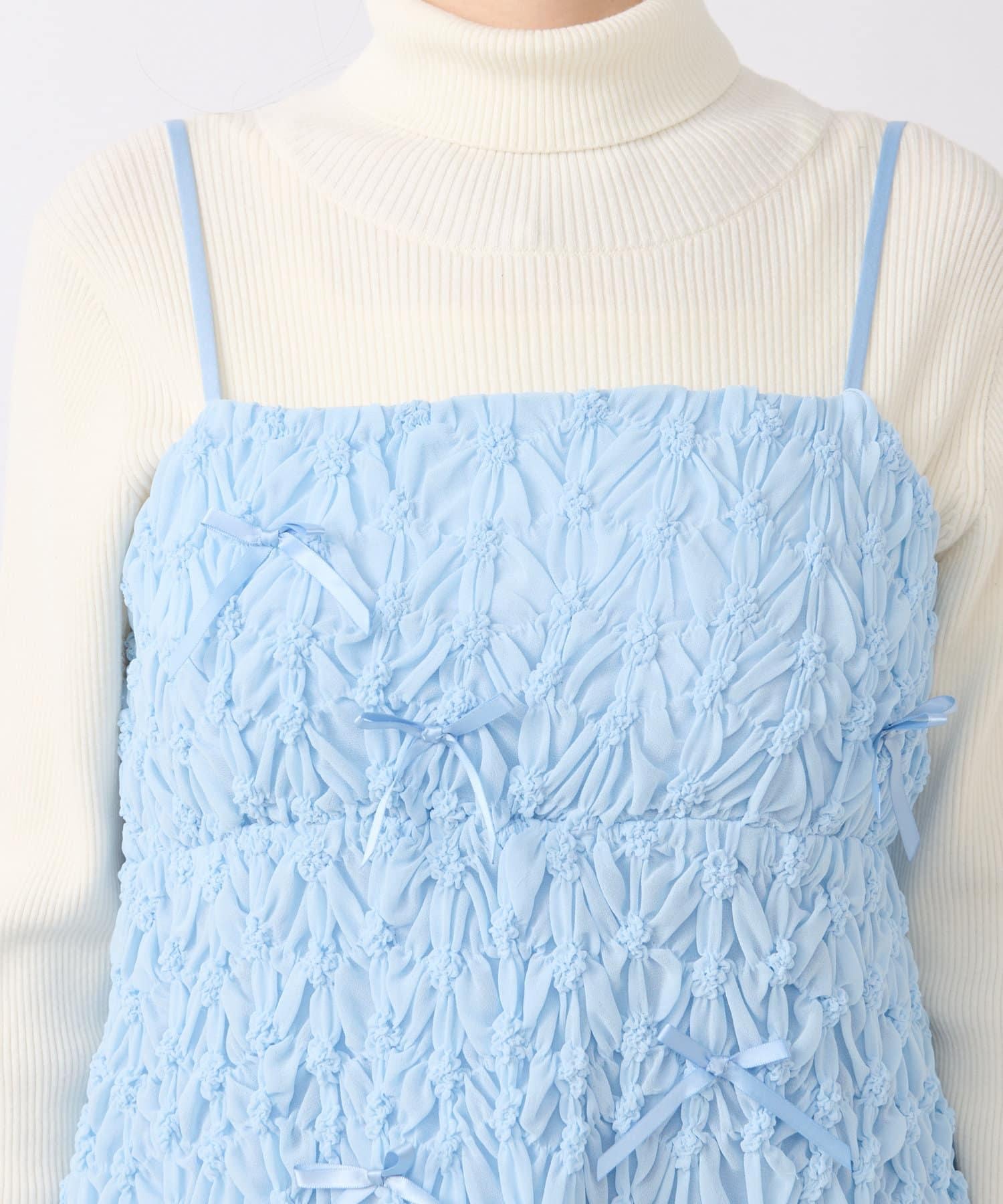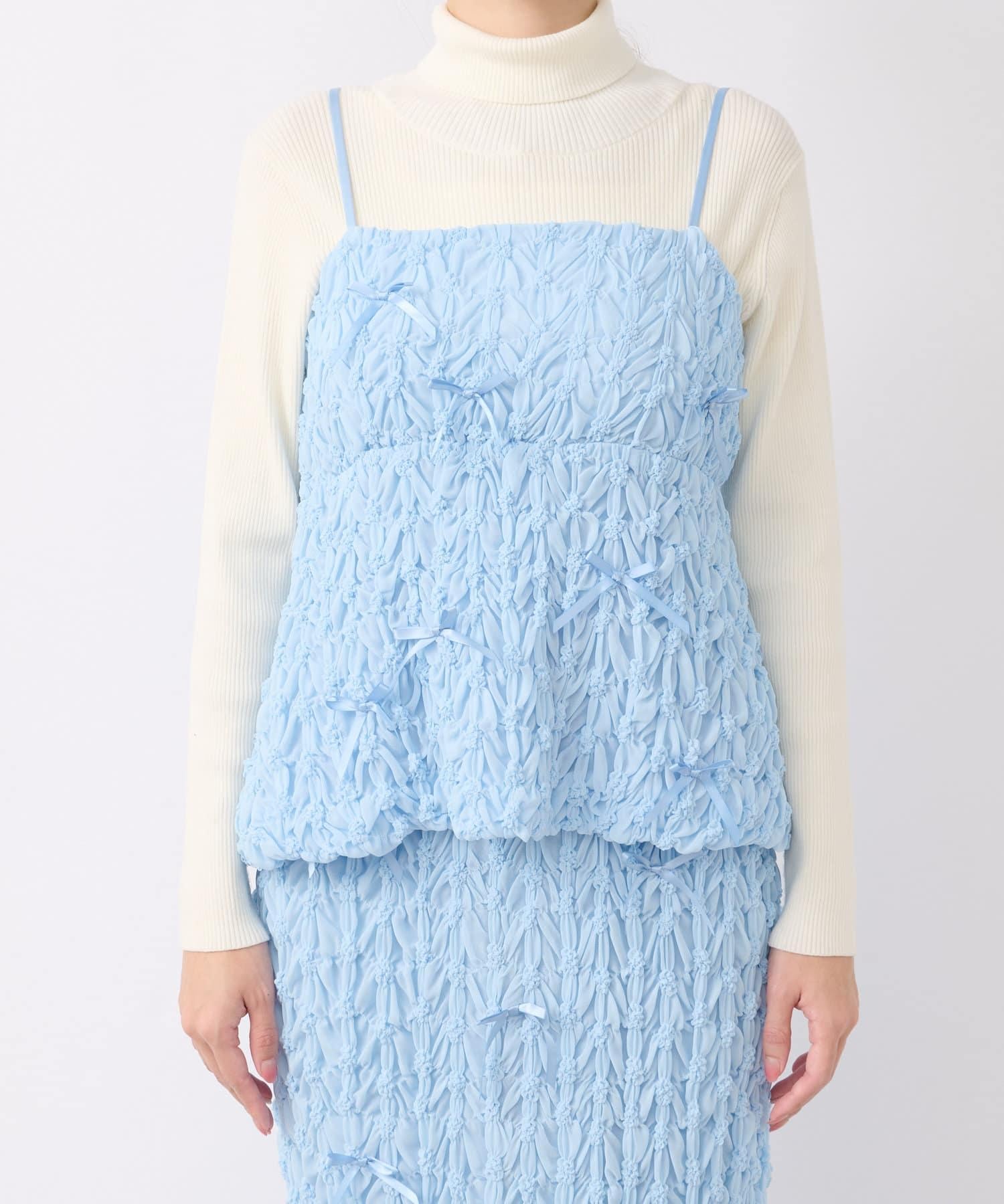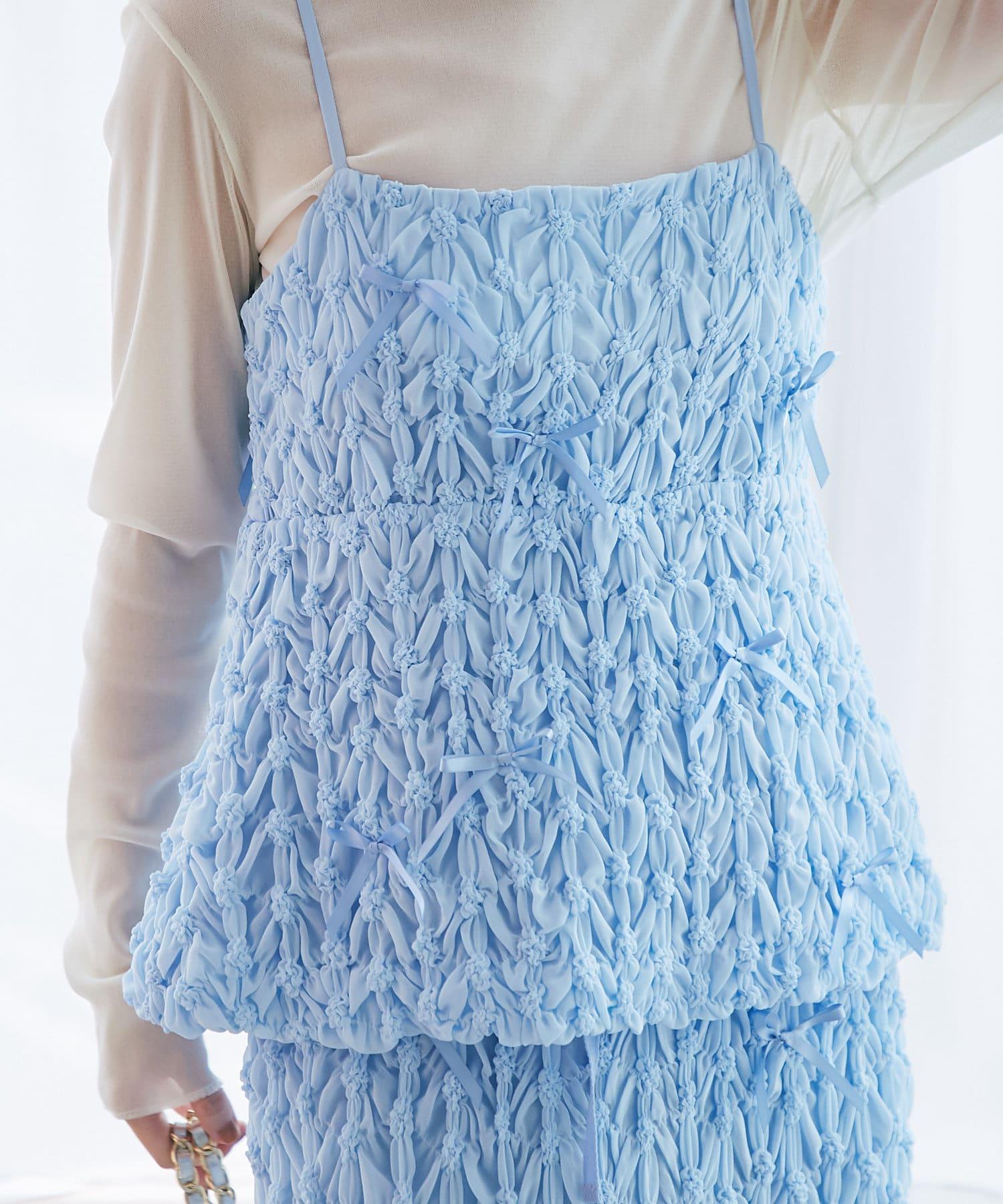 吊帶背心的蓬蓬裙廓形上鑲有時尚絲帶。