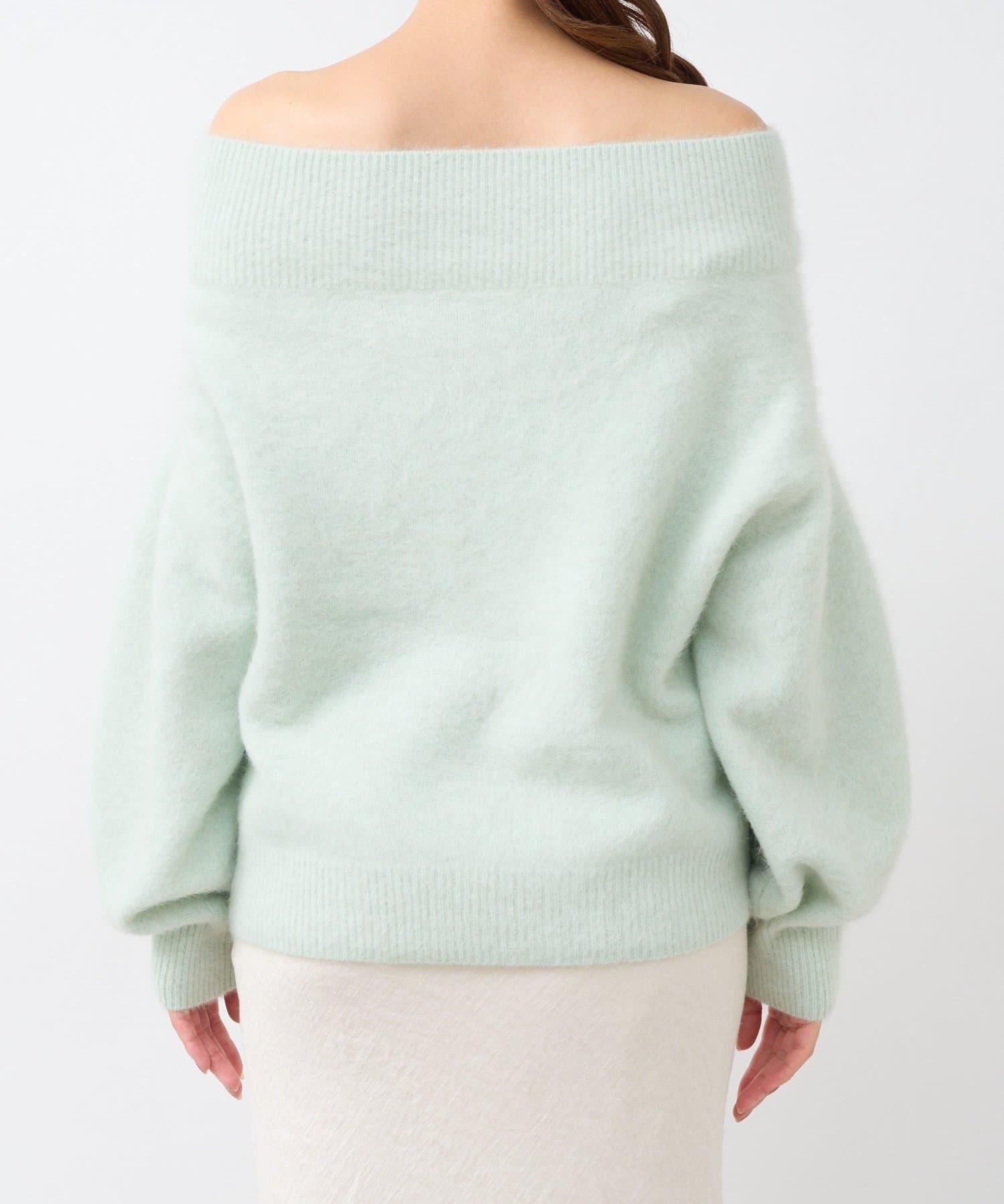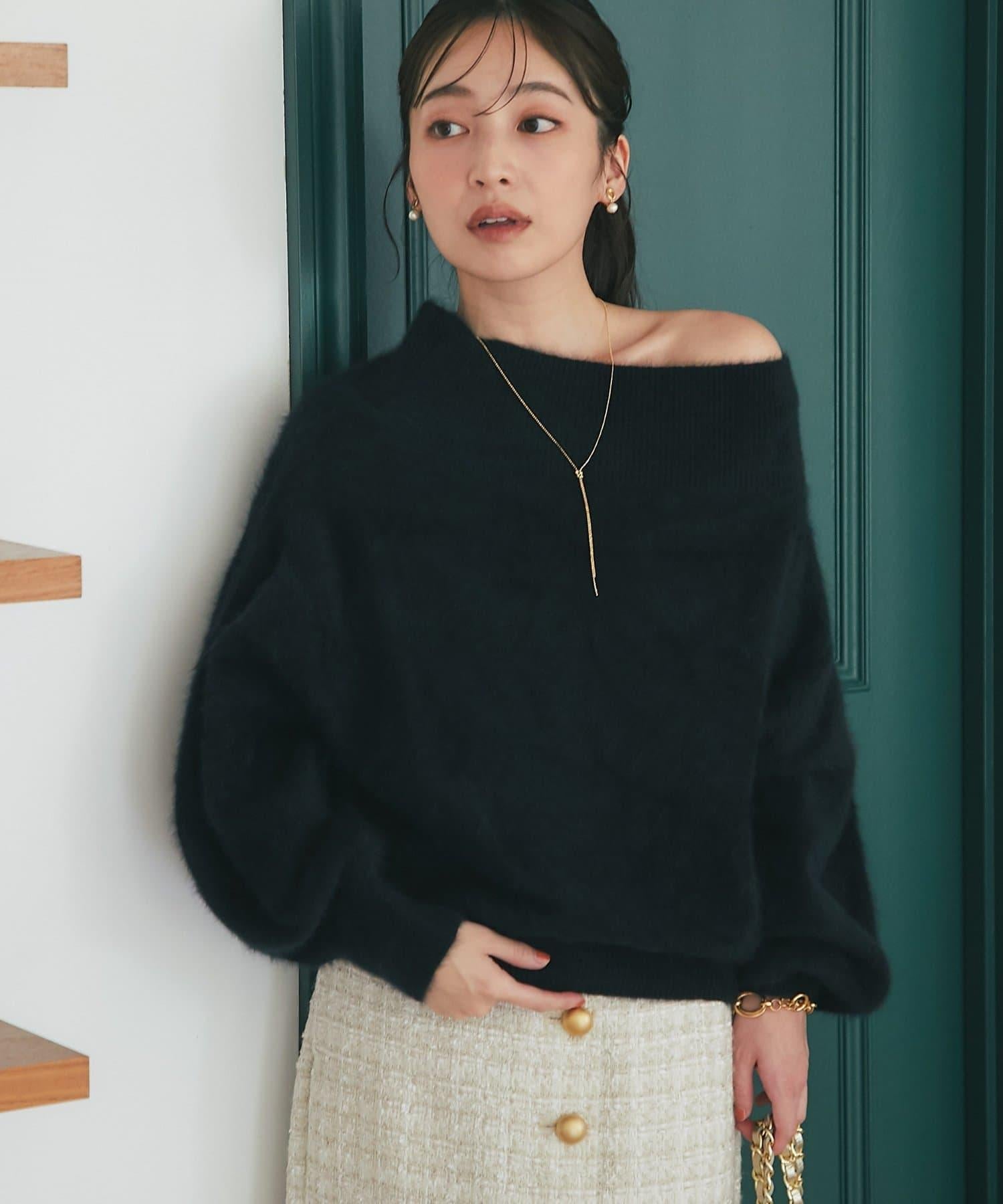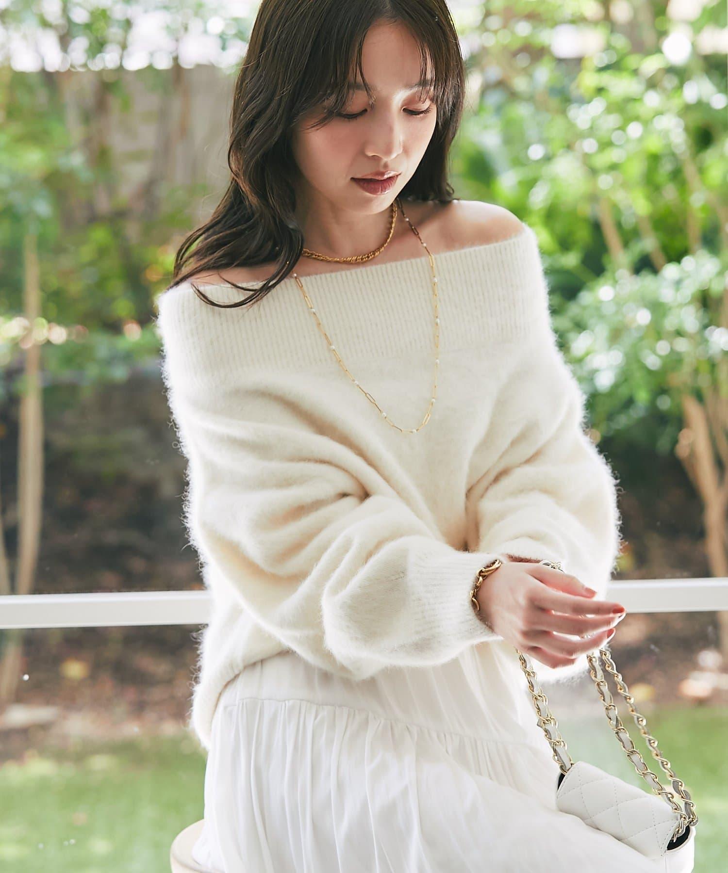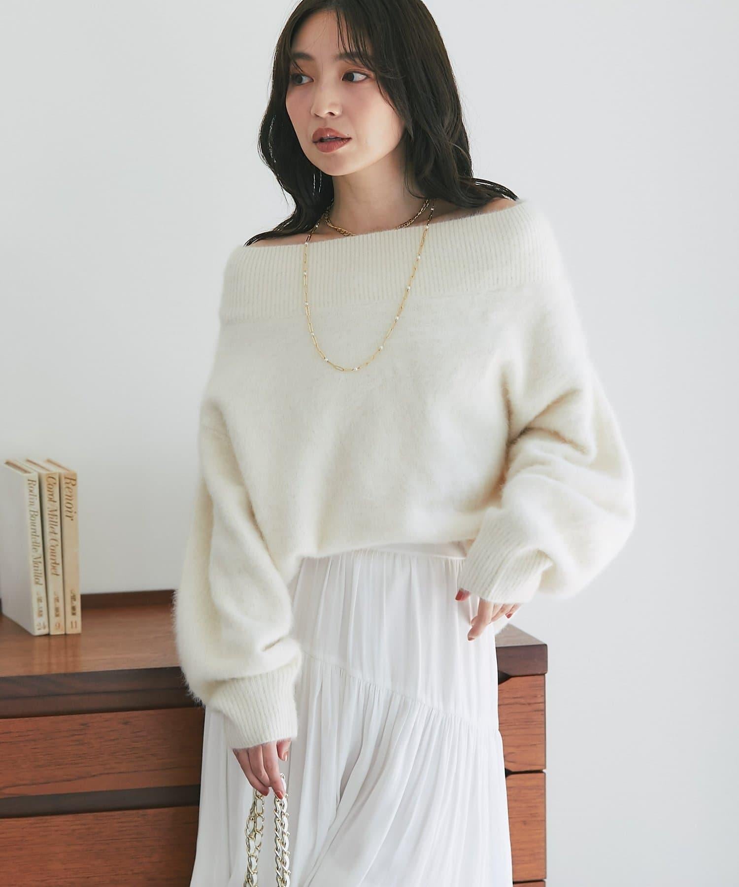 大人風格針織 毛絨羊毛羊絨混紡羅紋領一字肩針織衫