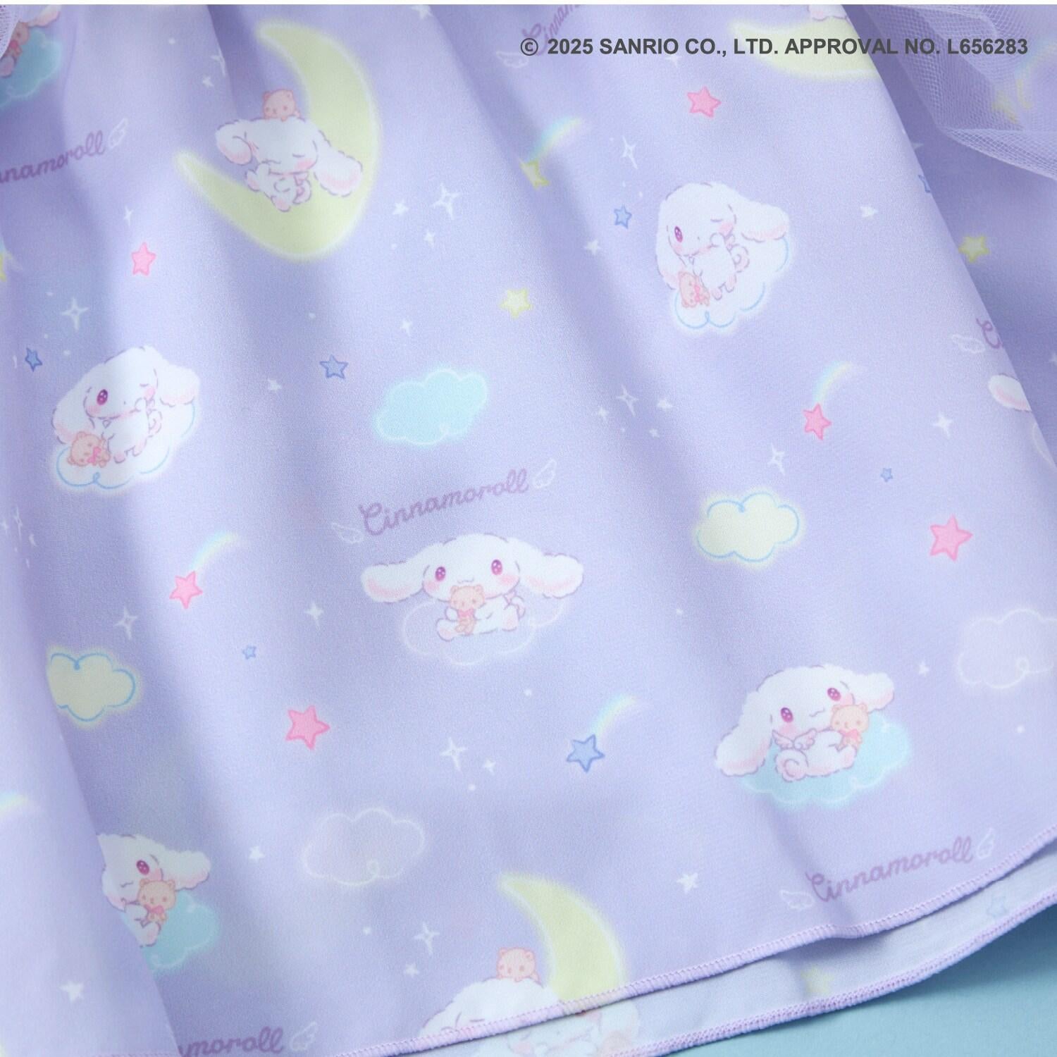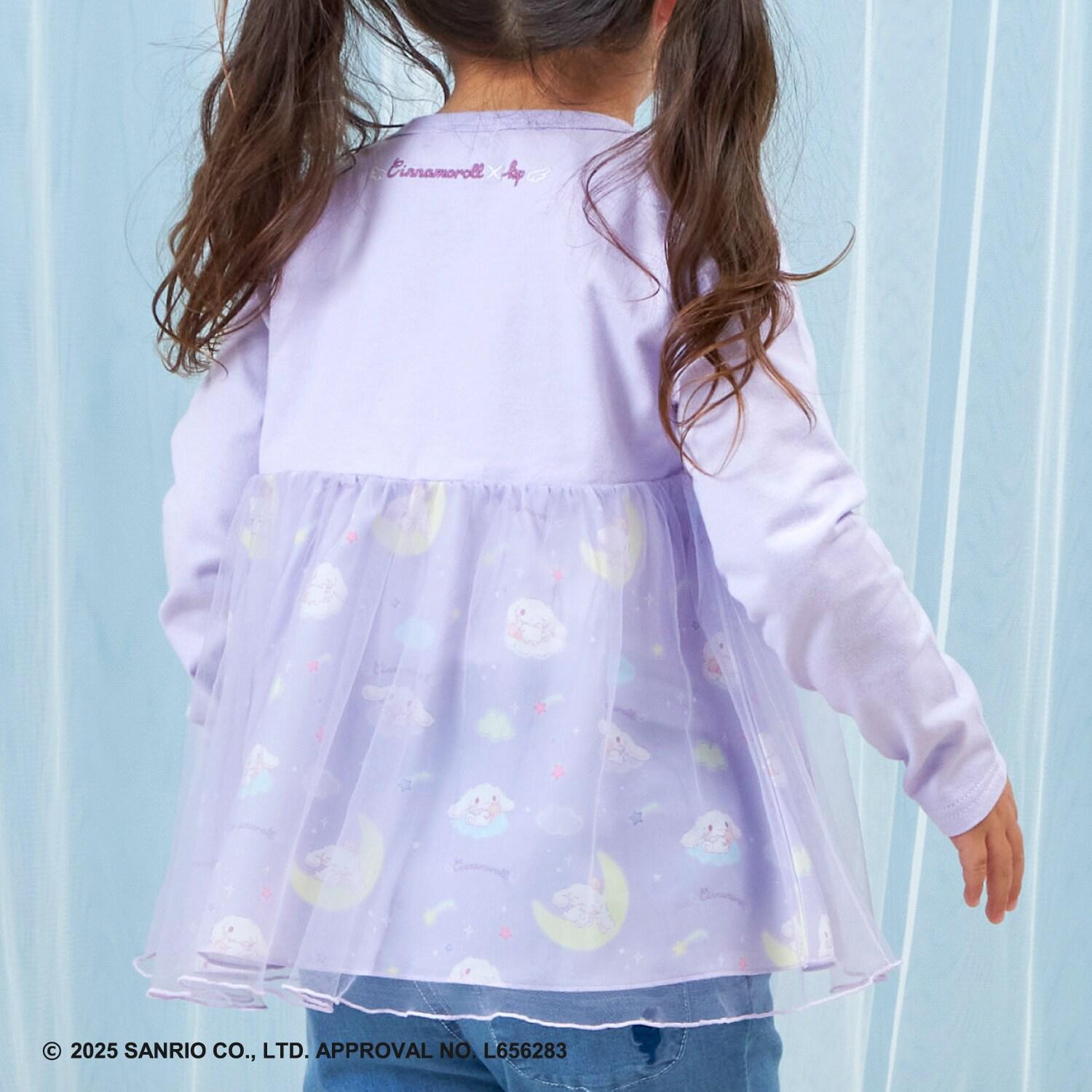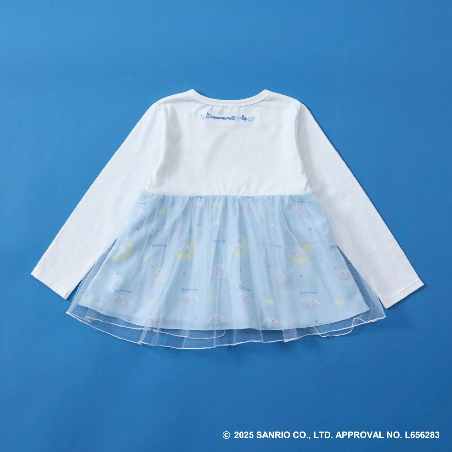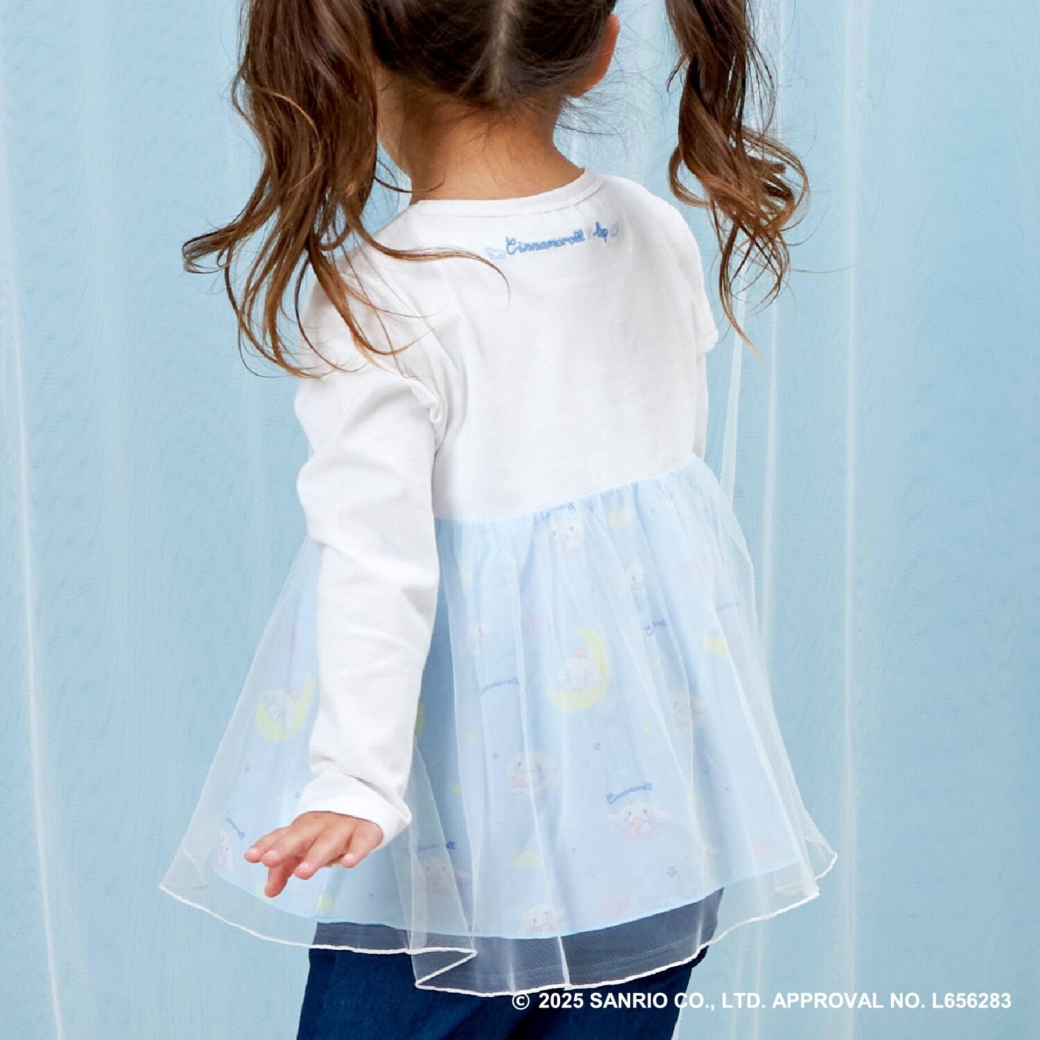 與三麗鷗卡通人物 Cinnamoroll 合作推出的長袖薄紗外衣。可愛的 Cinnamoroll 印花周圍綴有蹩腳刺繡和水鑽,閃閃發光。薄紗面料與印有 Cinnamoroll 圖案的滌綸面料層疊在一起,呈現出時尚的透明感。90 厘米款式的左肩開口。