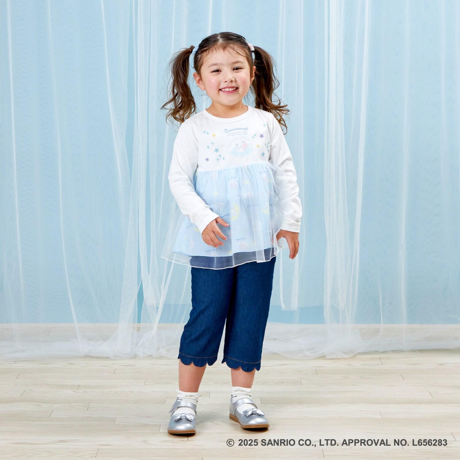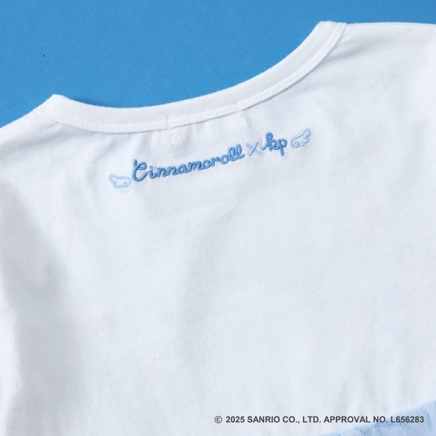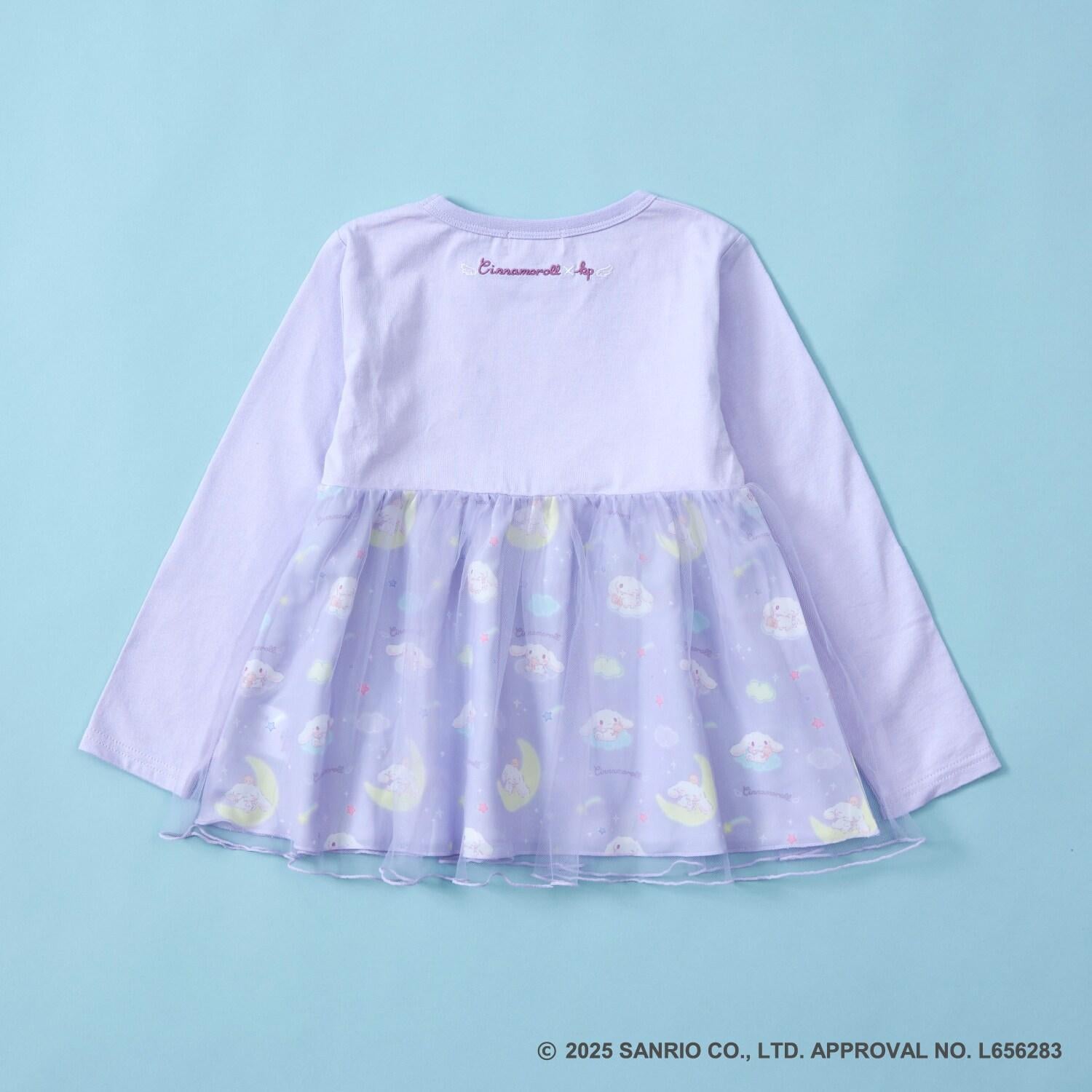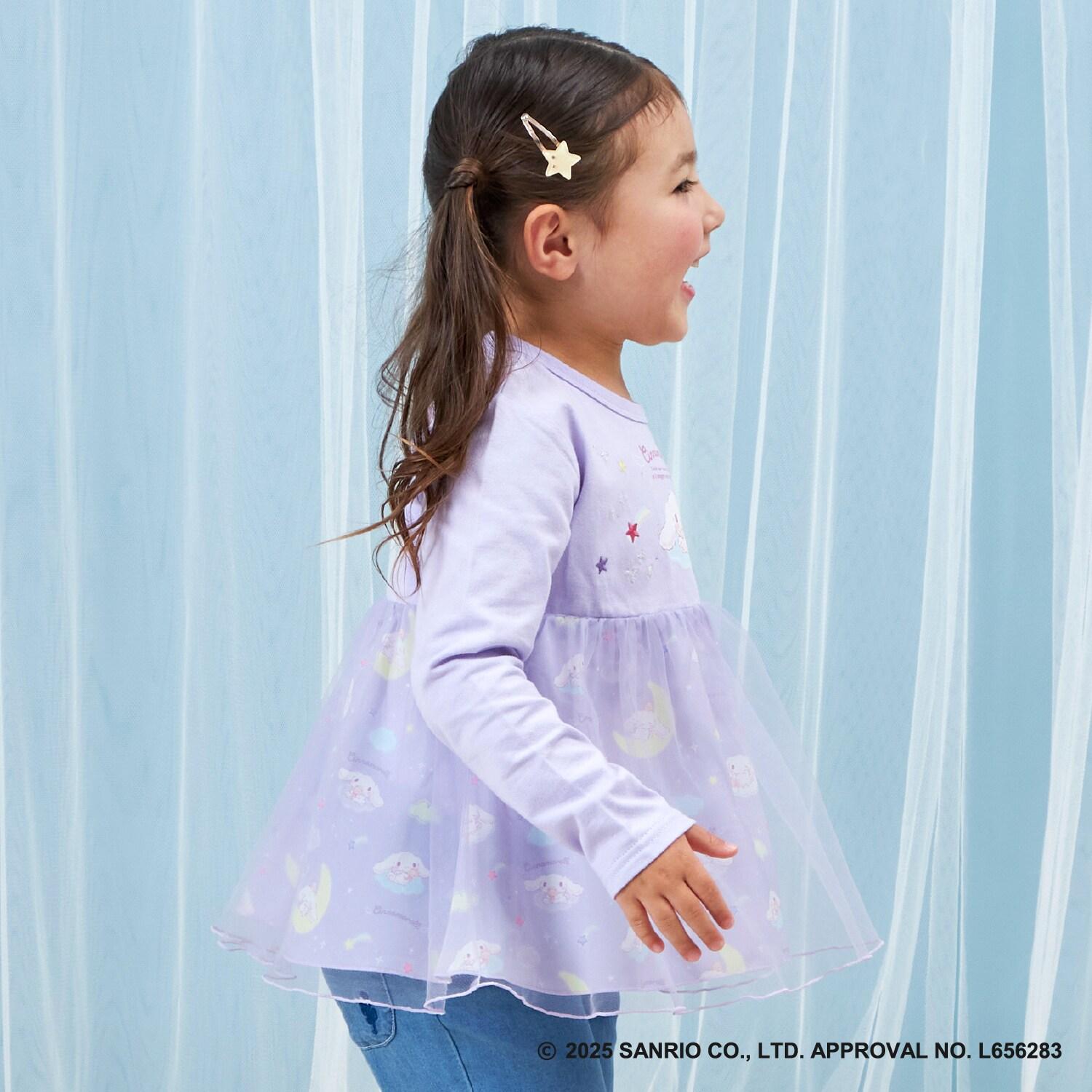 與三麗鷗卡通人物 Cinnamoroll 合作推出的長袖薄紗外衣。可愛的 Cinnamoroll 印花周圍綴有蹩腳刺繡和水鑽,閃閃發光。薄紗面料與印有 Cinnamoroll 圖案的滌綸面料層疊在一起,呈現出時尚的透明感。90 厘米款式的左肩開口。