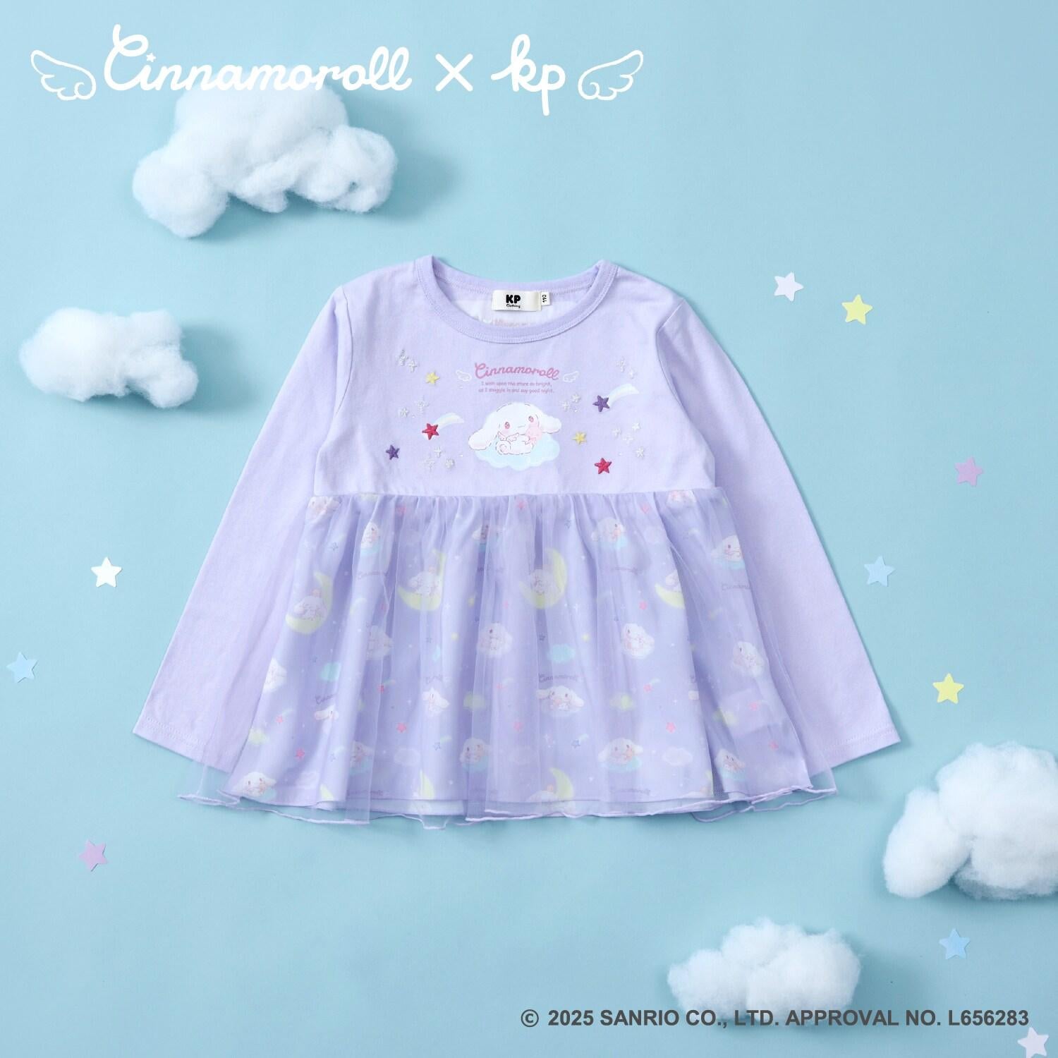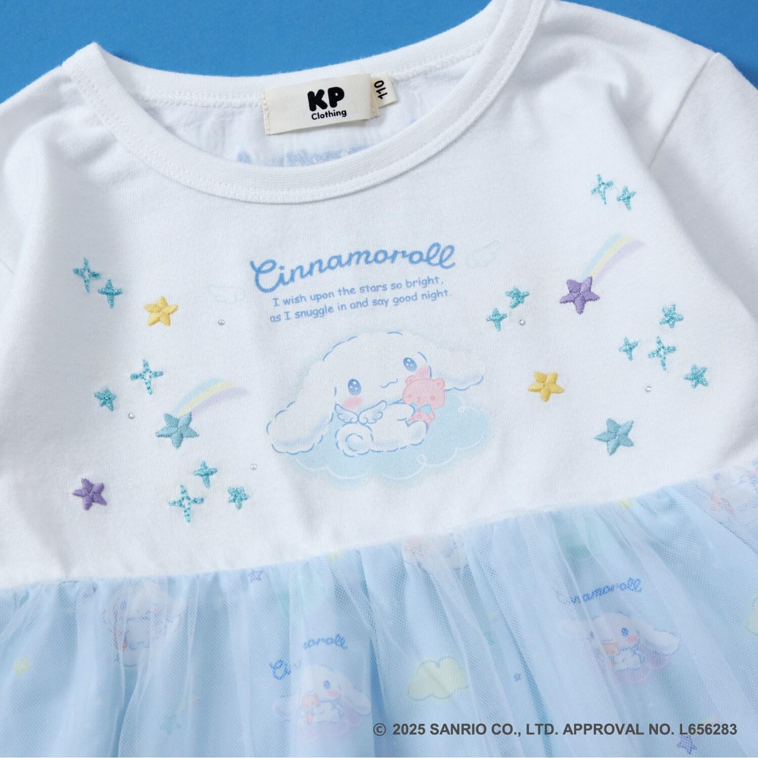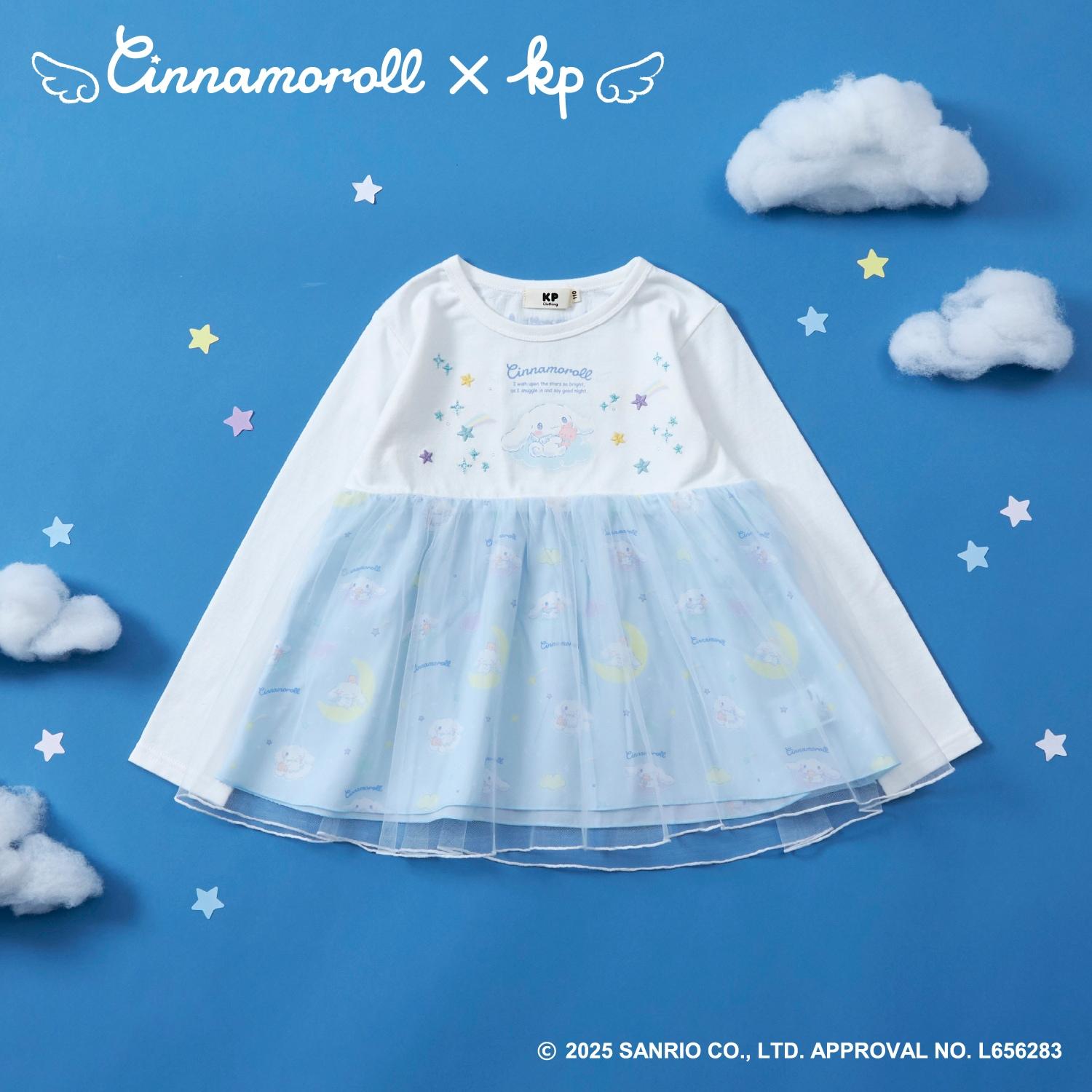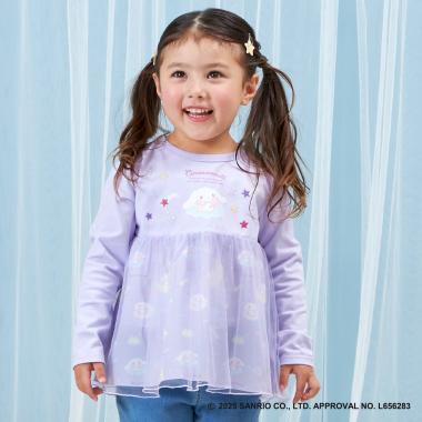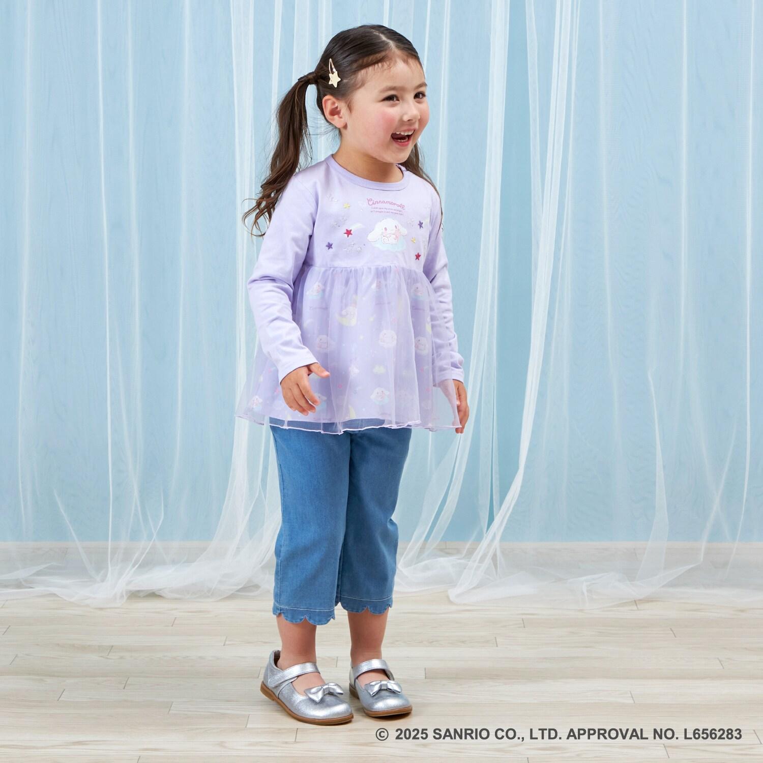 與三麗鷗卡通人物 Cinnamoroll 合作推出的長袖薄紗外衣。可愛的 Cinnamoroll 印花周圍綴有蹩腳刺繡和水鑽,閃閃發光。薄紗面料與印有 Cinnamoroll 圖案的滌綸面料層疊在一起,呈現出時尚的透明感。90 厘米款式的左肩開口。