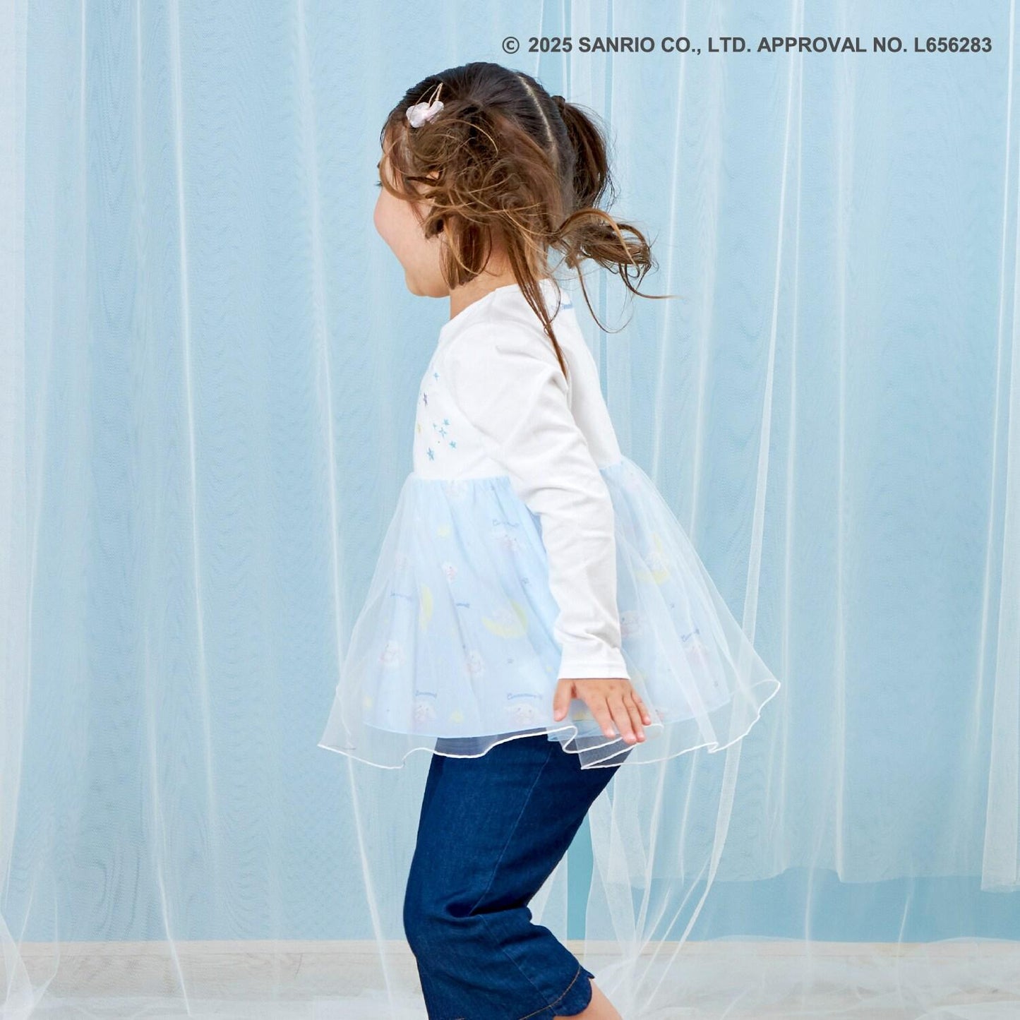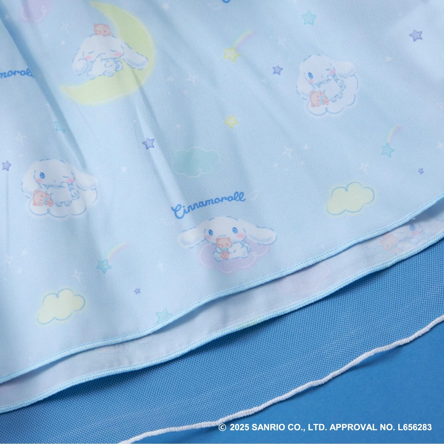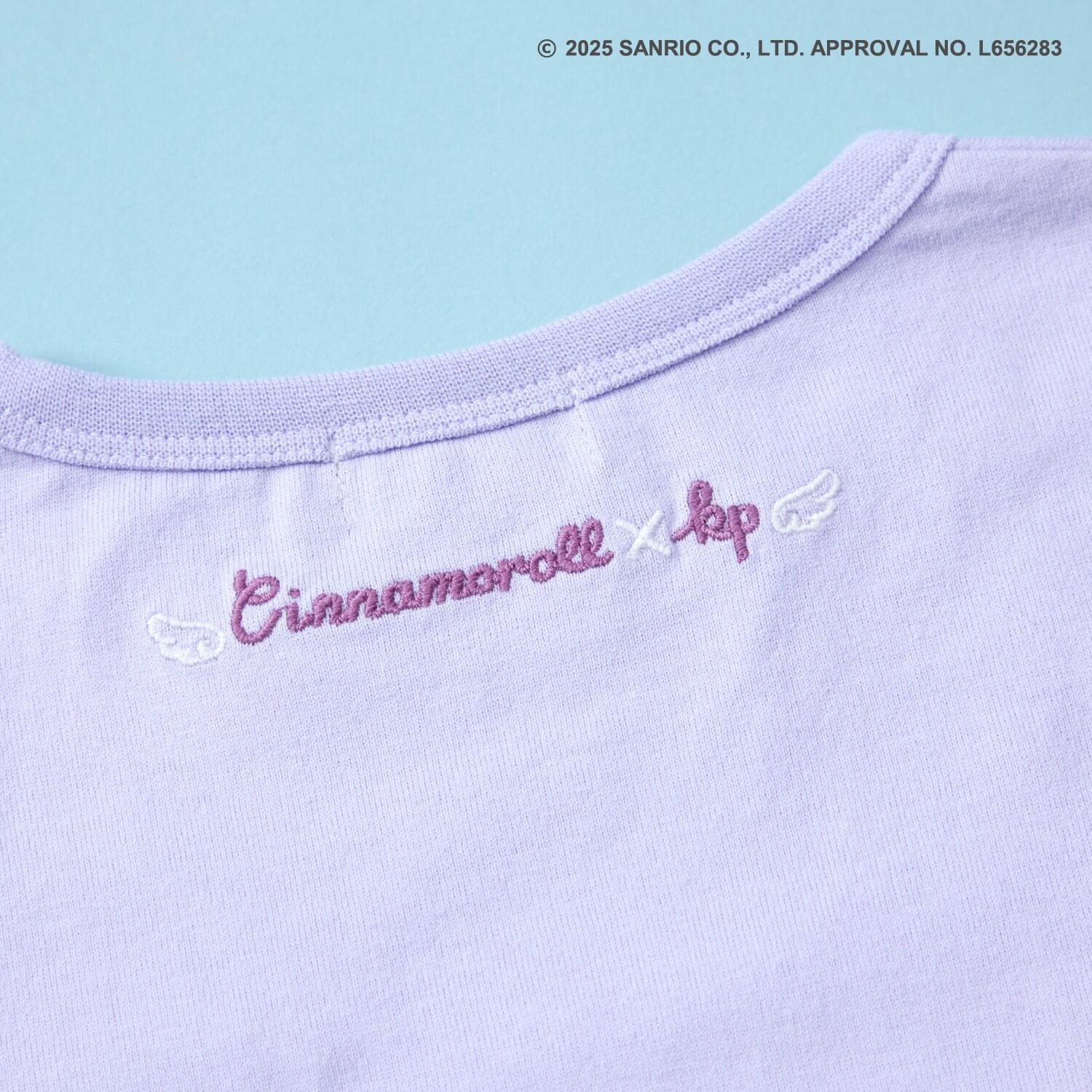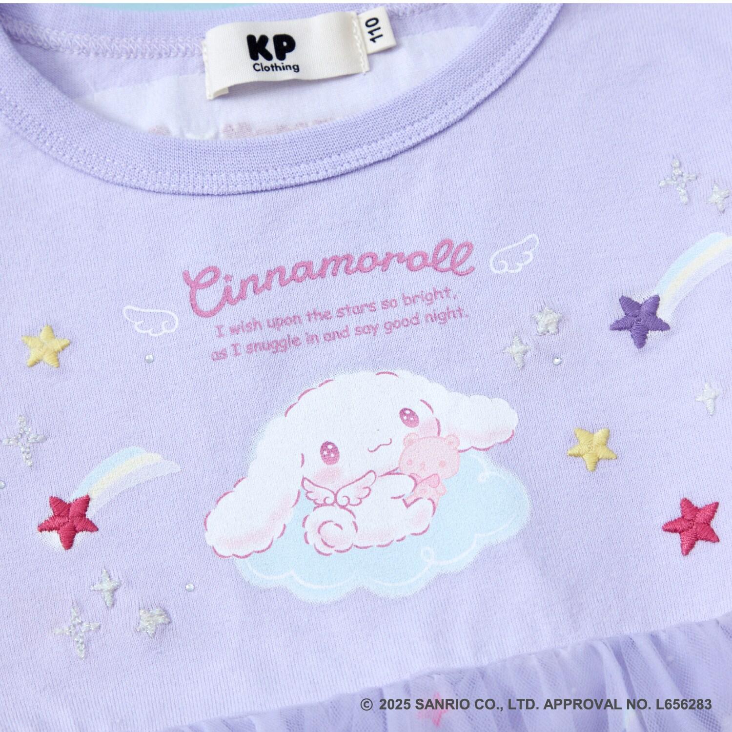 與三麗鷗卡通人物 Cinnamoroll 合作推出的長袖薄紗外衣。可愛的 Cinnamoroll 印花周圍綴有蹩腳刺繡和水鑽,閃閃發光。薄紗面料與印有 Cinnamoroll 圖案的滌綸面料層疊在一起,呈現出時尚的透明感。90 厘米款式的左肩開口。