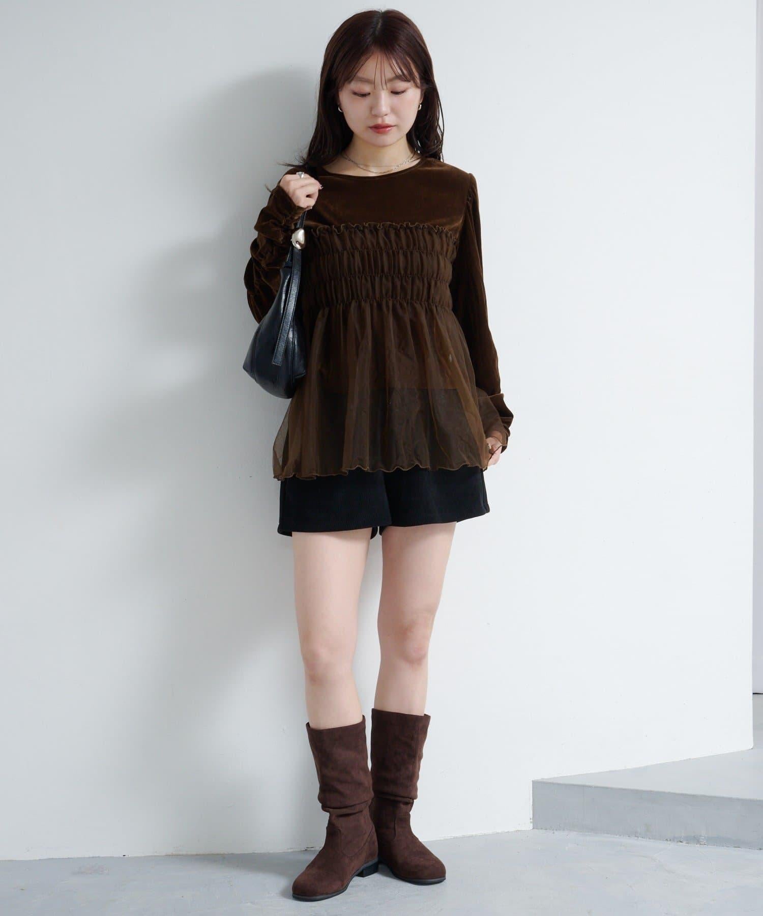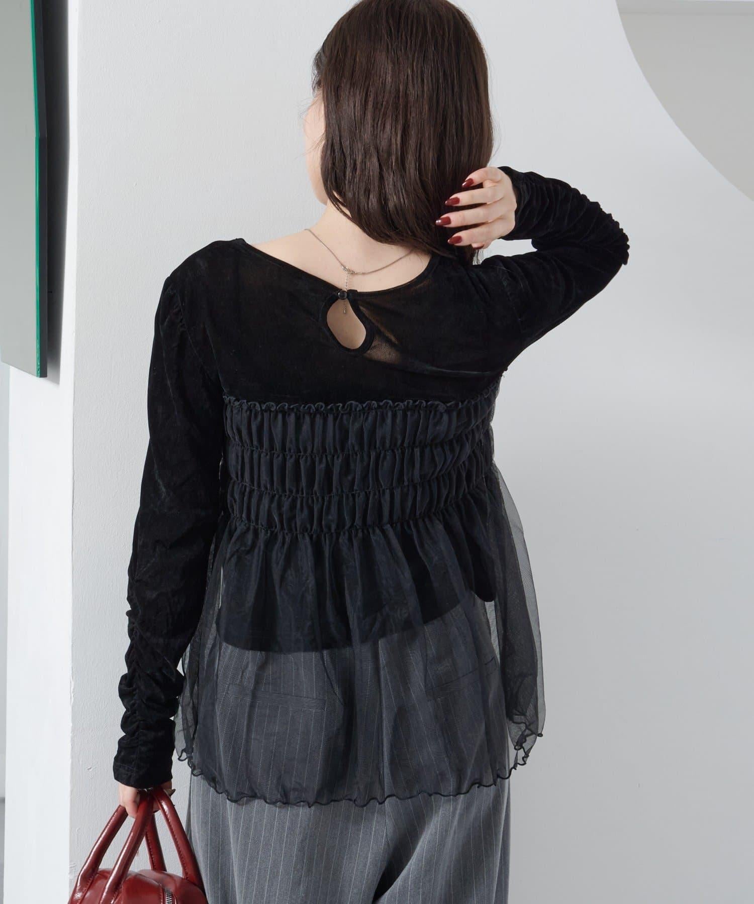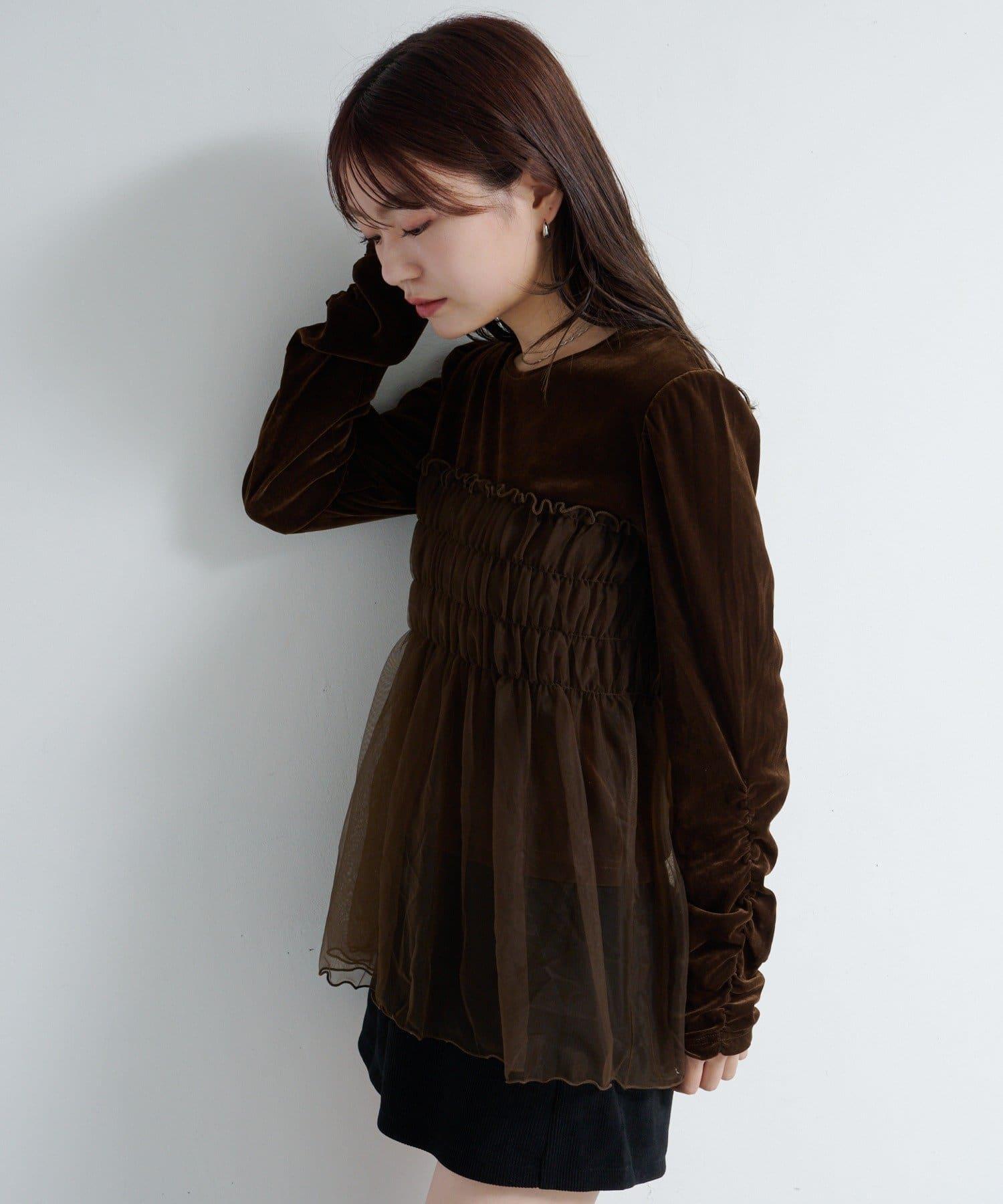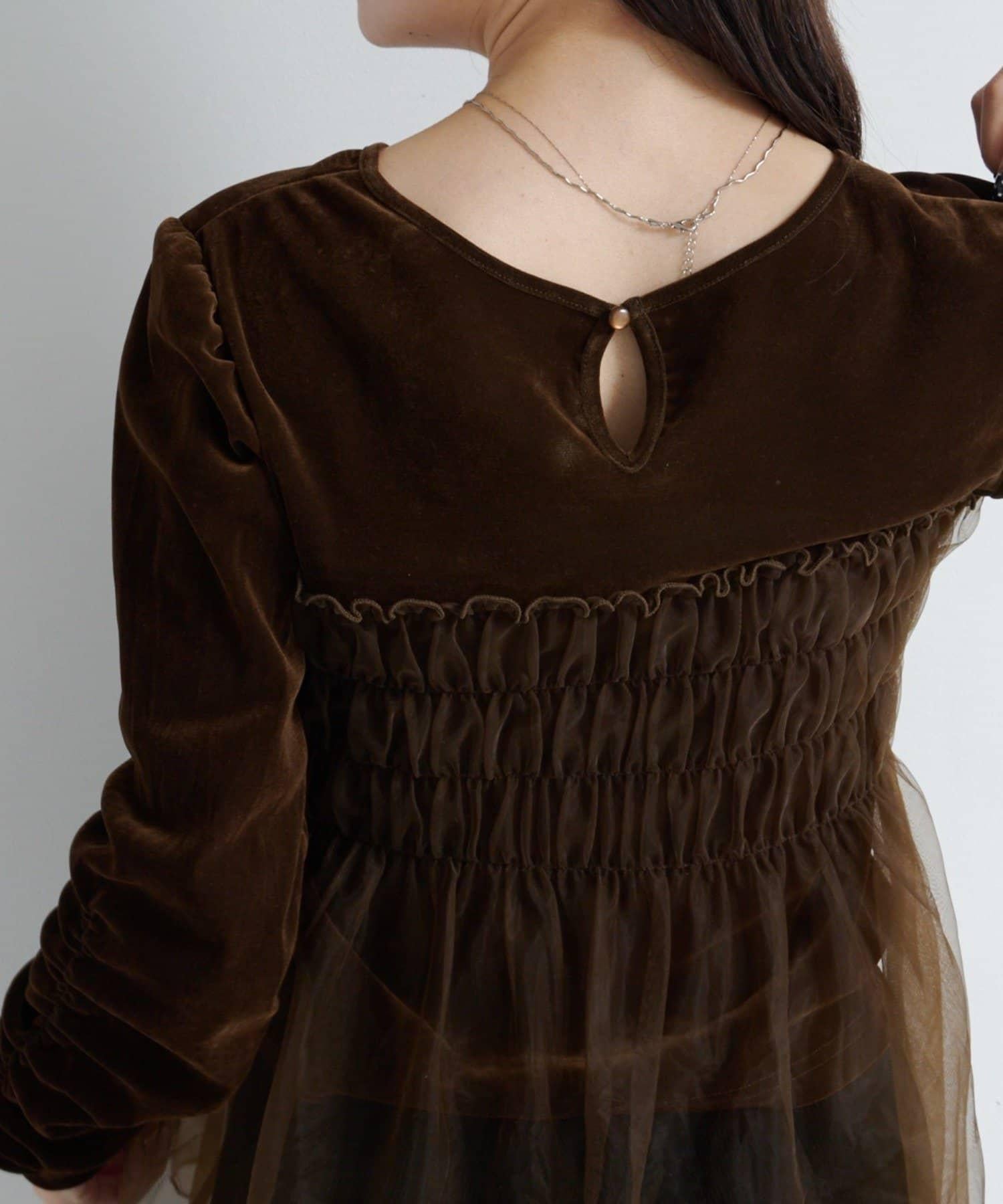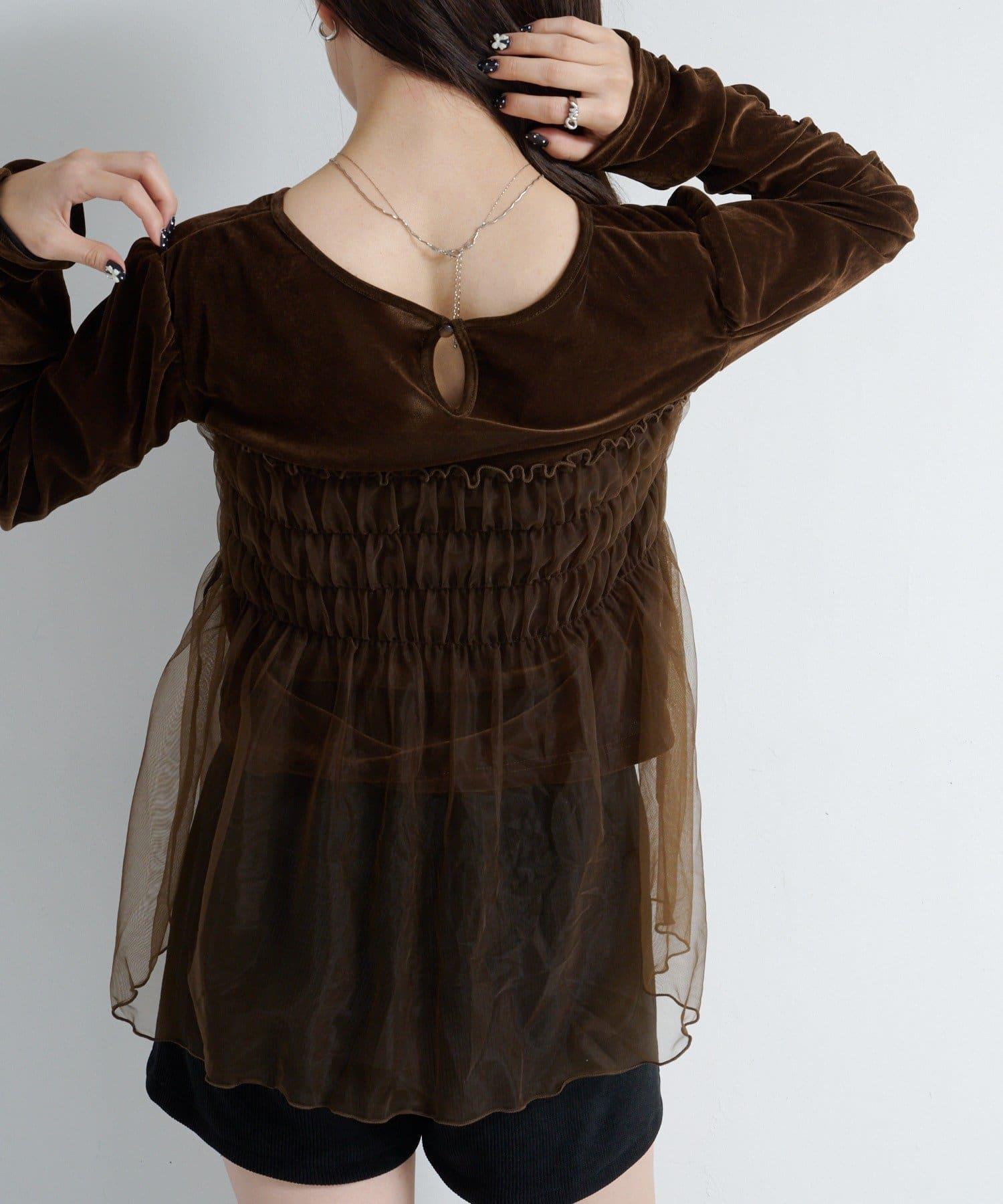 這款迷人的上衣由閃亮的絲絨面料和柔軟透明的薄紗對接而成。