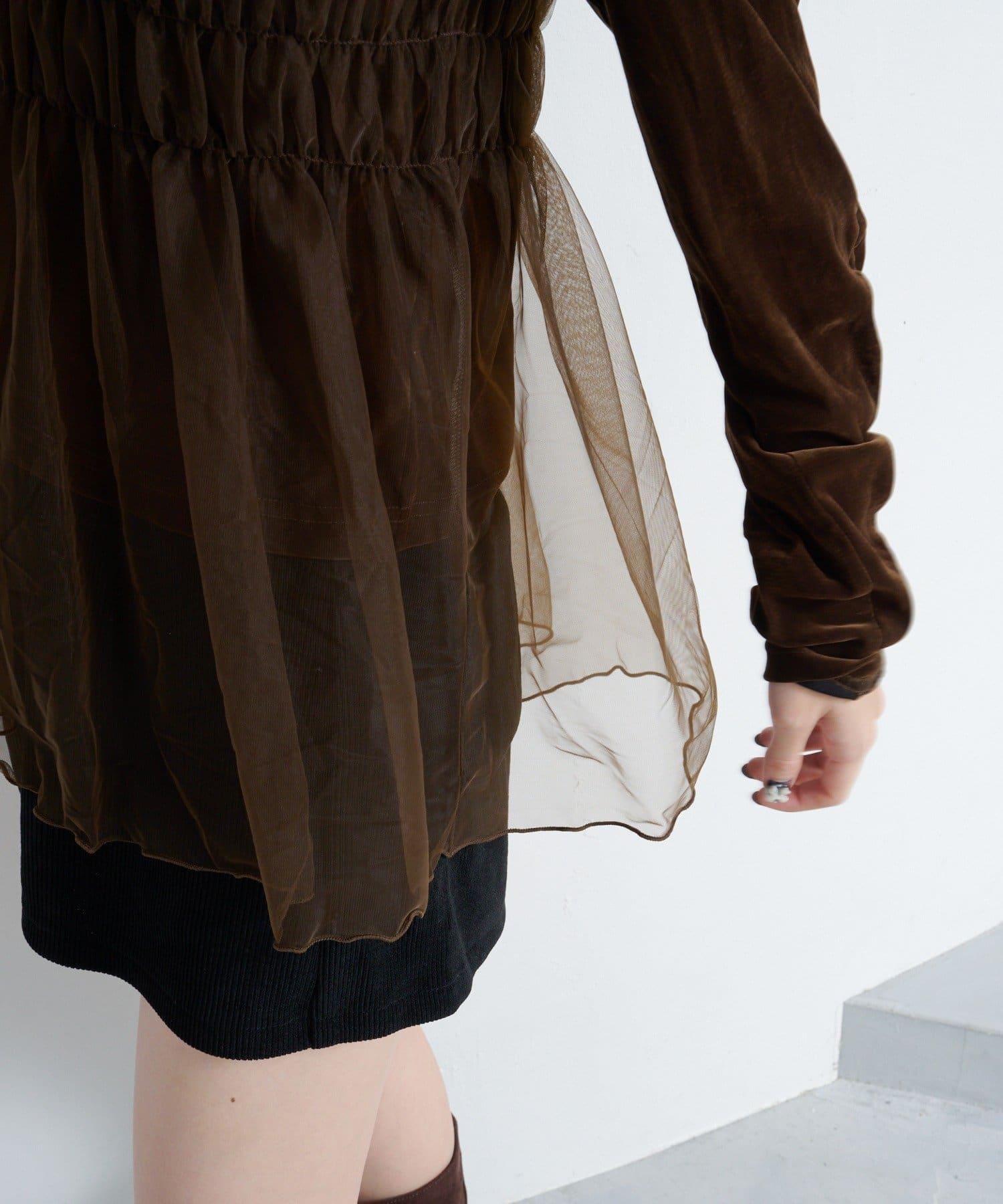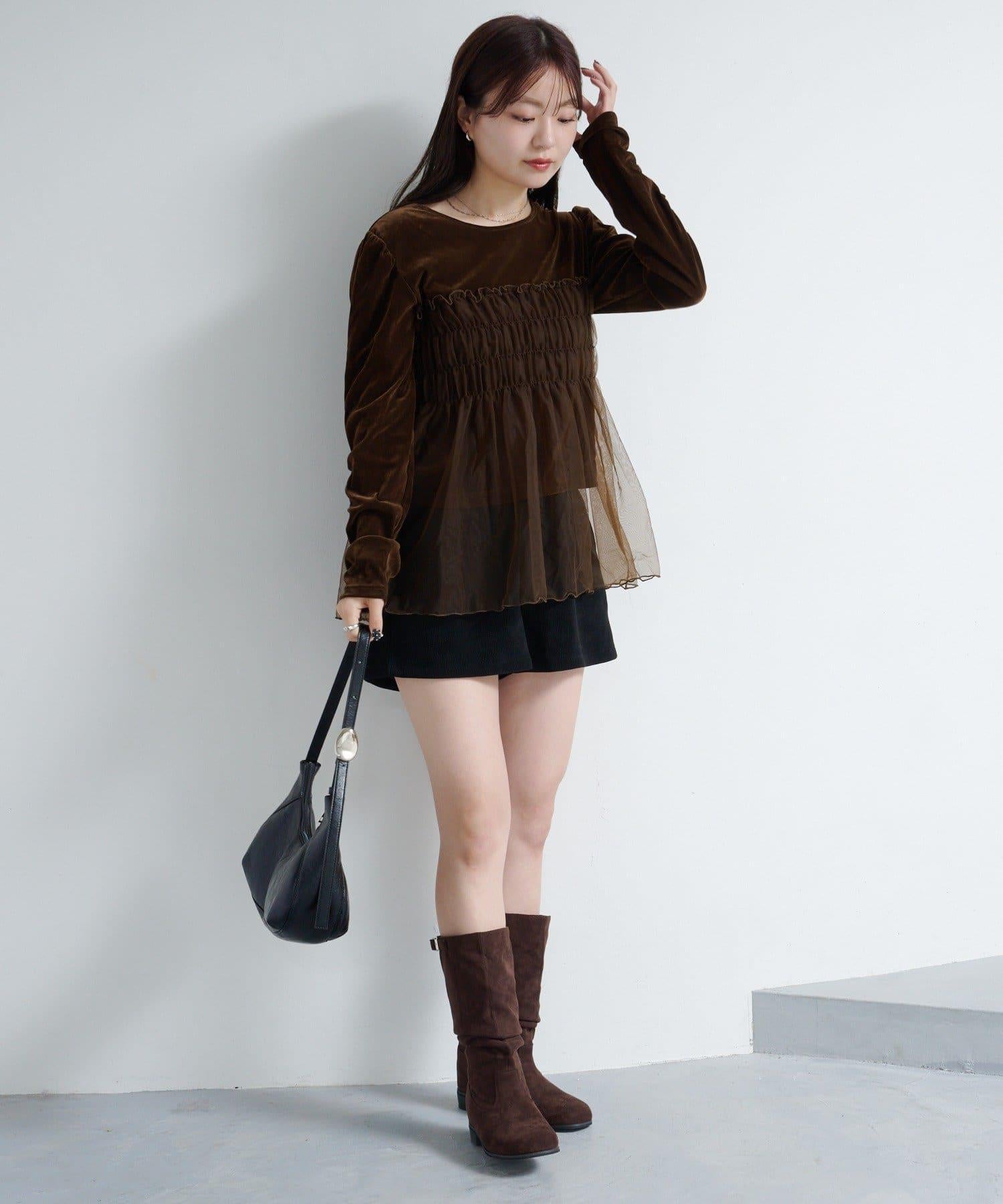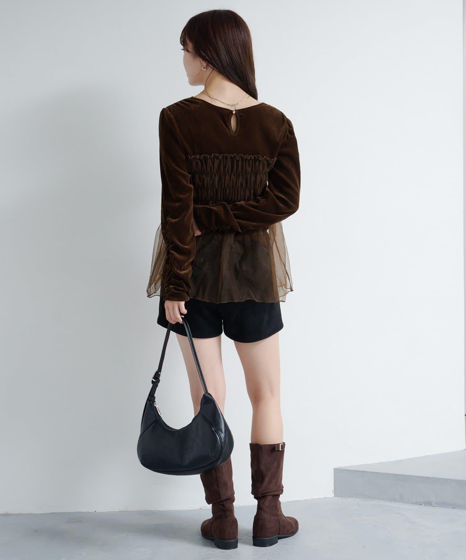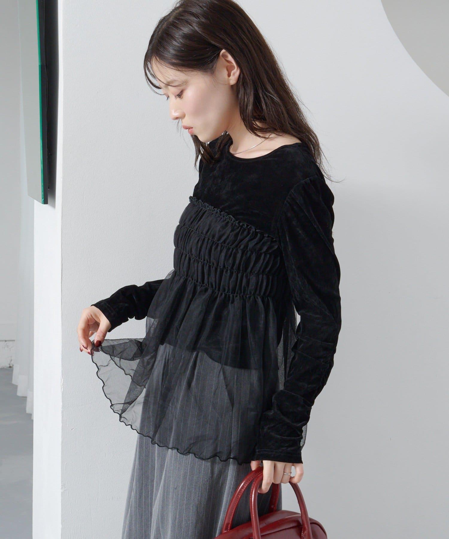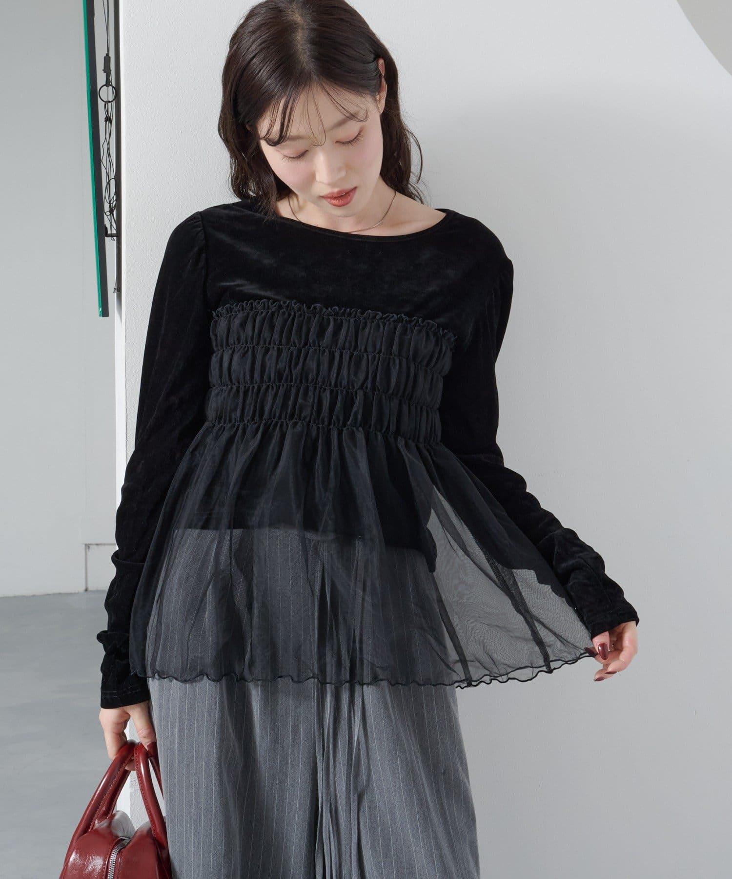 這款迷人的上衣由閃亮的絲絨面料和柔軟透明的薄紗對接而成。