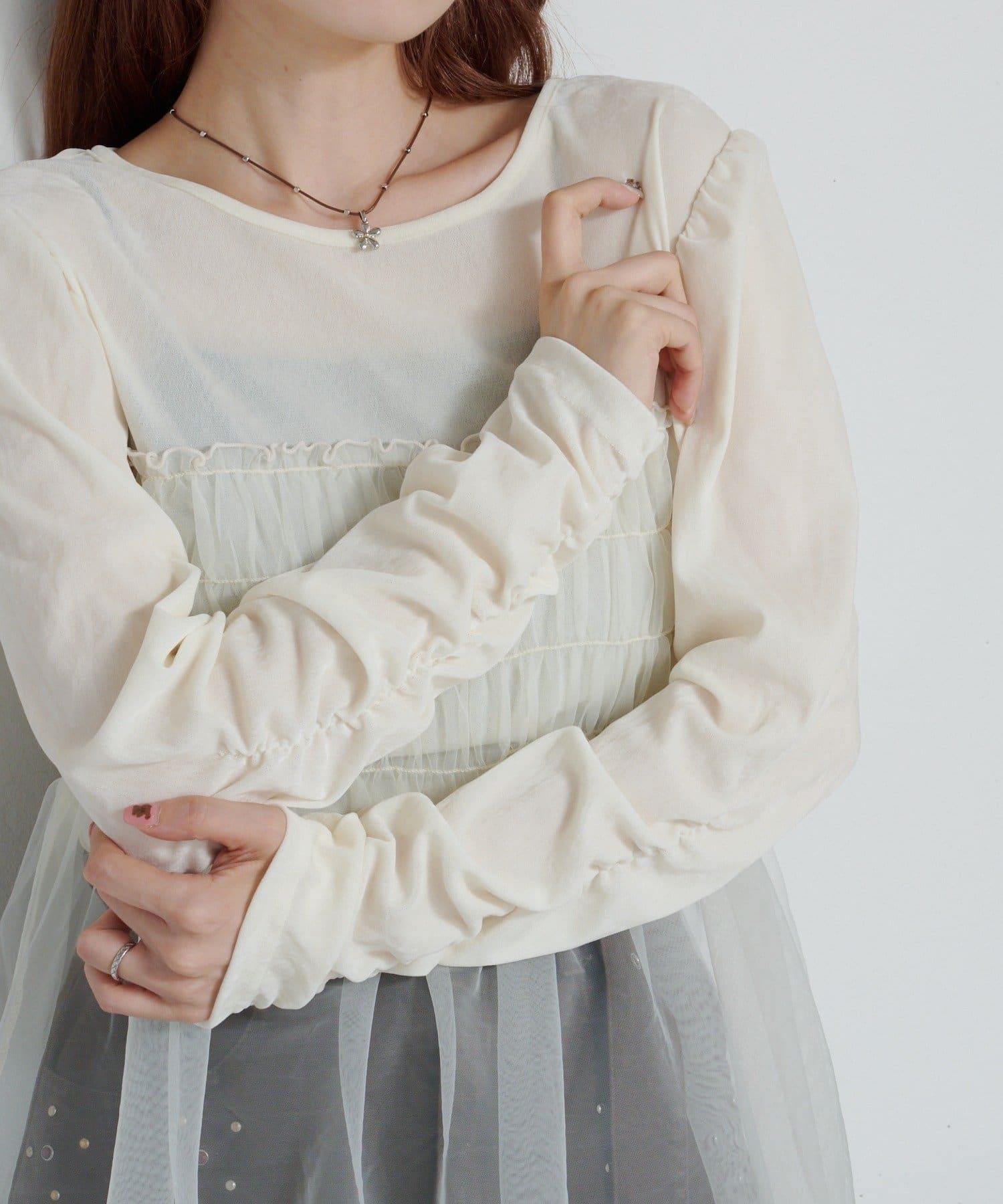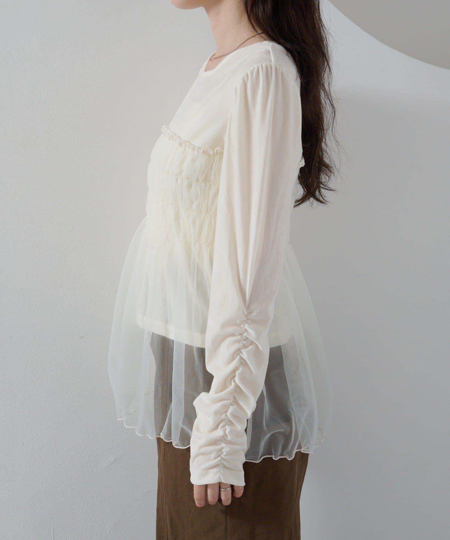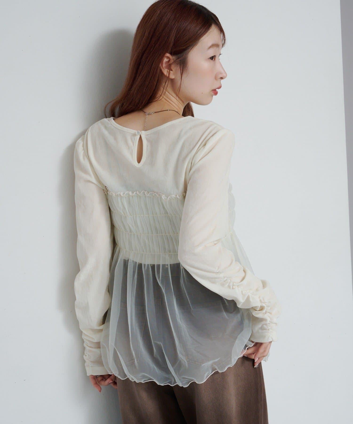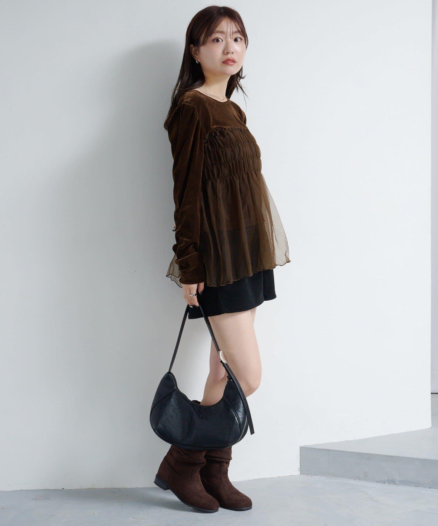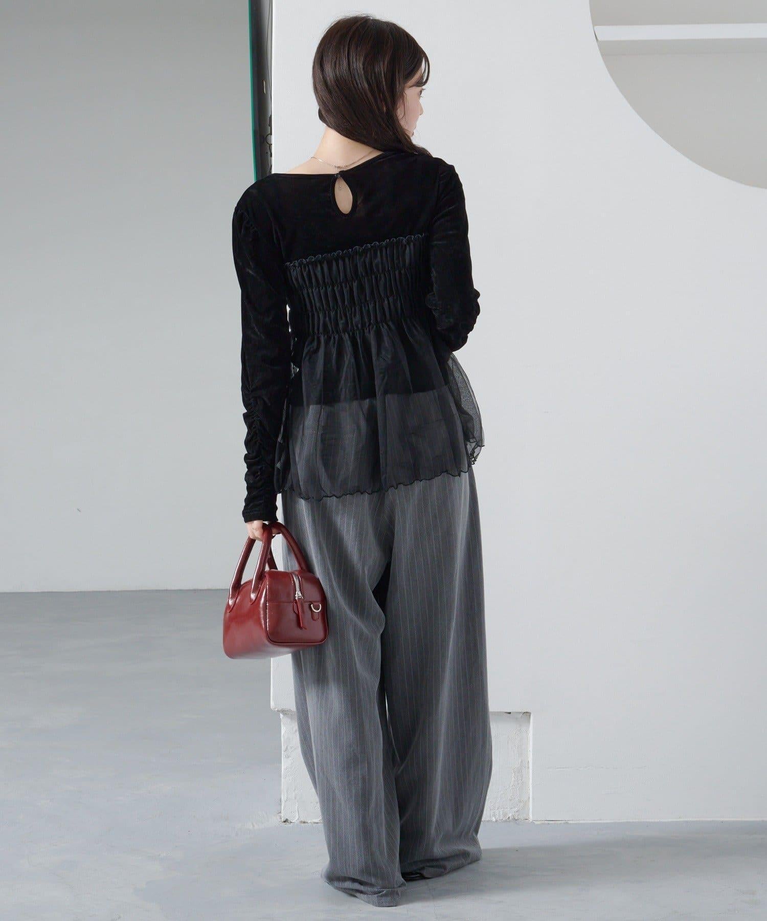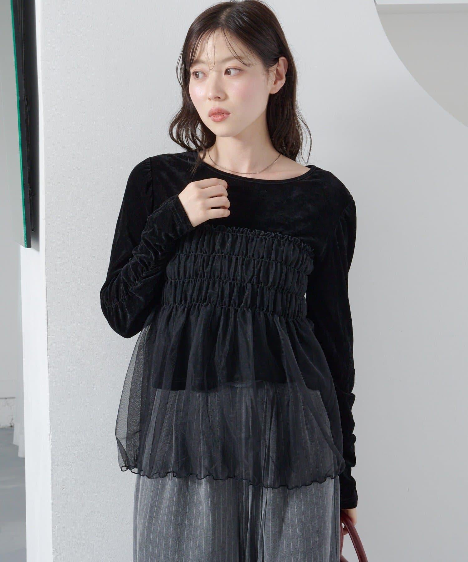 這款迷人的上衣由閃亮的絲絨面料和柔軟透明的薄紗對接而成。