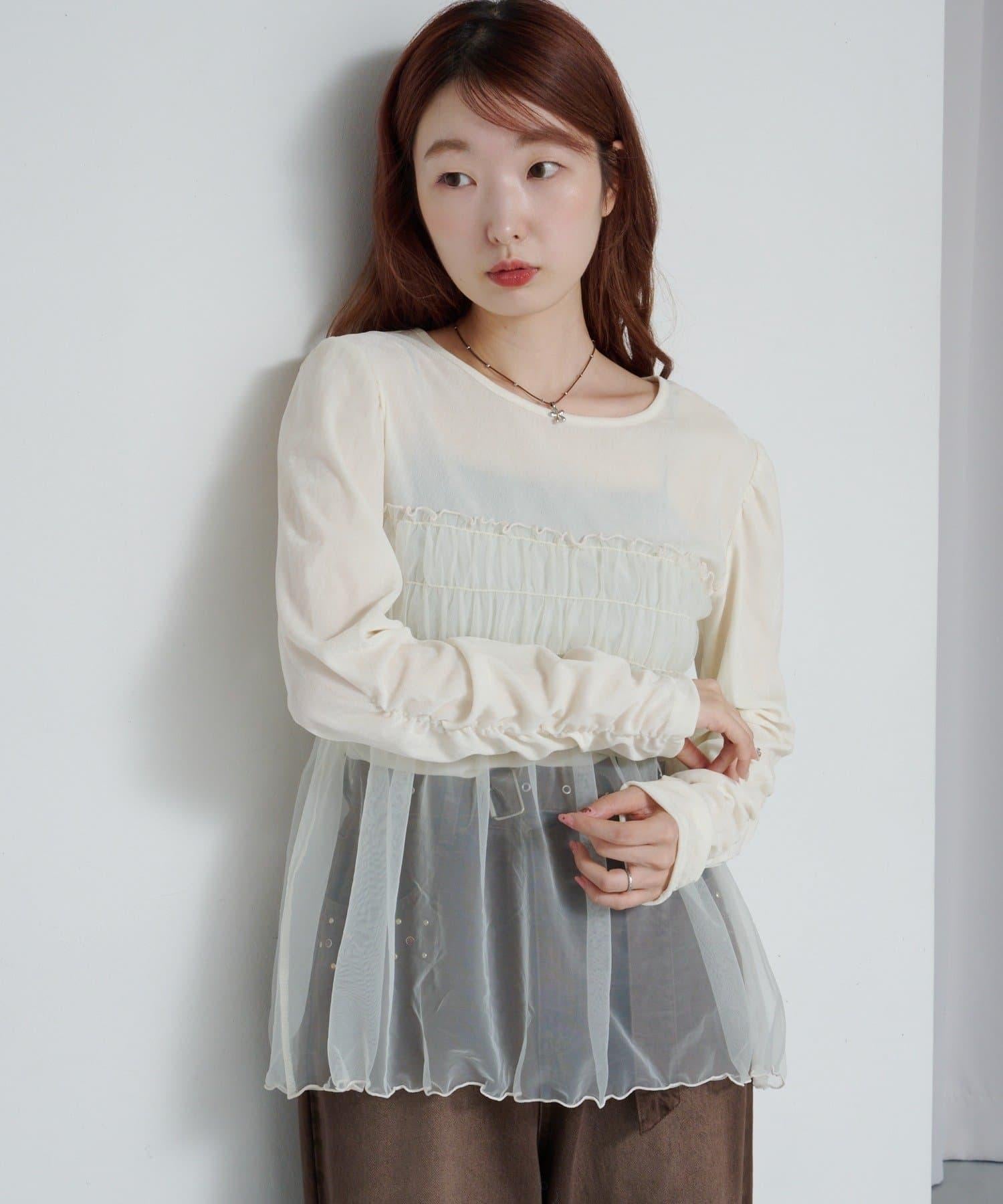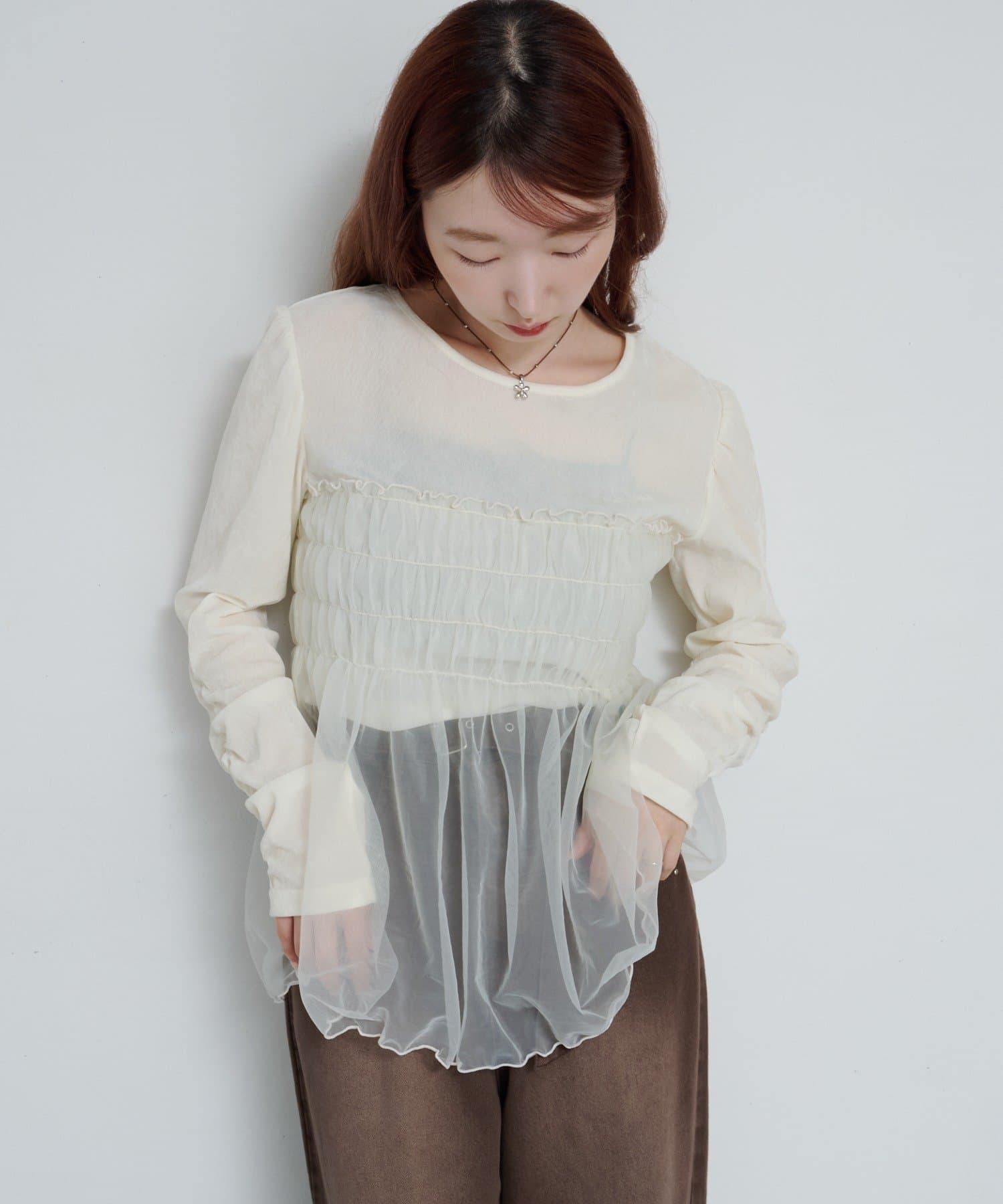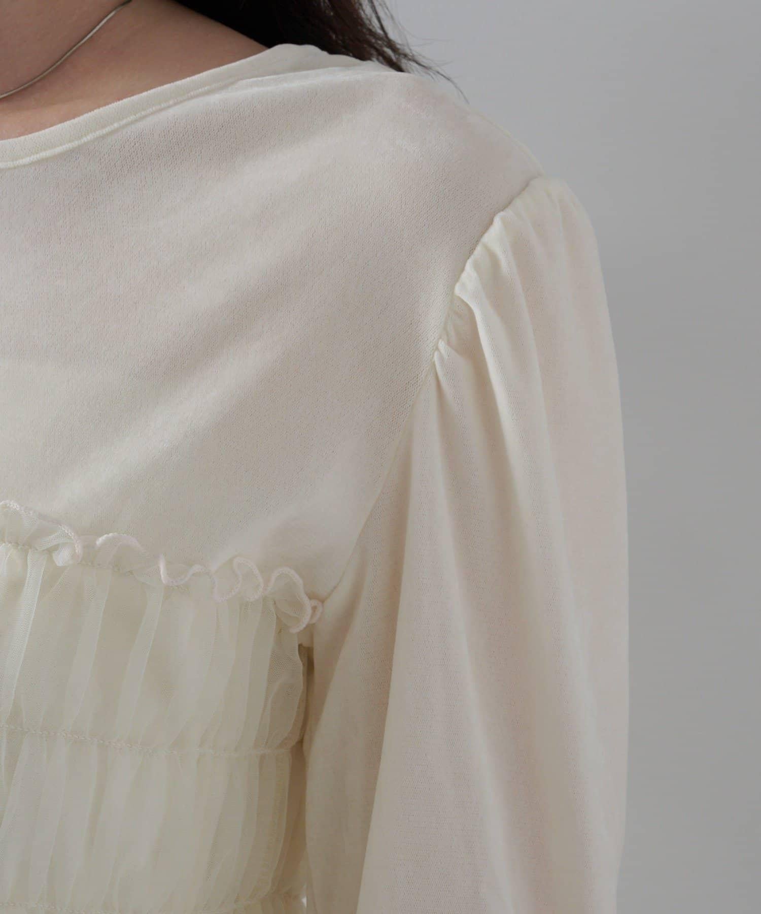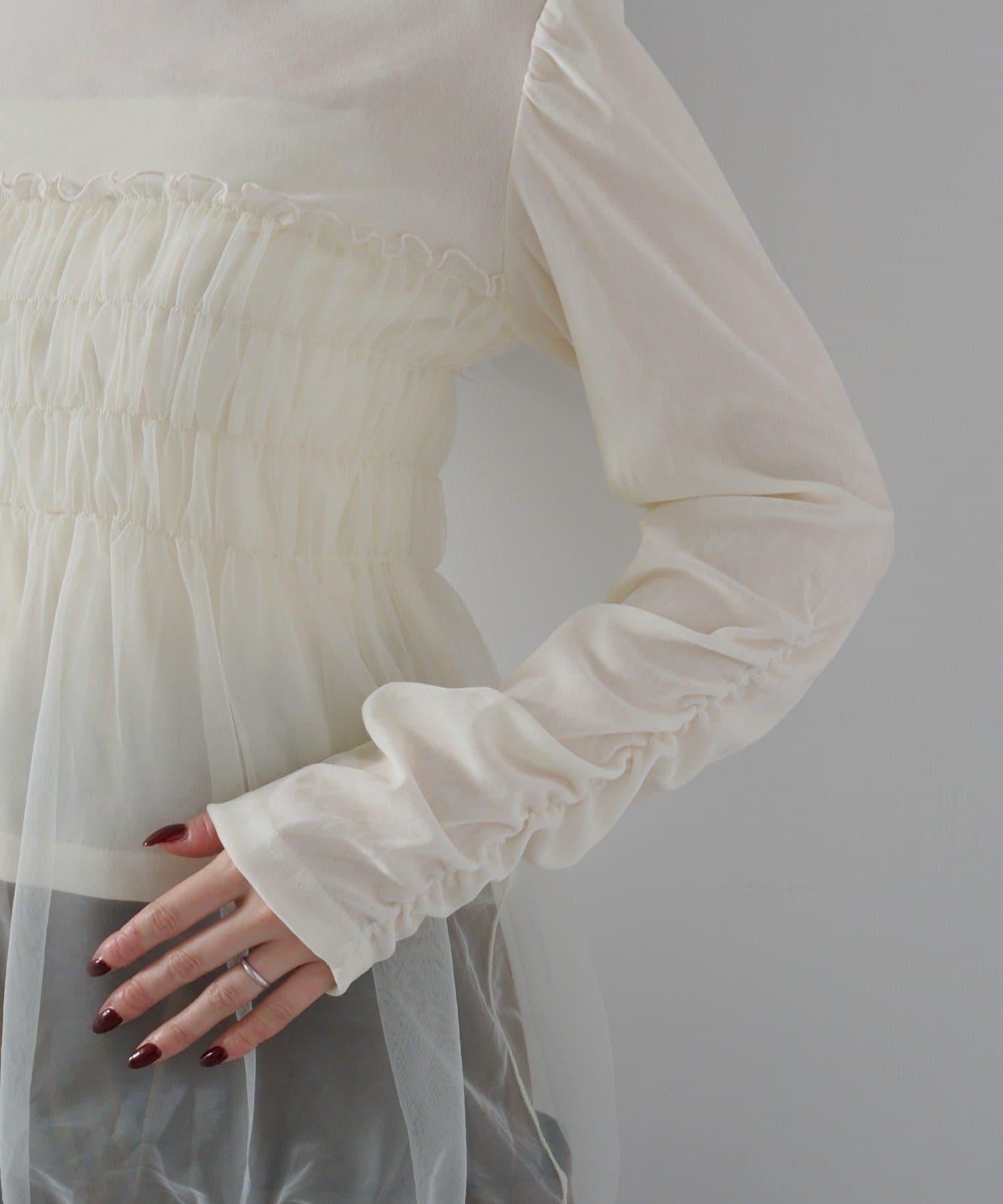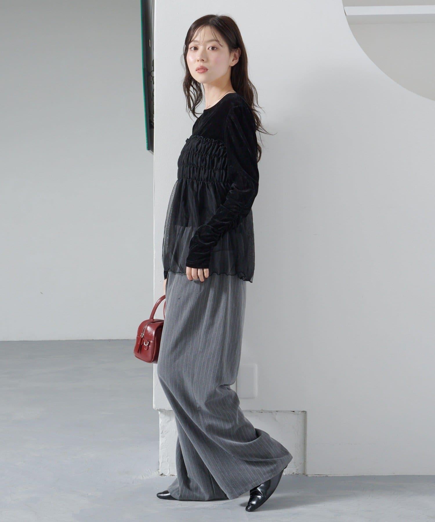 這款迷人的上衣由閃亮的絲絨面料和柔軟透明的薄紗對接而成。