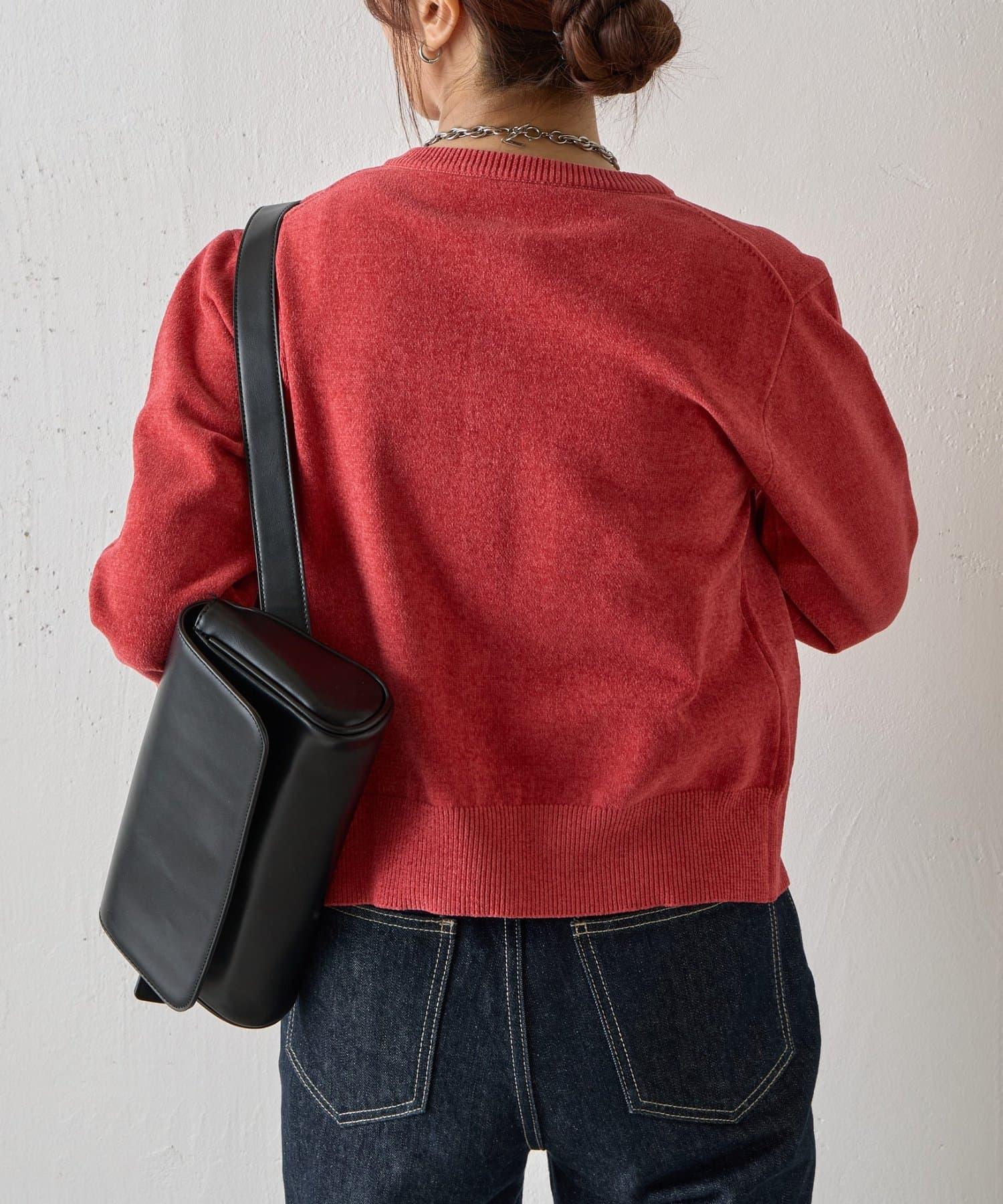 這款圓領開衫採用絲絨編織面料製成,光澤柔滑,質地蓬鬆。
