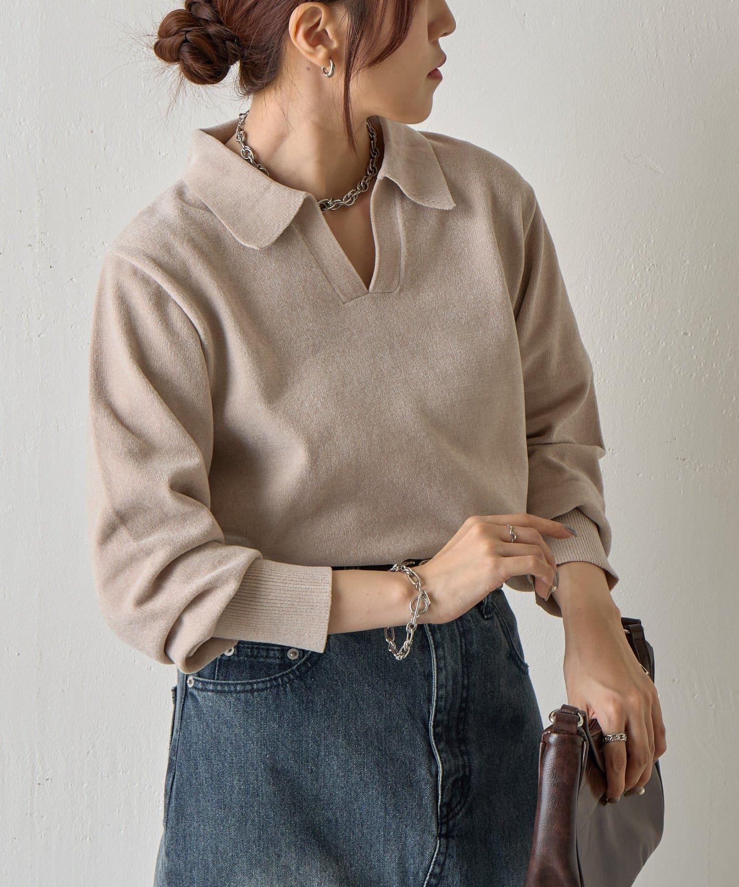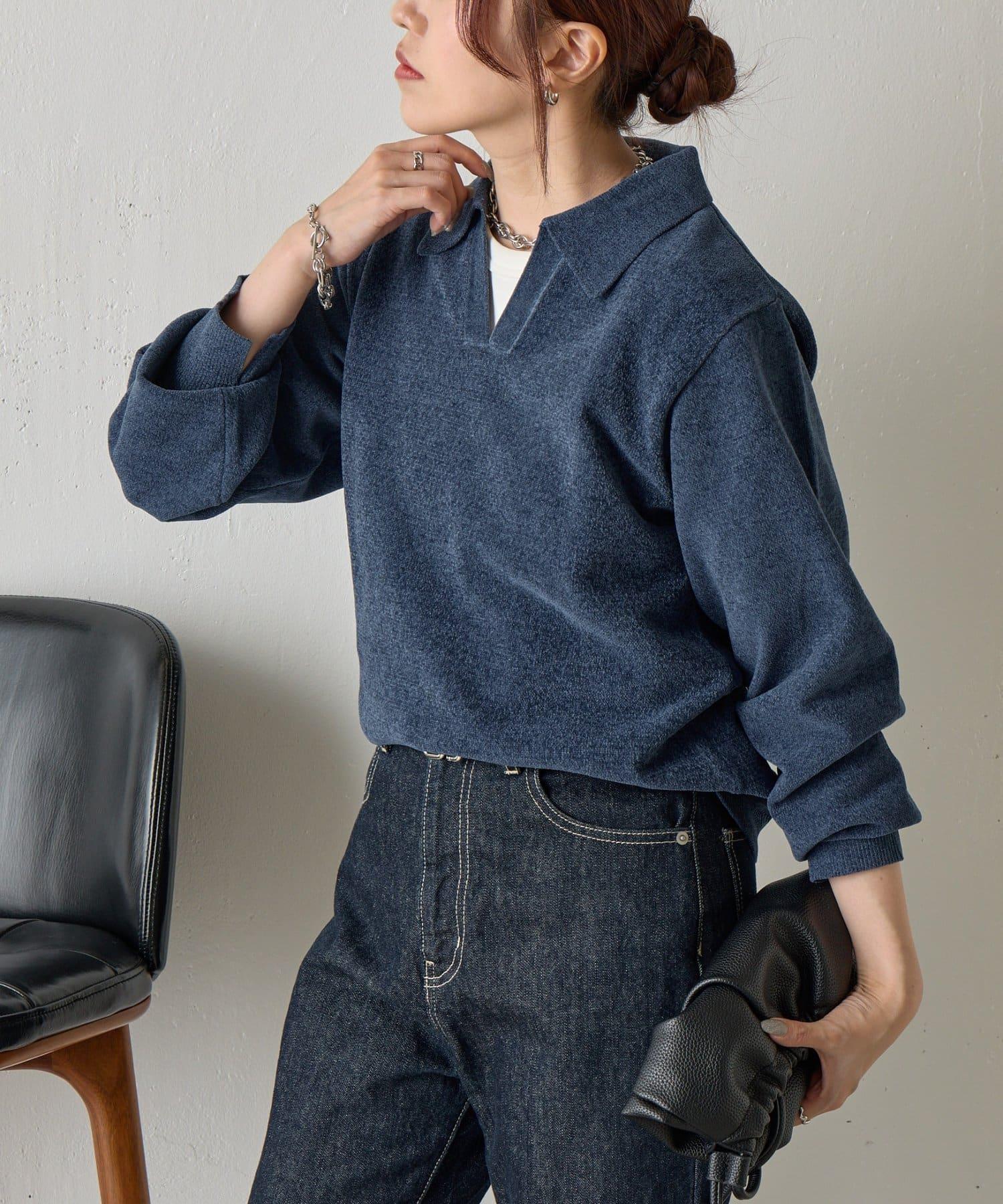 絲絨編織的船長馬球針織衫,領口整潔,觸感光滑。