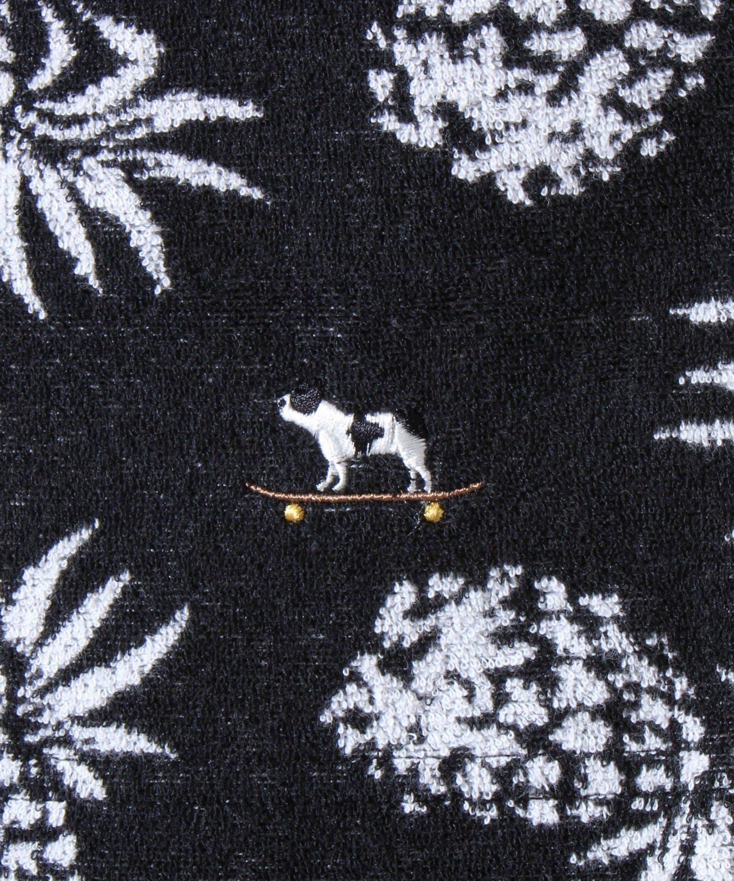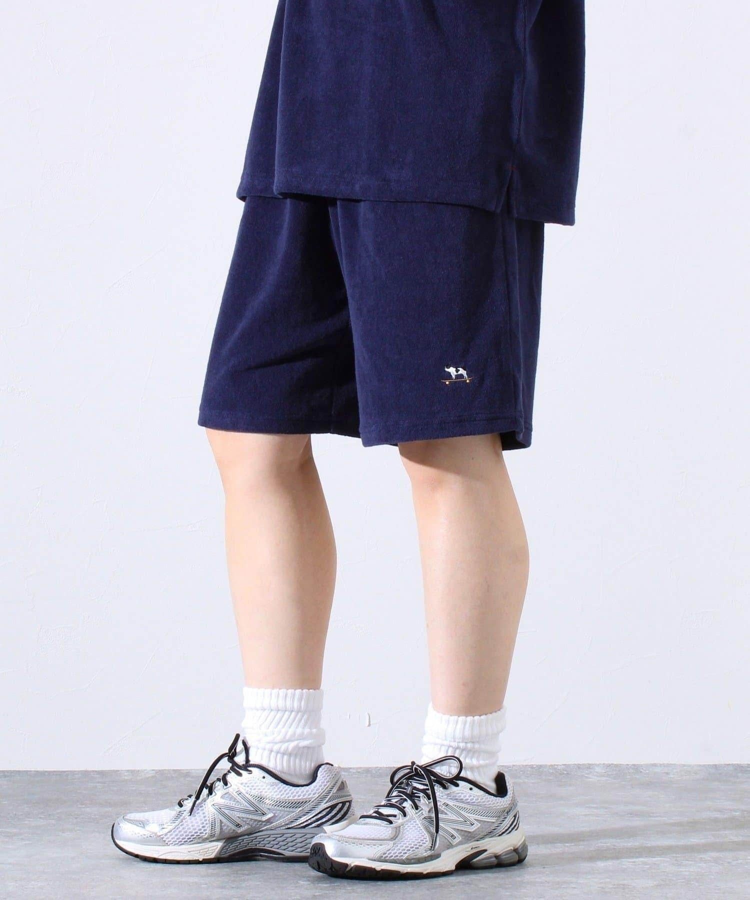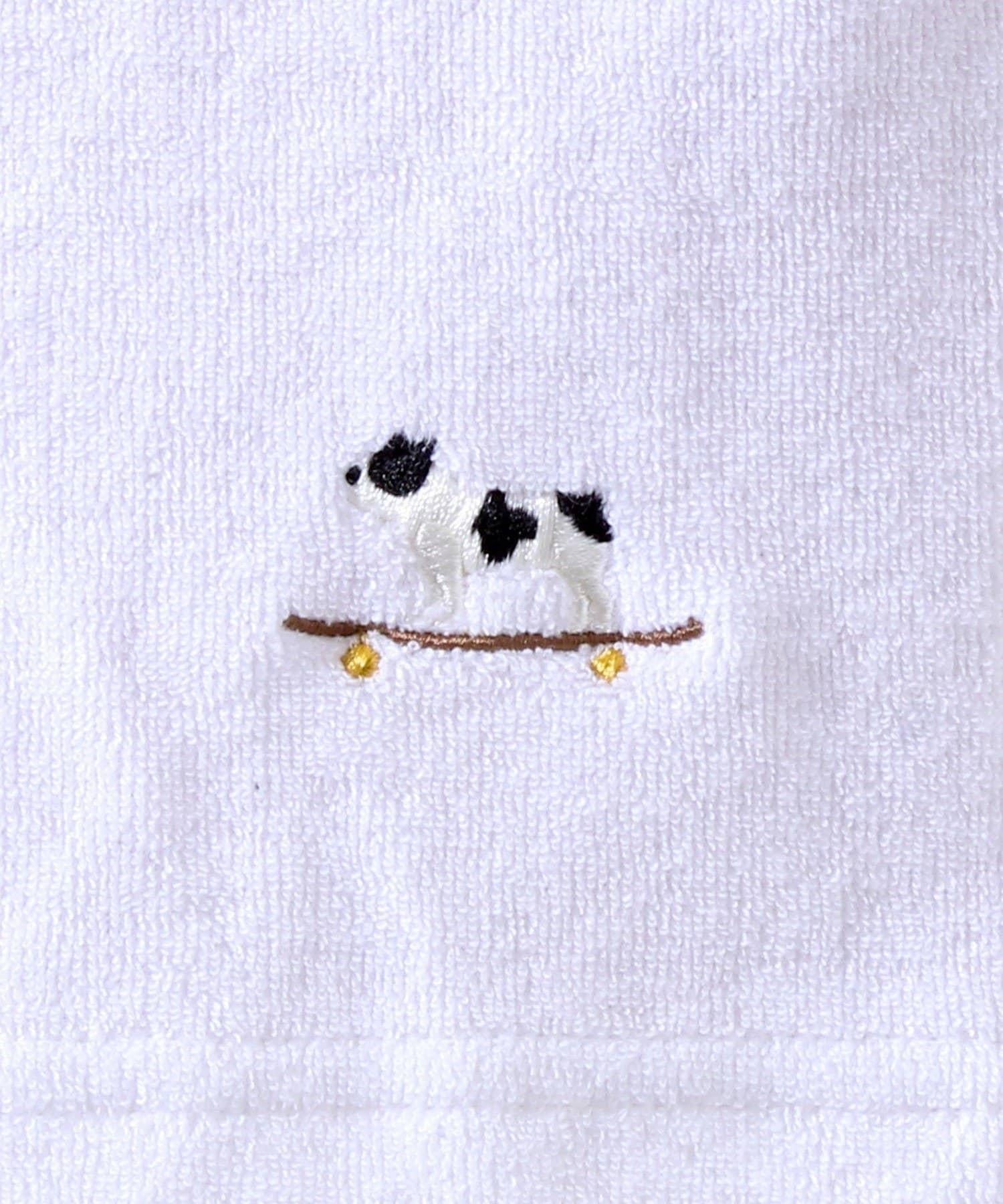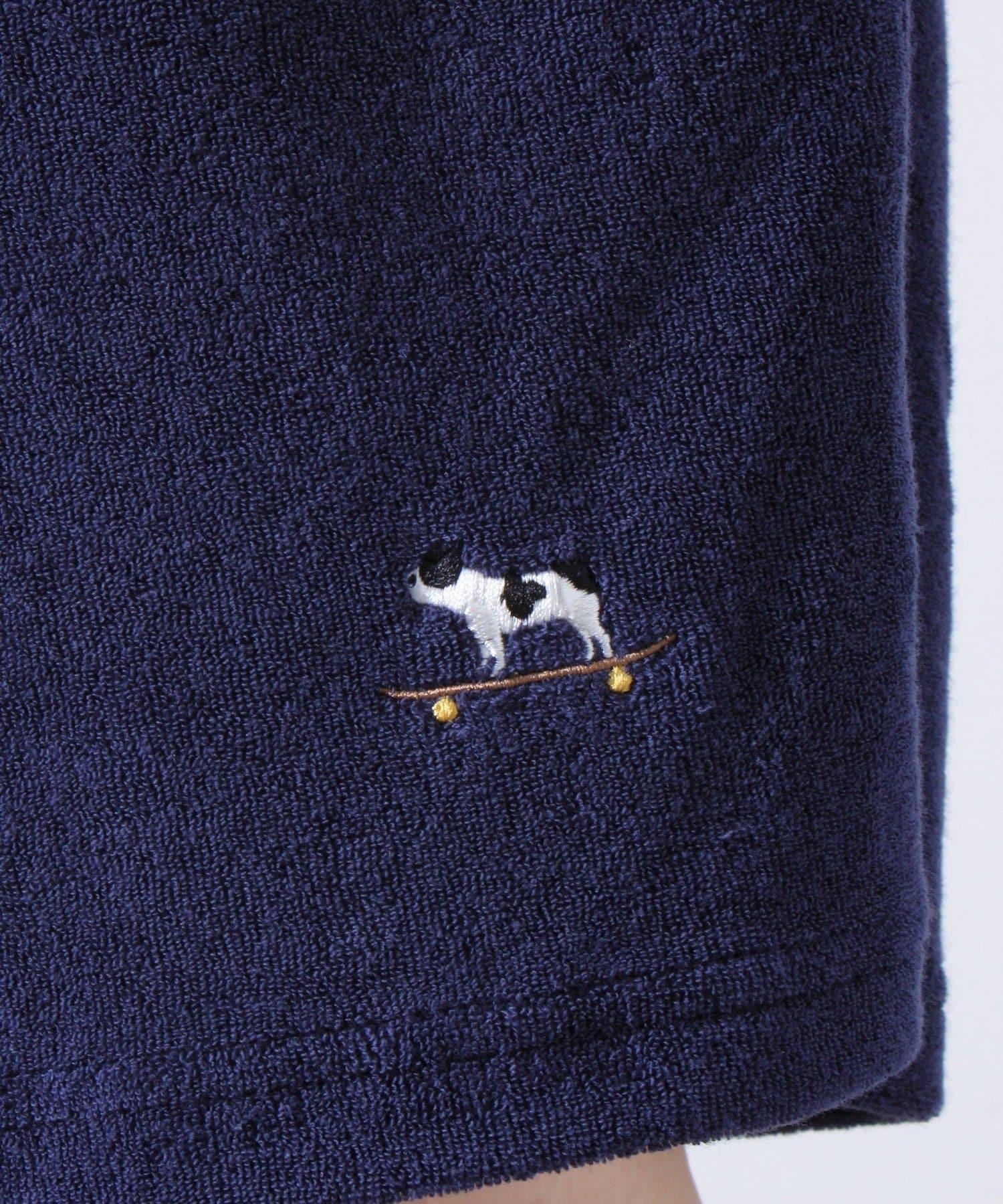俏皮的加絨短褲上繡有一隻騎在滑板上的法國鬥牛犬。