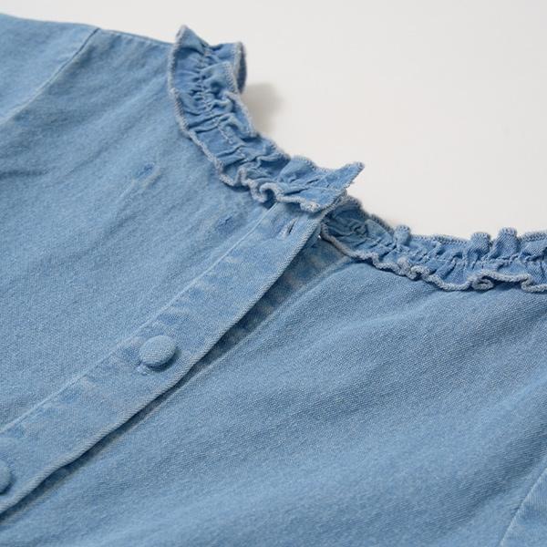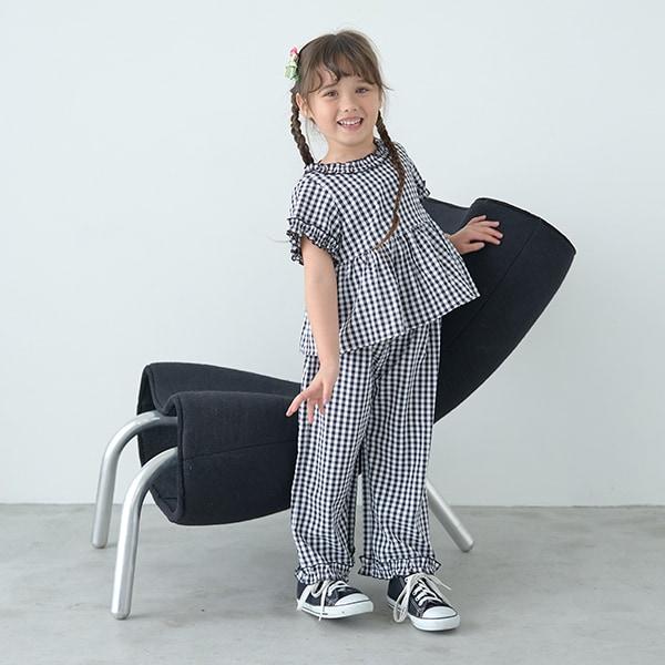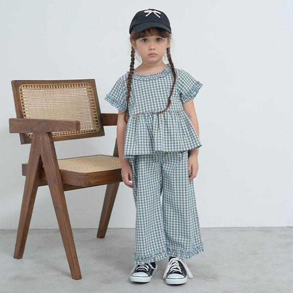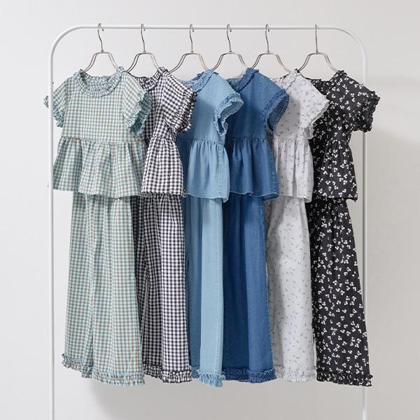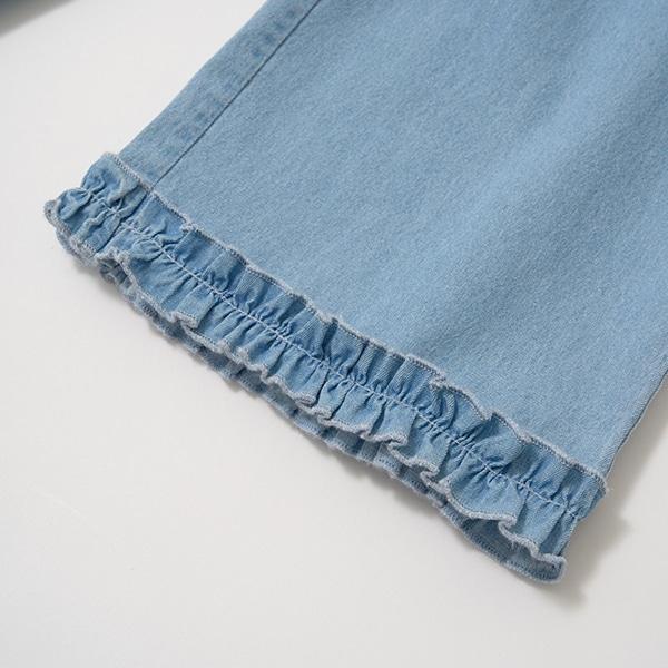 上衣領口、袖口和褲子下襬的荷葉邊是重點。