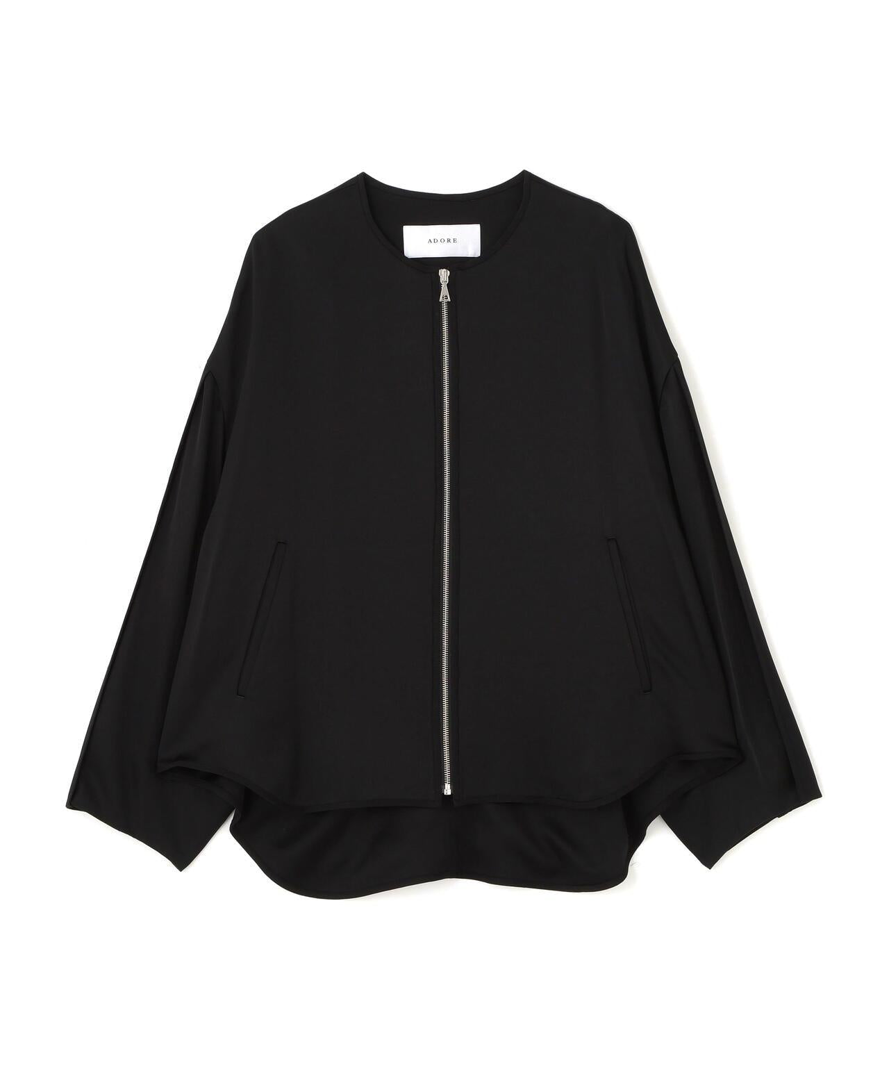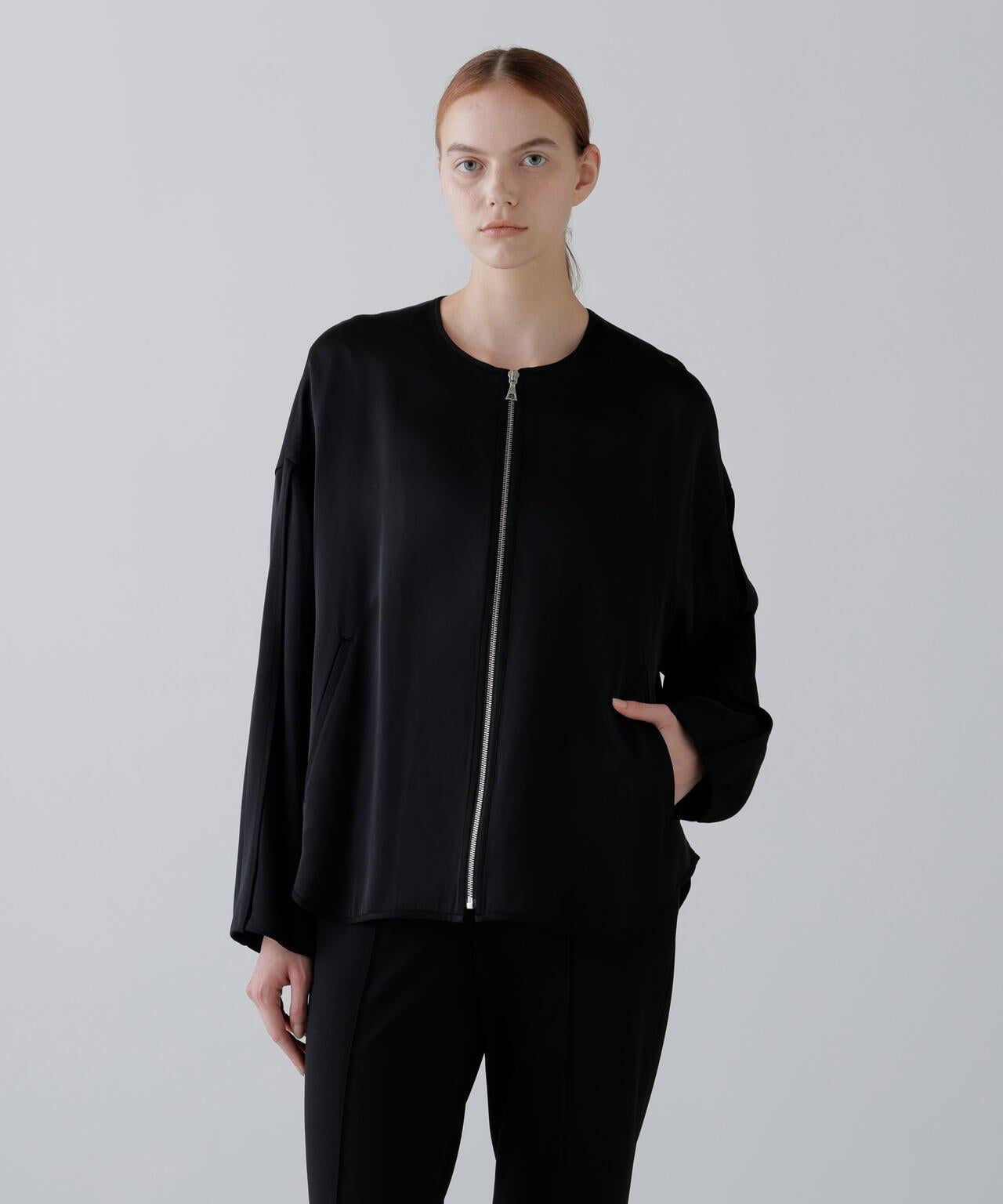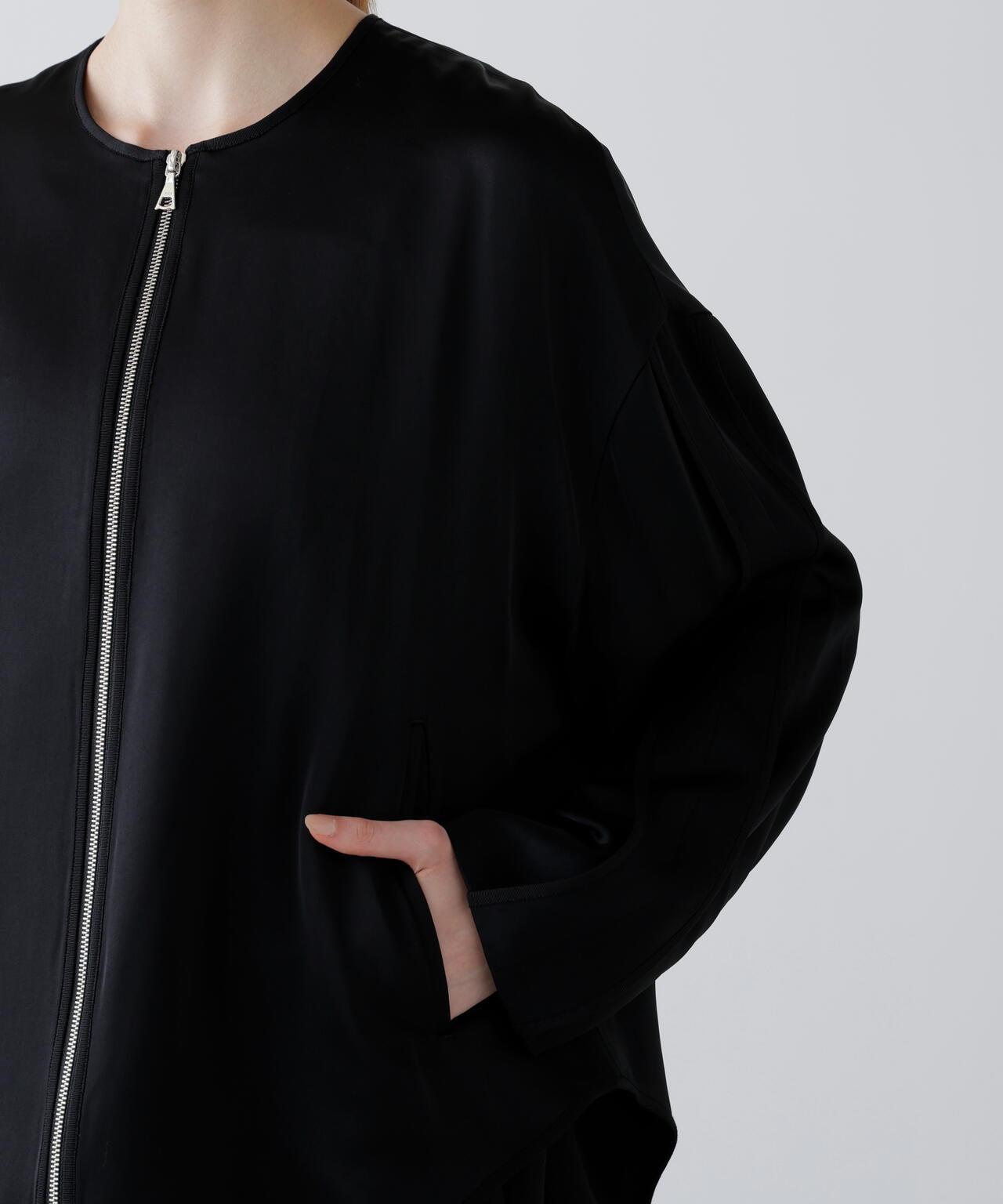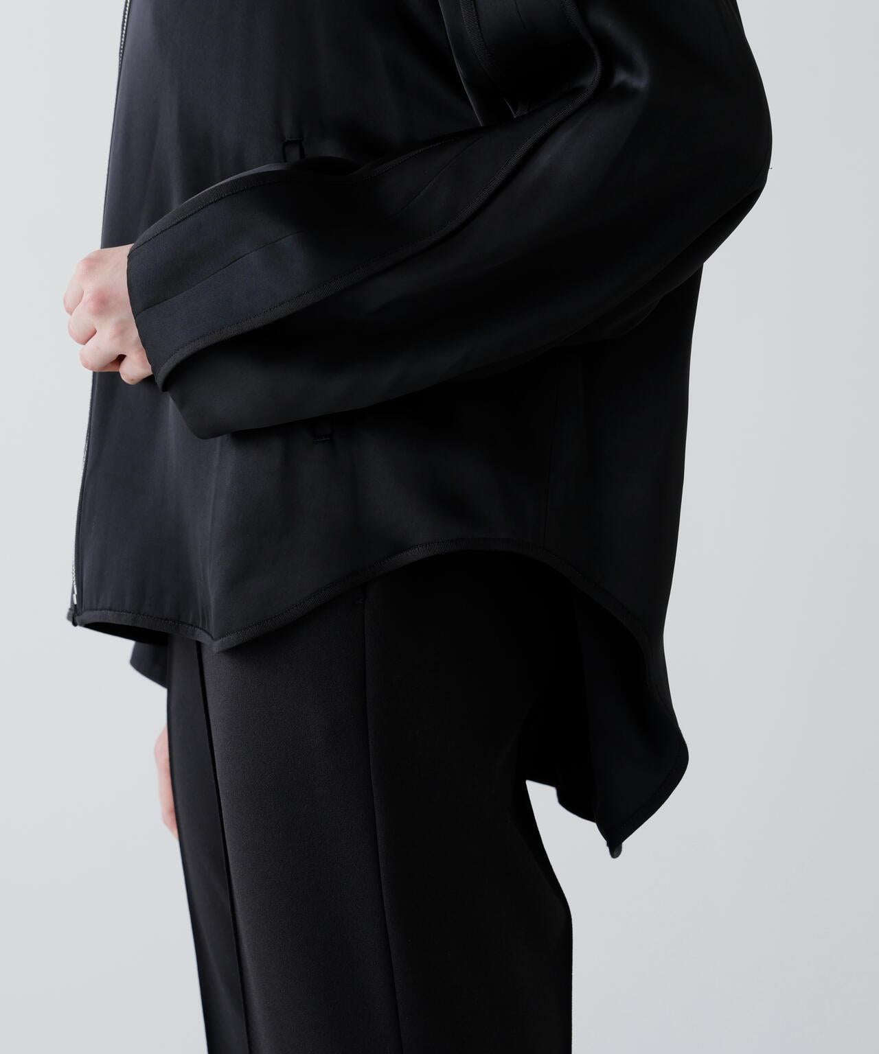 閃耀奢華光澤的緞面拉鍊夾克這款無領拉鍊夾克採用適度緊繃的緞面面料製成。略微寬鬆的剪裁,下襬呈圓形。前襟有開放式金屬扣。採用具有光澤的醋酸纖維和人造絲長絲紗線織成,質地緻密,採用懸垂性極佳的雙層緞面面料剪裁而成。