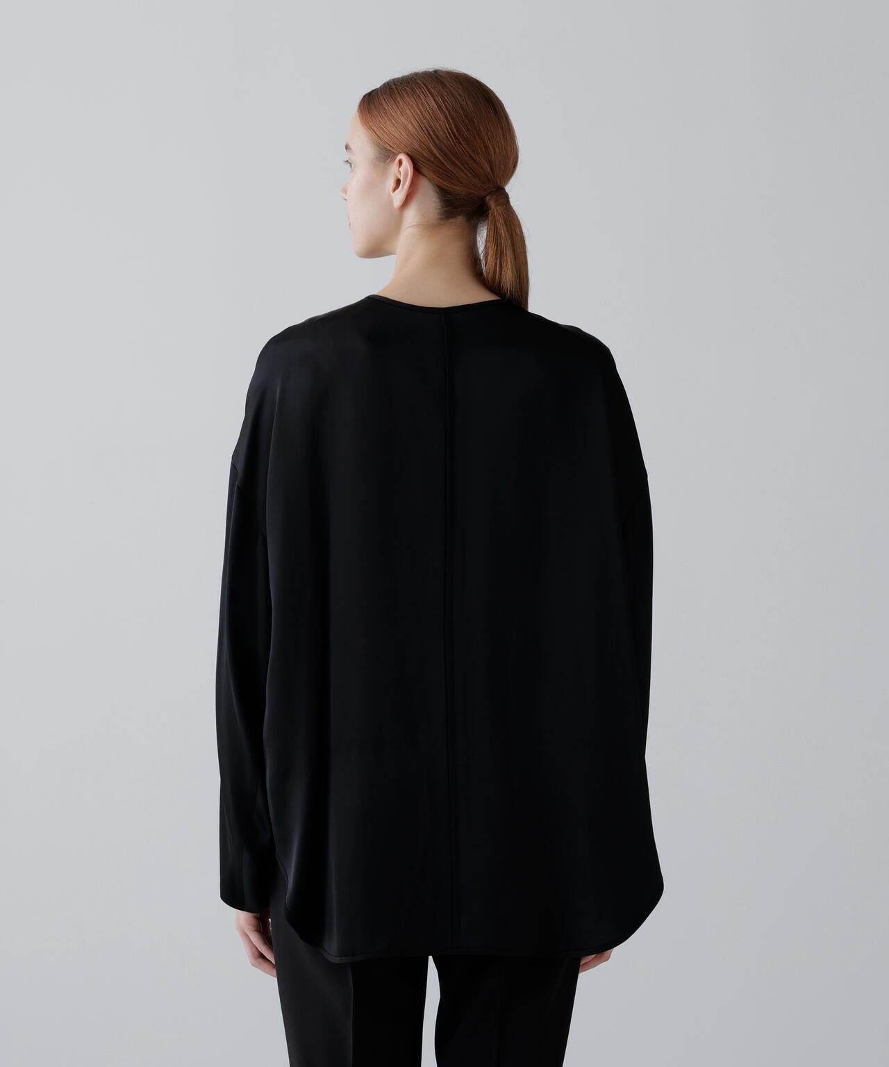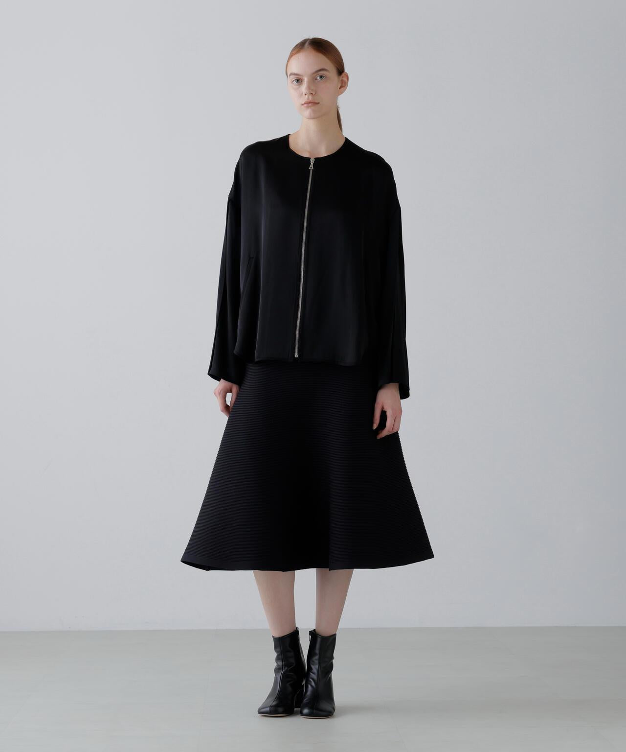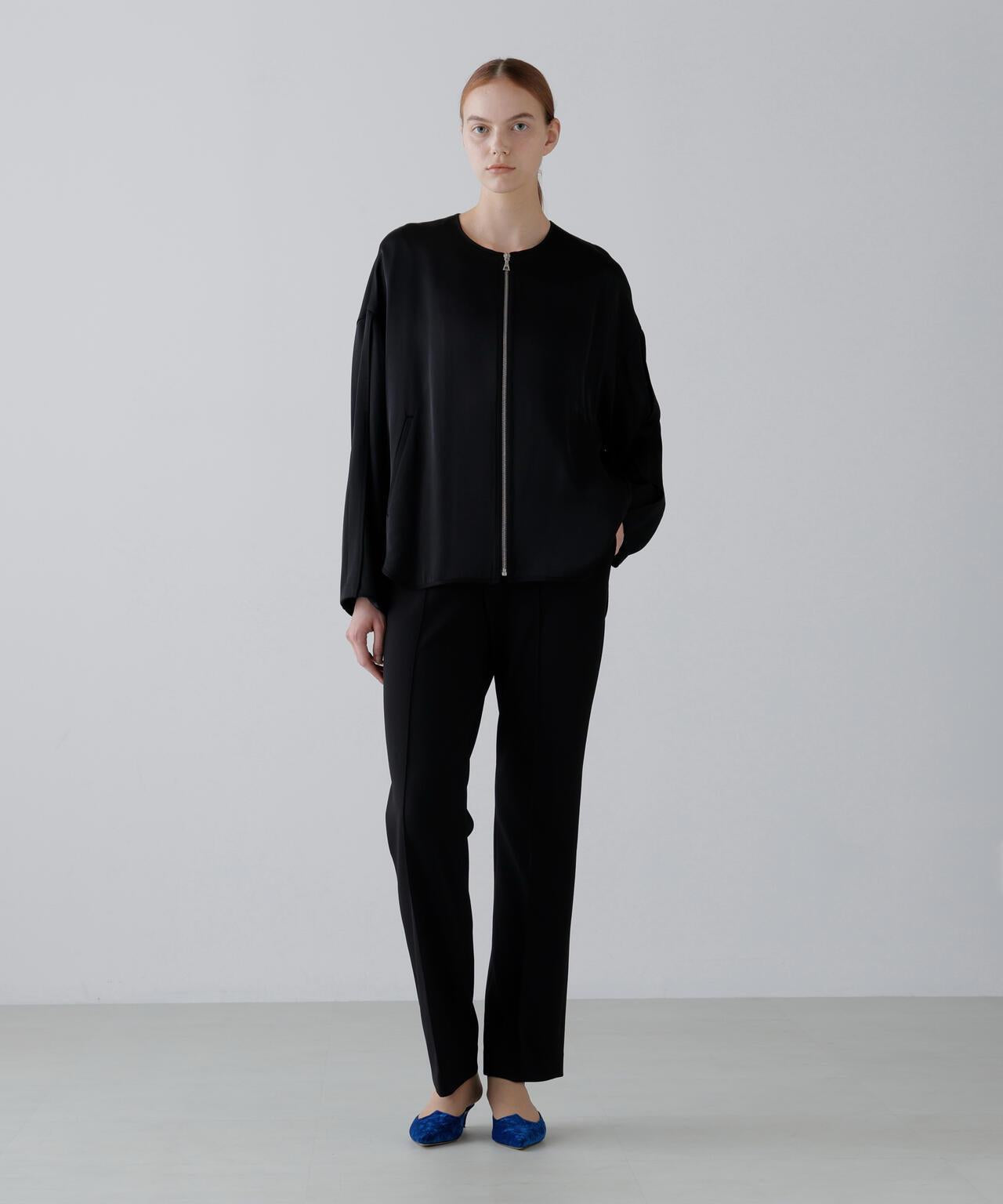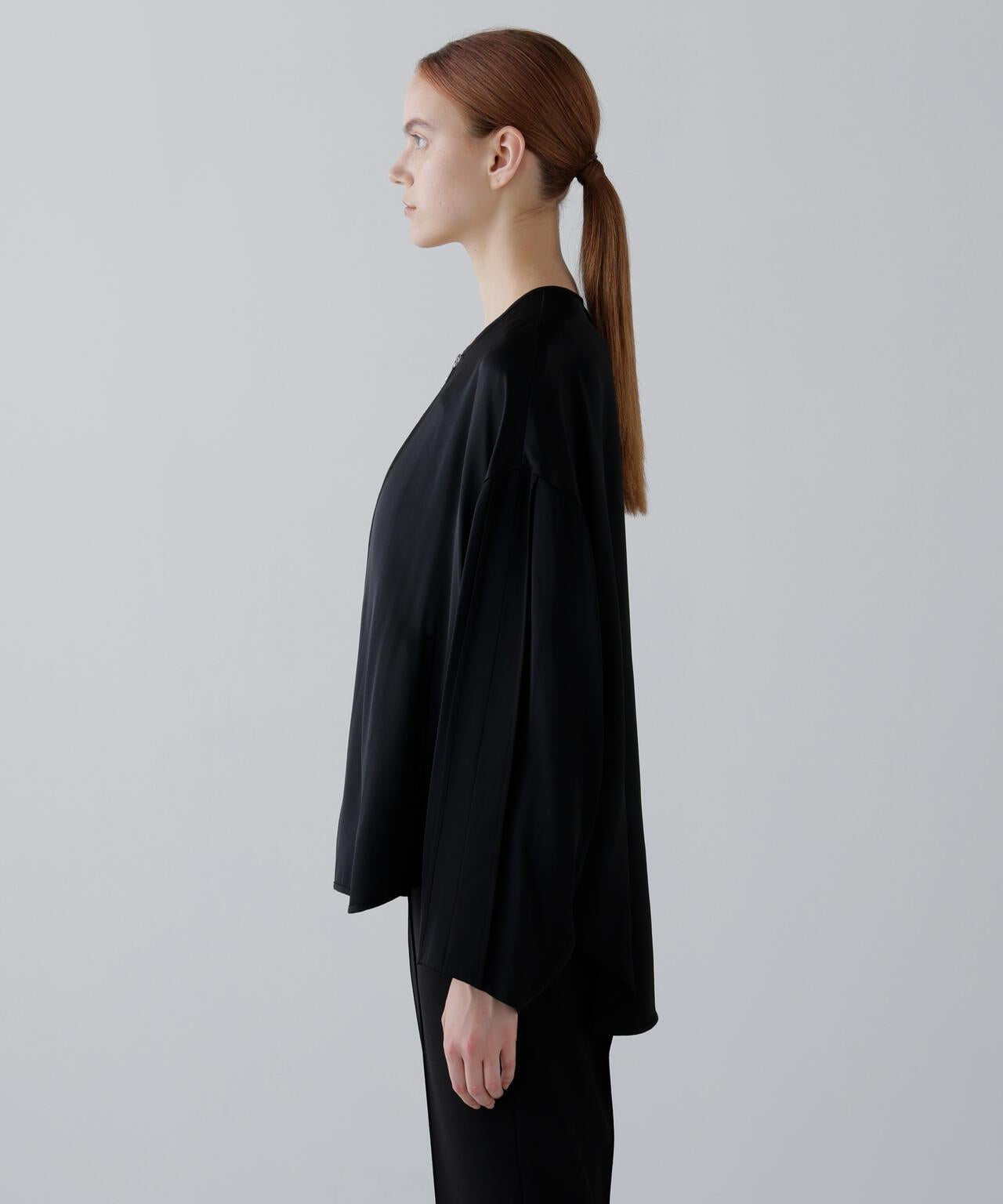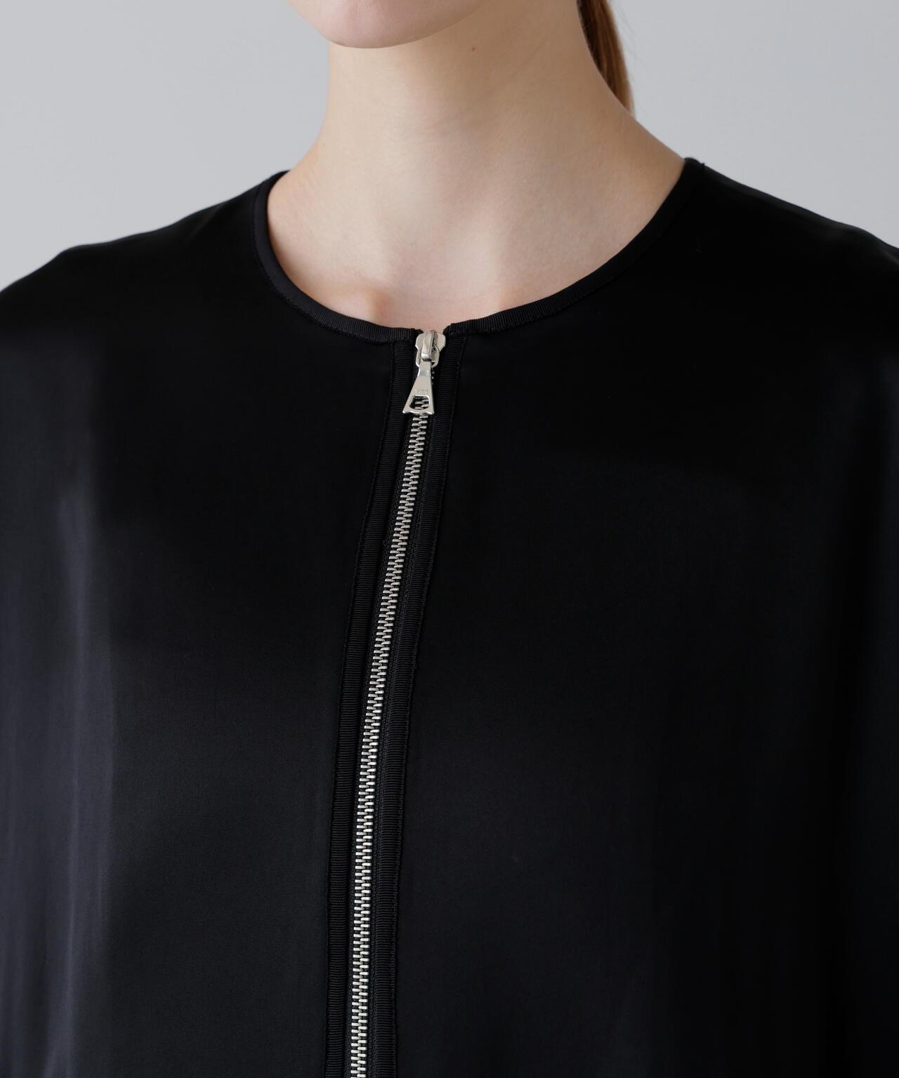 閃耀奢華光澤的緞面拉鍊夾克這款無領拉鍊夾克採用適度緊繃的緞面面料製成。略微寬鬆的剪裁,下襬呈圓形。前襟有開放式金屬扣。採用具有光澤的醋酸纖維和人造絲長絲紗線織成,質地緻密,採用懸垂性極佳的雙層緞面面料剪裁而成。