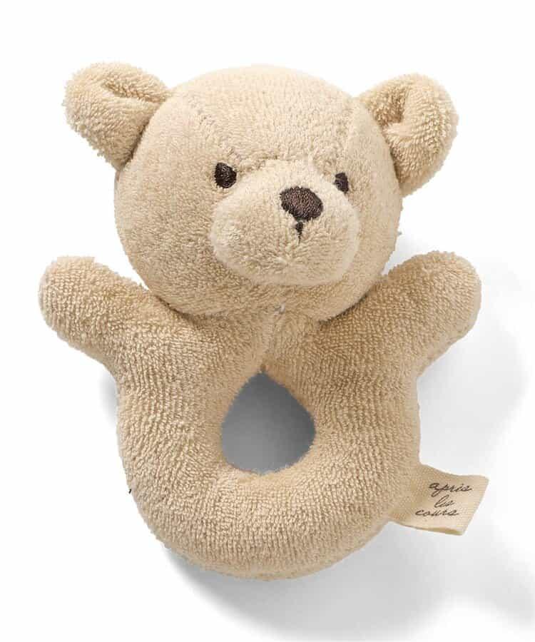 這款實用的禮品套裝包括一個小熊圖案的撥浪鼓和嬰兒襪。
