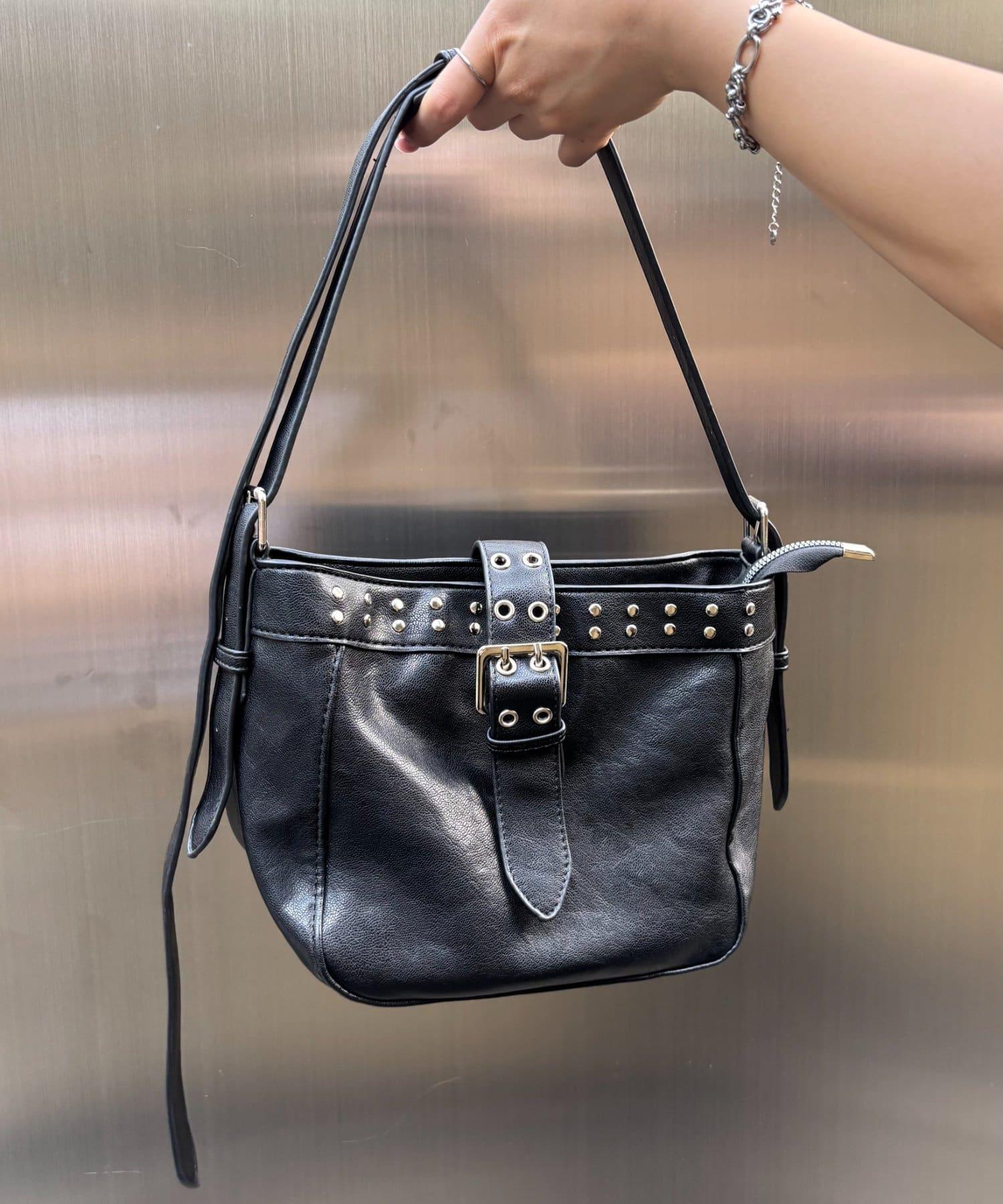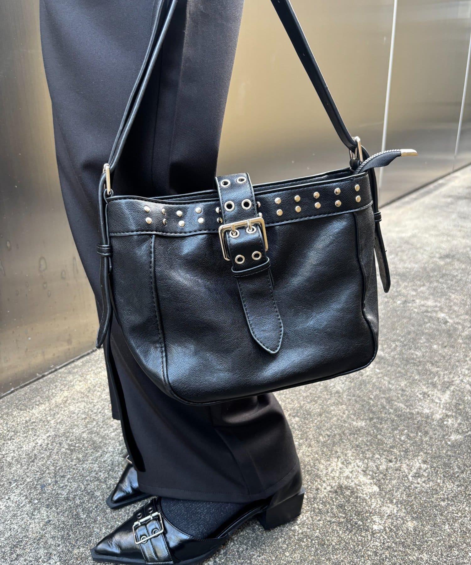 這款單肩包採用獨特的鴿子孔和腰帶設計。