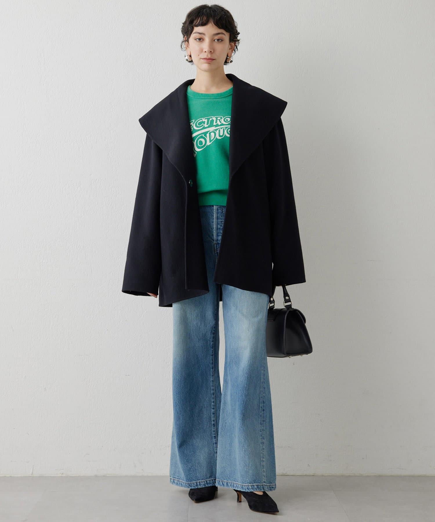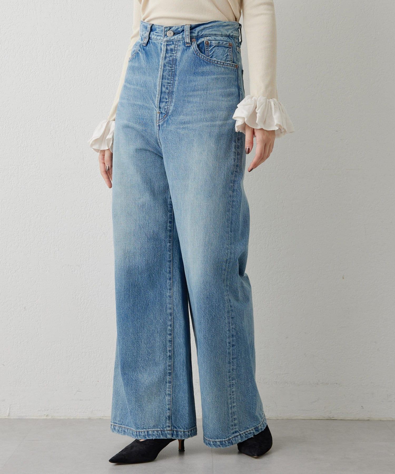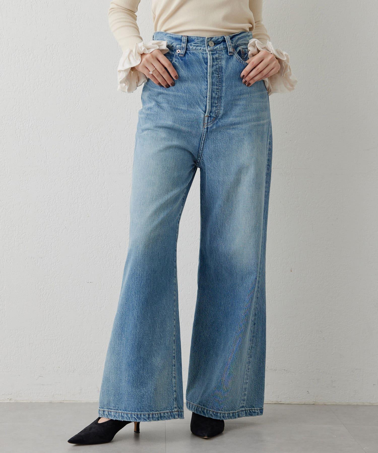 具有復古風格的寬喇叭牛仔長褲。