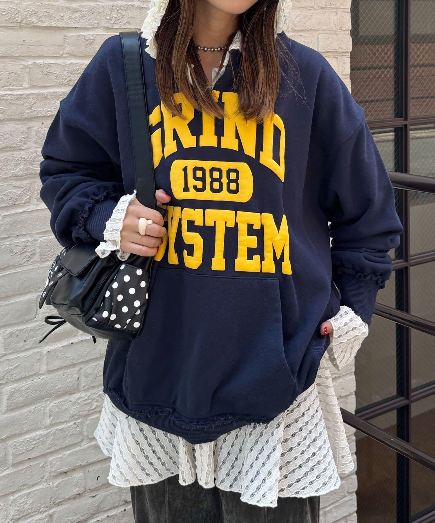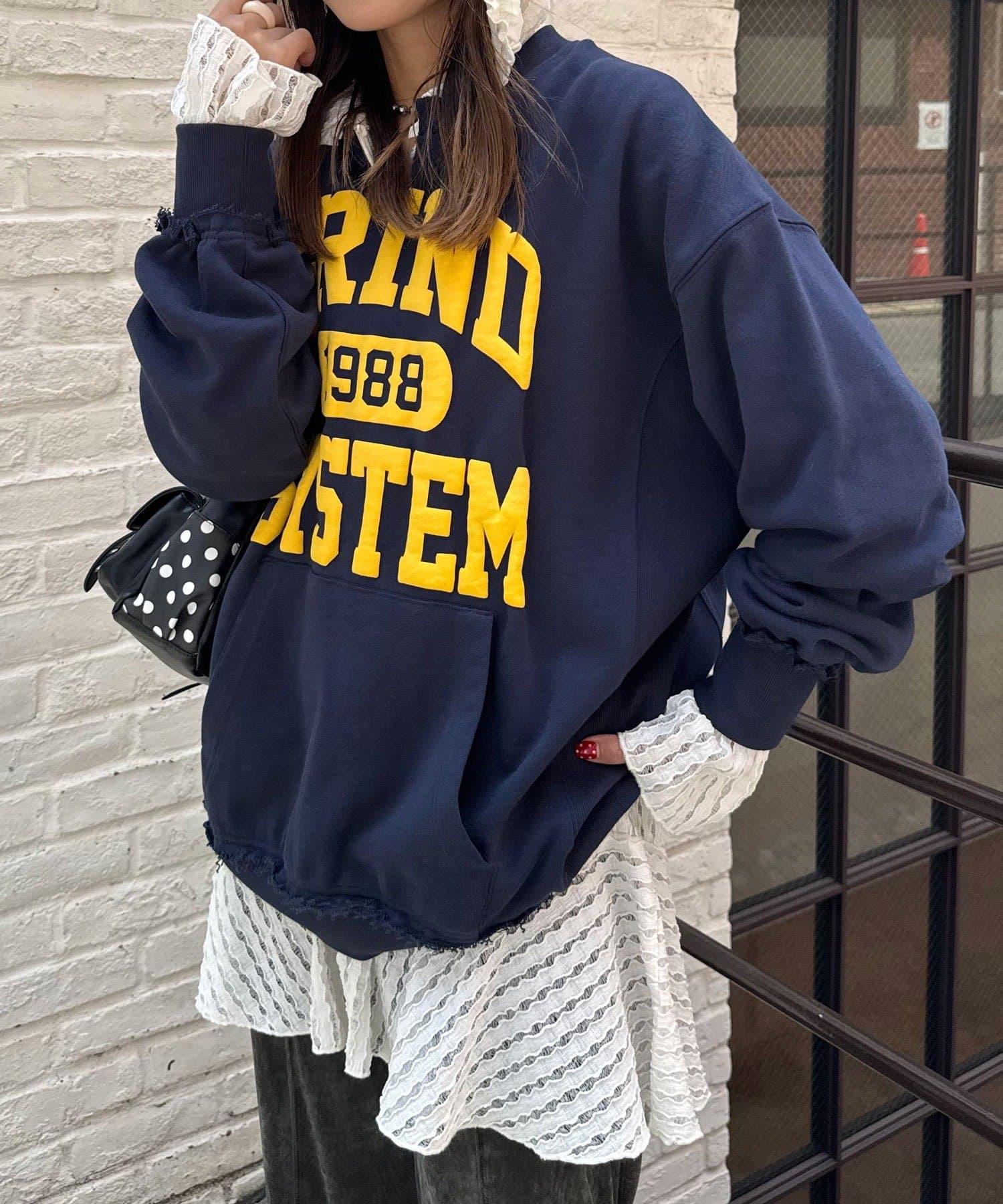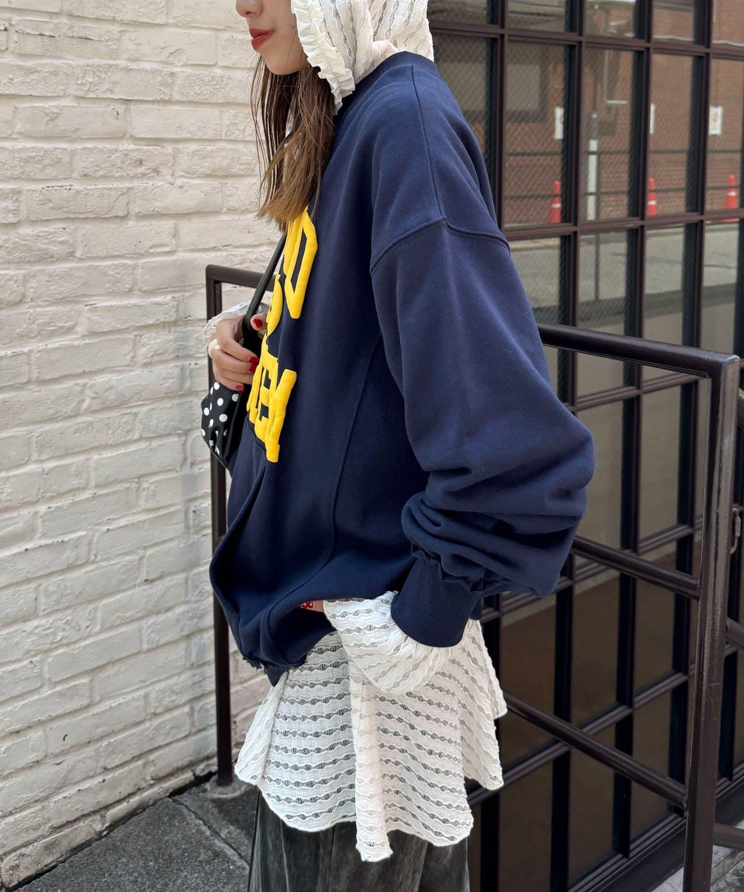 學院風徽標衛衣,廓形寬大,可寬鬆穿著,採用船長設計,增添休閒感。