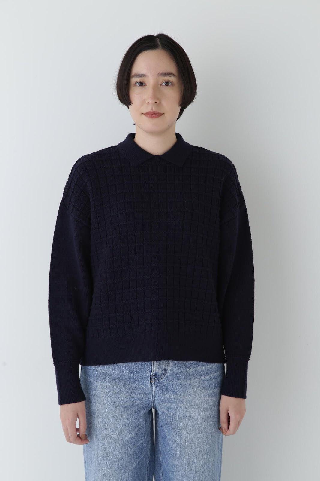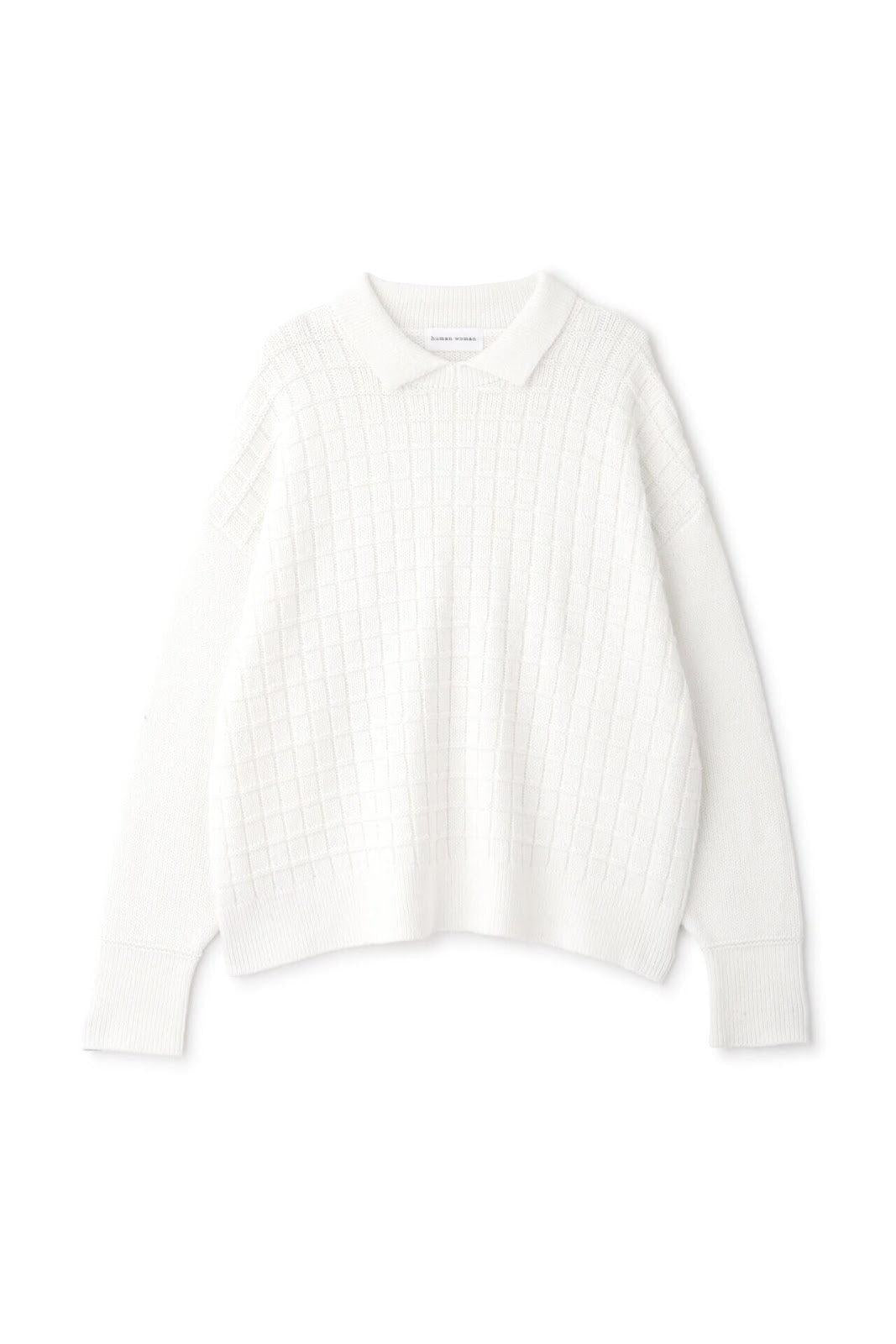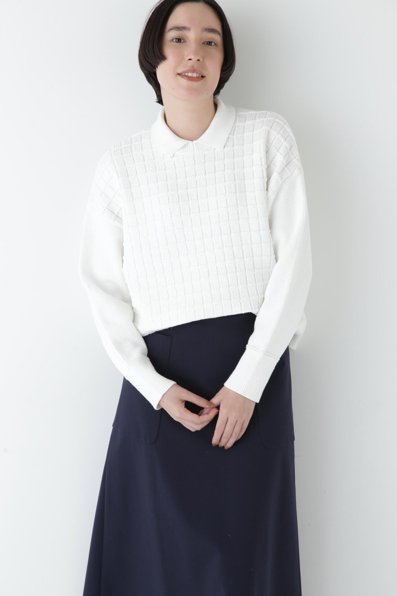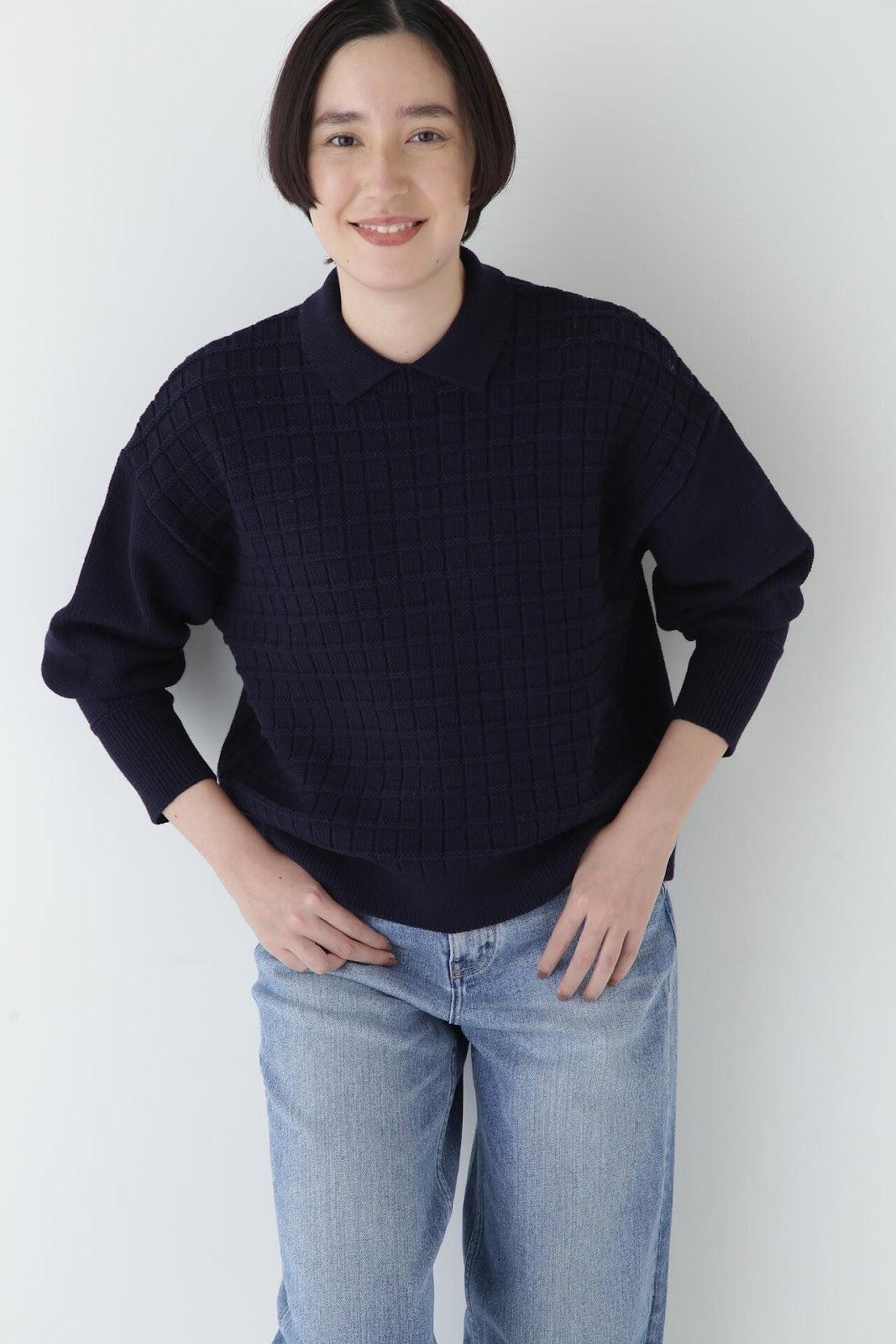 單穿也很好看的 Polo 領針織套頭衫 [設計特色] 這是一款中規中矩的傳統感套頭衫,衣領上的棋盤格圖案與紐扣相呼應。袖子和後背採用針織面料,將正面的圖案發揮得淋漓盡致。衣領上的廓形設計成為今年的典型款式。厚重的棉腈綸面料的特點是輕盈柔軟,與肉感截然相反。面料採用輕柔的磨毛處理,具有保暖性。色彩設計給人以春天的感覺。建議搭配:針織衫是全場的主角,建議搭配簡單的寬褲或長裙。