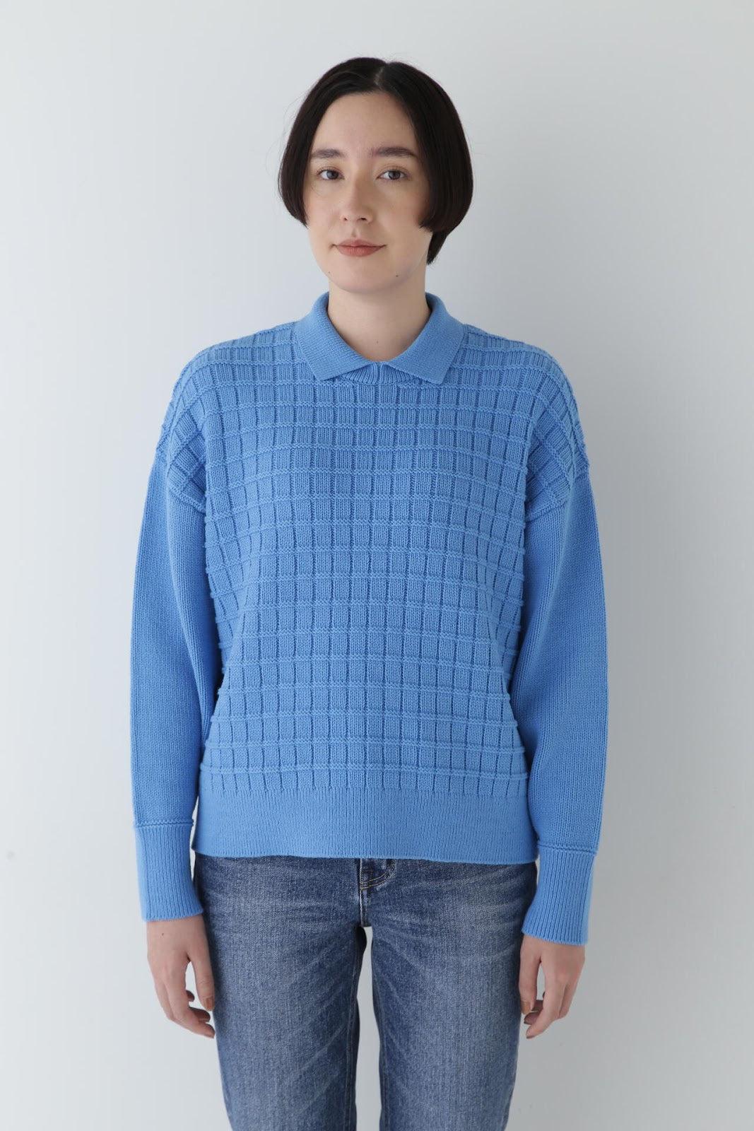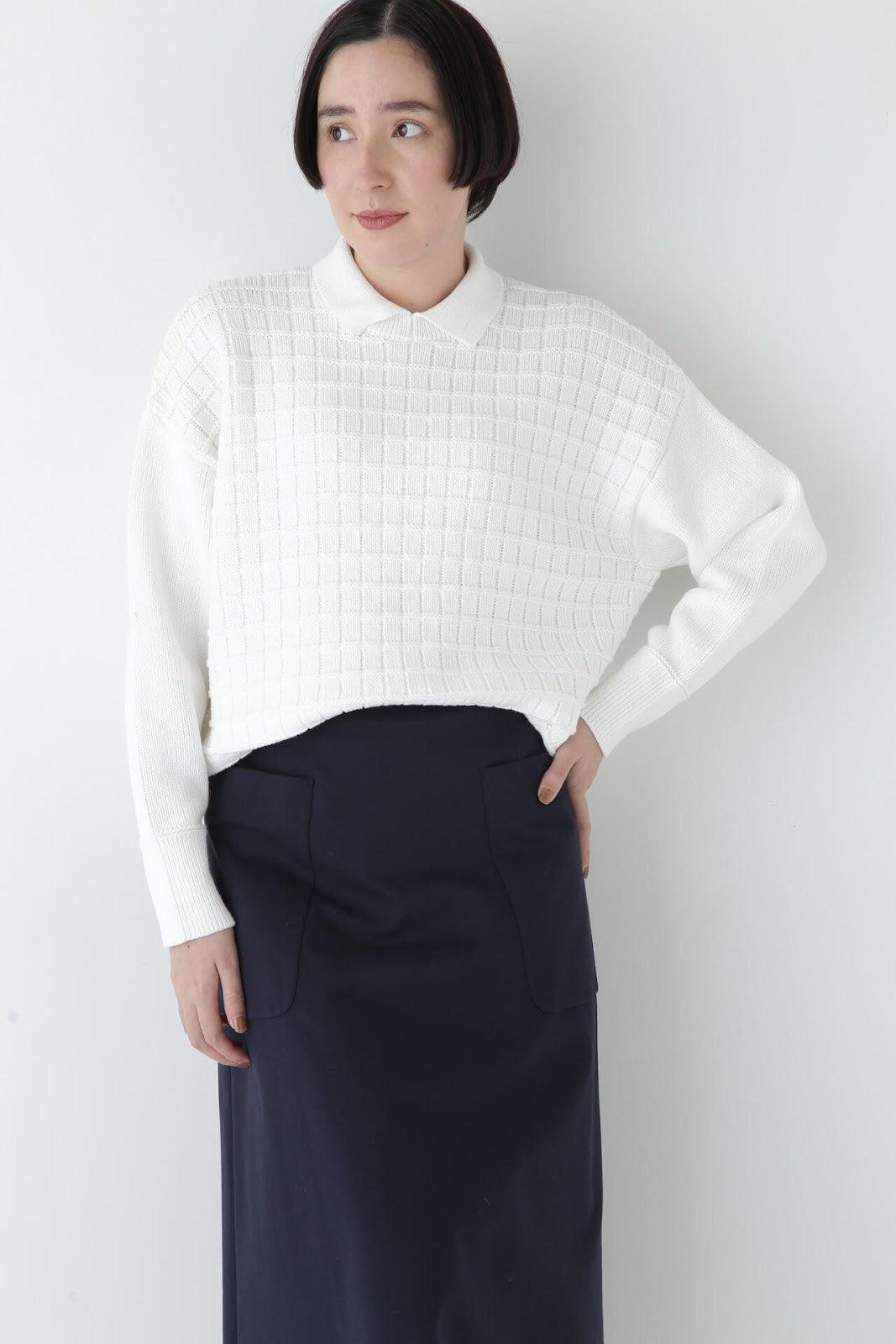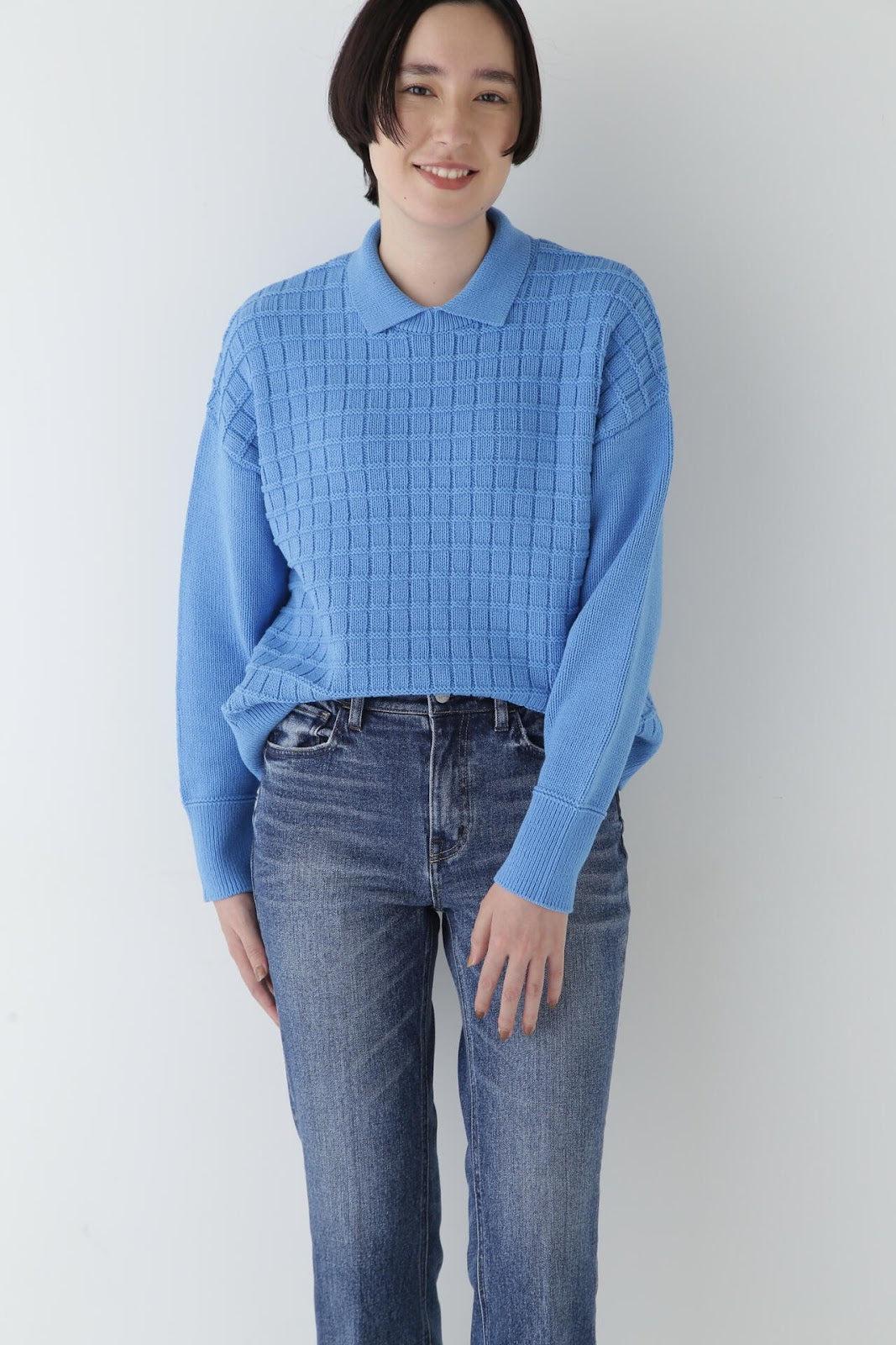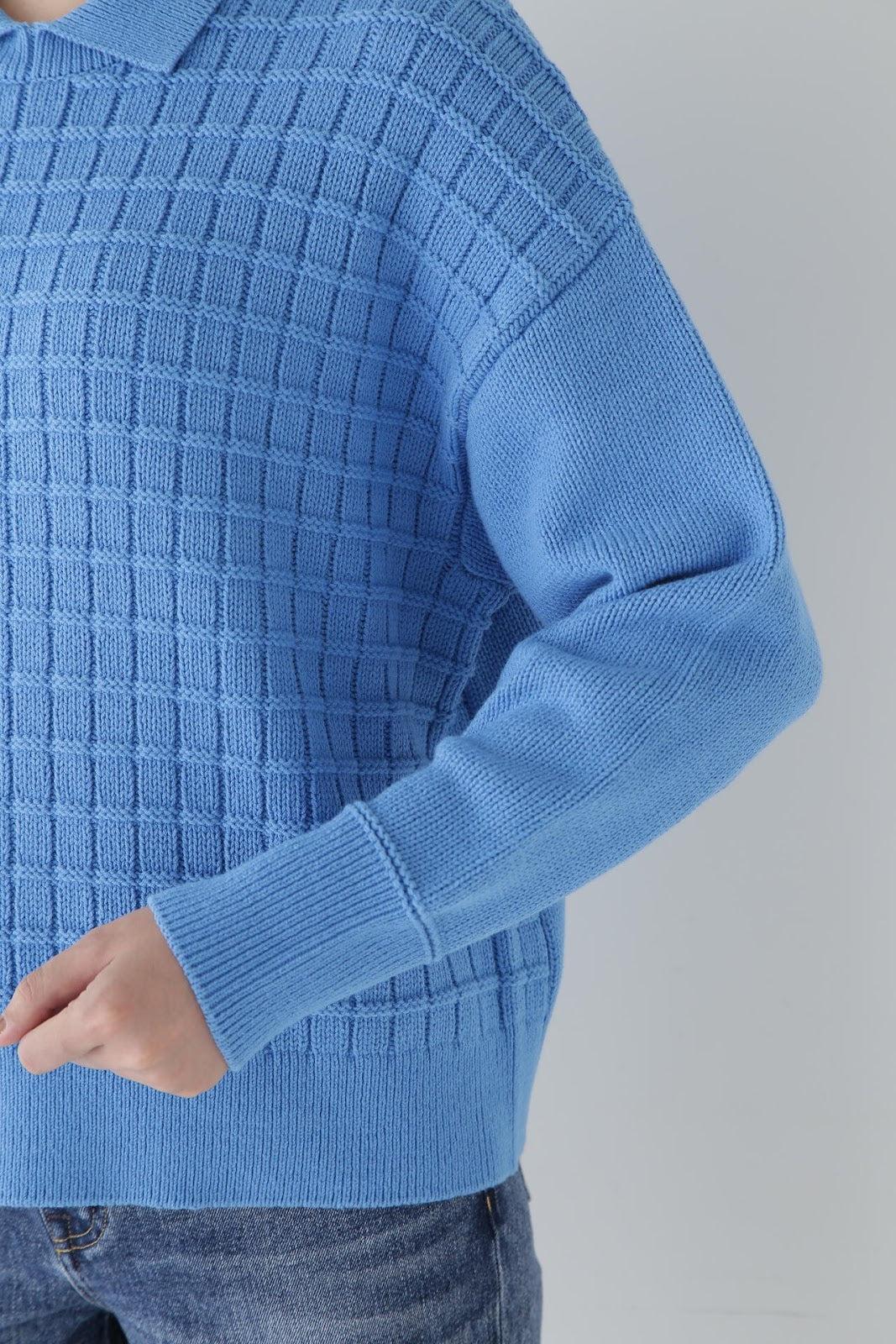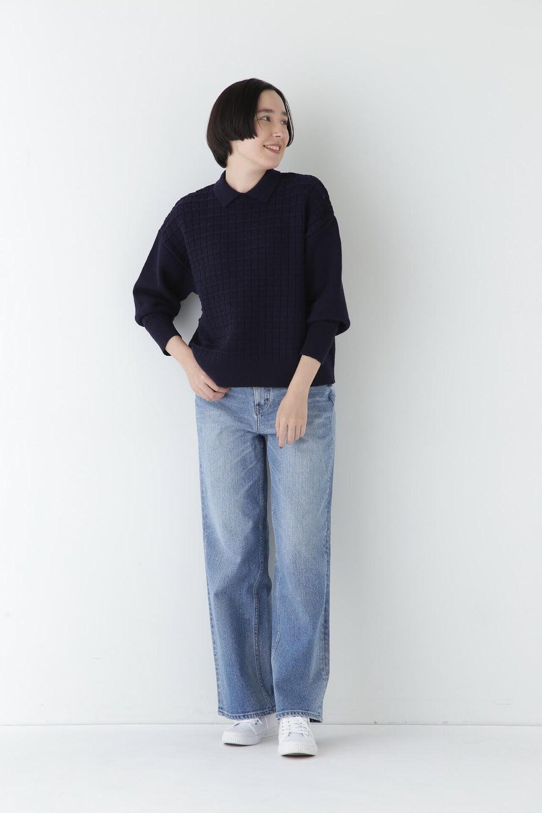 單穿也很好看的 Polo 領針織套頭衫 [設計特色] 這是一款中規中矩的傳統感套頭衫,衣領上的棋盤格圖案與紐扣相呼應。袖子和後背採用針織面料,將正面的圖案發揮得淋漓盡致。衣領上的廓形設計成為今年的典型款式。厚重的棉腈綸面料的特點是輕盈柔軟,與肉感截然相反。面料採用輕柔的磨毛處理,具有保暖性。色彩設計給人以春天的感覺。建議搭配:針織衫是全場的主角,建議搭配簡單的寬褲或長裙。