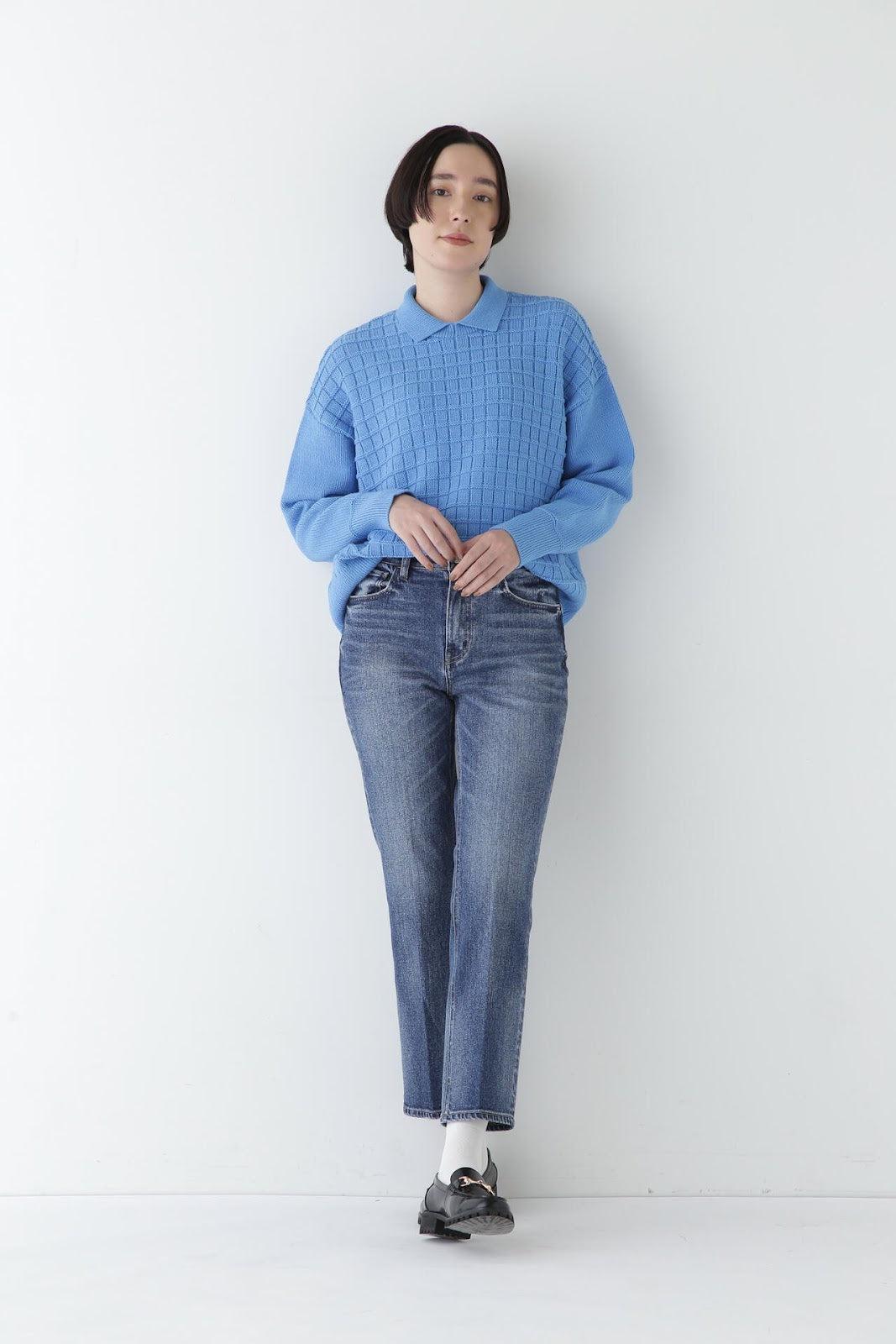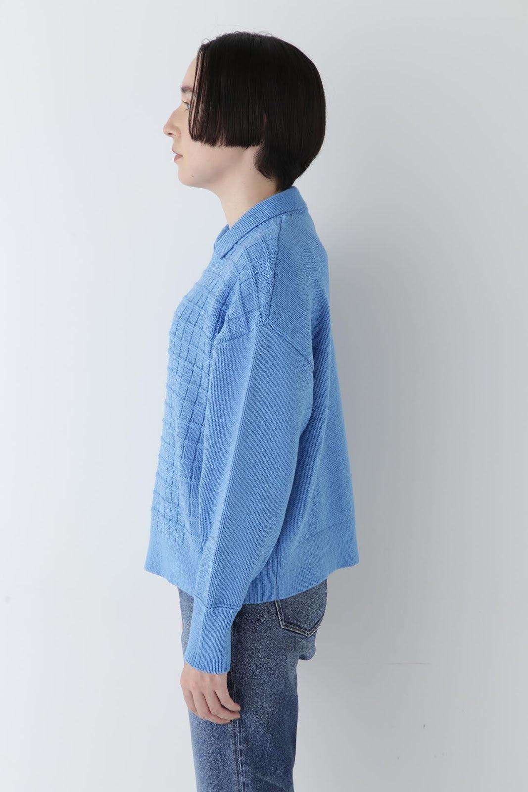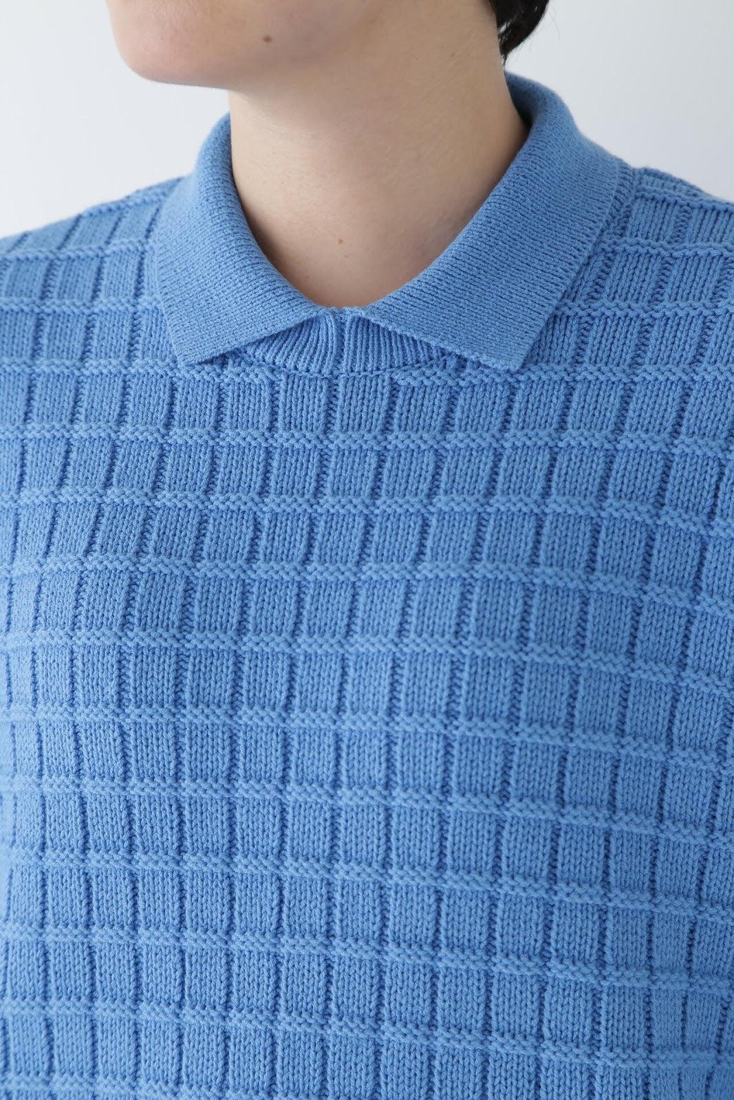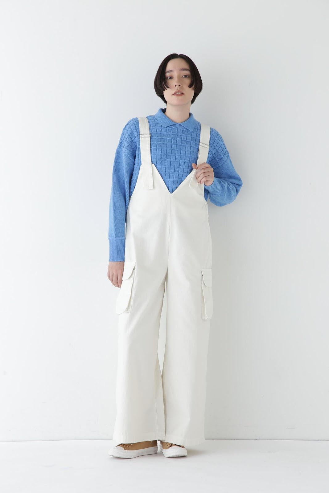 單穿也很好看的 Polo 領針織套頭衫 [設計特色] 這是一款中規中矩的傳統感套頭衫,衣領上的棋盤格圖案與紐扣相呼應。袖子和後背採用針織面料,將正面的圖案發揮得淋漓盡致。衣領上的廓形設計成為今年的典型款式。厚重的棉腈綸面料的特點是輕盈柔軟,與肉感截然相反。面料採用輕柔的磨毛處理,具有保暖性。色彩設計給人以春天的感覺。建議搭配:針織衫是全場的主角,建議搭配簡單的寬褲或長裙。