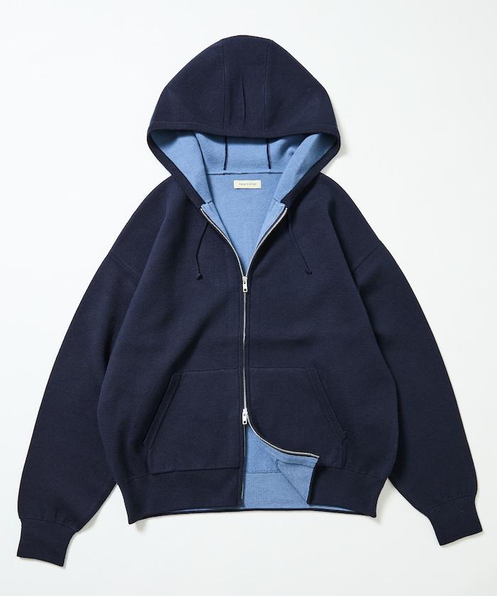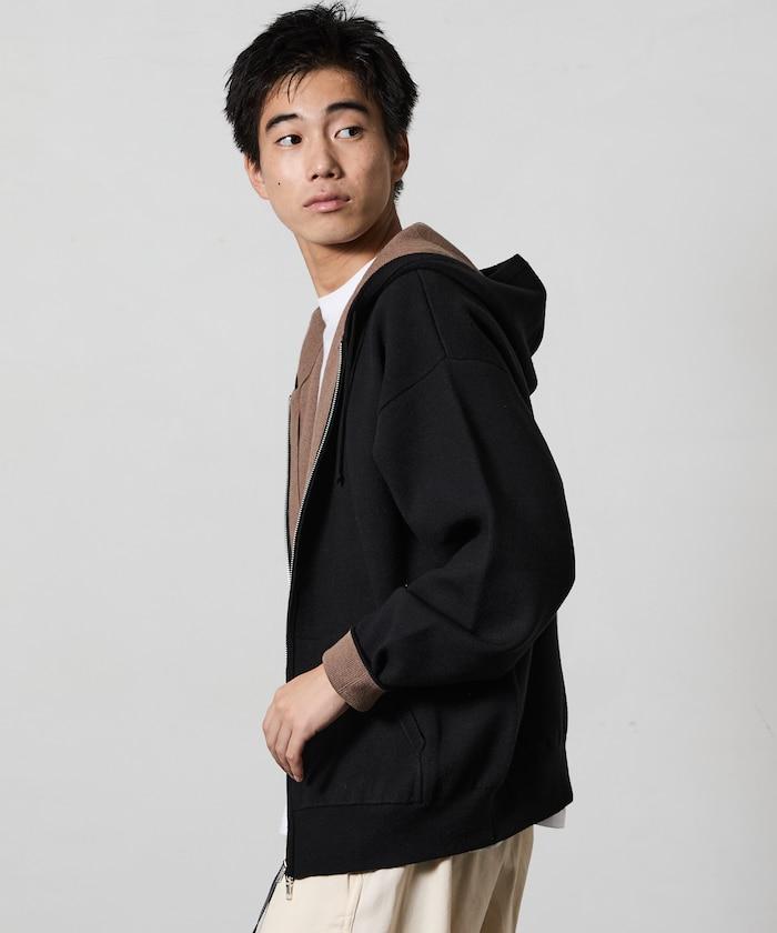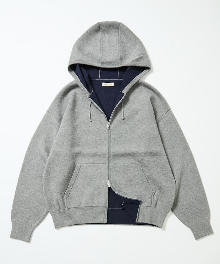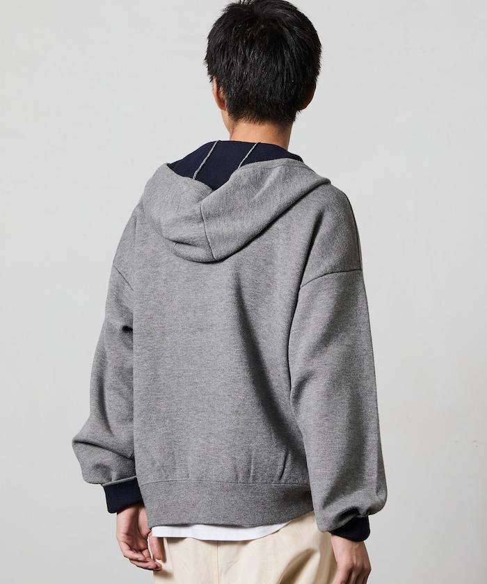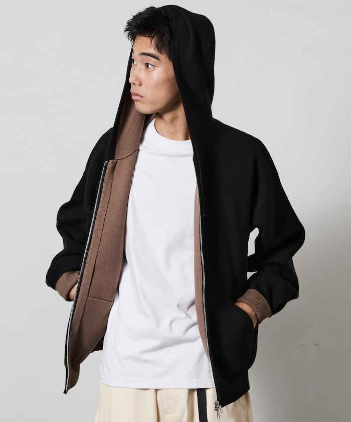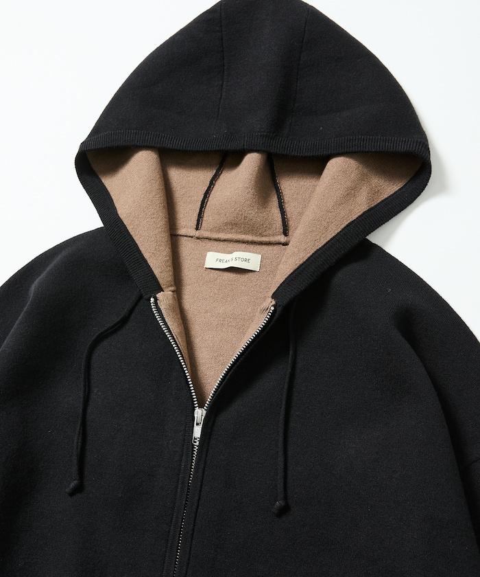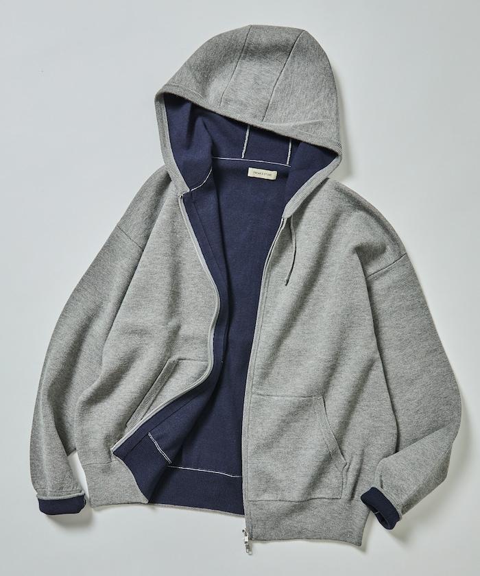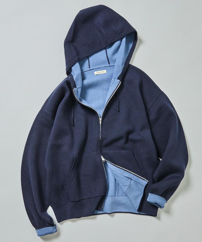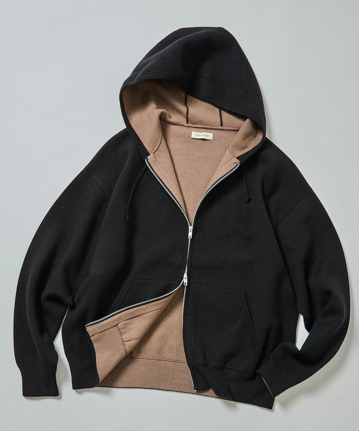 這款針織連帽衫的正反面採用層壓工藝,具有獨特的配色和質感。