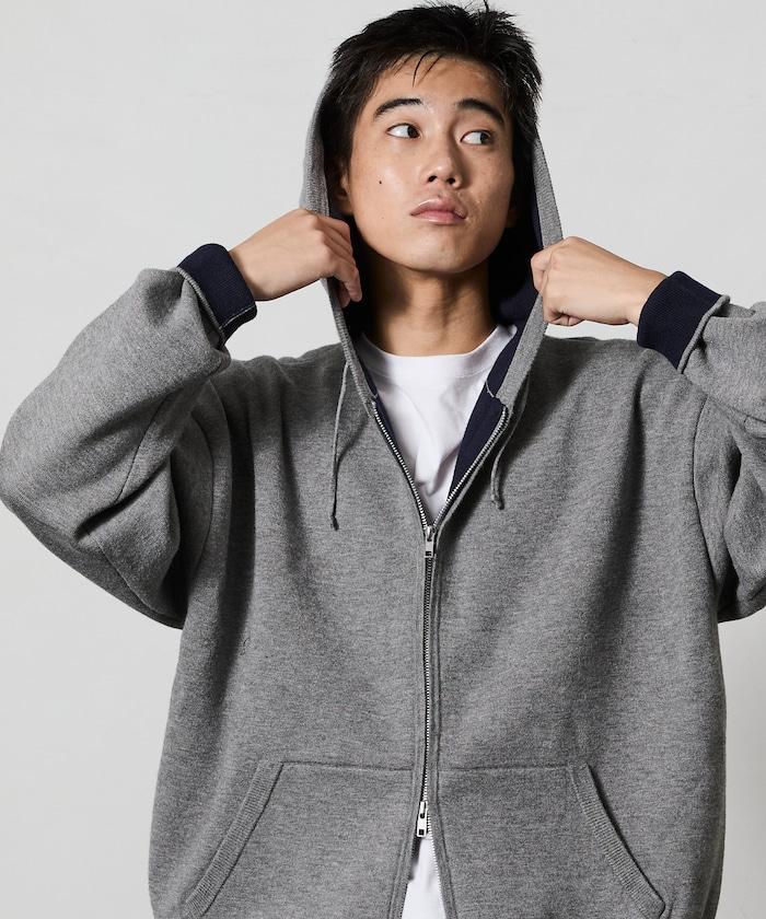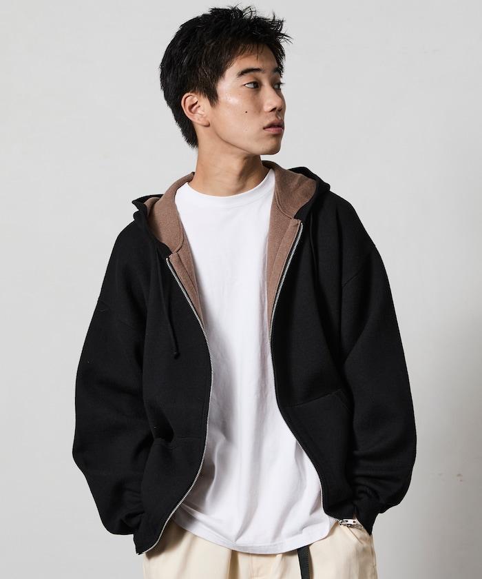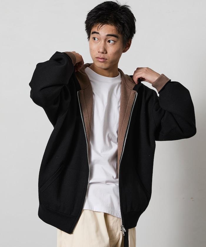 這款針織連帽衫的正反面粘合在一起,形成了引人注目的色彩搭配。