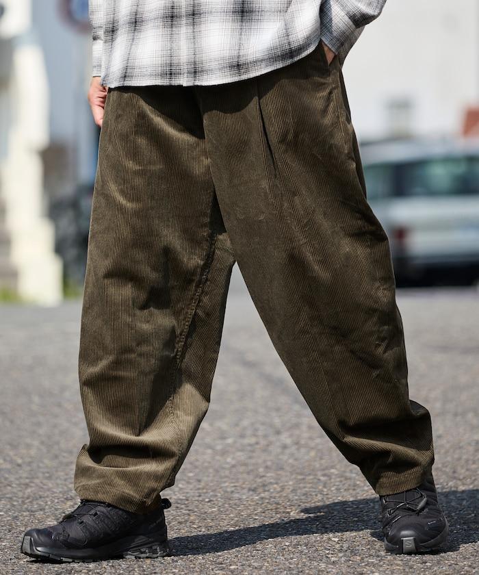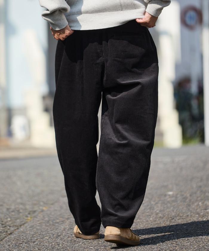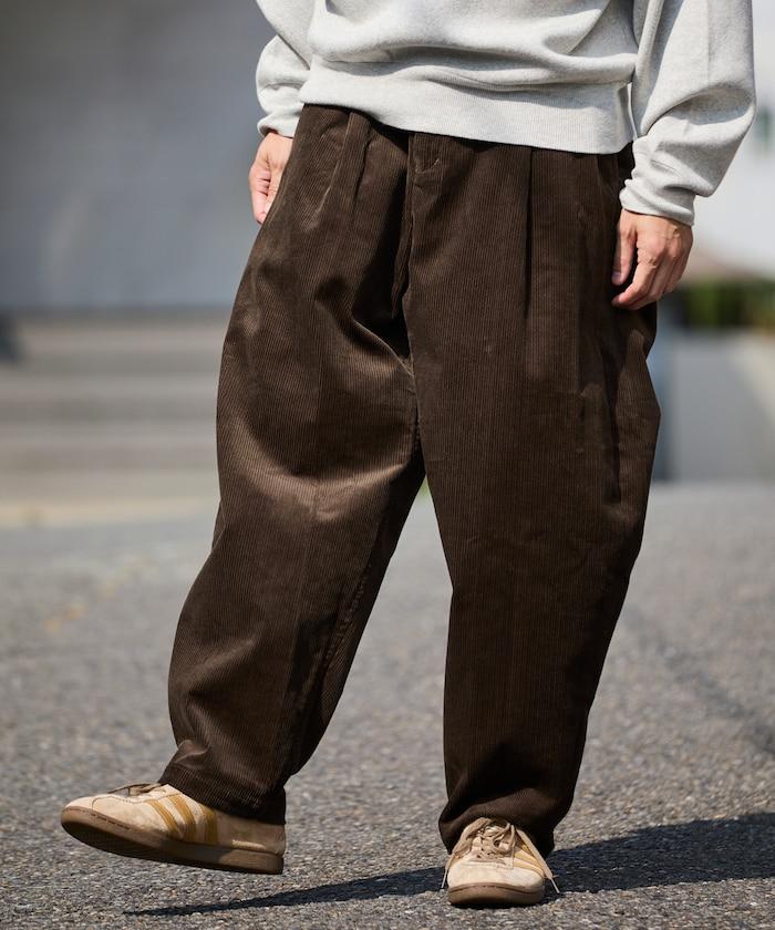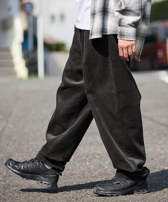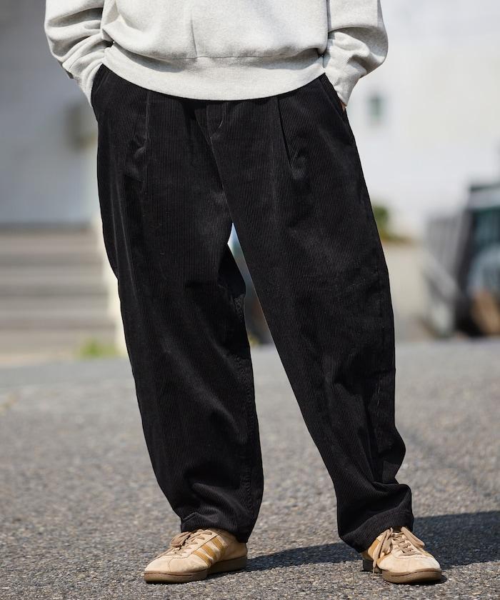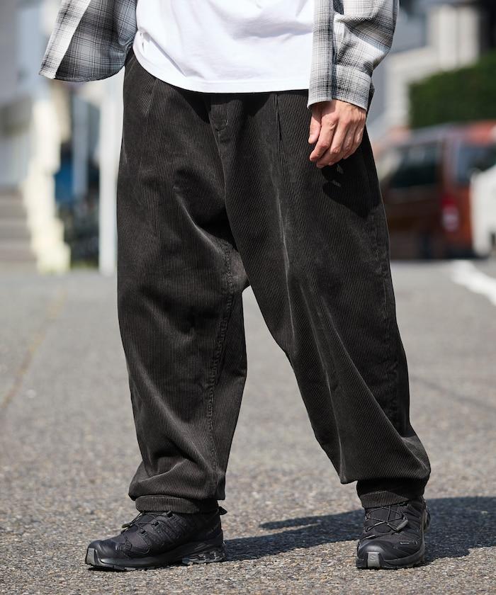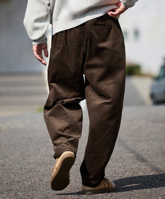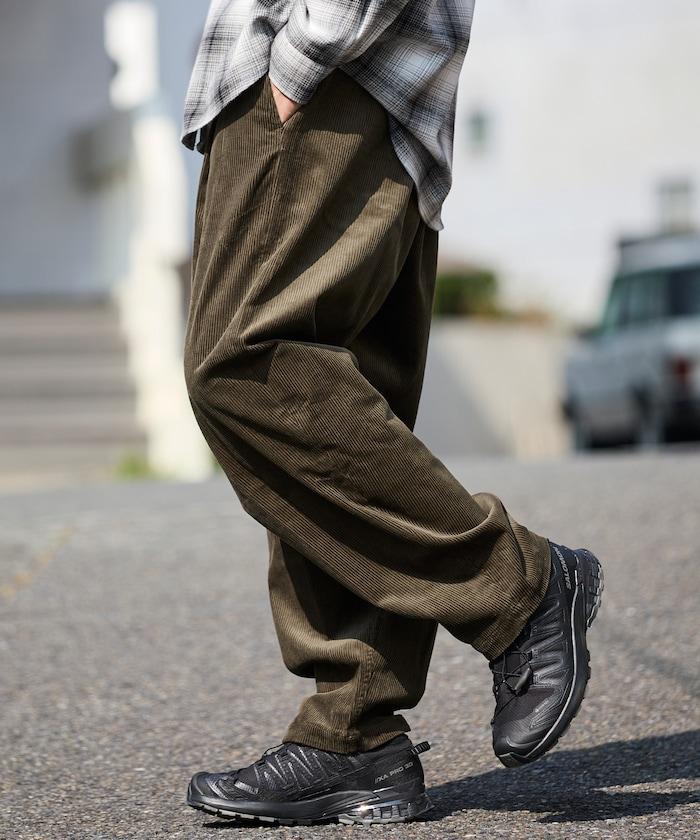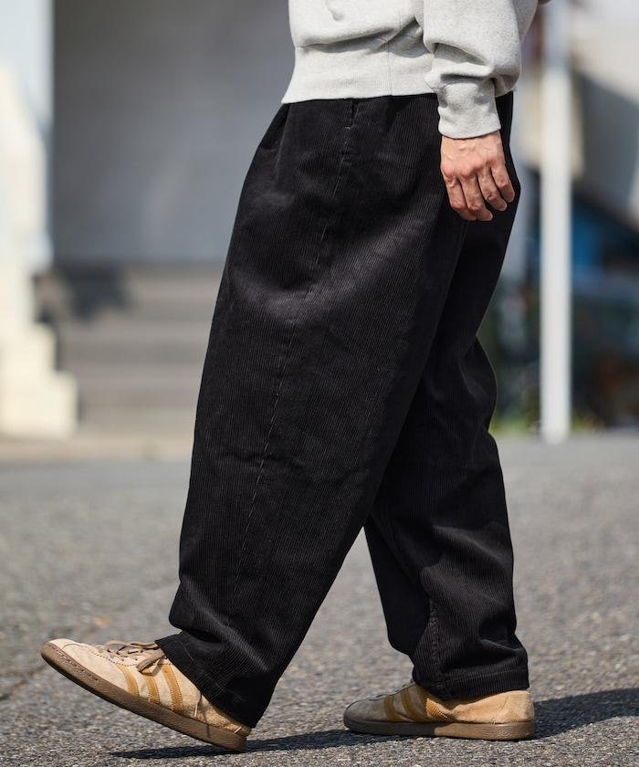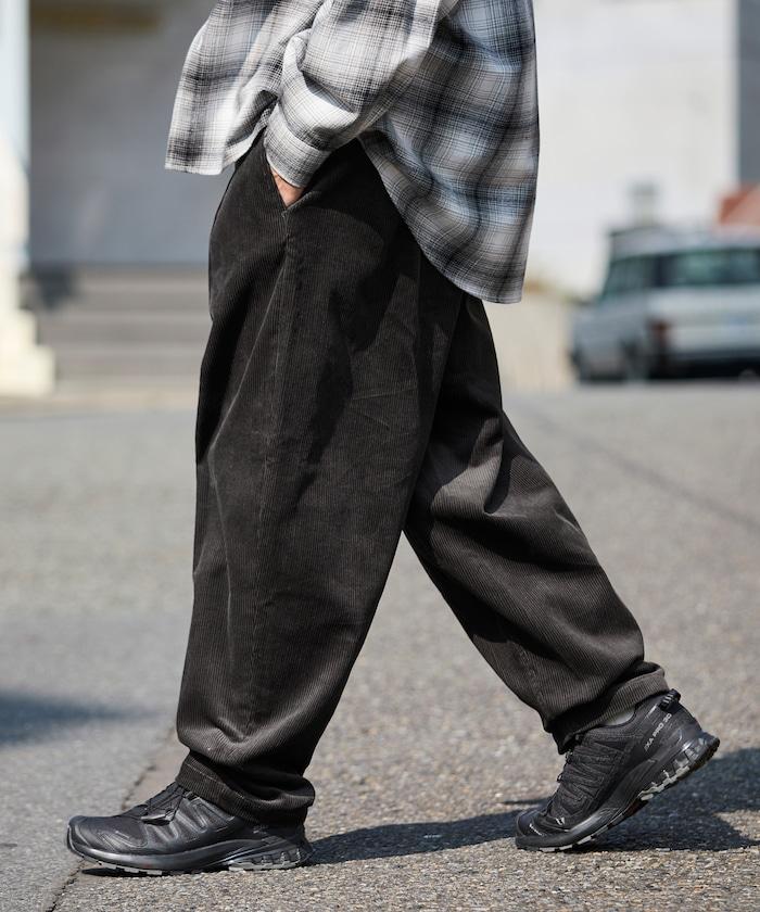 寬大的廓形加上下襬逐漸變細的設計,使這款褲子具有突出的存在感。
