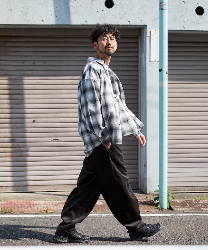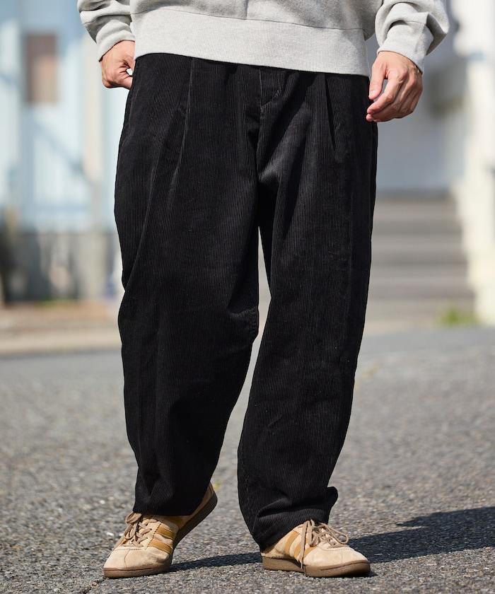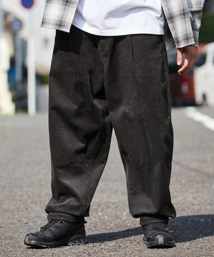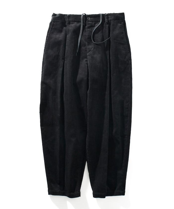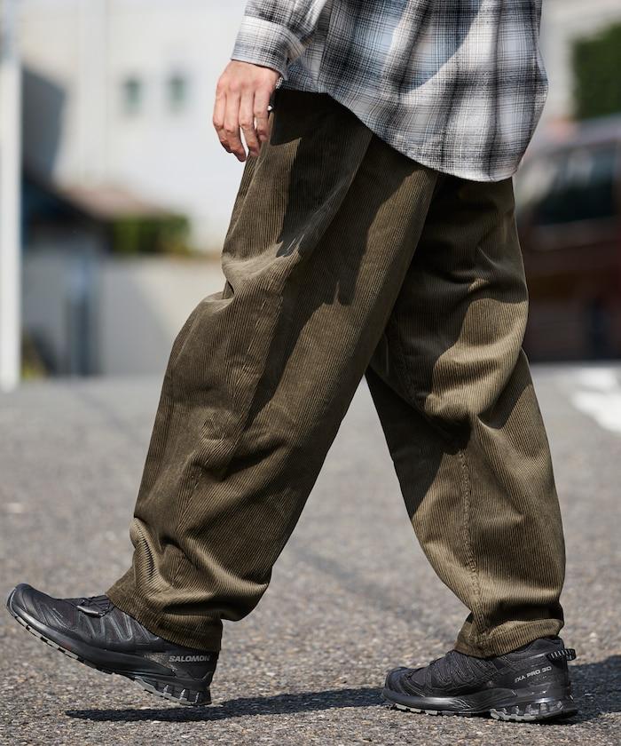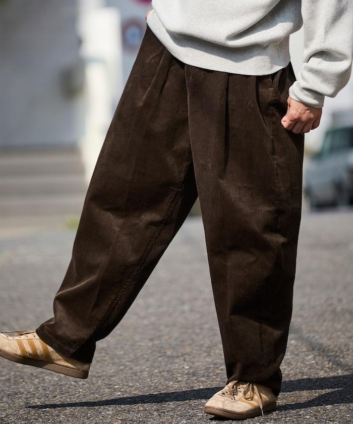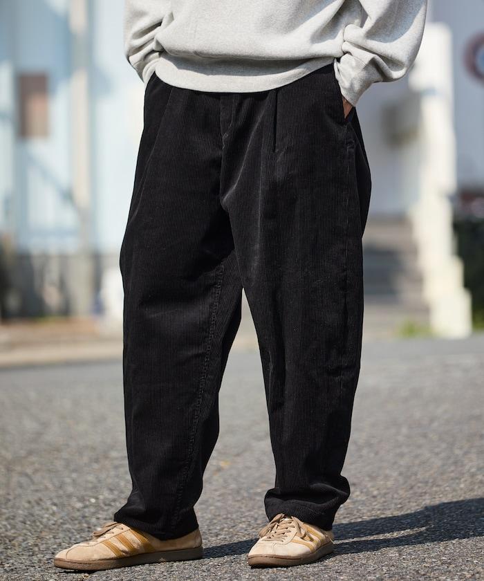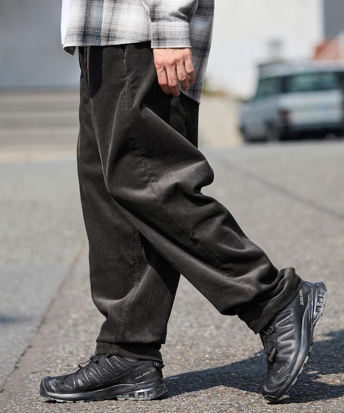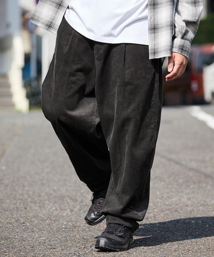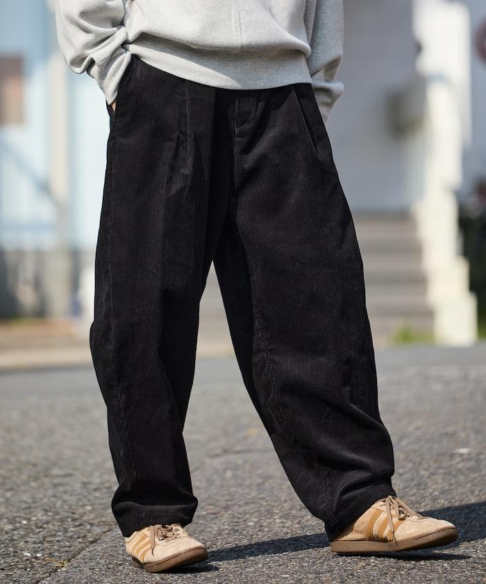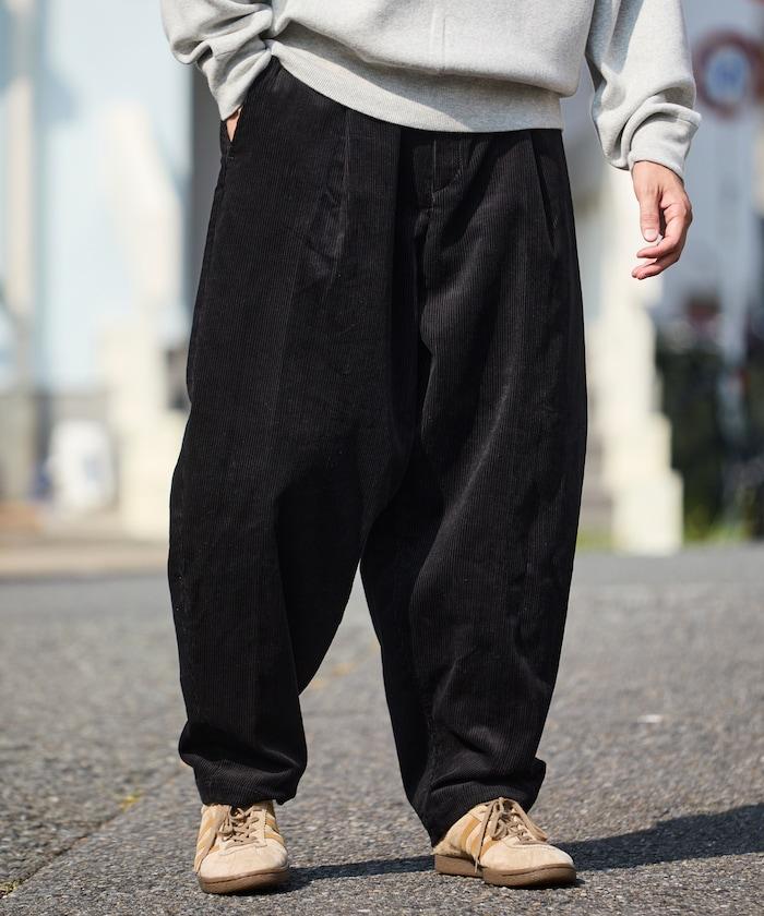 寬大的廓形加上下襬逐漸變細的設計,使這款褲子具有突出的存在感。
