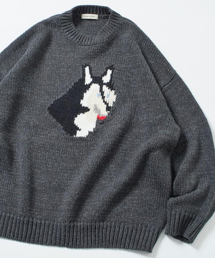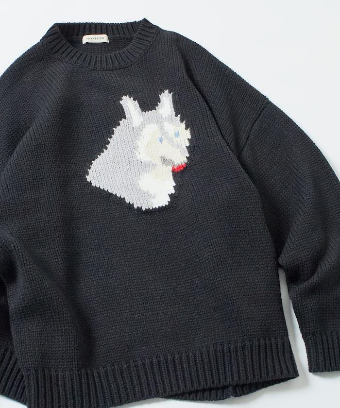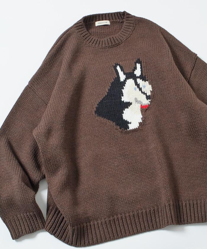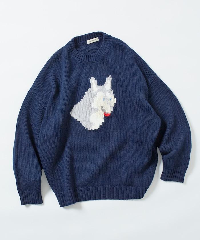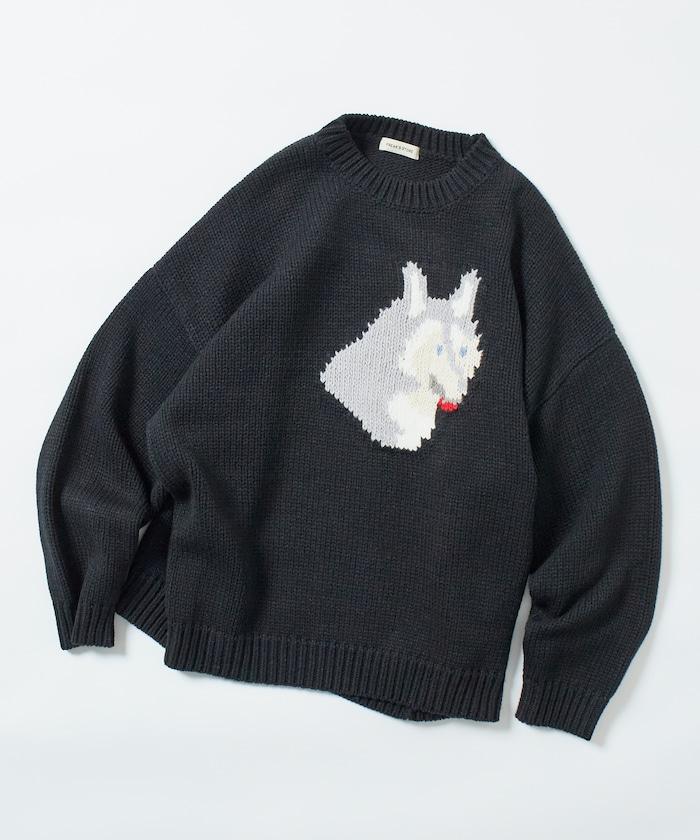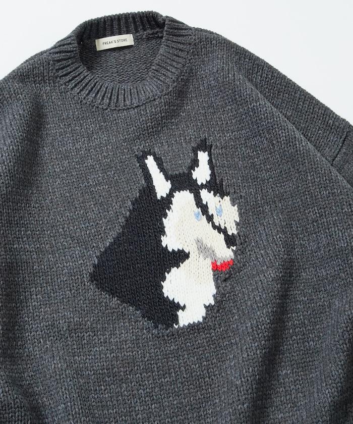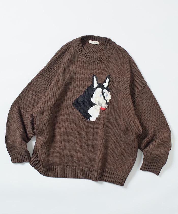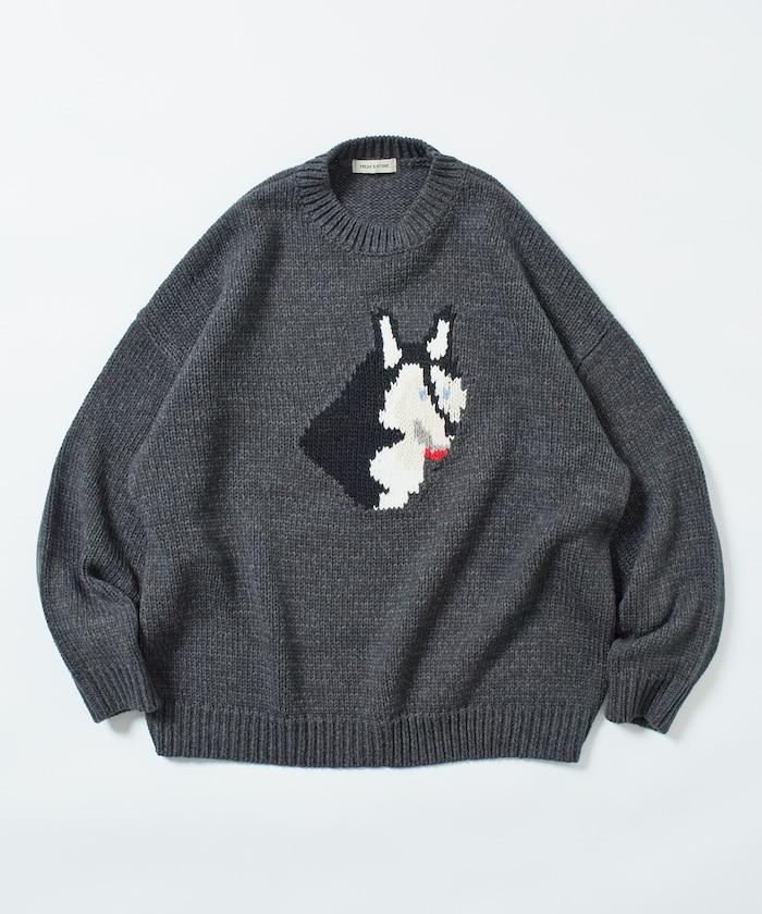 寬鬆版型 狗狗圖案 粗針織 提花 圓領毛衣 / 哈士奇