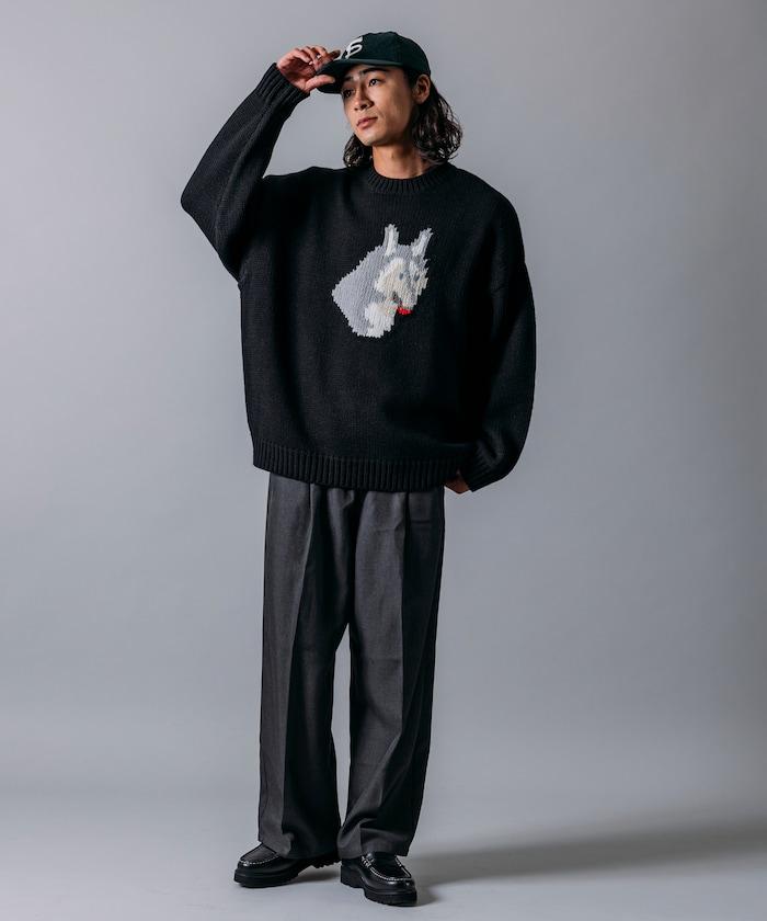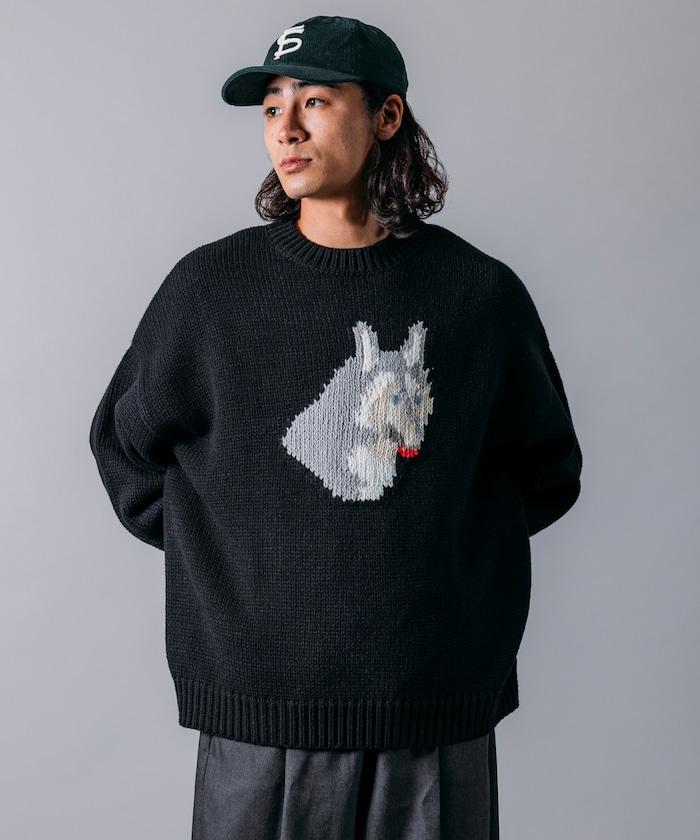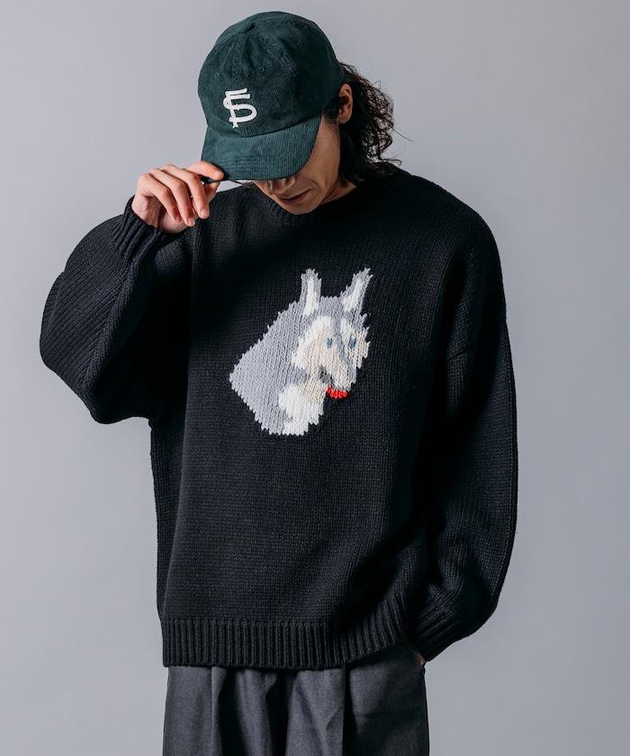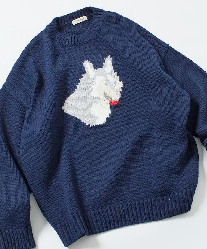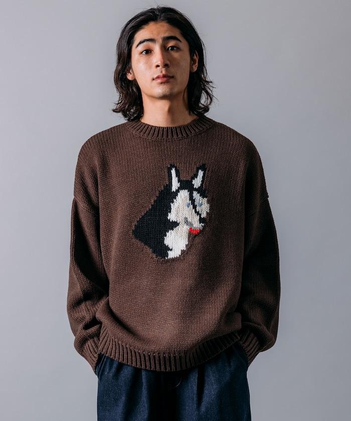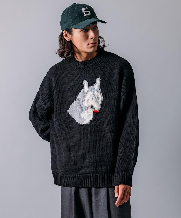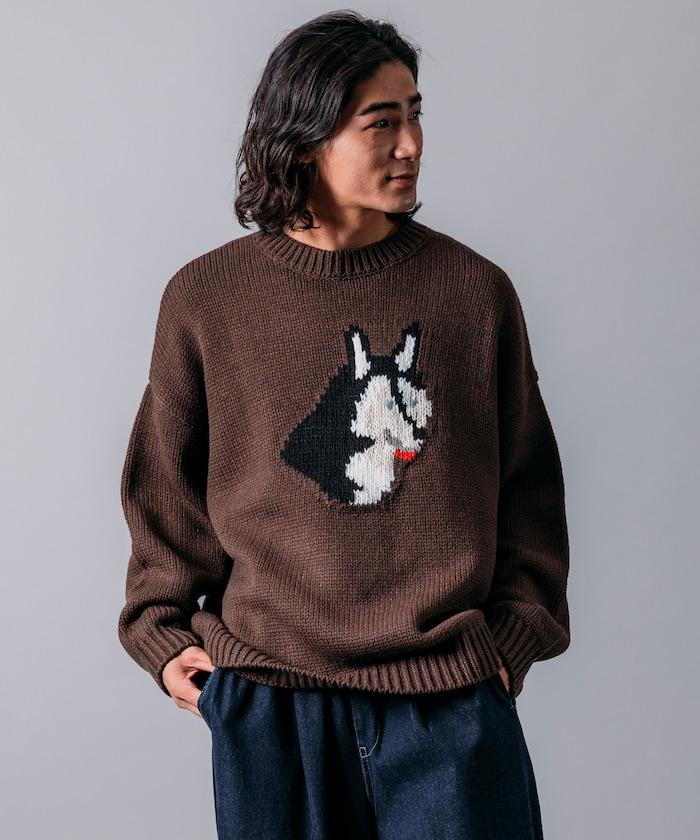 寬鬆版型 狗狗圖案 粗針織 提花 圓領毛衣 / 哈士奇