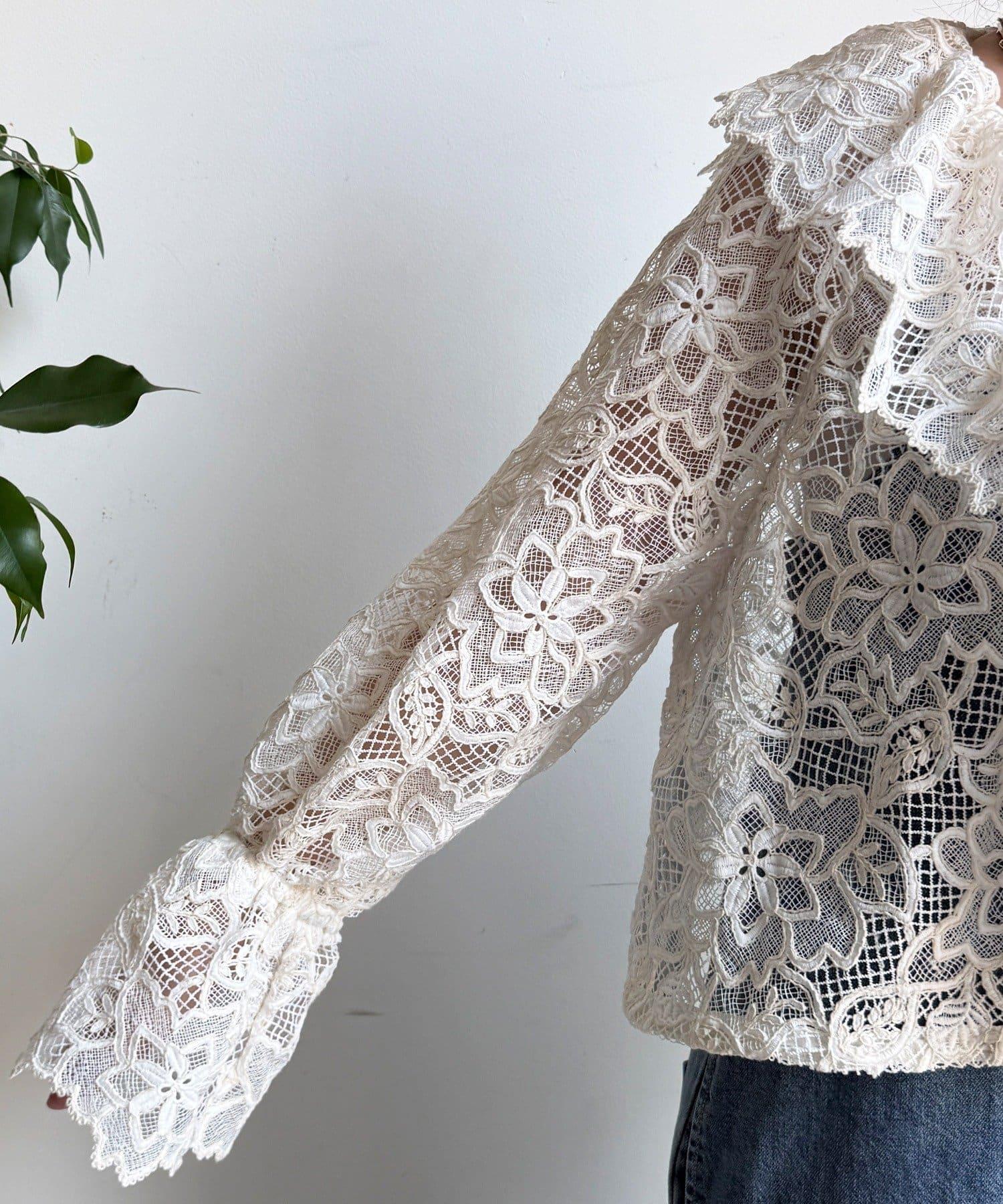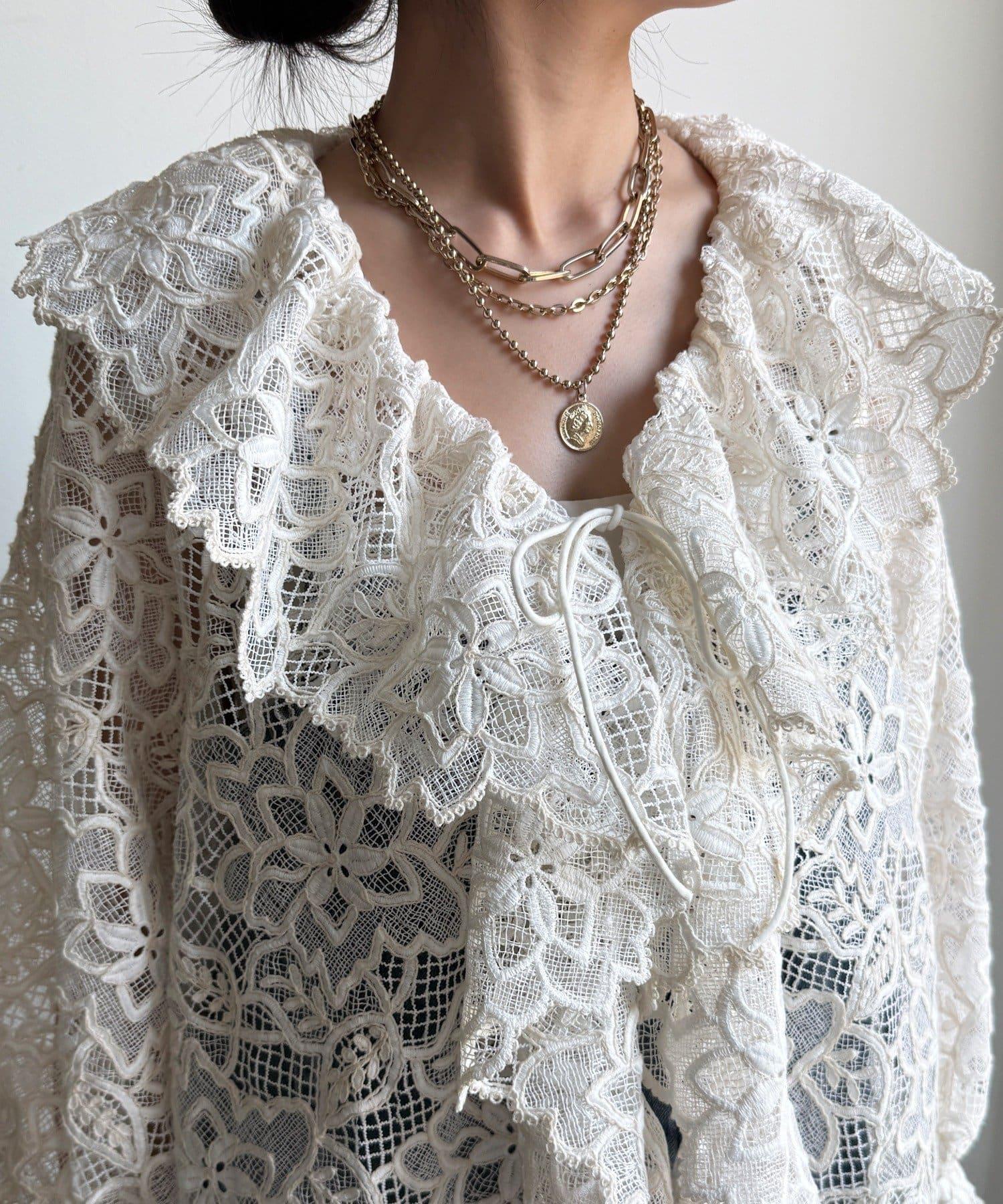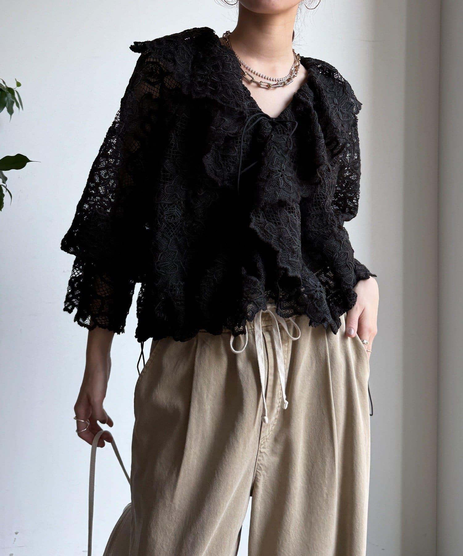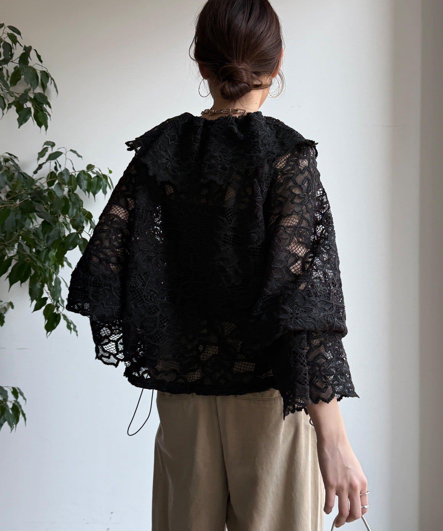 領口處有大褶邊的蕾絲長衫和糖果袖。
