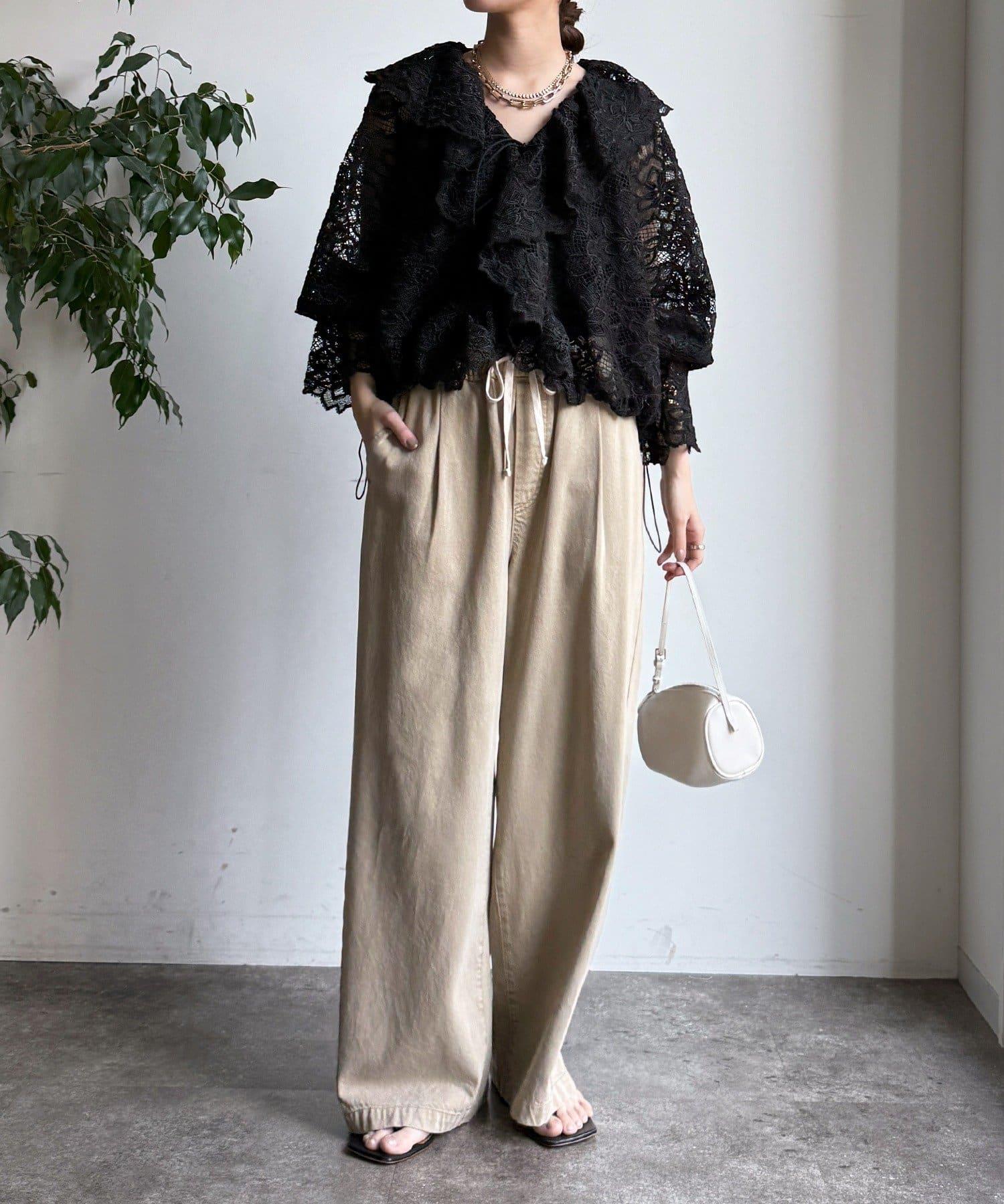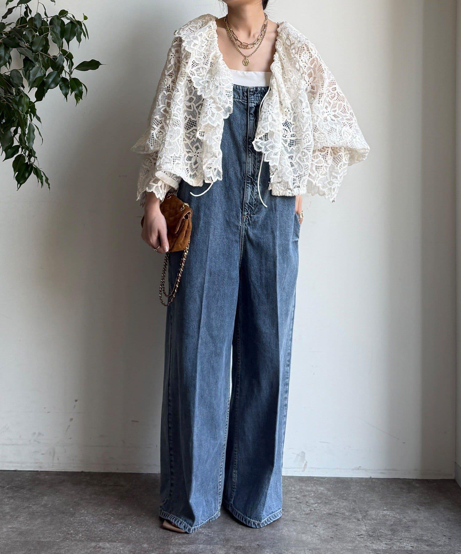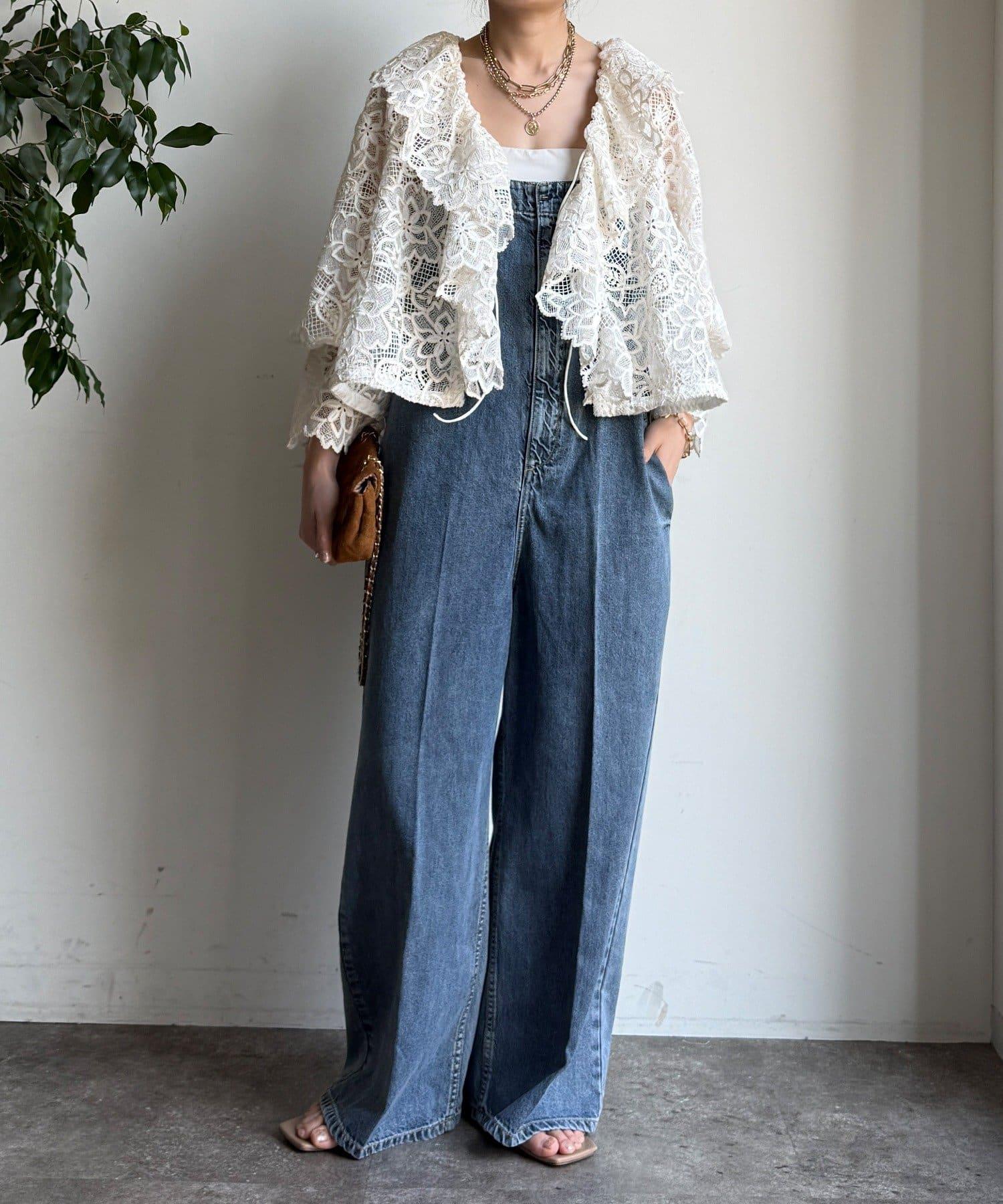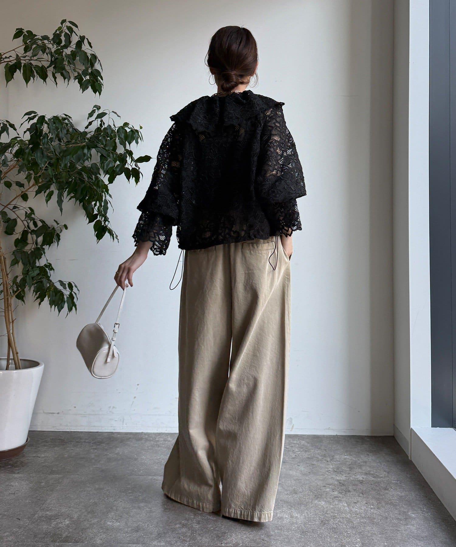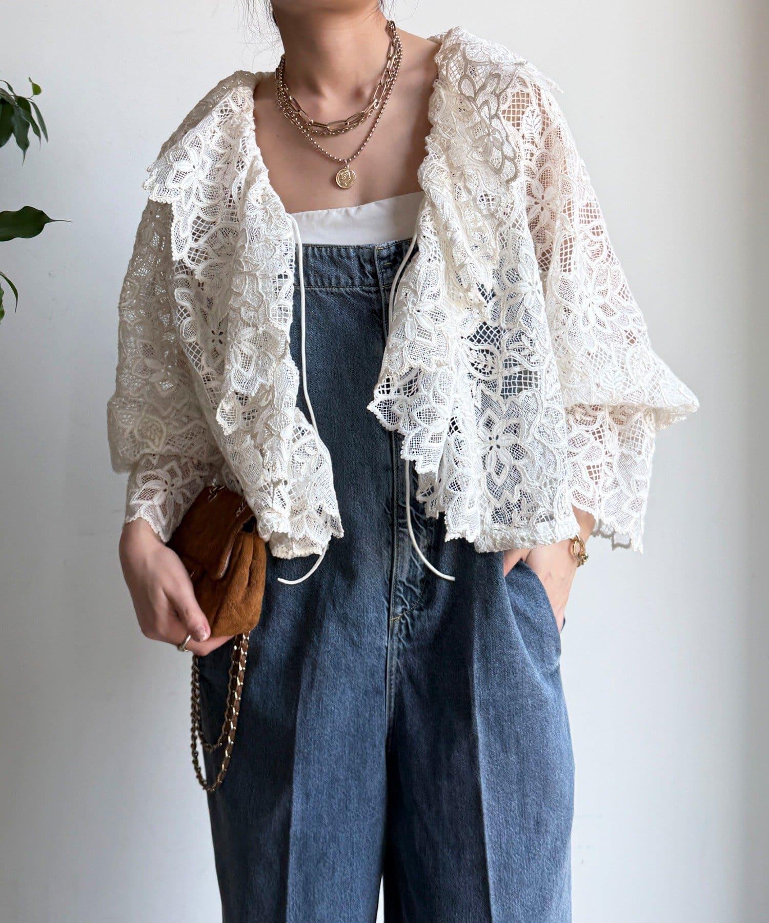 領口處有大褶邊的蕾絲長衫和糖果袖。