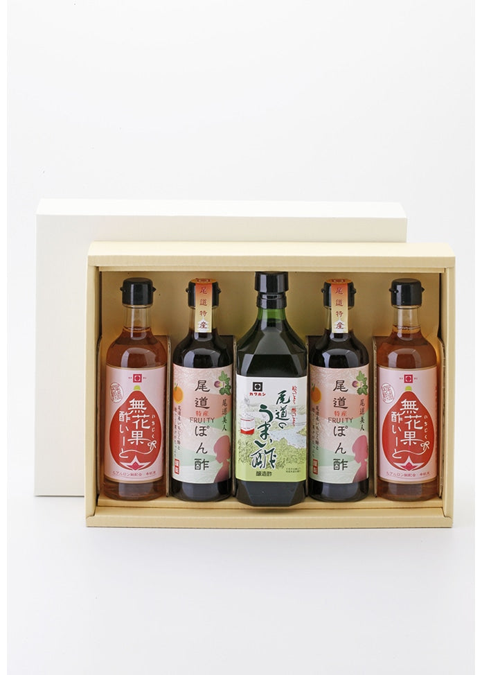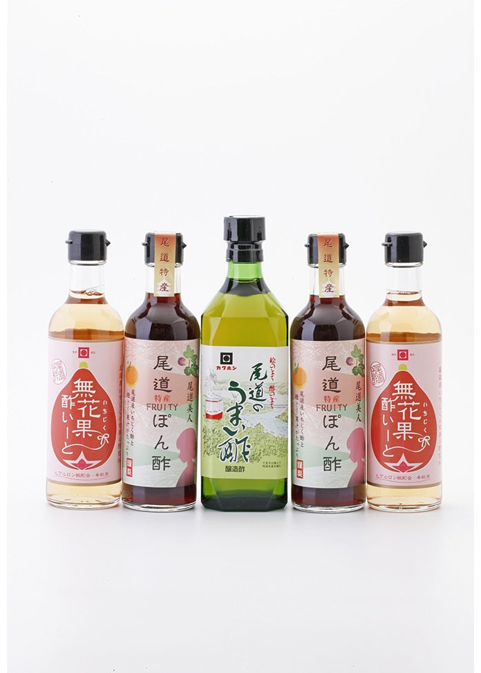 一套五瓶:1瓶尾道的烏梅醋,2瓶尾道的Ponzu和2瓶無花果醋Eeto。