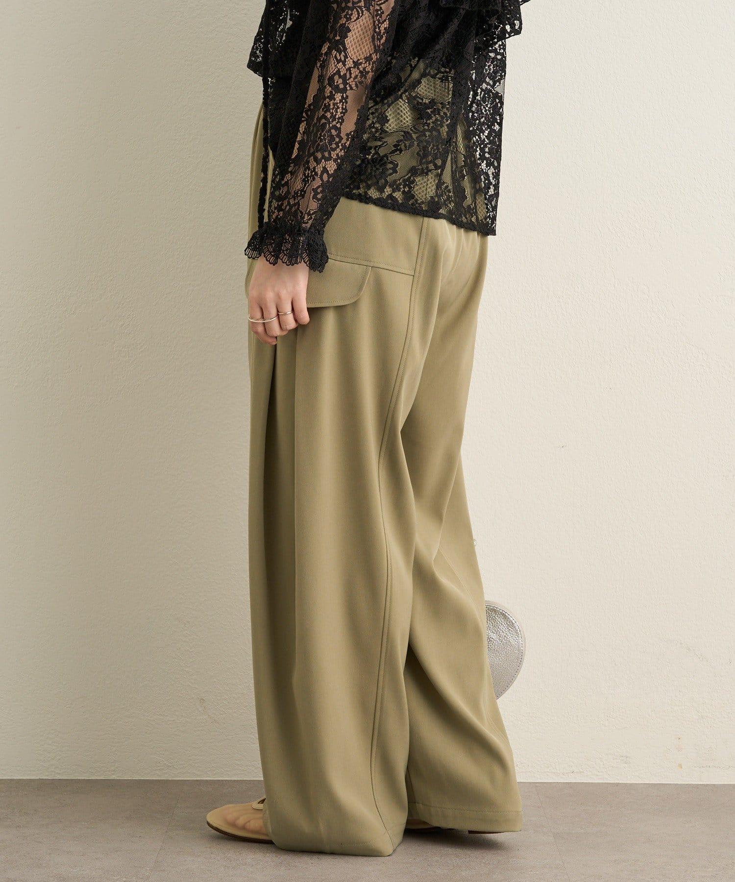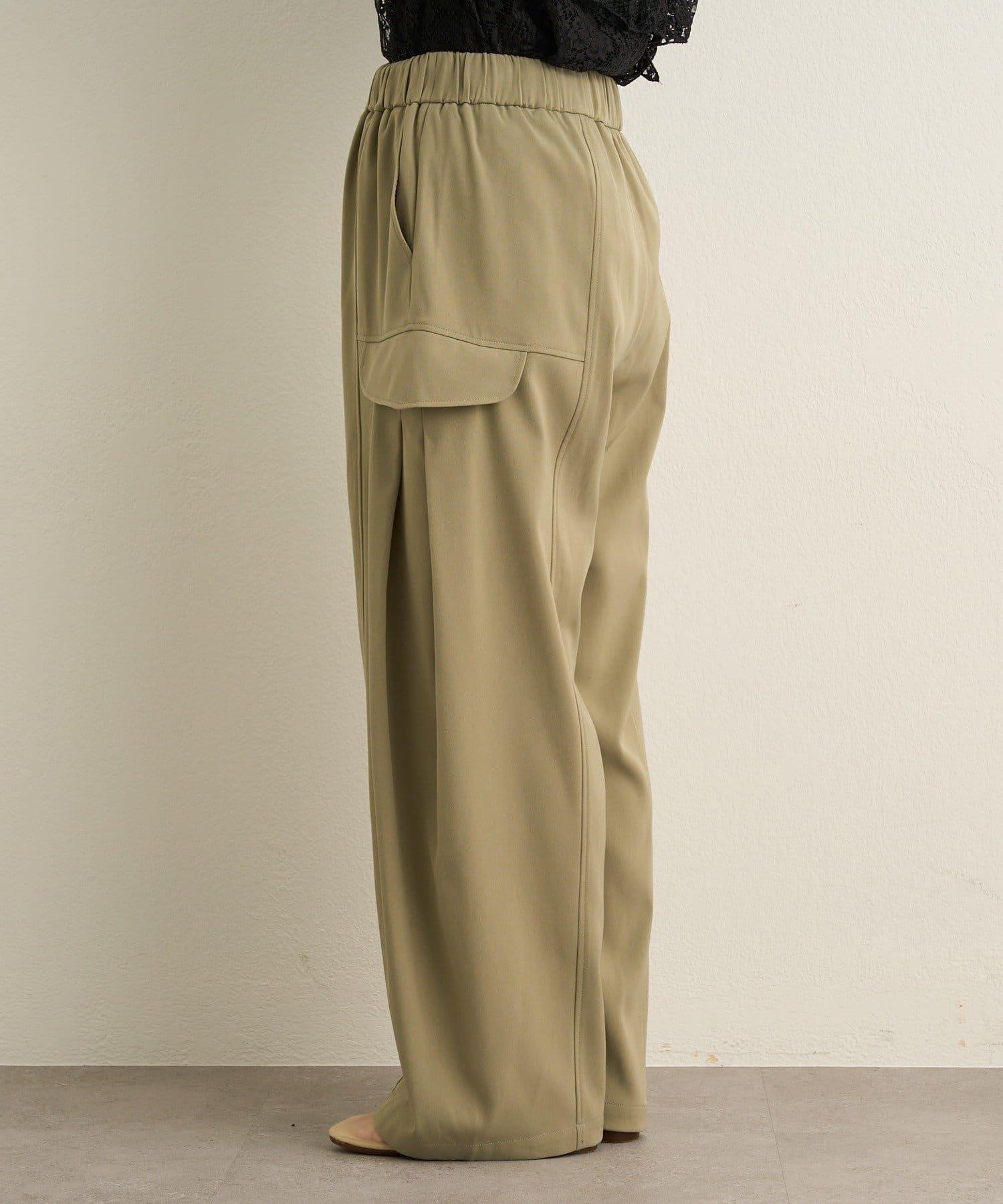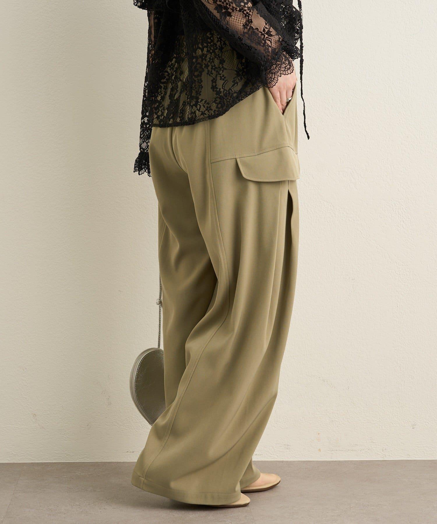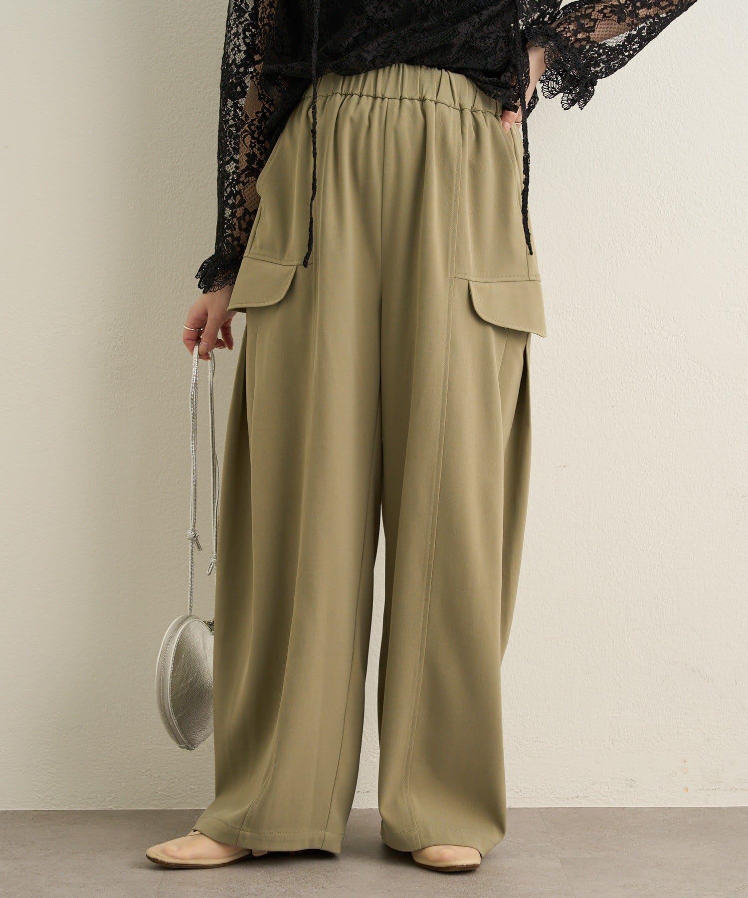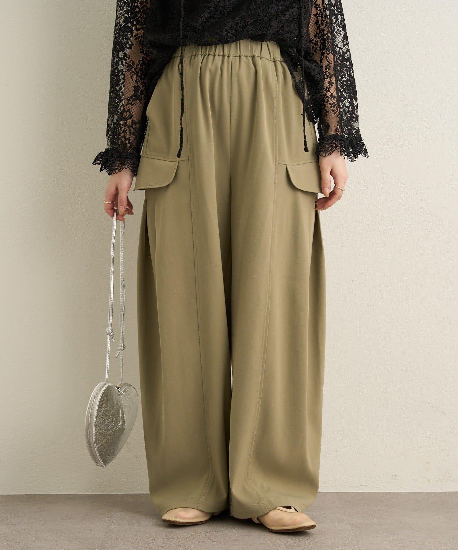 兩側口袋的收褶設計使褲身輪廓更具立體感,營造出女性化的外觀。