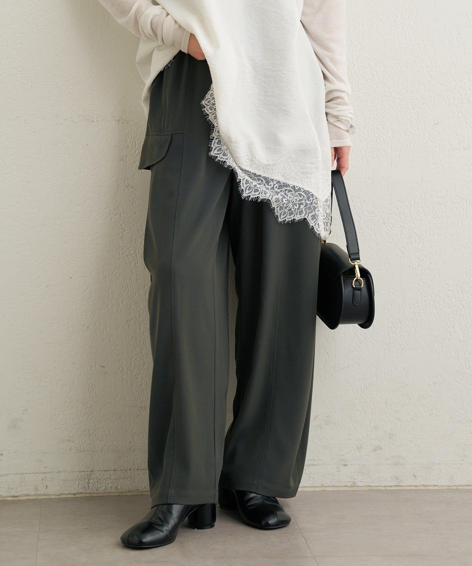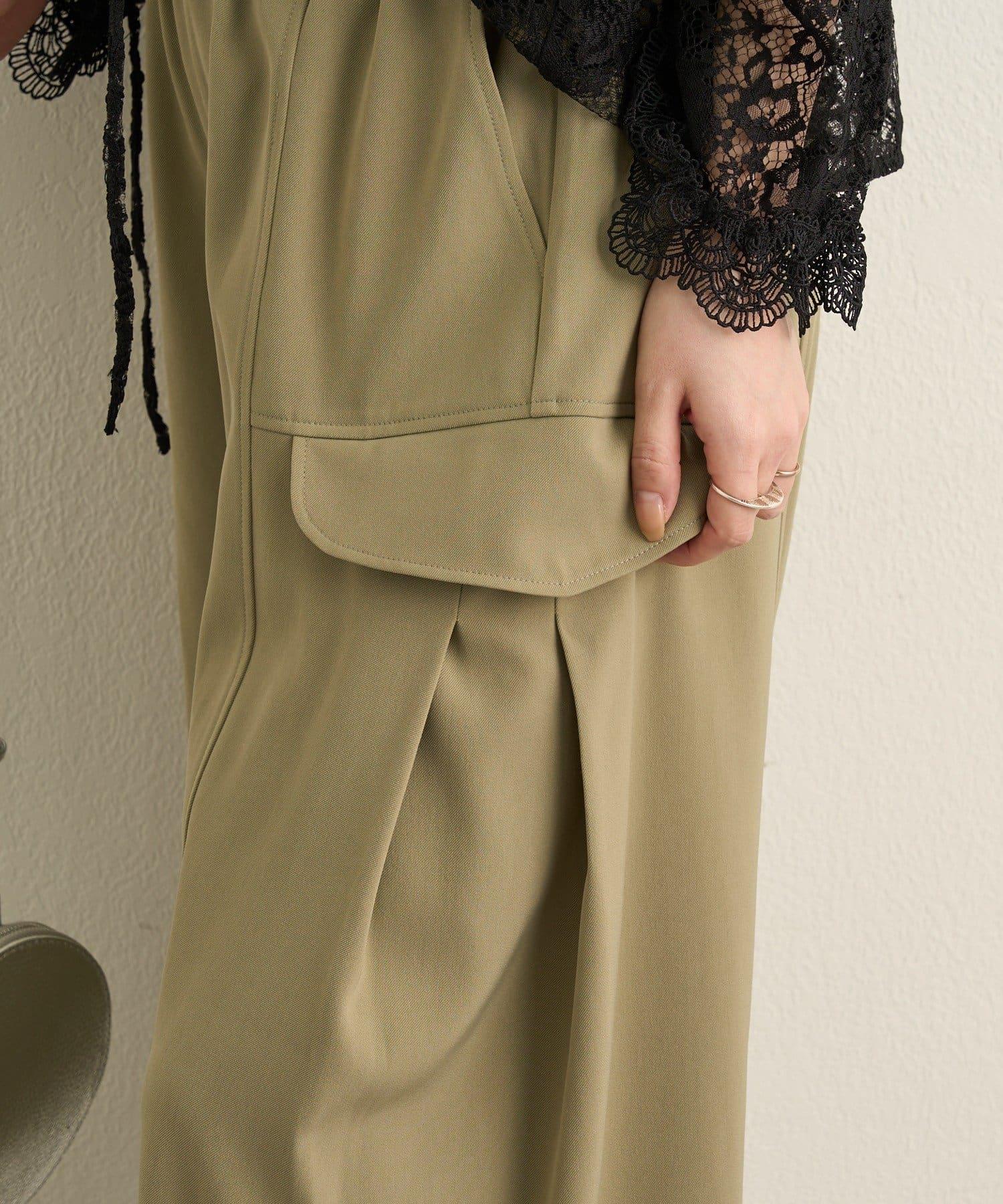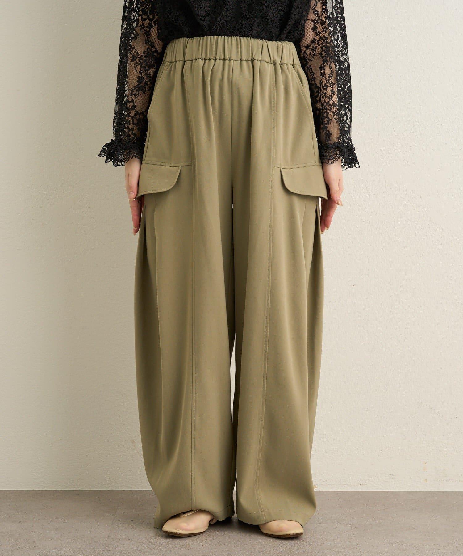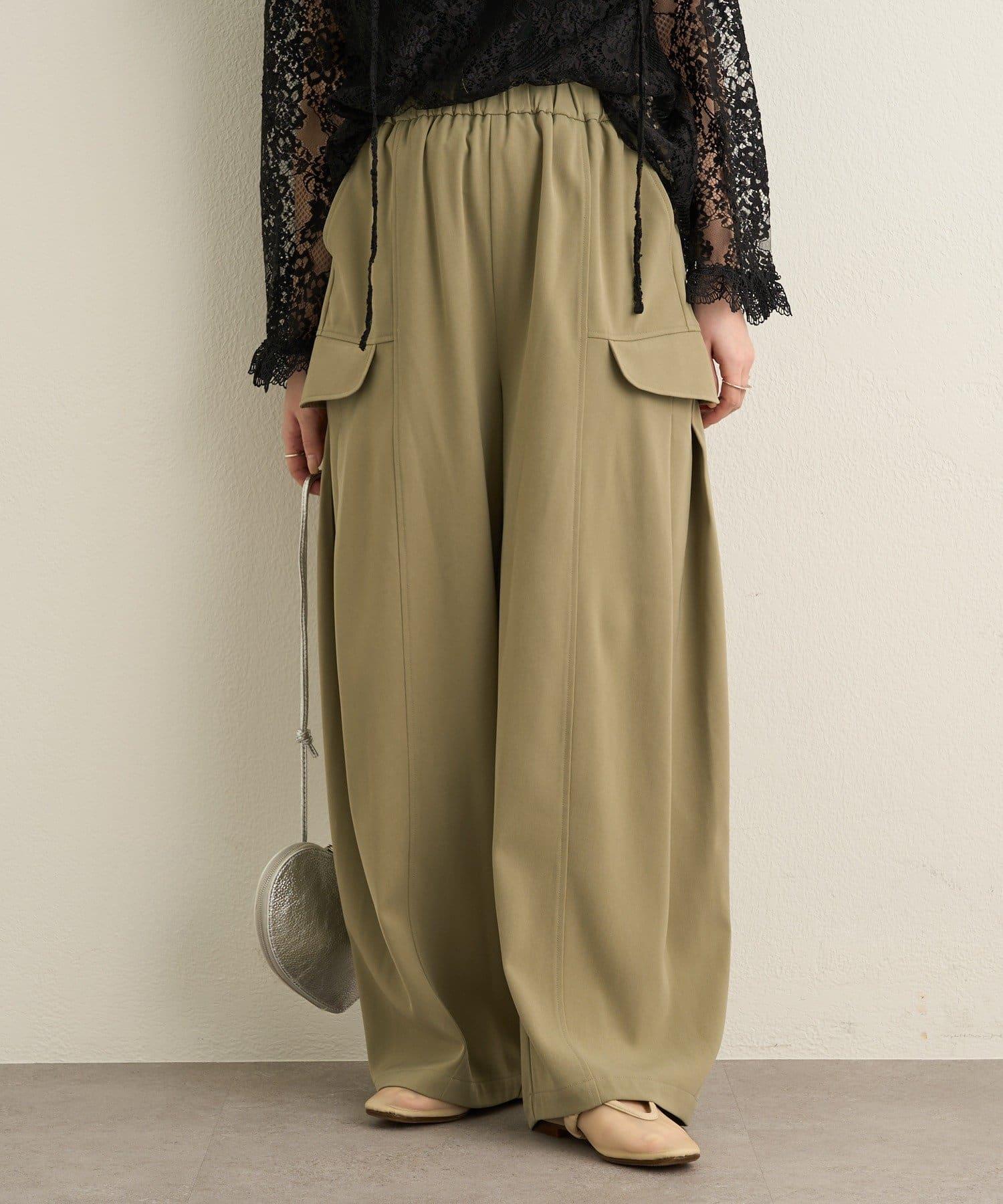 兩側口袋的收褶設計使褲身輪廓更具立體感,營造出女性化的外觀。